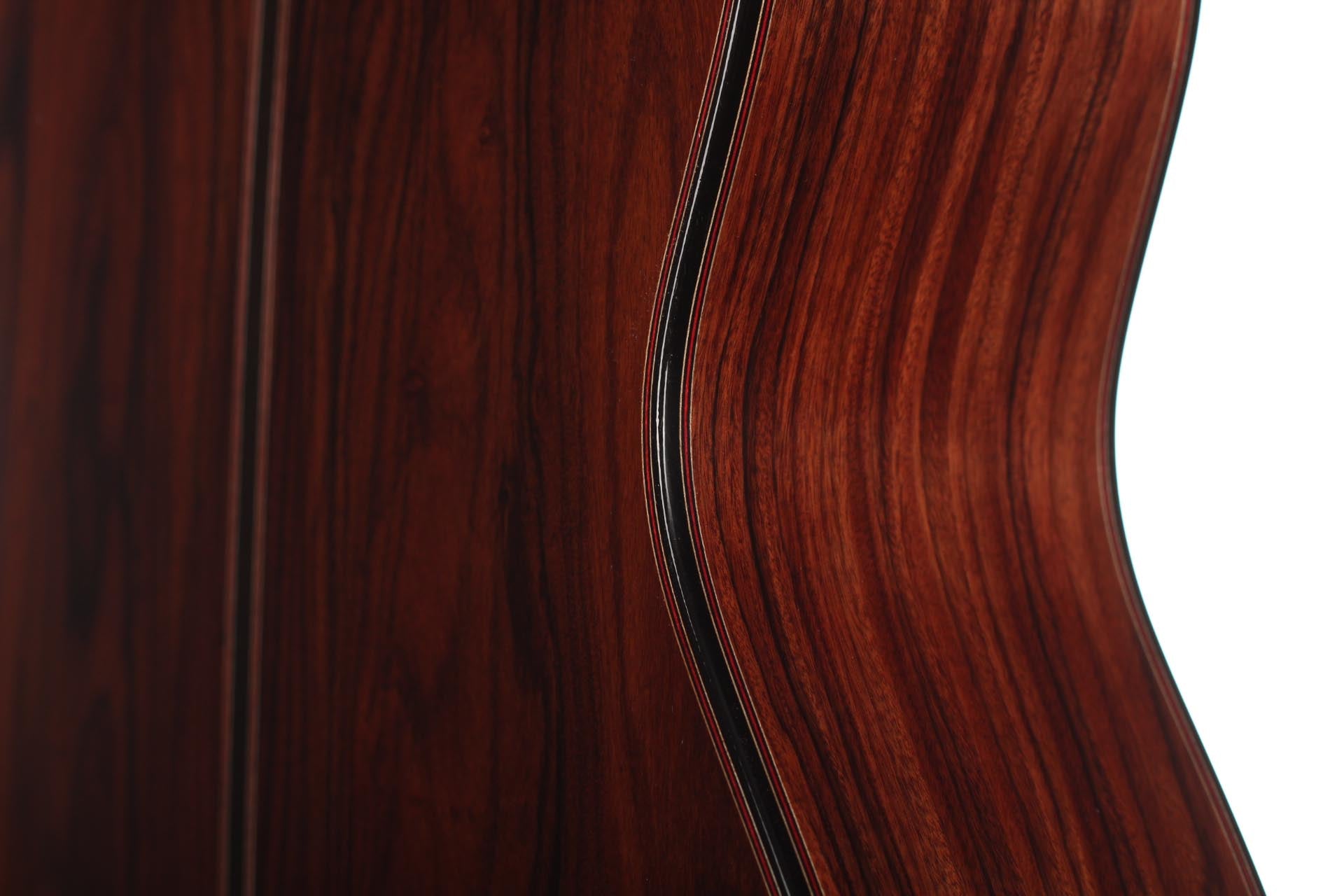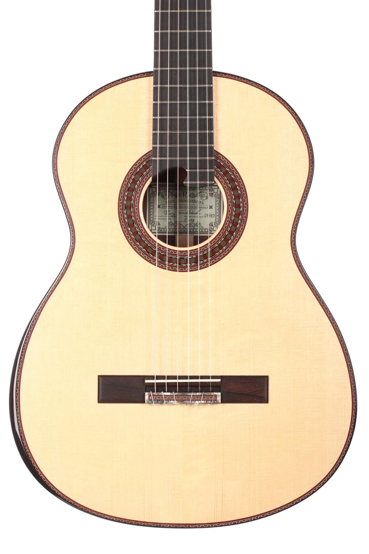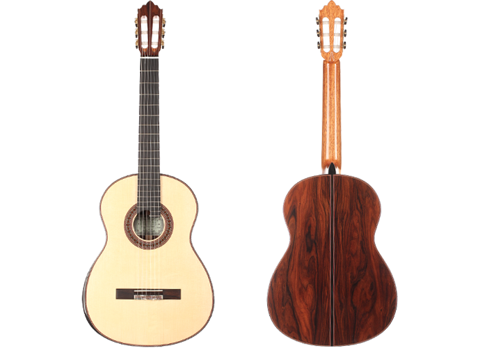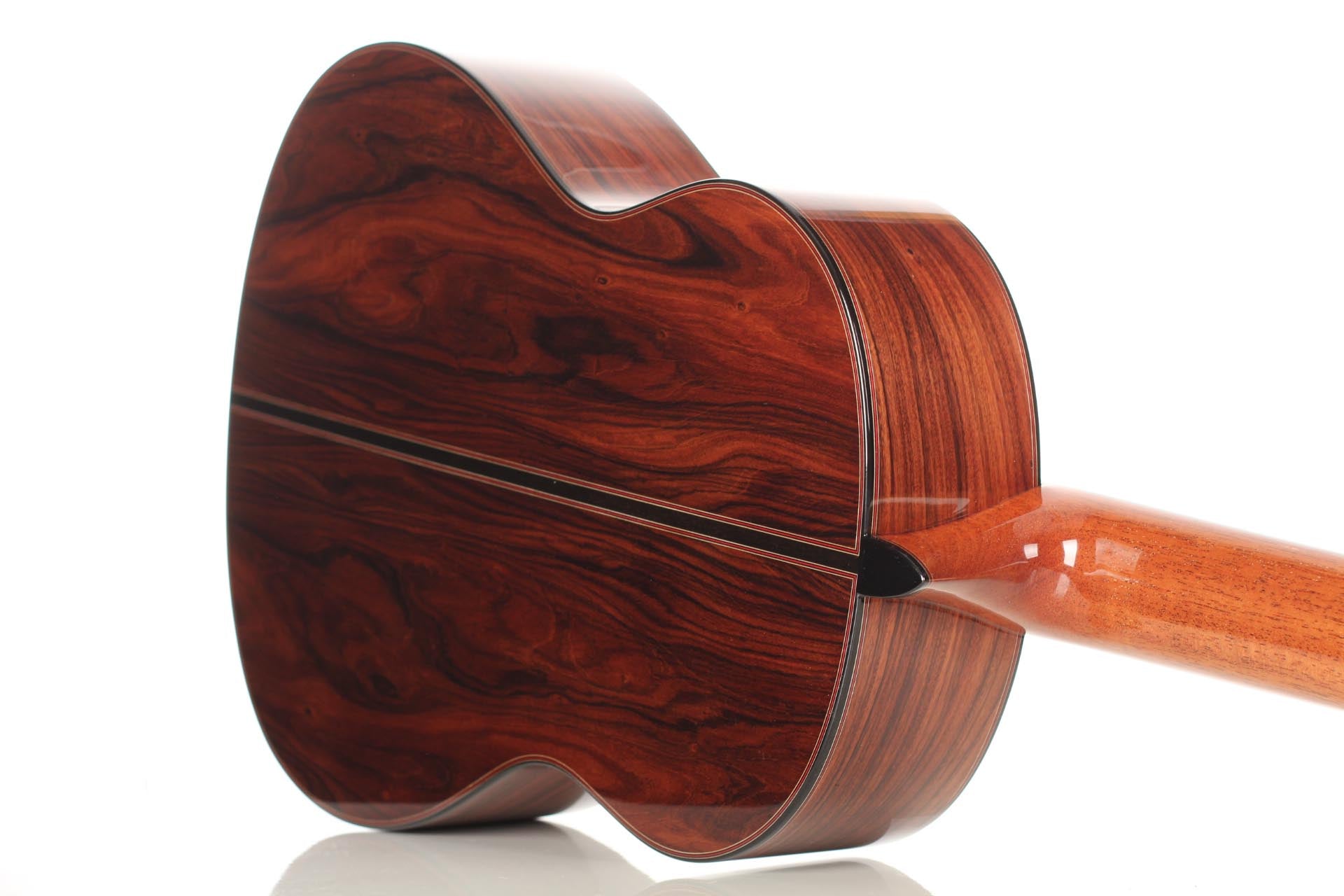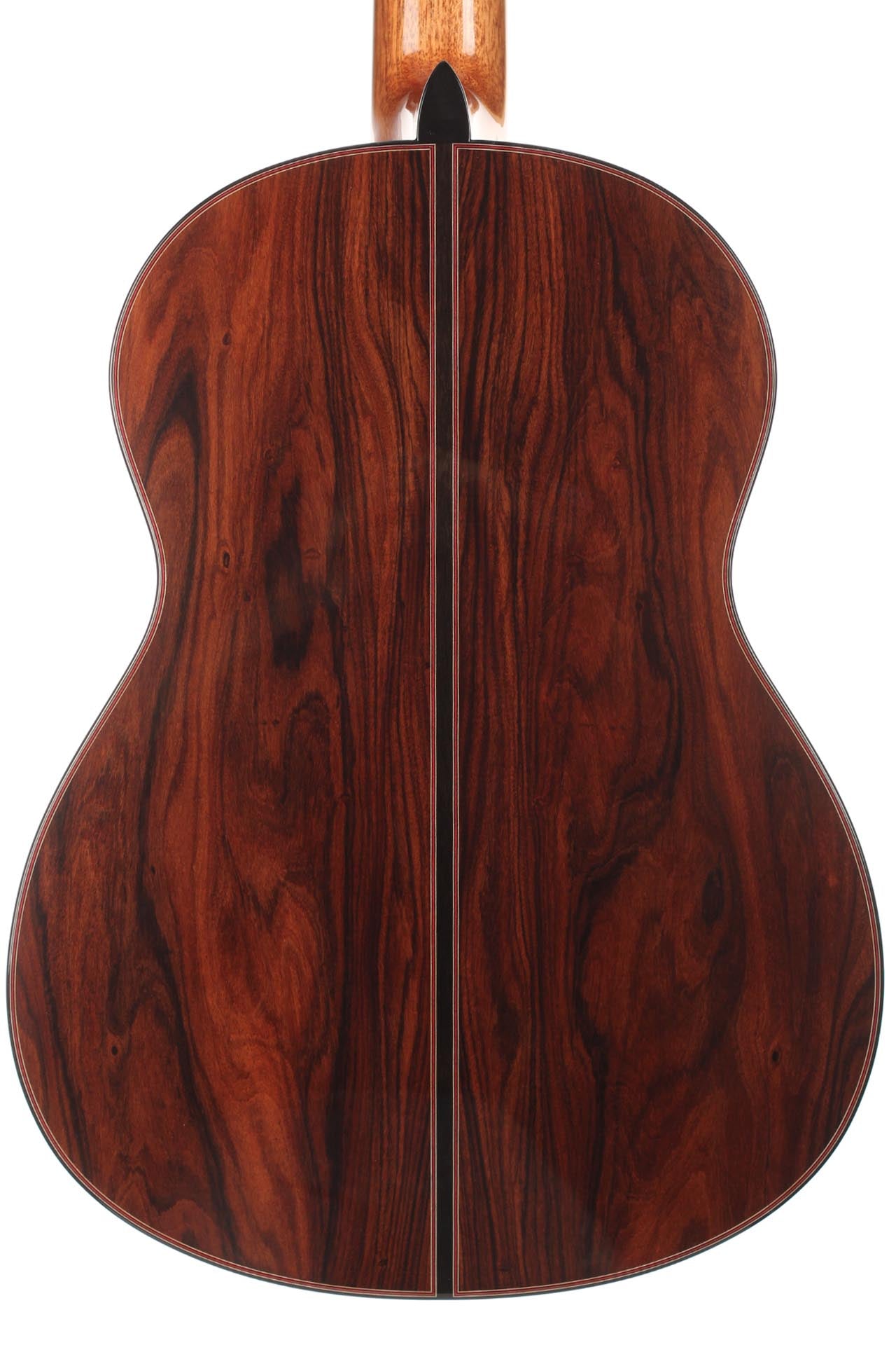 This beautiful guitar was developed in cooperation with „Siccas Guitars“. It has a variety of special features which can be found only on this guitar model. The decorative elements like rosette and ornaments around the edge were specifically designed, and give the instrument a more traditional look. The head has a crown with carvings, which were especially created for this guitar. The bridge with its 12-hole-drilling fits perfectly into the overall picture of the guitar and is additionally decorated with a beautiful mother of pearl surrounding at its tie block. In addition, it has a bevel, that allows your arm to lie more comfortably on the edge. The marvelously worked wave-like end of the fingerboard over the rosette matches the rounded wooden tuning pegs perfectly. To simplify barré, the fingerboard is horizontally arched, and furthermore raised to enable the easy use of higher frets. In fact, the playability is amazing. It is a stunning concert guitar that can fill great auditoriums as well as smaller intimate concert halls. Its generous sound is projected to the back door with great ease and comfort for the player as well as for the audience. These qualities are truly special for a freshly built spruce top guitar and are one of Roy’s great achievements. This guitar allows great dynamics, from cello to harpsichord and from whole orchestra to single singer. This is a great instrument that will blossom in the hands of a committed guitarist. The tuners are made by Rubner. A Hiscox Pro II hard-shell case is included. This guitar is CITES-free (CF).