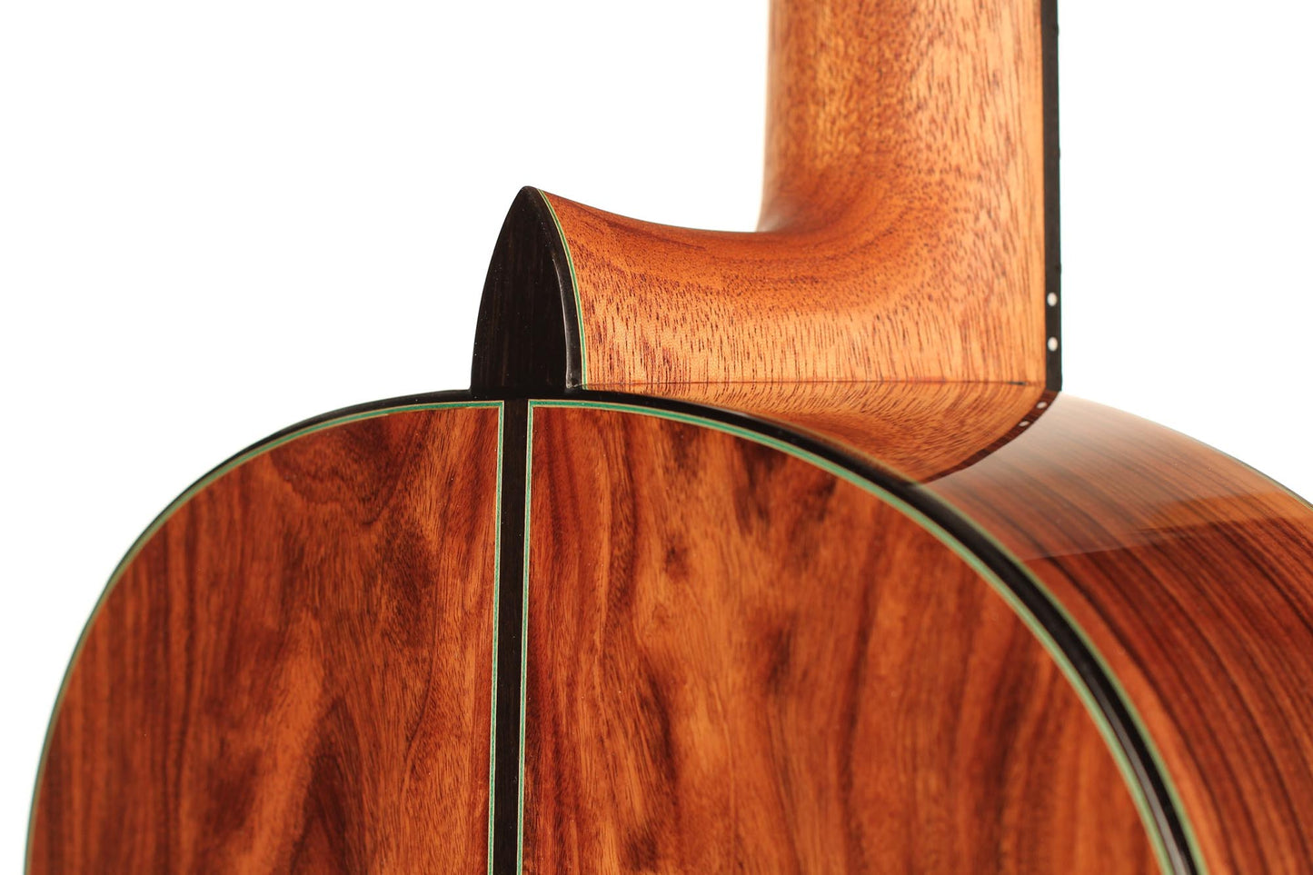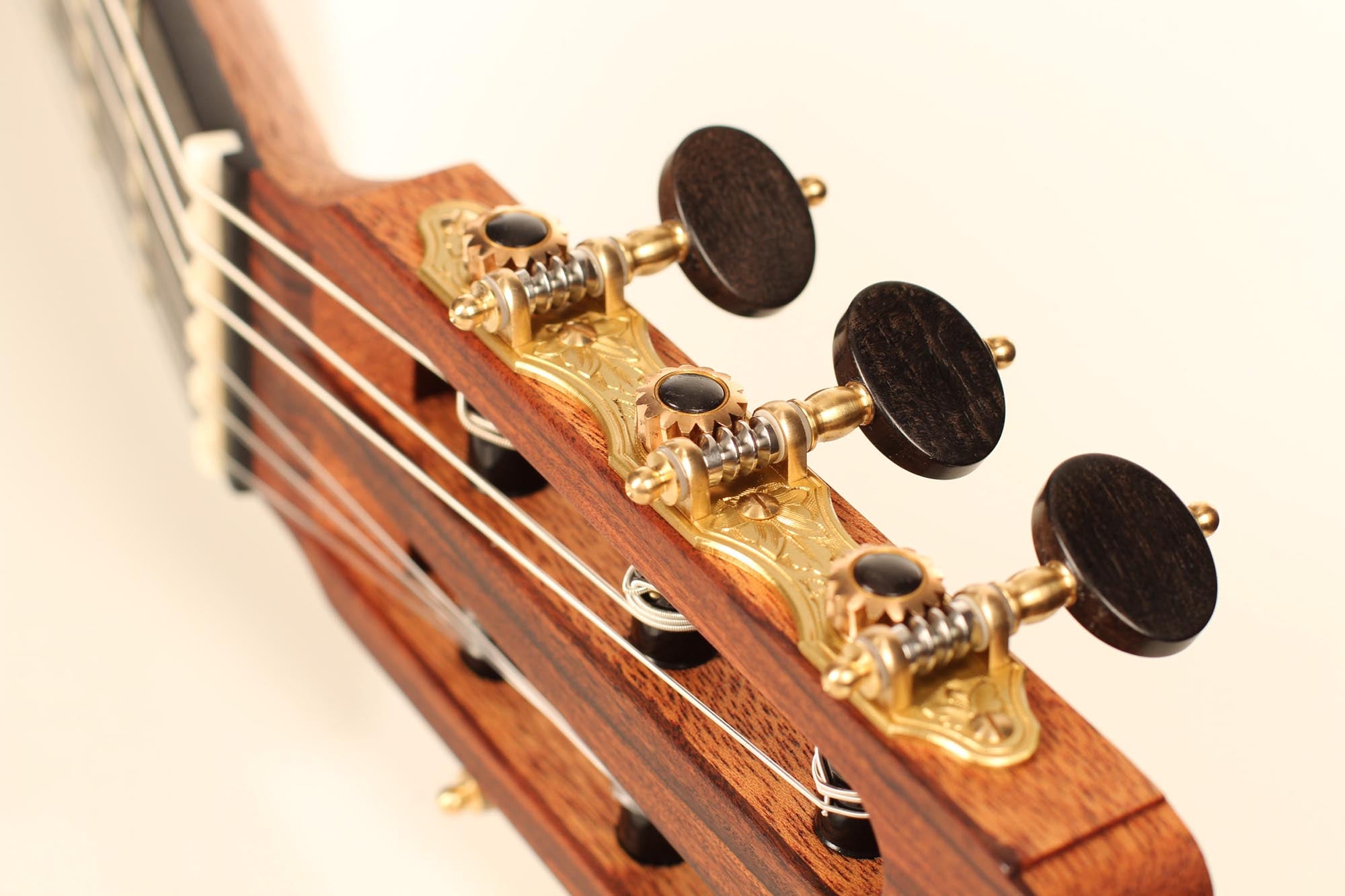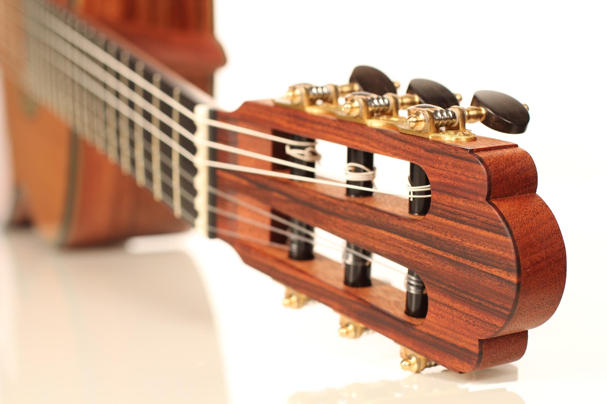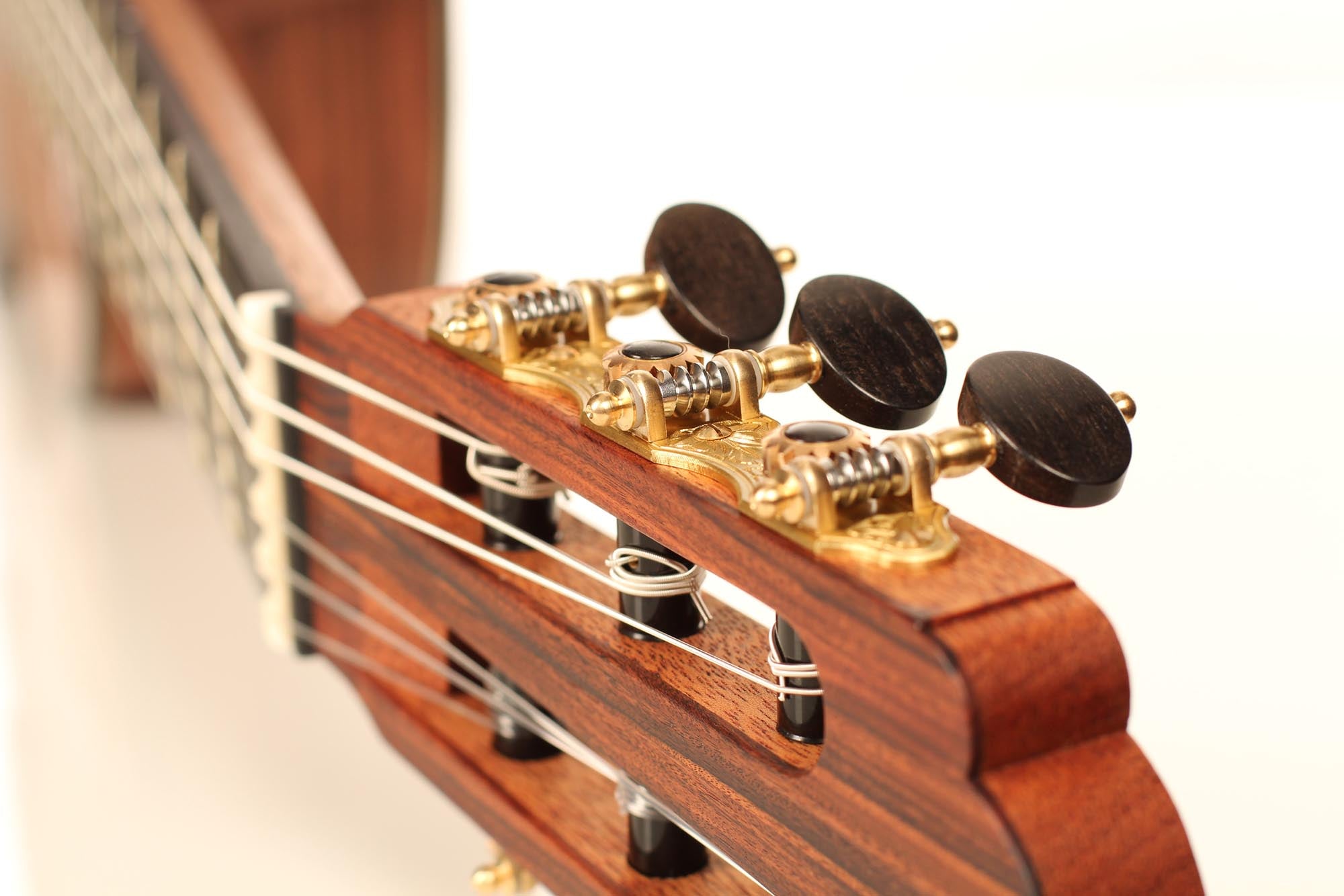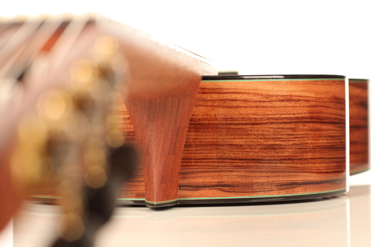 This guitar was inspired by the work of Antonio de Torres and follows the idea of a modern interpretation of the traditional Spanish guitar. It is therefore an instrument with a fine colourful tone, very sensible to the stroke and expressing and charming timbre. Nevertheless, some details remind us that this guitar is a contemporary concert instrument that can fill concert halls and some elements as the elevated fingerboard and the waxed neck were built in order to optimise the playability.