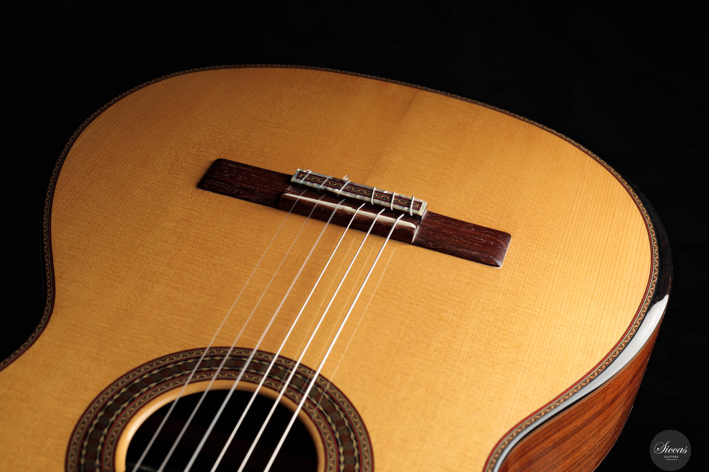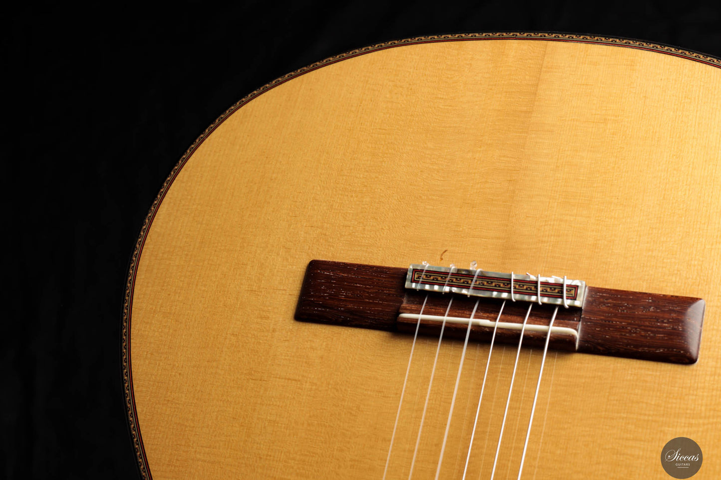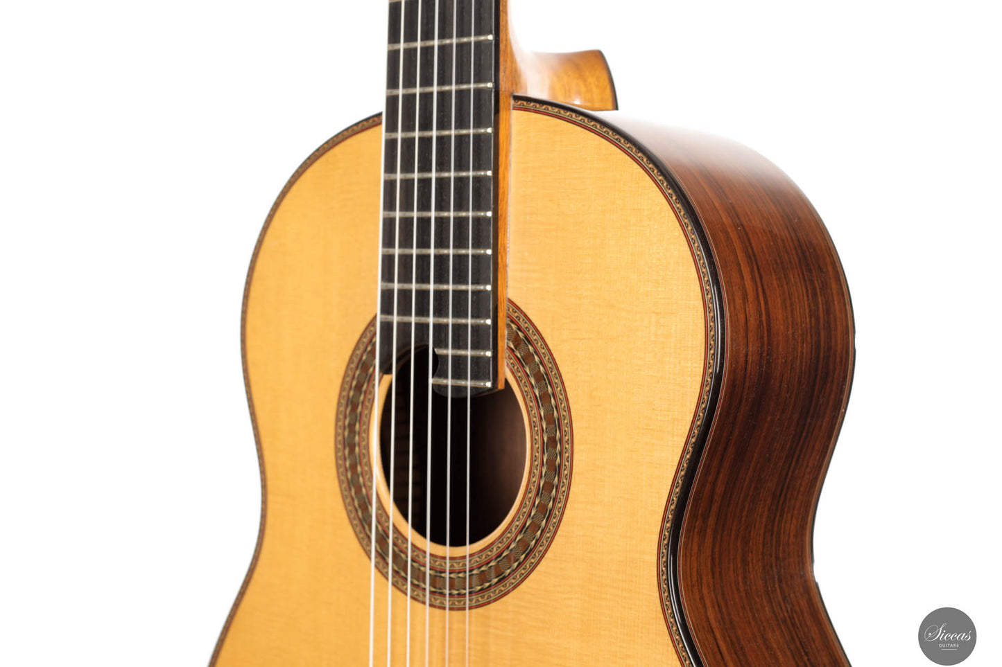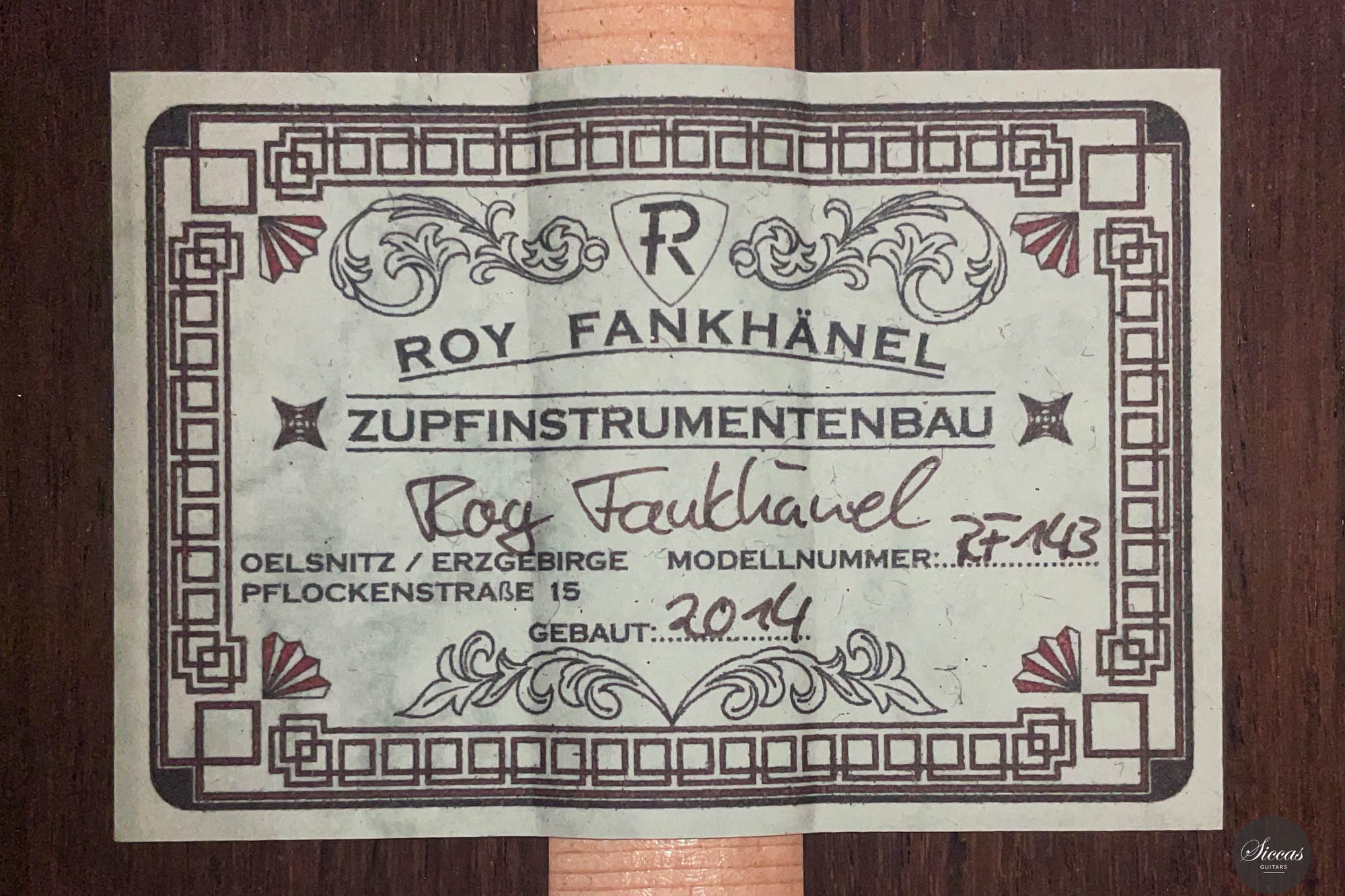 Roy Fankhänel’s runs his workshop in Oelsnitz, Germany, where he builds guitars in the German tradition. He shows a very high level of craftmanship that can be seen in features such as the V-joint, the details of the rosette, the design of the head and the quality of the construction in general. His guitars are powerful instruments with a generous rich sound. They are very easy to play and feature a slightly radiused elevated fingerboard.