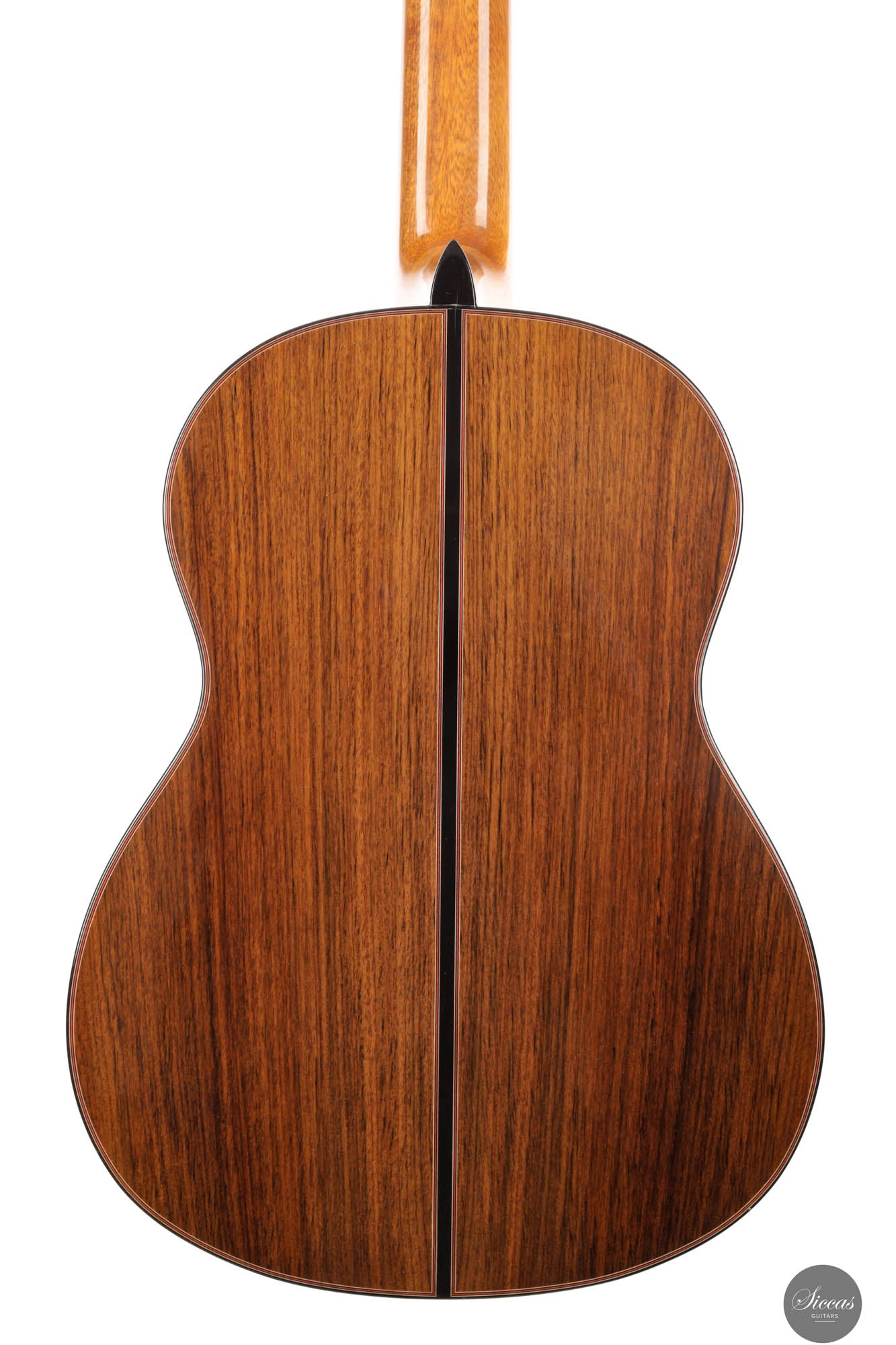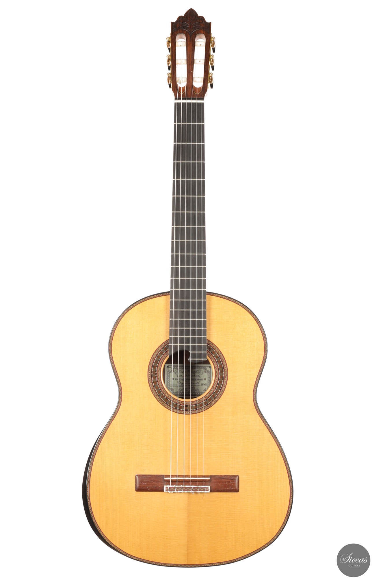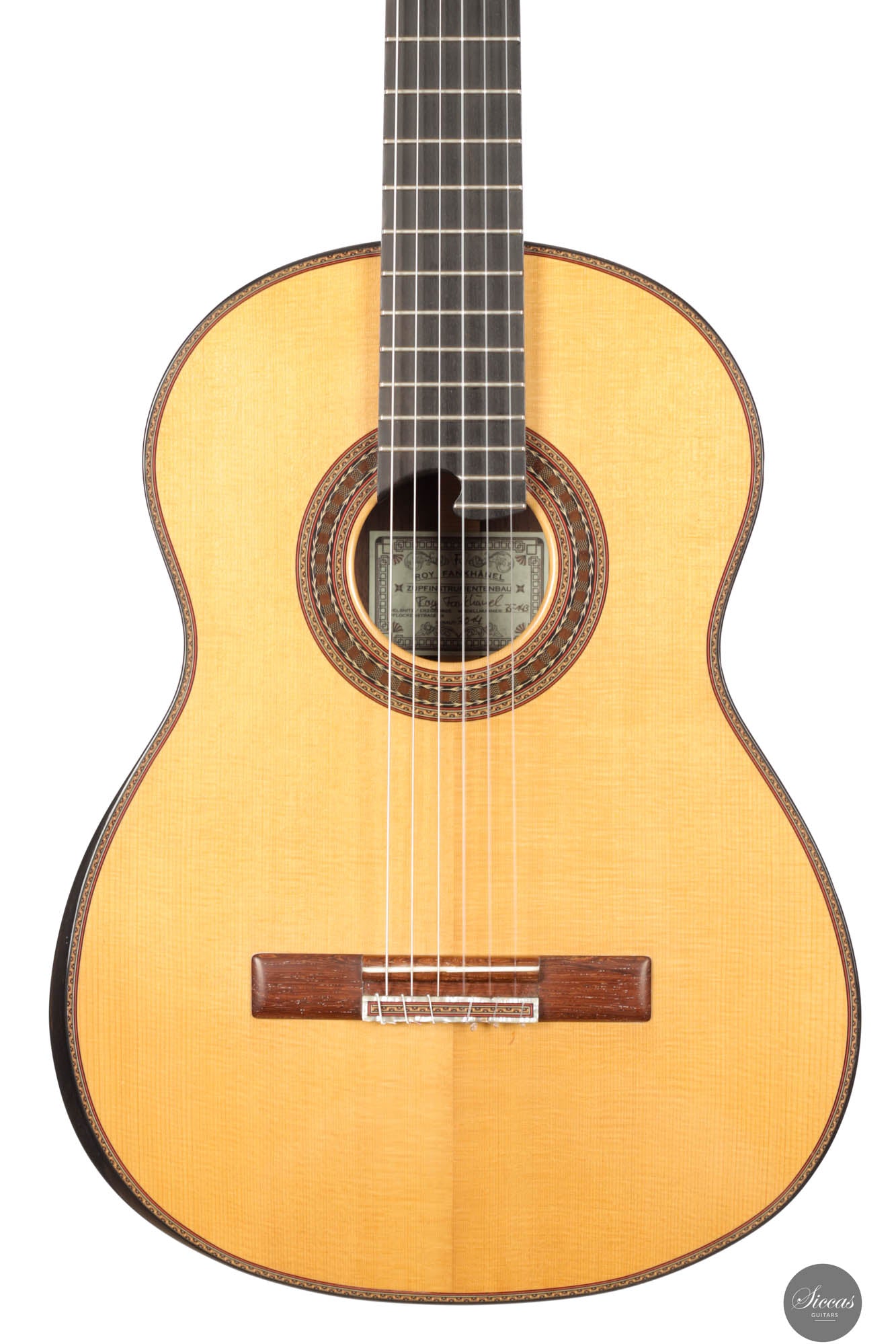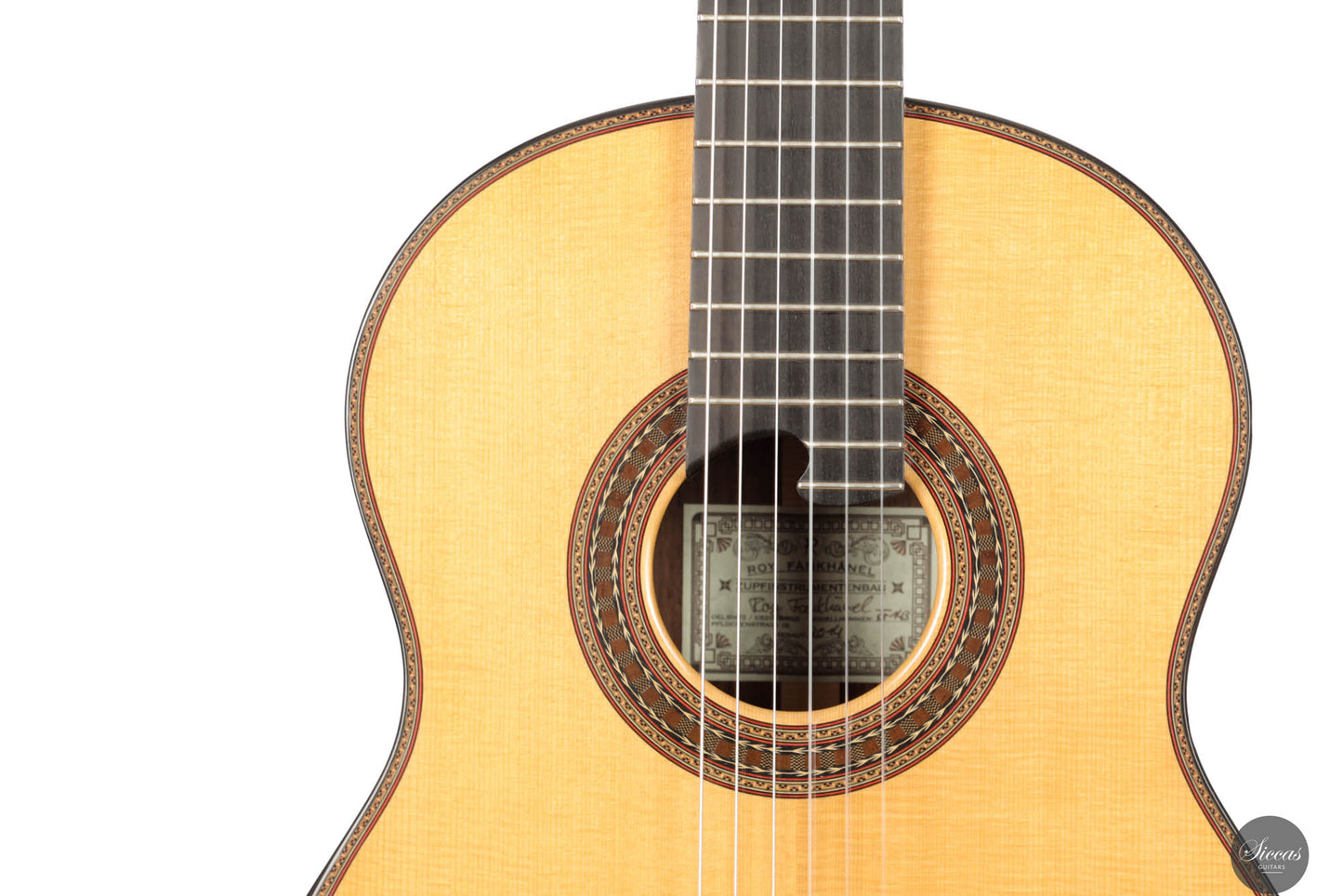 The Roy Fankhänel RF 143, crafted in 2014, exemplifies the zenith of classical guitar craftsmanship. This instrument, a masterpiece in its own right, distinguishes itself through its exceptional attention to detail and the use of high-quality materials. Each element of the RF 143 has been thoughtfully selected and expertly crafted, resulting in a guitar that is not just a musical instrument, but a work of art. The guitar's most captivating features are its decorative motifs, which include a stunningly designed rosette and meticulously crafted ornaments adorning the binding. These details imbue the guitar with a sense of traditional elegance and timeless beauty, making it a standout piece. Additionally, the carved headstock is a testament to Roy Fankhänel’s artistic prowess, showcasing a level of craftsmanship that is truly unparalleled in the world of luthiery.
