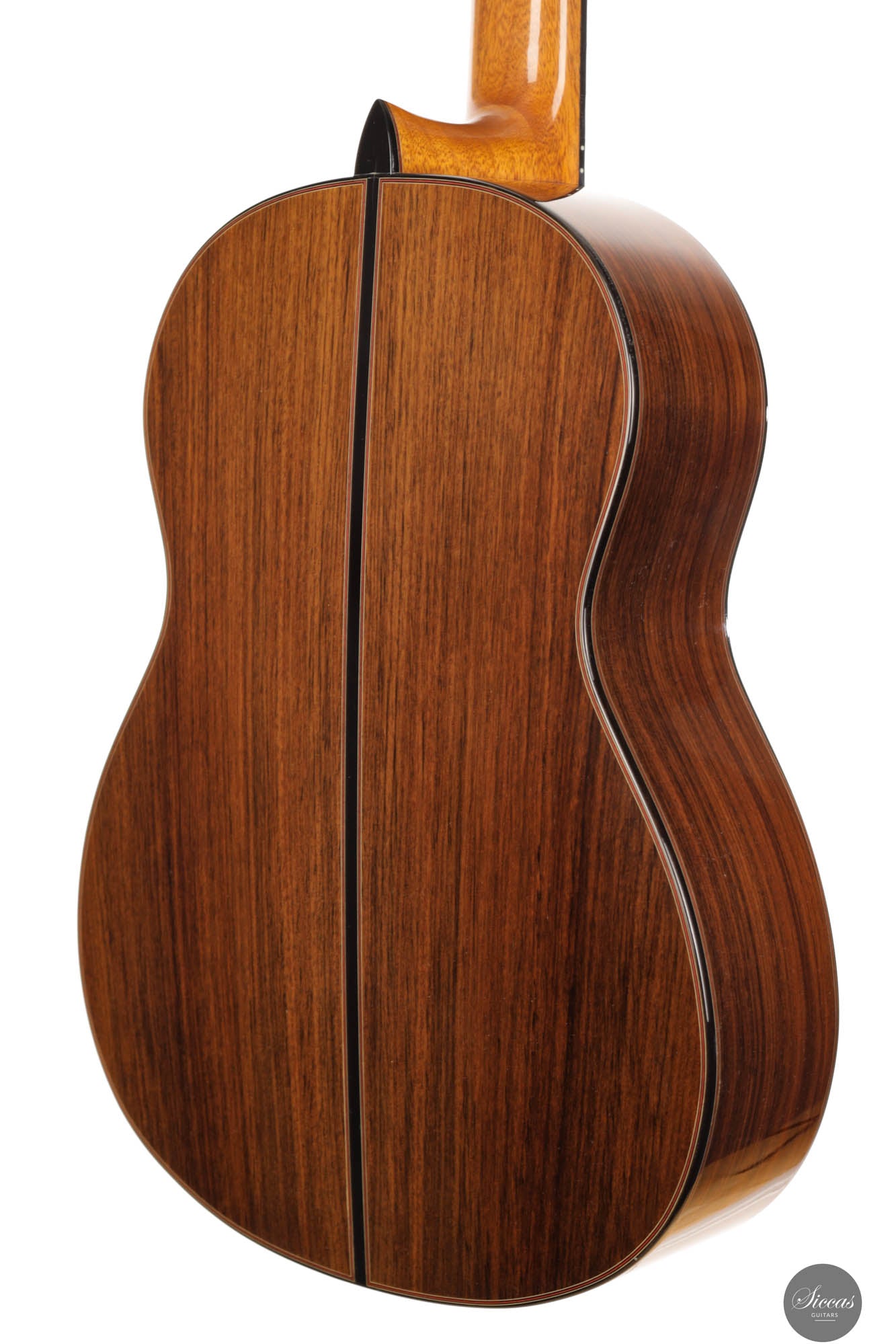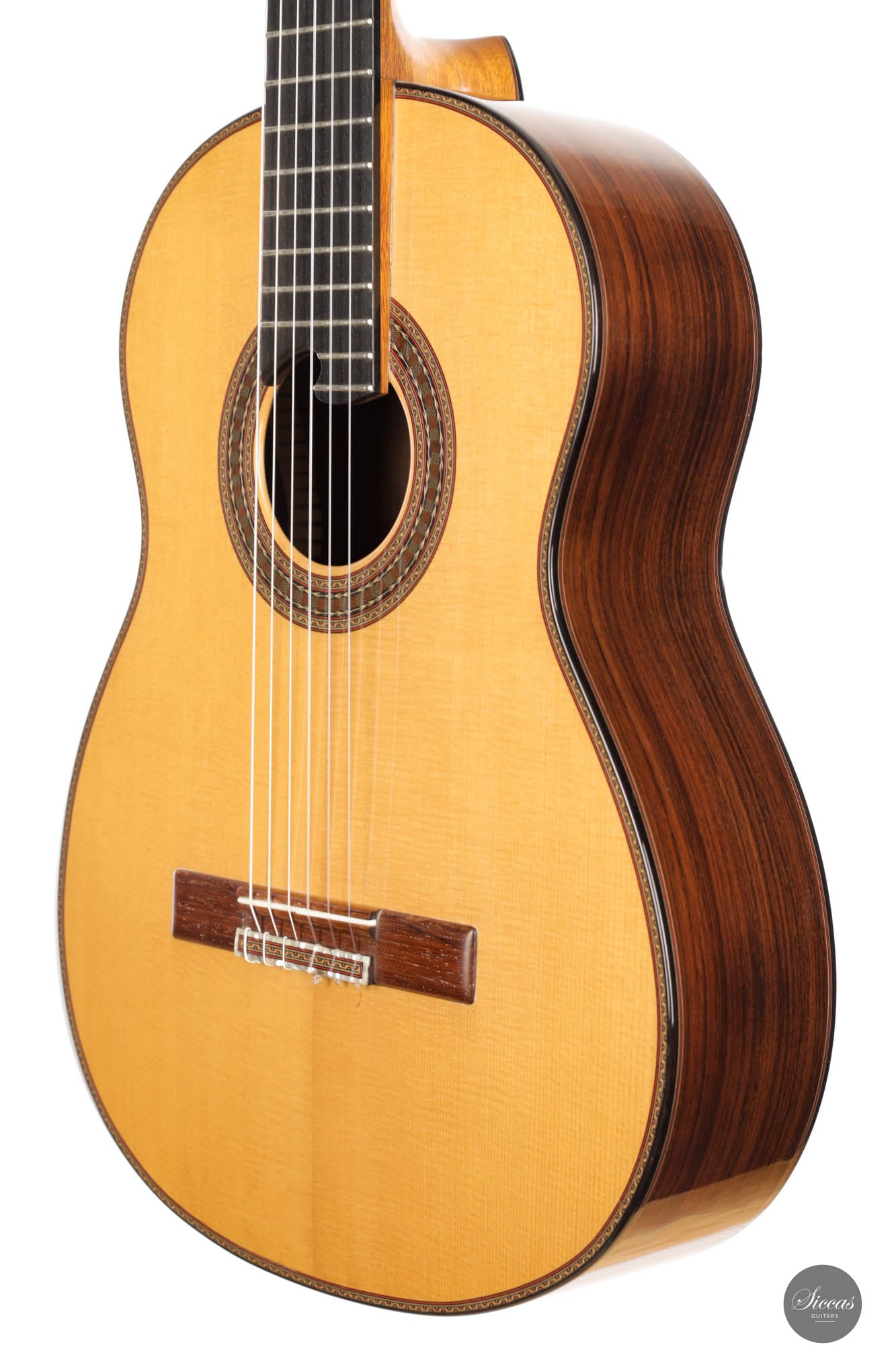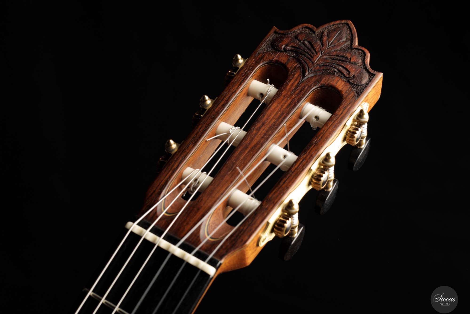 The Roy Fankhänel RF 143, crafted in 2014, exemplifies the zenith of classical guitar craftsmanship. This instrument, a masterpiece in its own right, distinguishes itself through its exceptional attention to detail and the use of high-quality materials. Each element of the RF 143 has been thoughtfully selected and expertly crafted, resulting in a guitar that is not just a musical instrument, but a work of art. The guitar's most captivating features are its decorative motifs, which include a stunningly designed rosette and meticulously crafted ornaments adorning the binding. These details imbue the guitar with a sense of traditional elegance and timeless beauty, making it a standout piece. Additionally, the carved headstock is a testament to Roy Fankhänel’s artistic prowess, showcasing a level of craftsmanship that is truly unparalleled in the world of luthiery.
