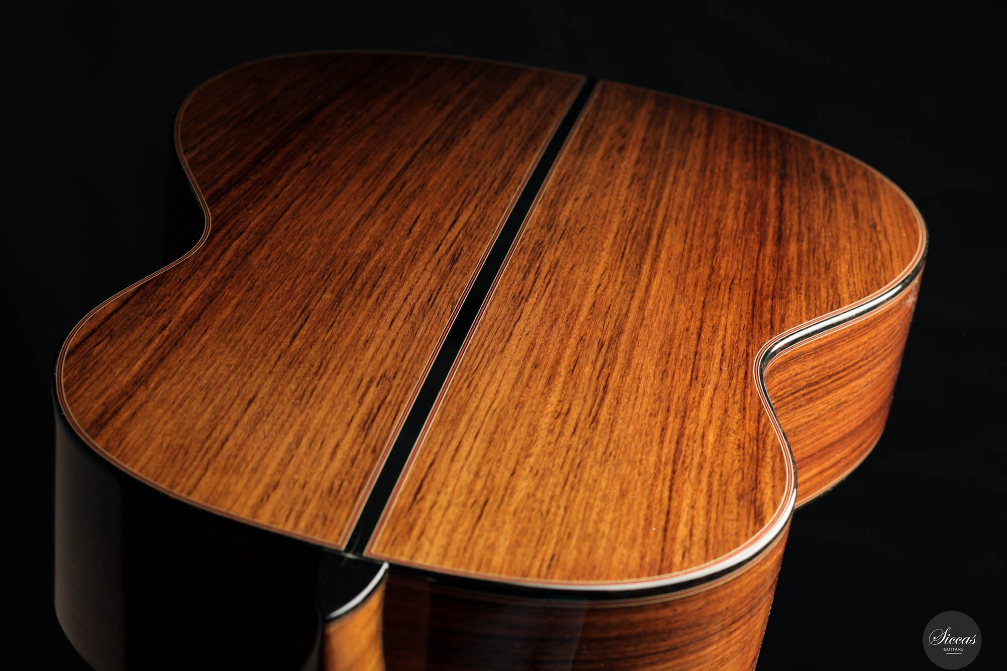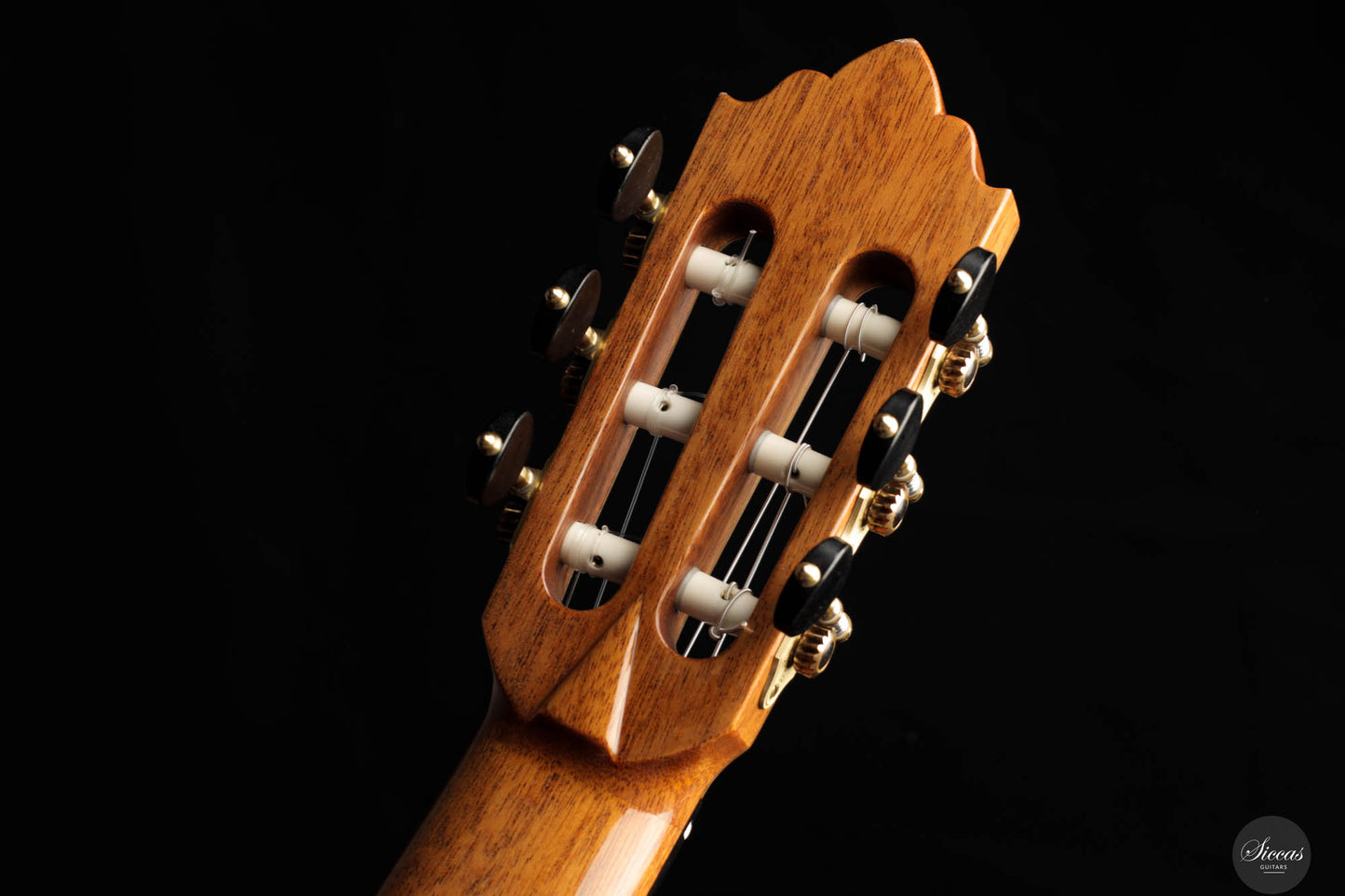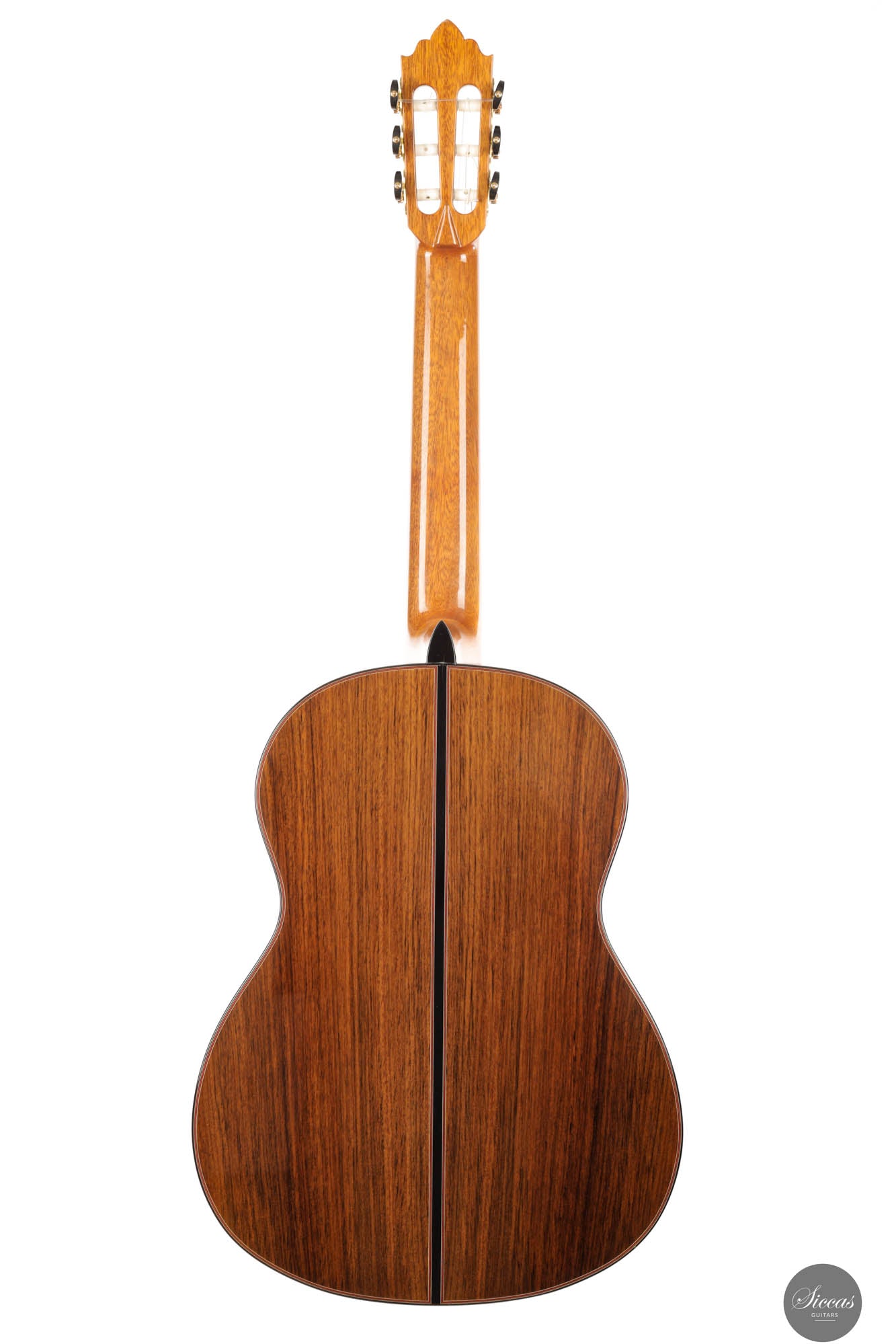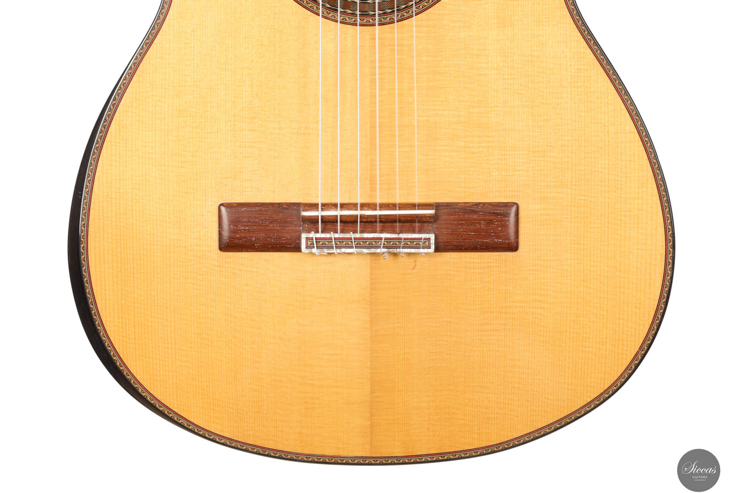 The Roy Fankhänel RF 143, crafted in 2014, exemplifies the zenith of classical guitar craftsmanship. This instrument, a masterpiece in its own right, distinguishes itself through its exceptional attention to detail and the use of high-quality materials. Each element of the RF 143 has been thoughtfully selected and expertly crafted, resulting in a guitar that is not just a musical instrument, but a work of art. The guitar's most captivating features are its decorative motifs, which include a stunningly designed rosette and meticulously crafted ornaments adorning the binding. These details imbue the guitar with a sense of traditional elegance and timeless beauty, making it a standout piece. Additionally, the carved headstock is a testament to Roy Fankhänel’s artistic prowess, showcasing a level of craftsmanship that is truly unparalleled in the world of luthiery.