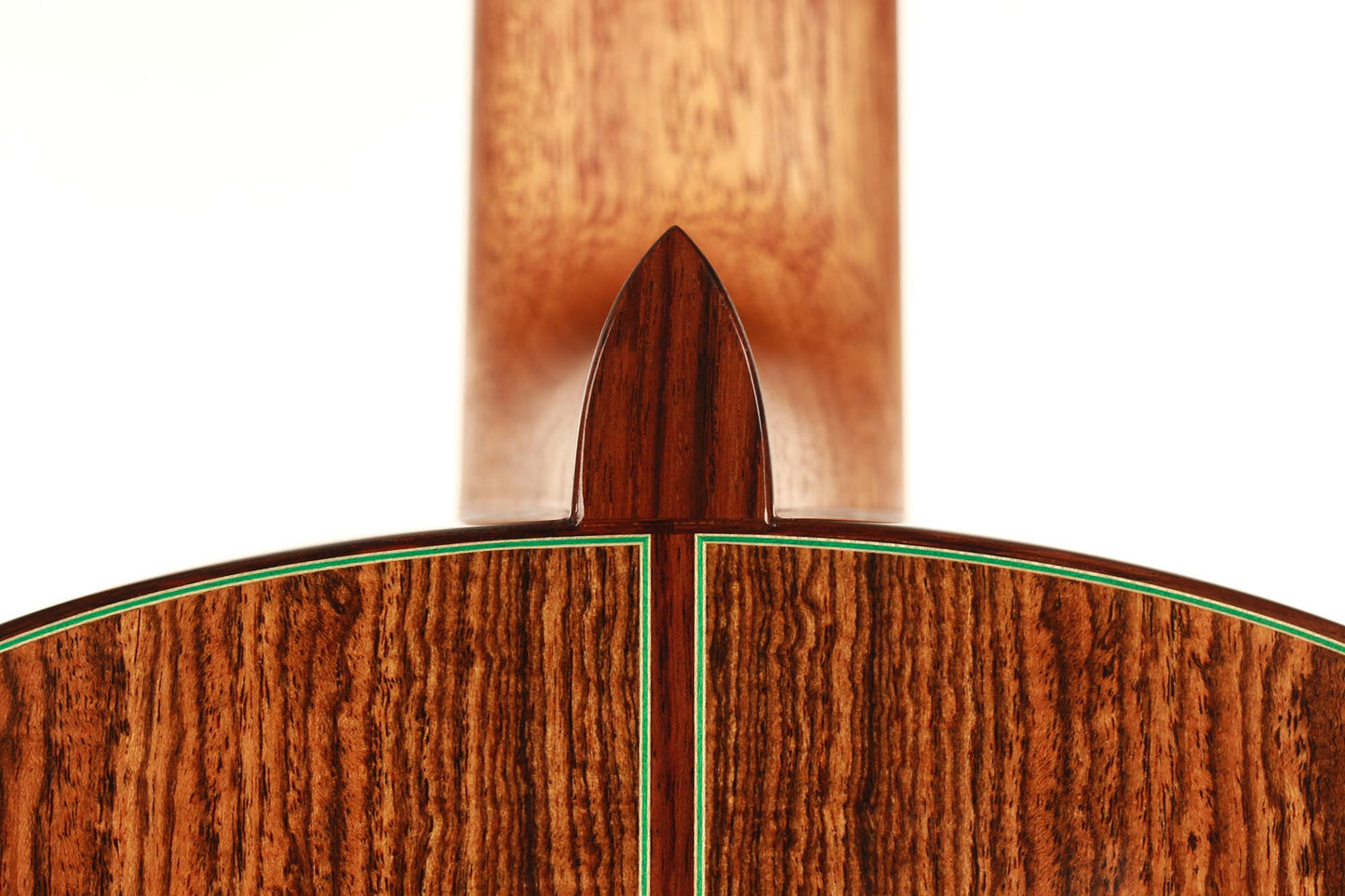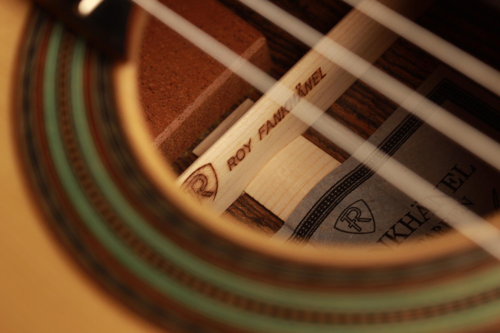 This guitar was inspired by the work of Antonio de Torres and follows the idea of a modern interpretation of the traditional Spanish guitar. It is therefore an instrument with a fine colourful tone, very sensitive to the stroke and with an expressing and charming timbre. Nevertheless, some details remind us that this guitar is a contemporary concert instrument that can fill concert halls and some elements as the elevated fingerboard and the waxed neck were built in order to optimise the playability. Roy is also known for building custom instruments. The classical guitarist Heike Matthiesen, for example, plays a guitar by Roy Fankhänel. And also outside the classical guitar scene, guitarists such as the left-handed "Kuddel" from the "Toten Hosen" or the guitarist from Max Raabe's Palastorchester are among his customers.