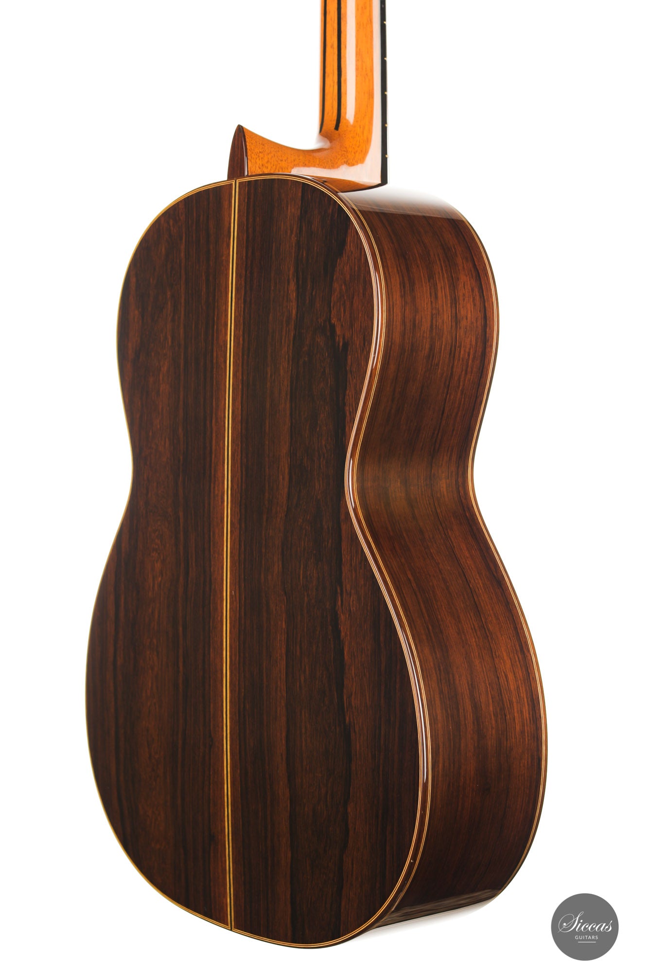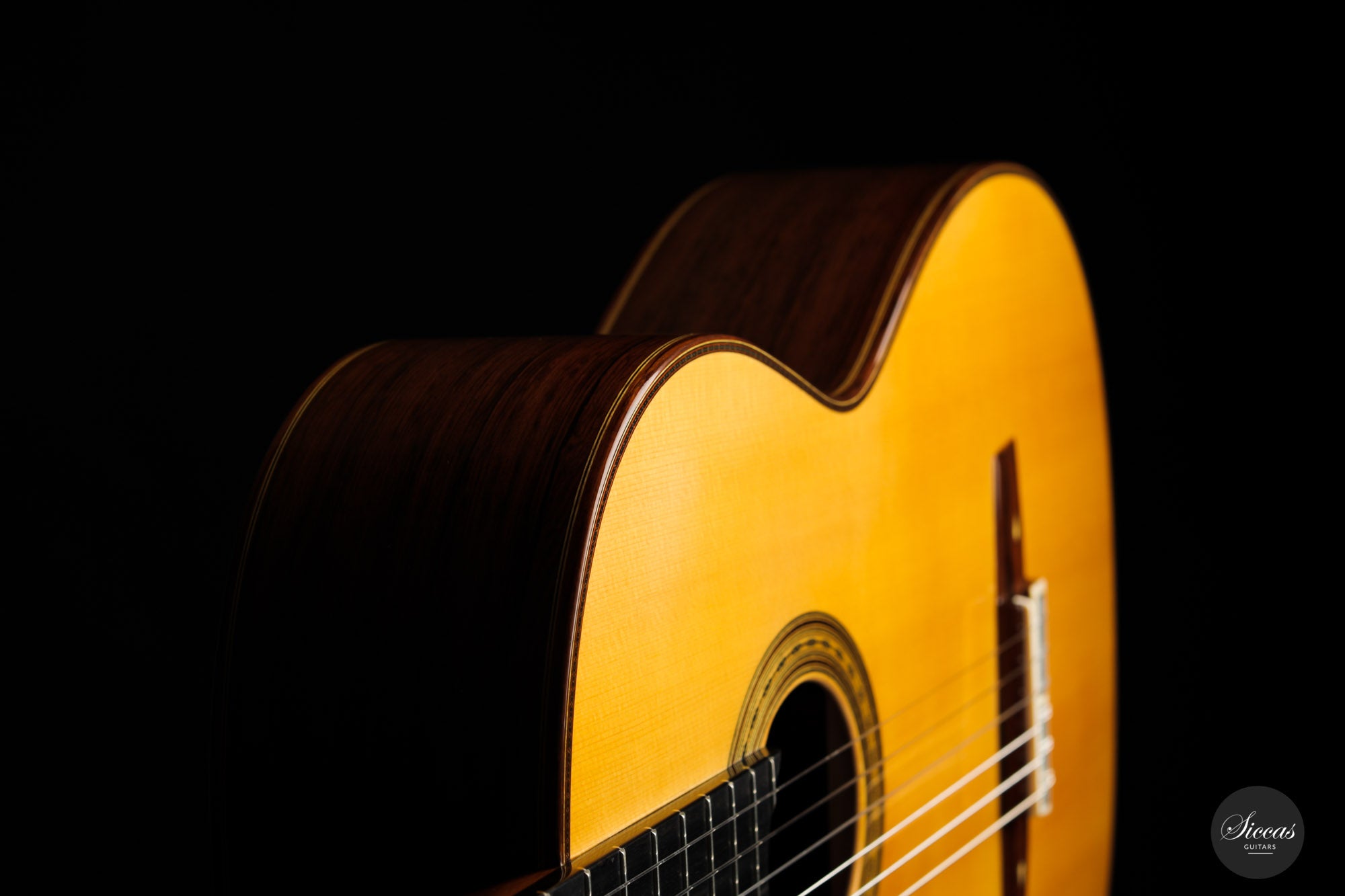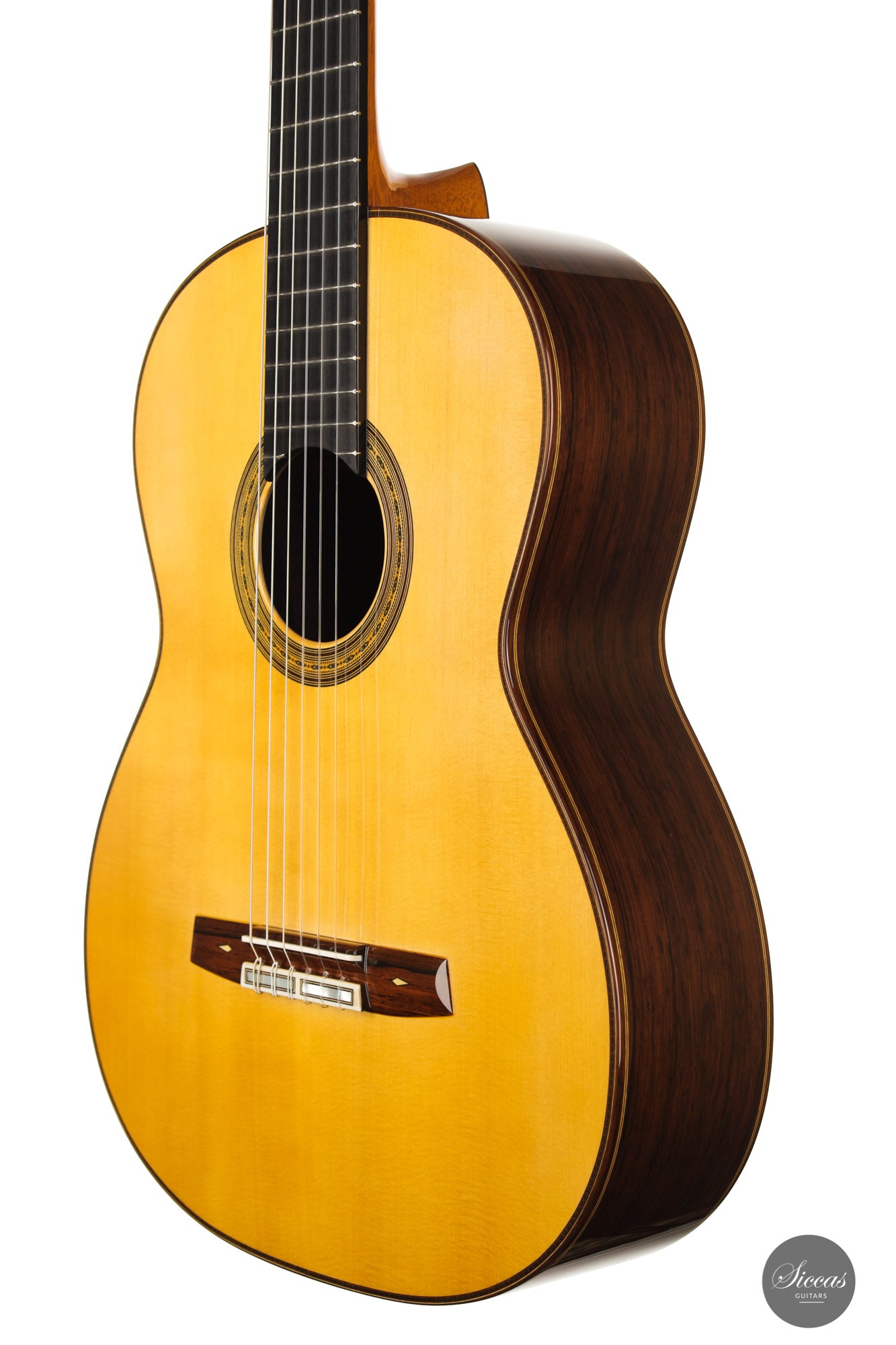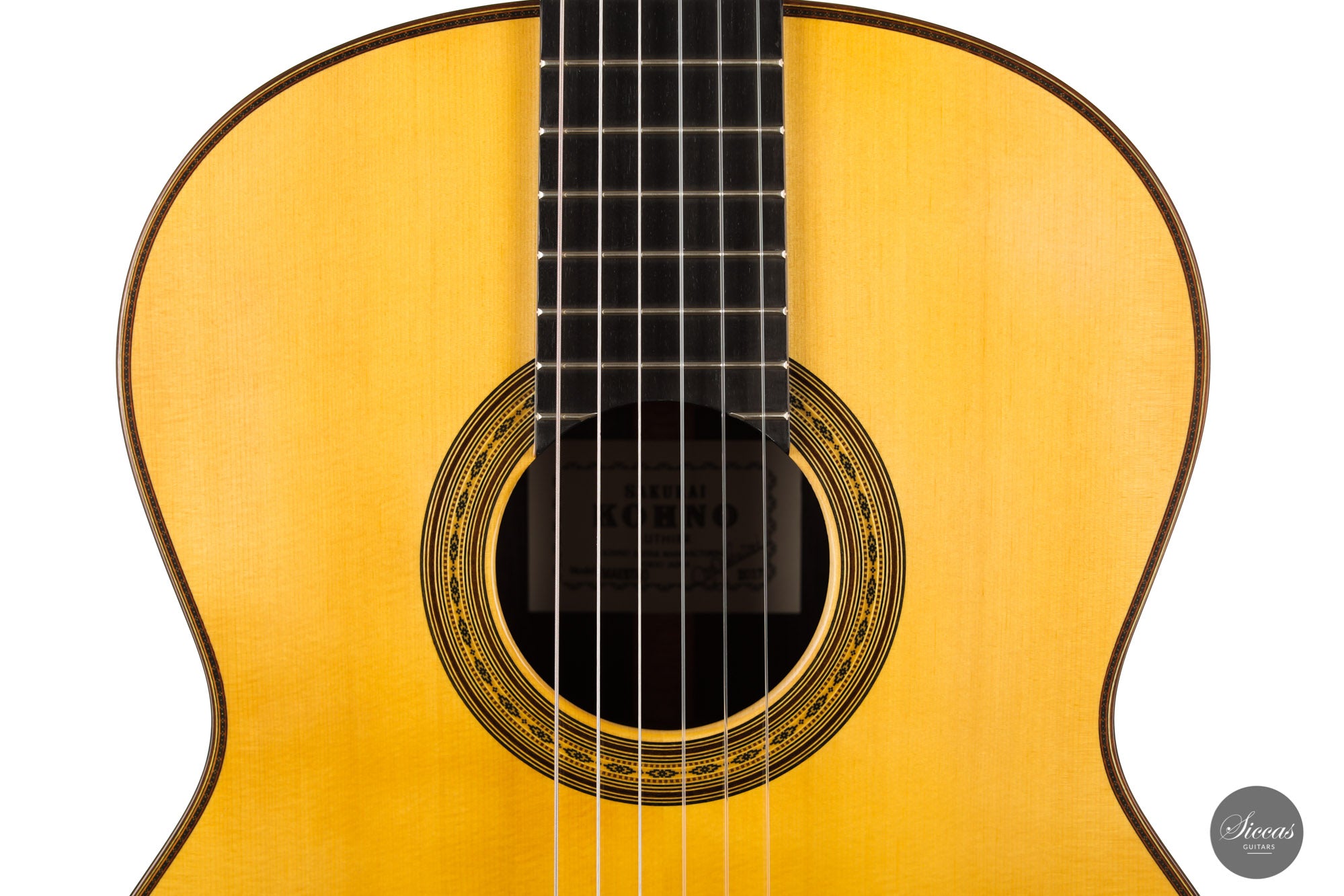 The Maestro model is a very beautiful guitar made from the oldest and highest quality precious woods found in the Kohno stock. This exceptional guitar is as new, without any signs of play wear. It is built with the seven fan bars and an asymmetrical bracing typical of Masaki Sakurai, combined with three very thin crossbars. This guitar is responsive and has an excellent volume. Furthermore, the sound is precise and projects clearly. It is a guitar with an optimal balance and a relatively neutral but very malleable tone. This allows the guitarist to express himself freely in all repertoires. It is therefore an instrument rich in timbre, very easy to play, and without a doubt capable of filling concert halls.
