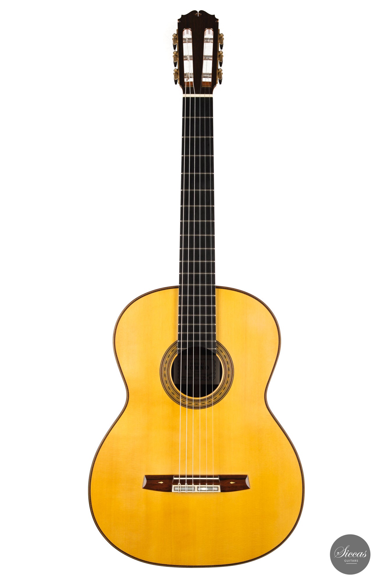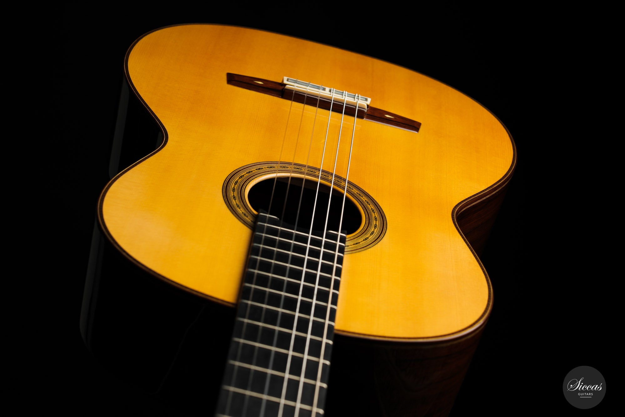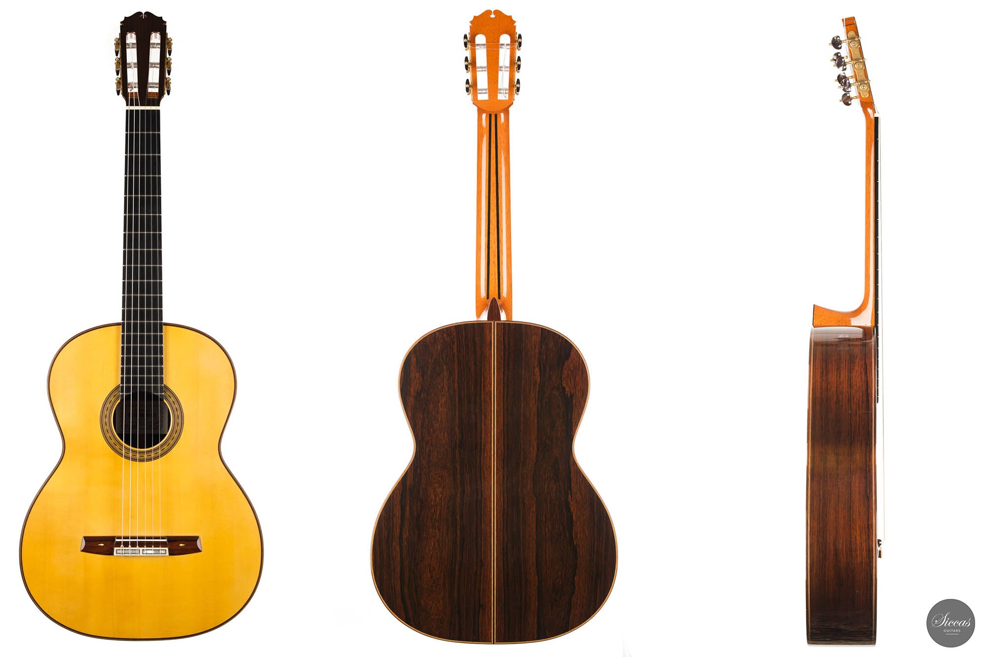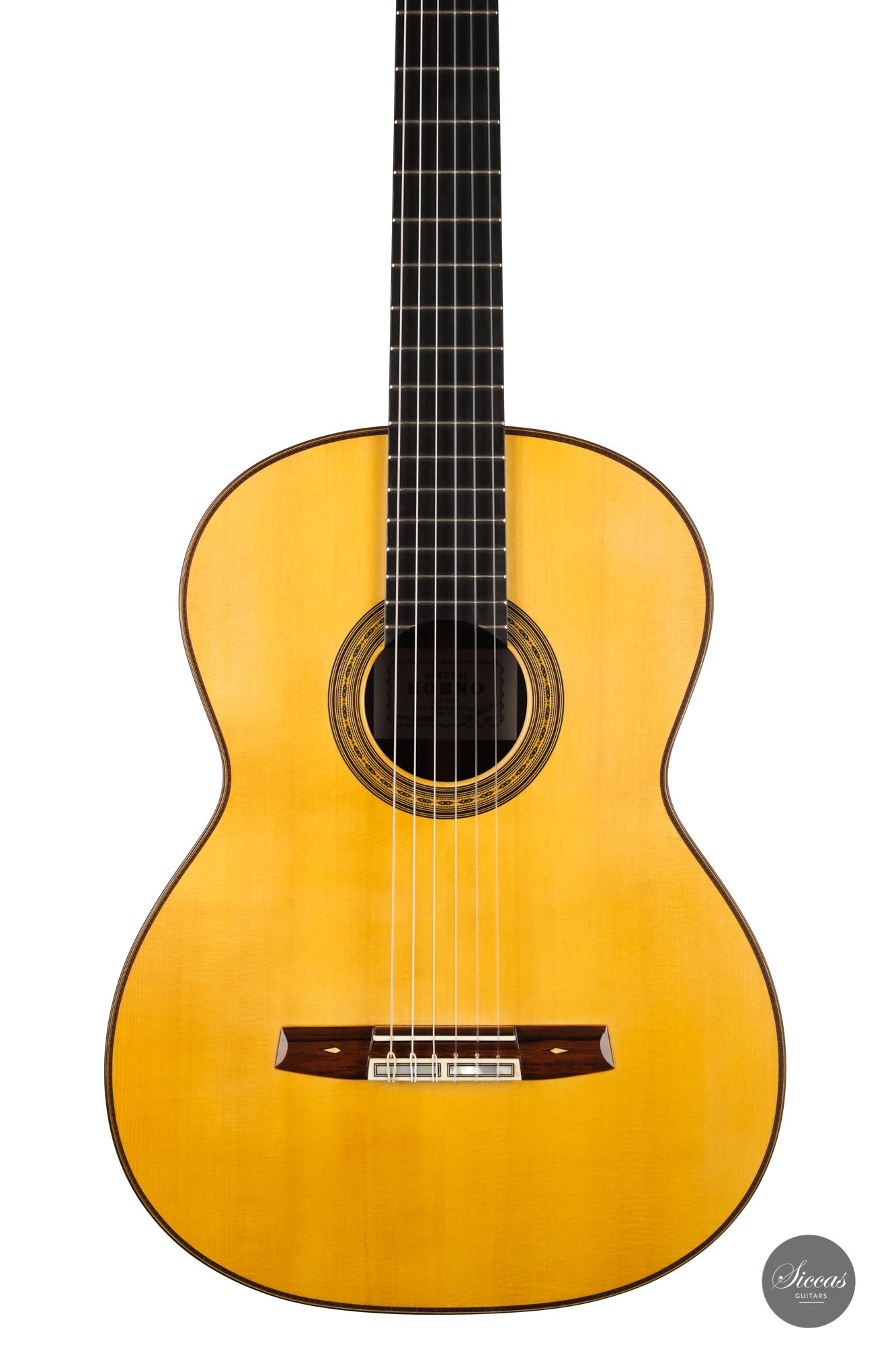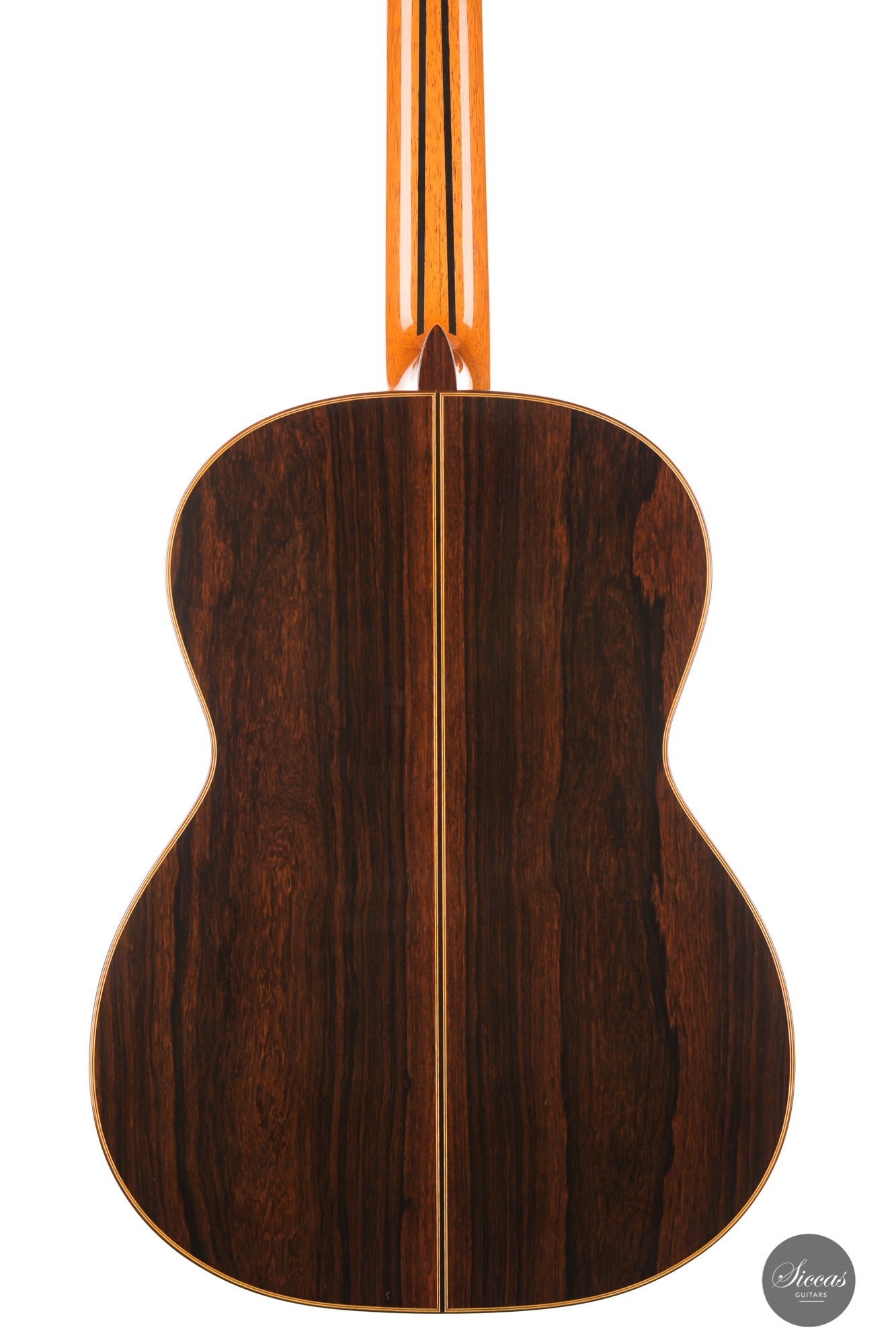 The Maestro model is a very beautiful guitar made from the oldest and highest quality precious woods found in the Kohno stock. This exceptional guitar is as new, without any signs of play wear. It is built with the seven fan bars and an asymmetrical bracing typical of Masaki Sakurai, combined with three very thin crossbars. This guitar is responsive and has an excellent volume. Furthermore, the sound is precise and projects clearly. It is a guitar with an optimal balance and a relatively neutral but very malleable tone. This allows the guitarist to express himself freely in all repertoires. It is therefore an instrument rich in timbre, very easy to play, and without a doubt capable of filling concert halls.