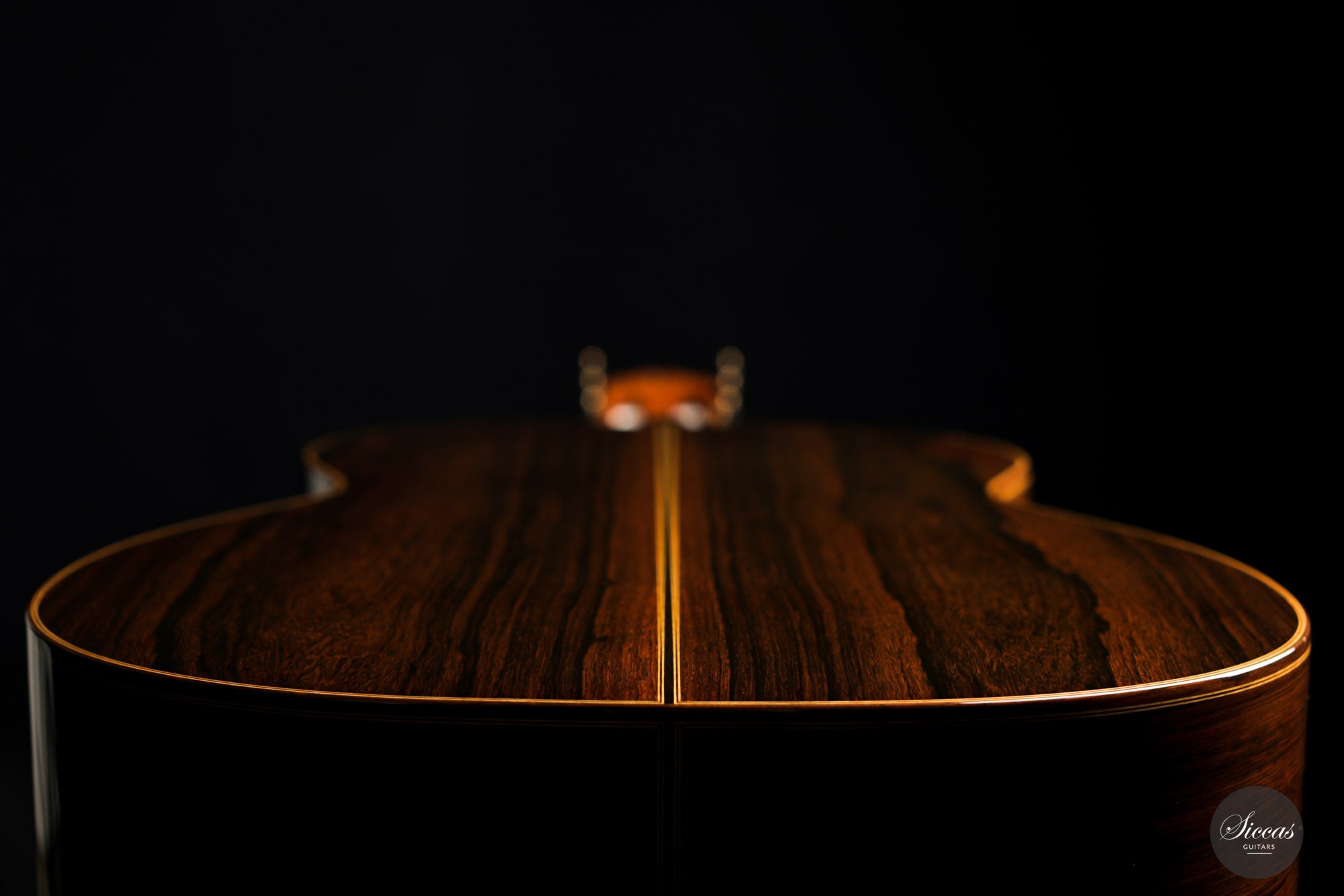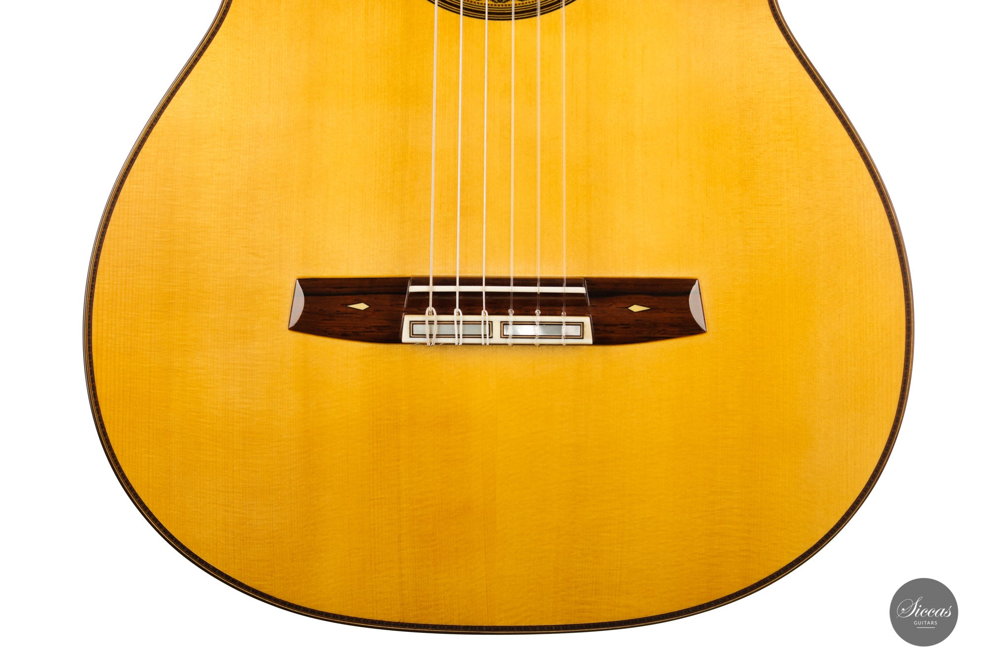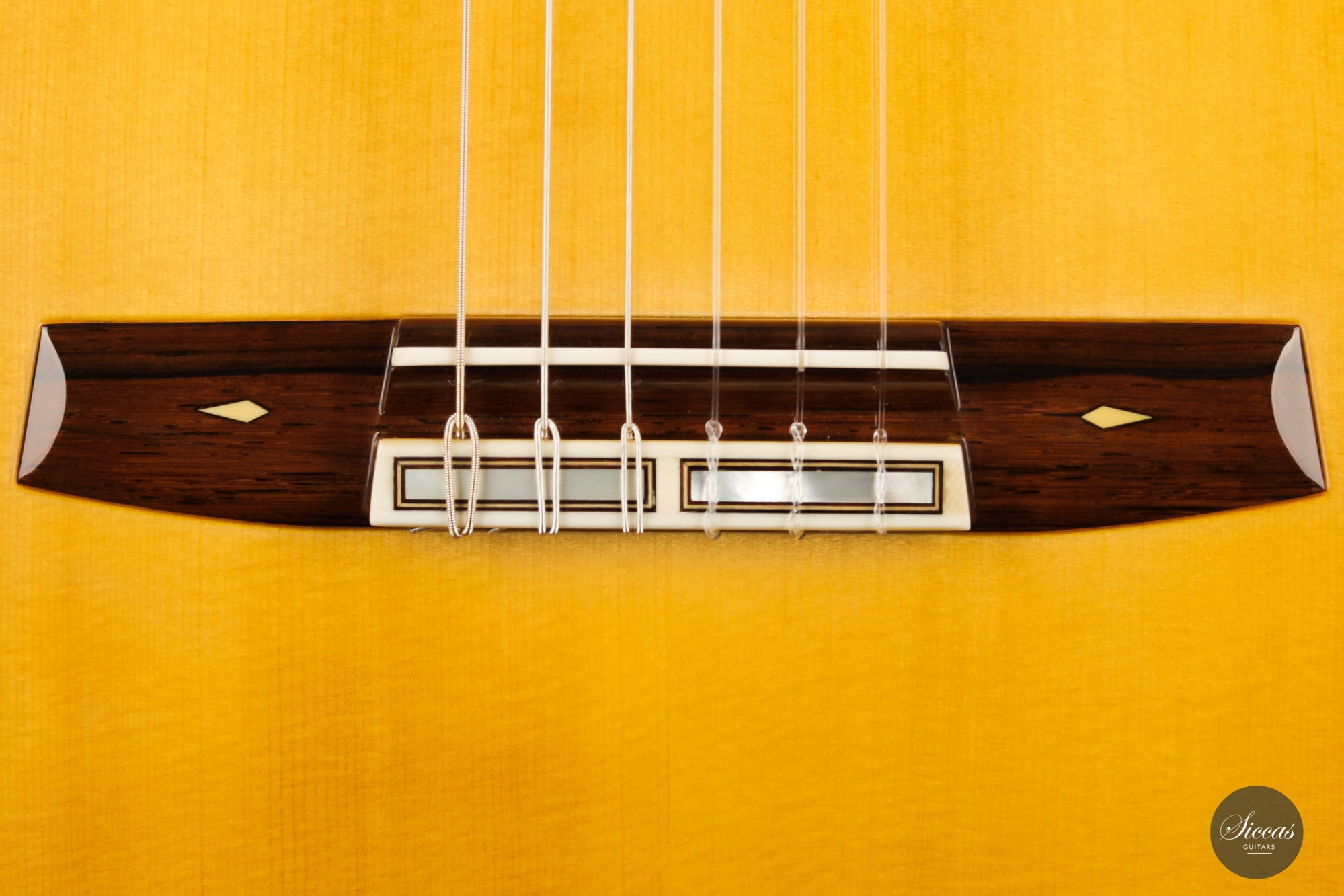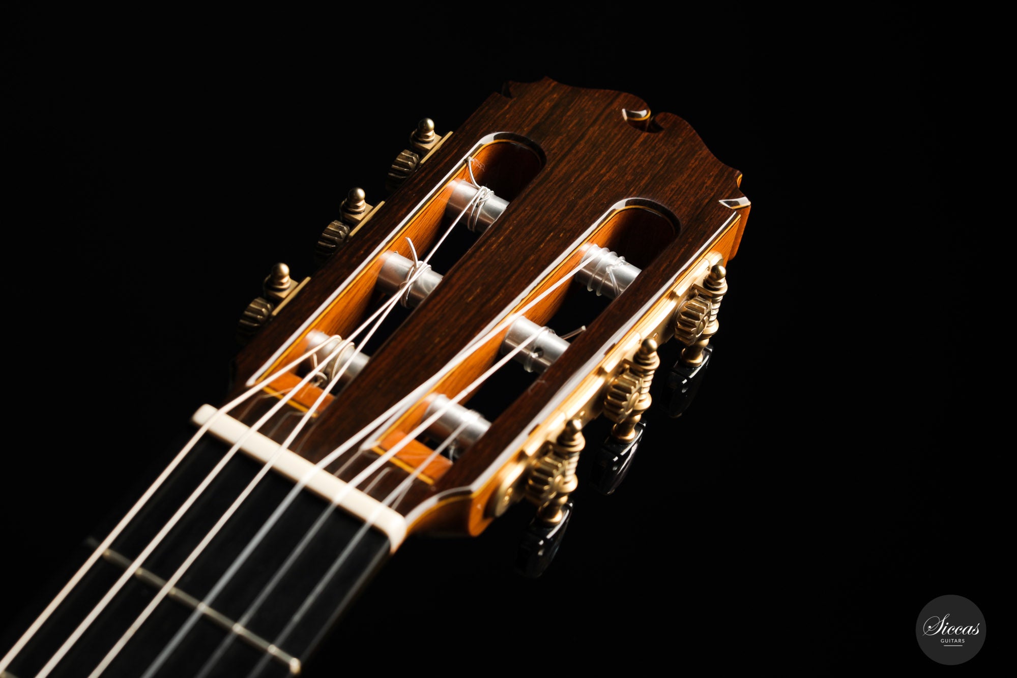The Maestro model is a very beautiful guitar made from the oldest and highest quality precious woods found in the Kohno stock. This exceptional guitar is as new, without any signs of play wear. It is built with the seven fan bars and an asymmetrical bracing typical of Masaki Sakurai, combined with three very thin crossbars. This guitar is responsive and has an excellent volume. Furthermore, the sound is precise and projects clearly. It is a guitar with an optimal balance and a relatively neutral but very malleable tone. This allows the guitarist to express himself freely in all repertoires. It is therefore an instrument rich in timbre, very easy to play, and without a doubt capable of filling concert halls.
