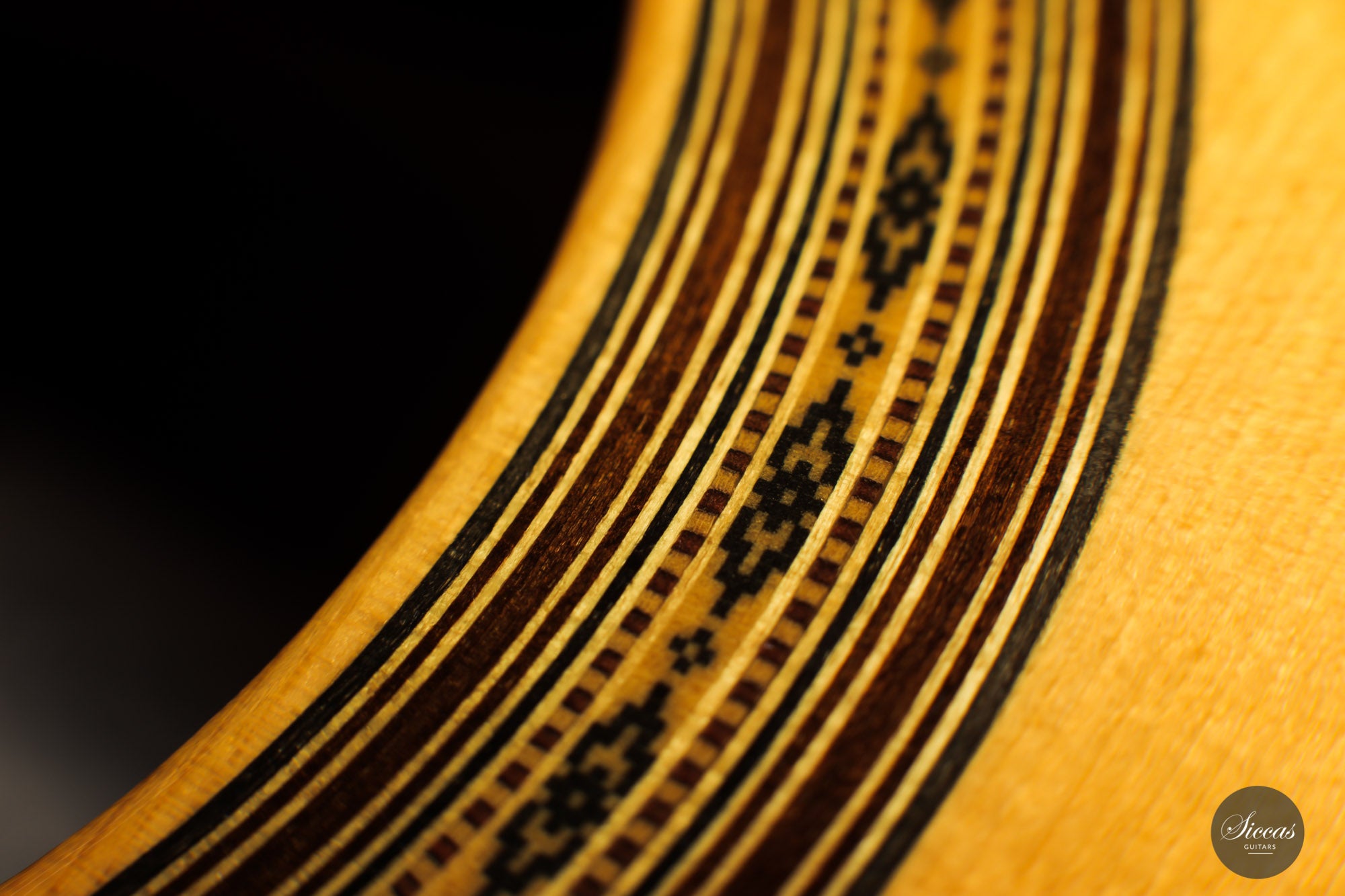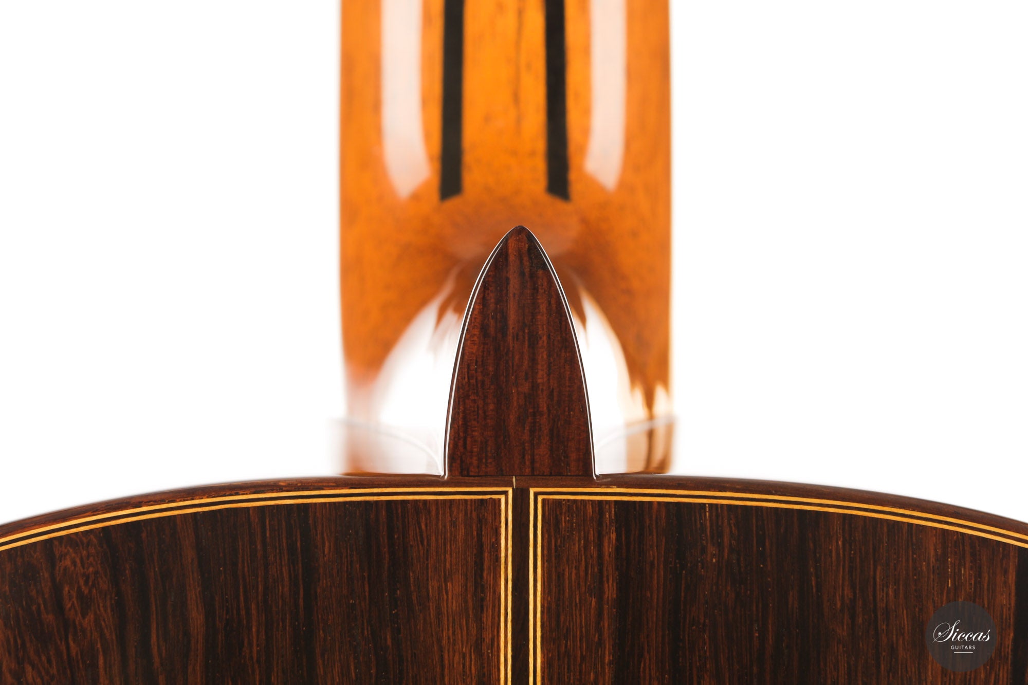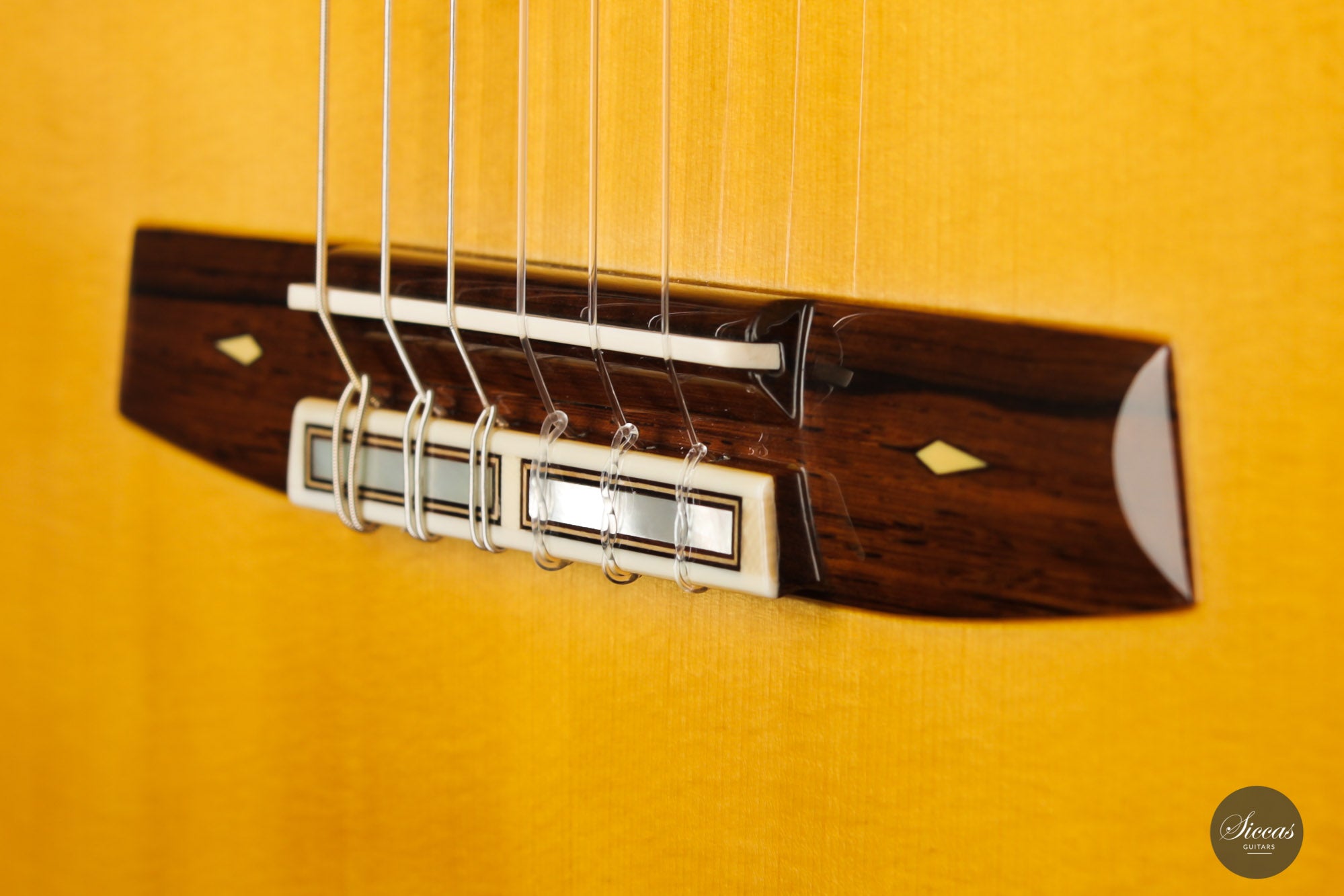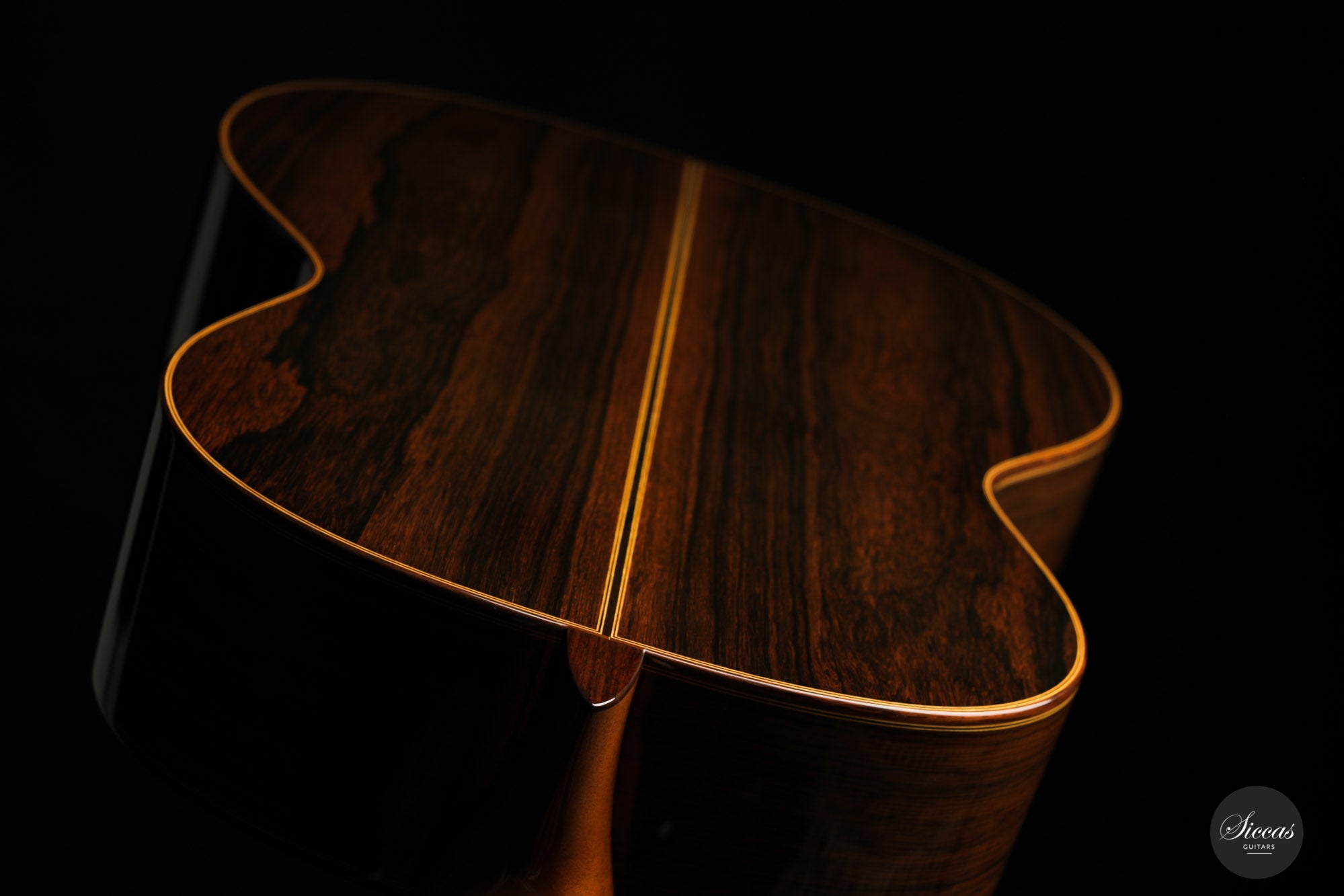The Maestro model is a very beautiful guitar made from the oldest and highest quality precious woods found in the Kohno stock. This exceptional guitar is as new, without any signs of play wear. It is built with the seven fan bars and an asymmetrical bracing typical of Masaki Sakurai, combined with three very thin crossbars. This guitar is responsive and has an excellent volume. Furthermore, the sound is precise and projects clearly. It is a guitar with an optimal balance and a relatively neutral but very malleable tone. This allows the guitarist to express himself freely in all repertoires. It is therefore an instrument rich in timbre, very easy to play, and without a doubt capable of filling concert halls.