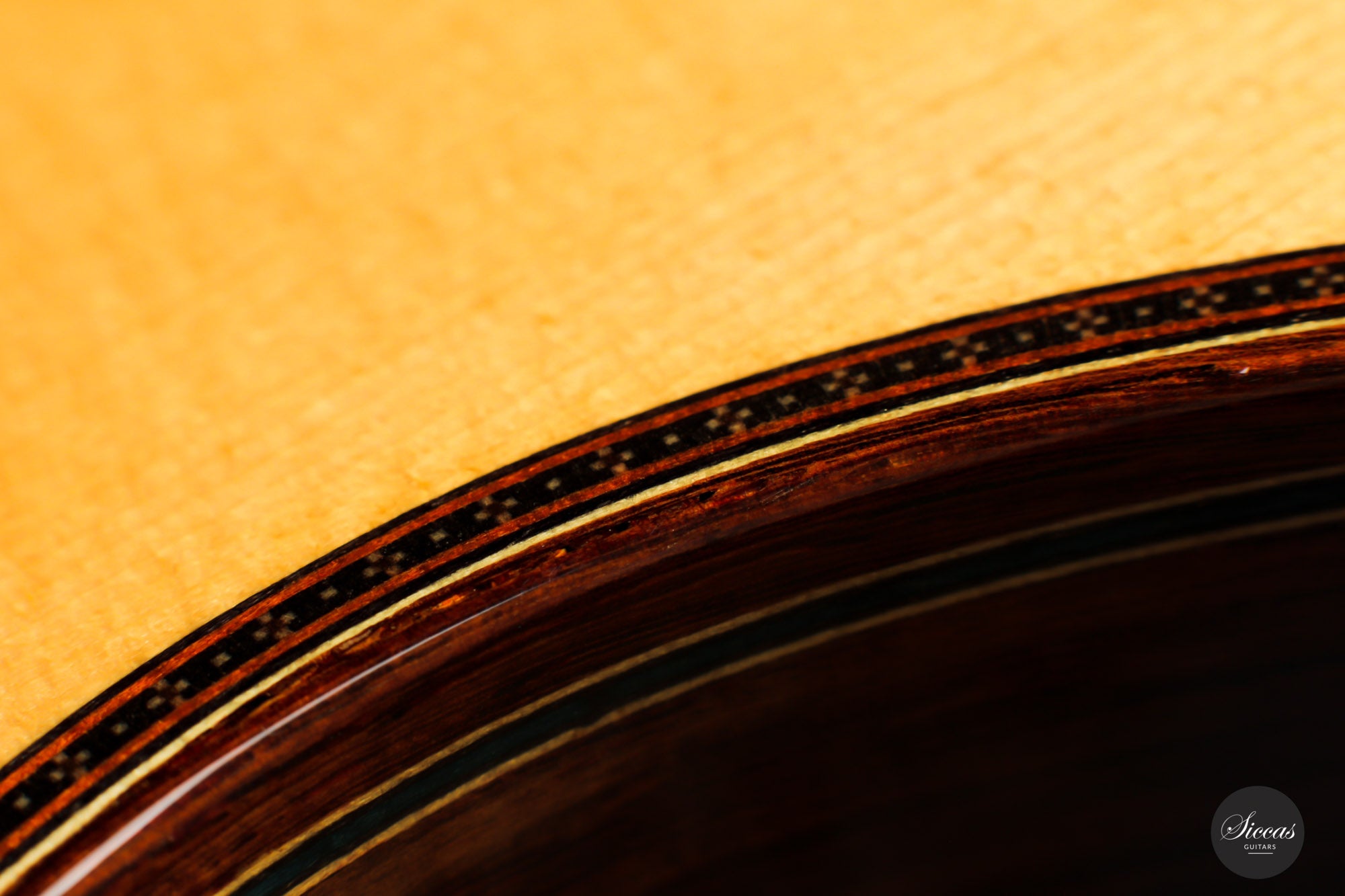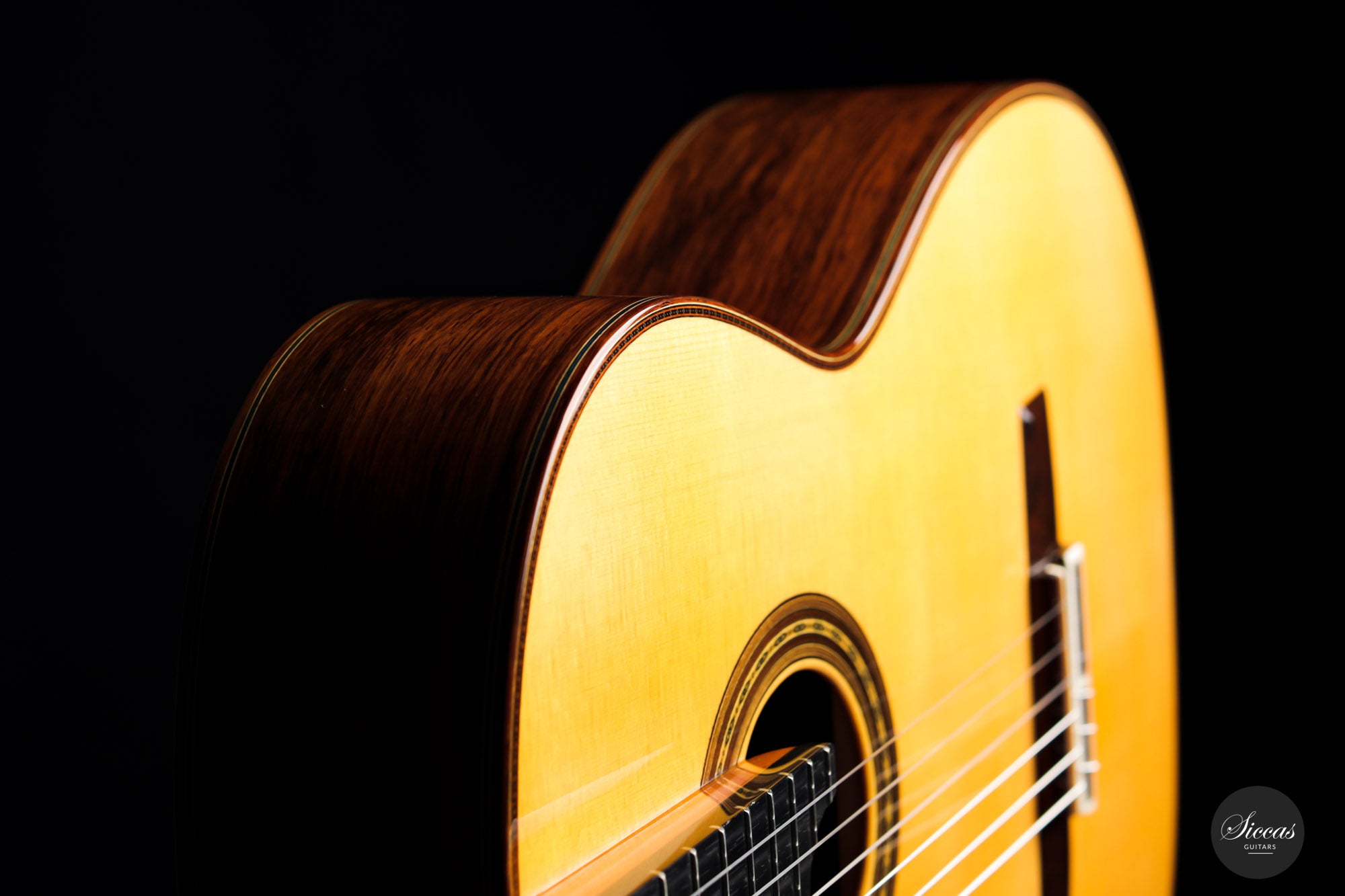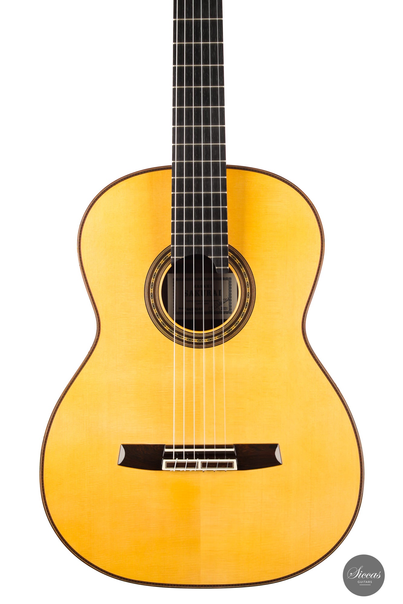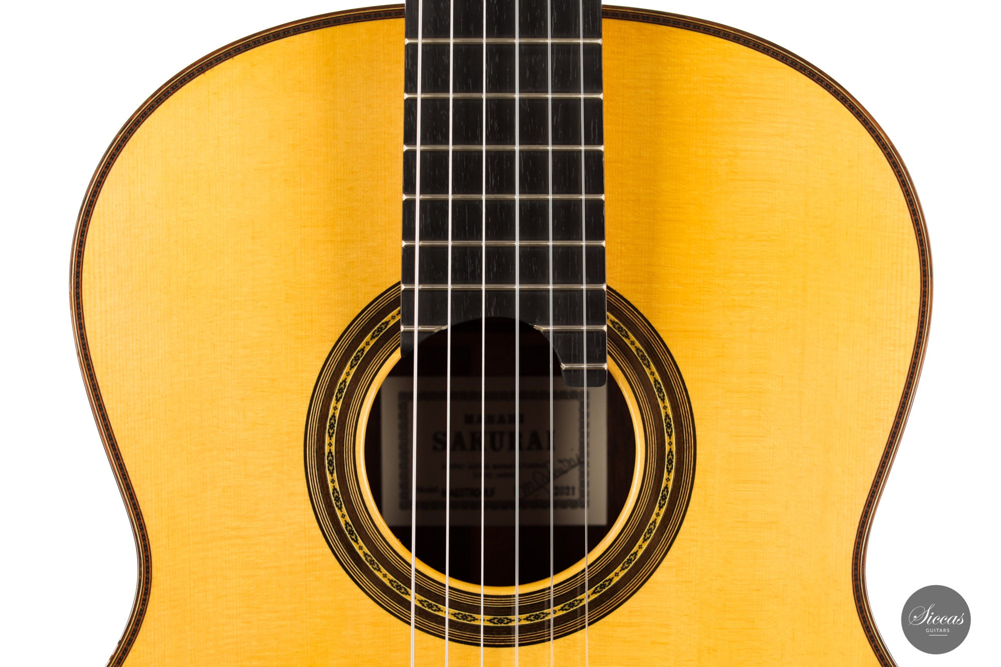 The "Maestro RF" is the most advanced model made by Masaki Sakurai. It is a very beautiful guitar crafted from the oldest and most precious tone woods from the Kohno stock. This model can be recognized by the head decorated with fine marquetry and by the significantly raised fingerboard. This exceptional guitar is new, straight from the famous Japanese workshop. It is built with the seven fan bars and extremely asymmetrical bracing typical of Masaki Sakurai, combined with three very thin crossbars.