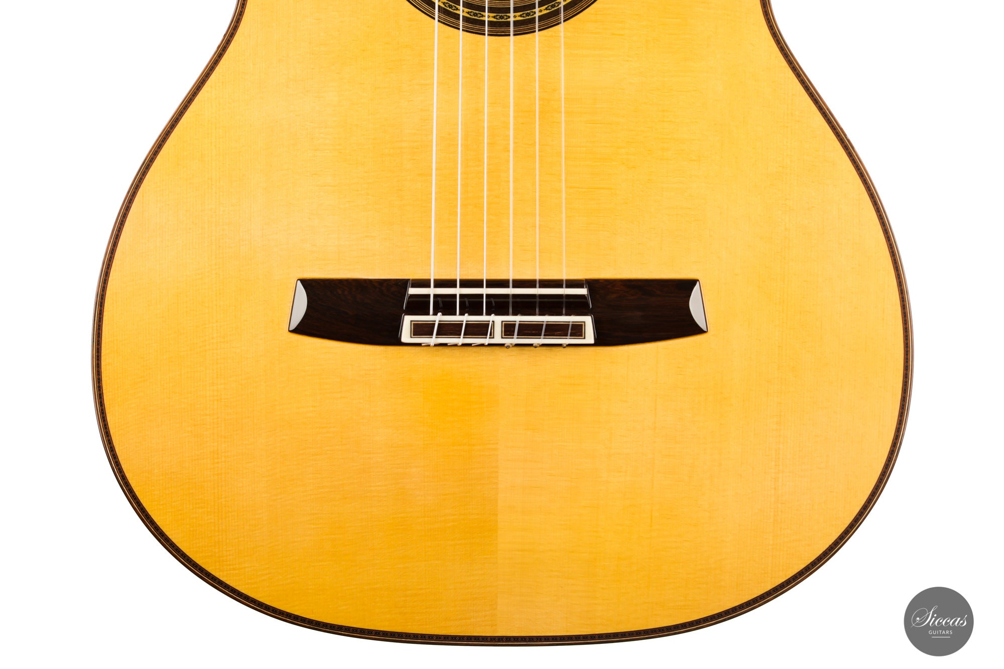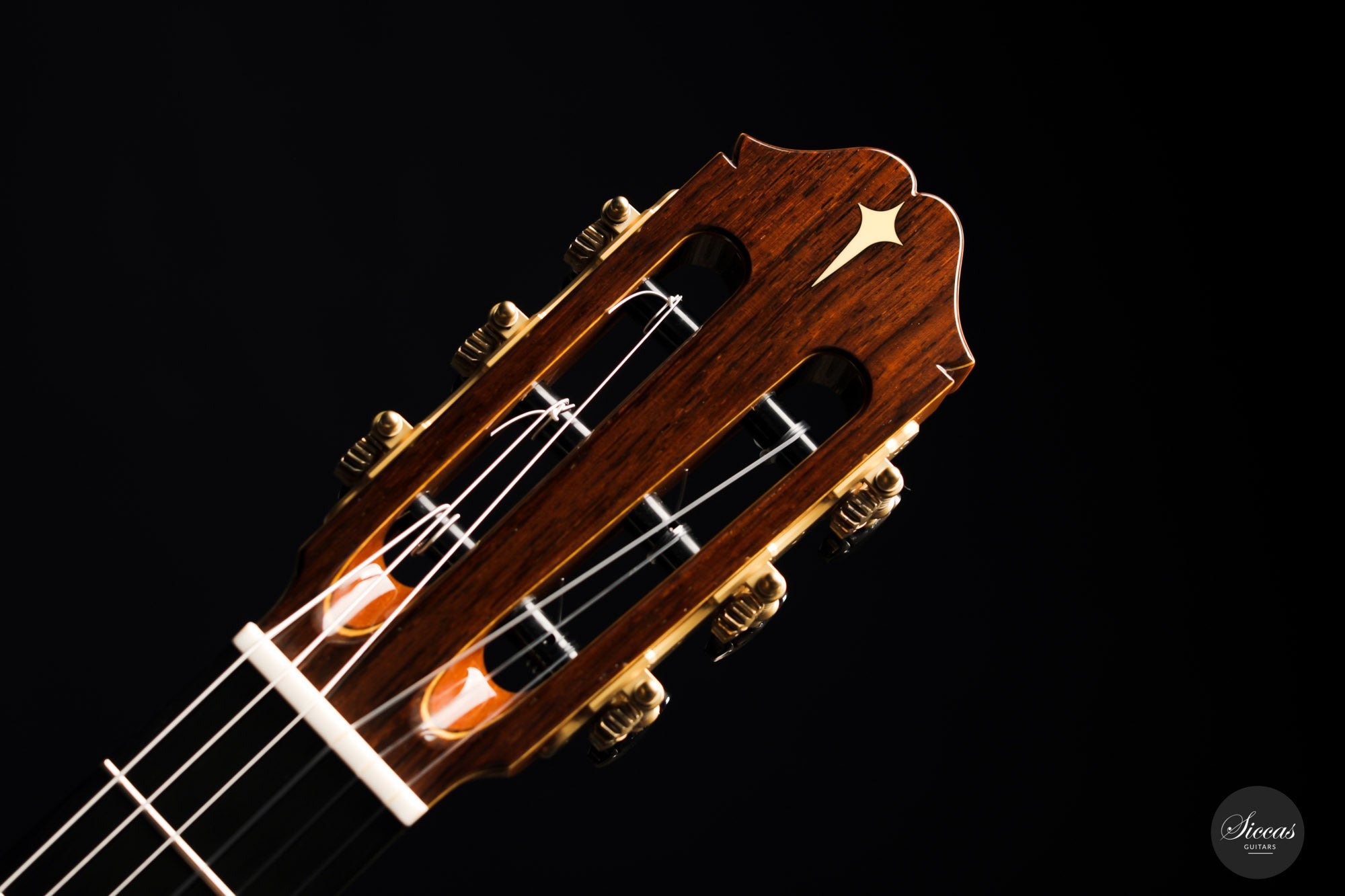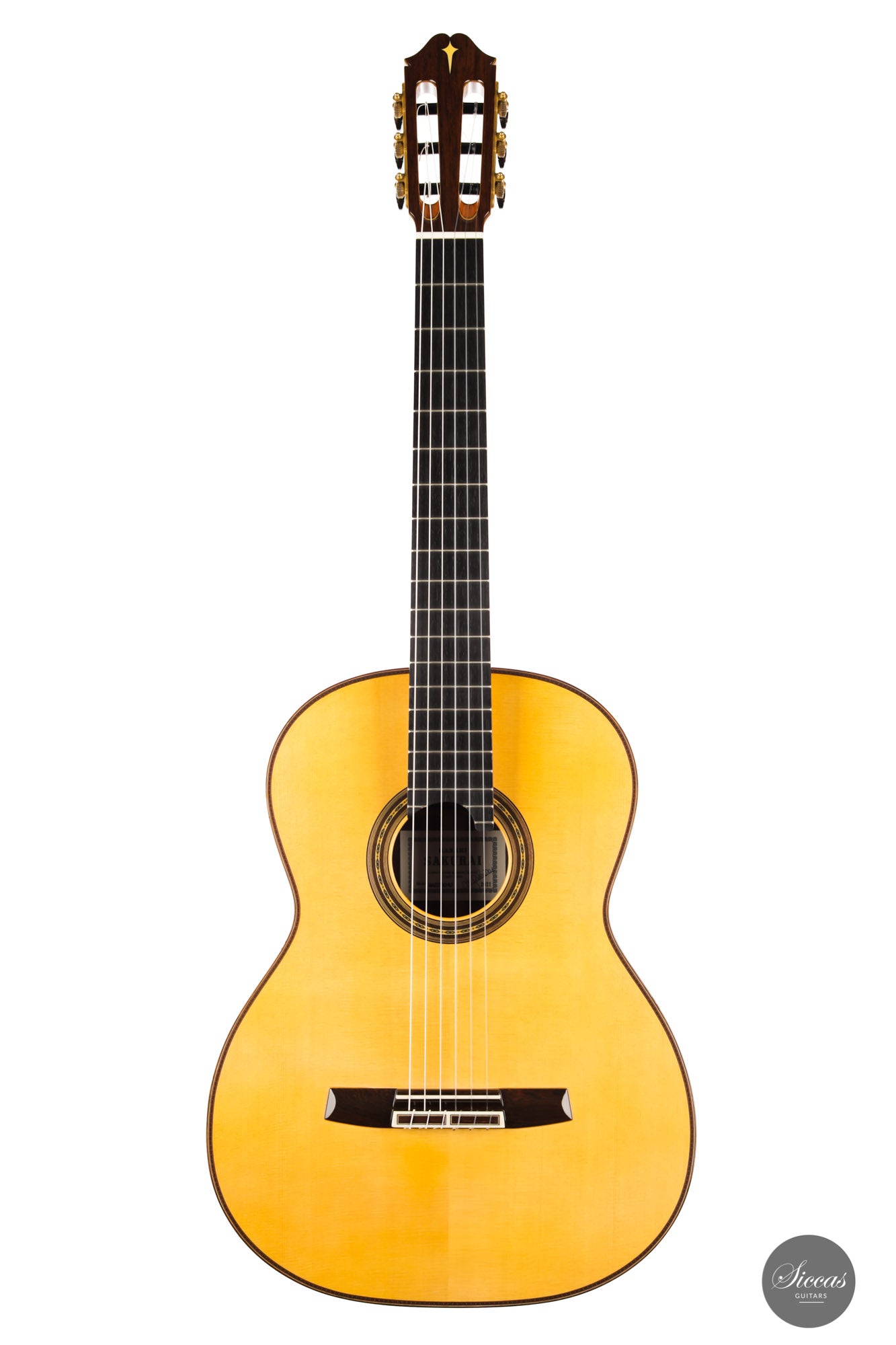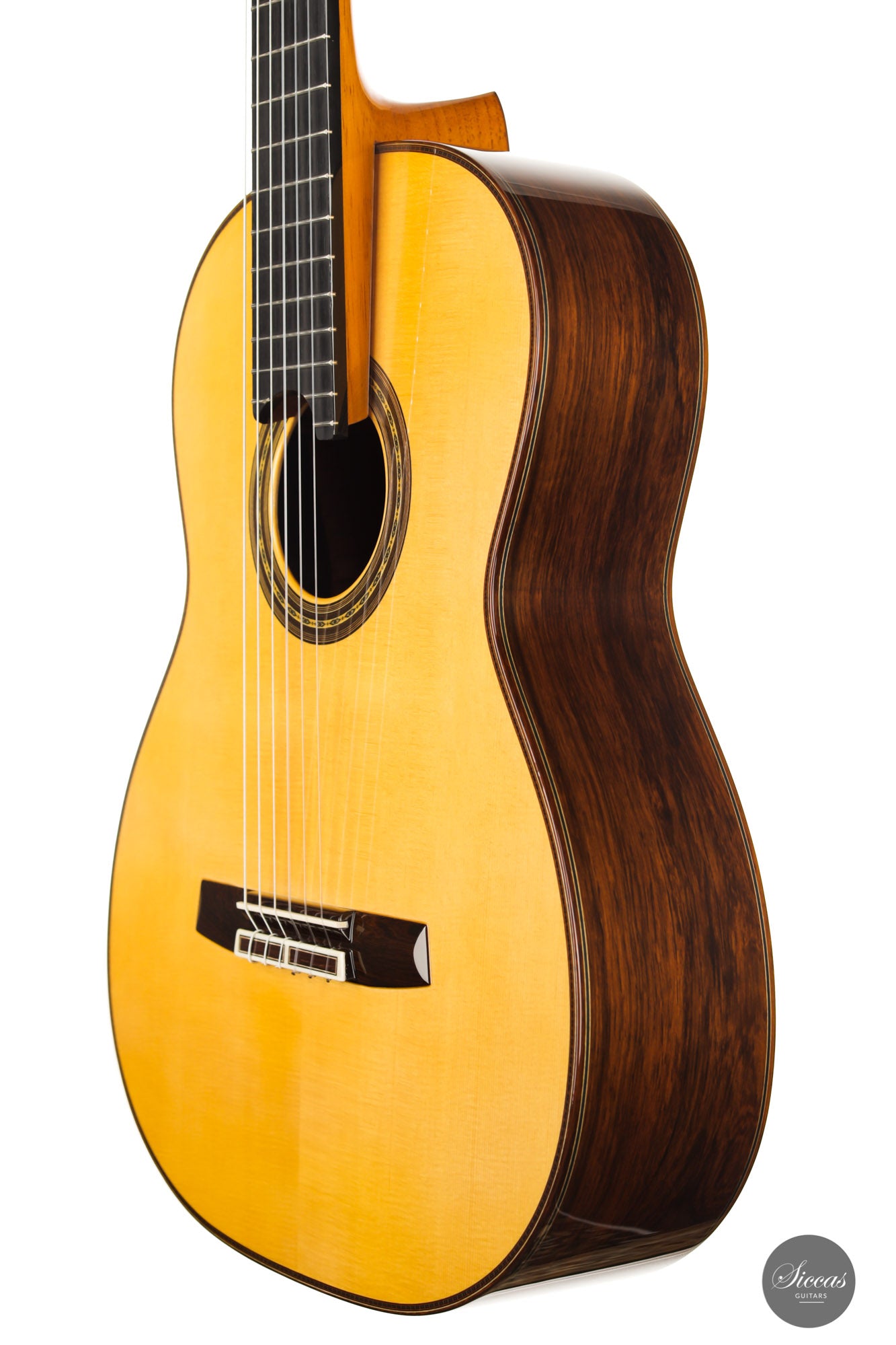 The "Maestro RF" is the most advanced model made by Masaki Sakurai. It is a very beautiful guitar crafted from the oldest and most precious tone woods from the Kohno stock. This model can be recognized by the head decorated with fine marquetry and by the significantly raised fingerboard. This exceptional guitar is new, straight from the famous Japanese workshop. It is built with the seven fan bars and extremely asymmetrical bracing typical of Masaki Sakurai, combined with three very thin crossbars.