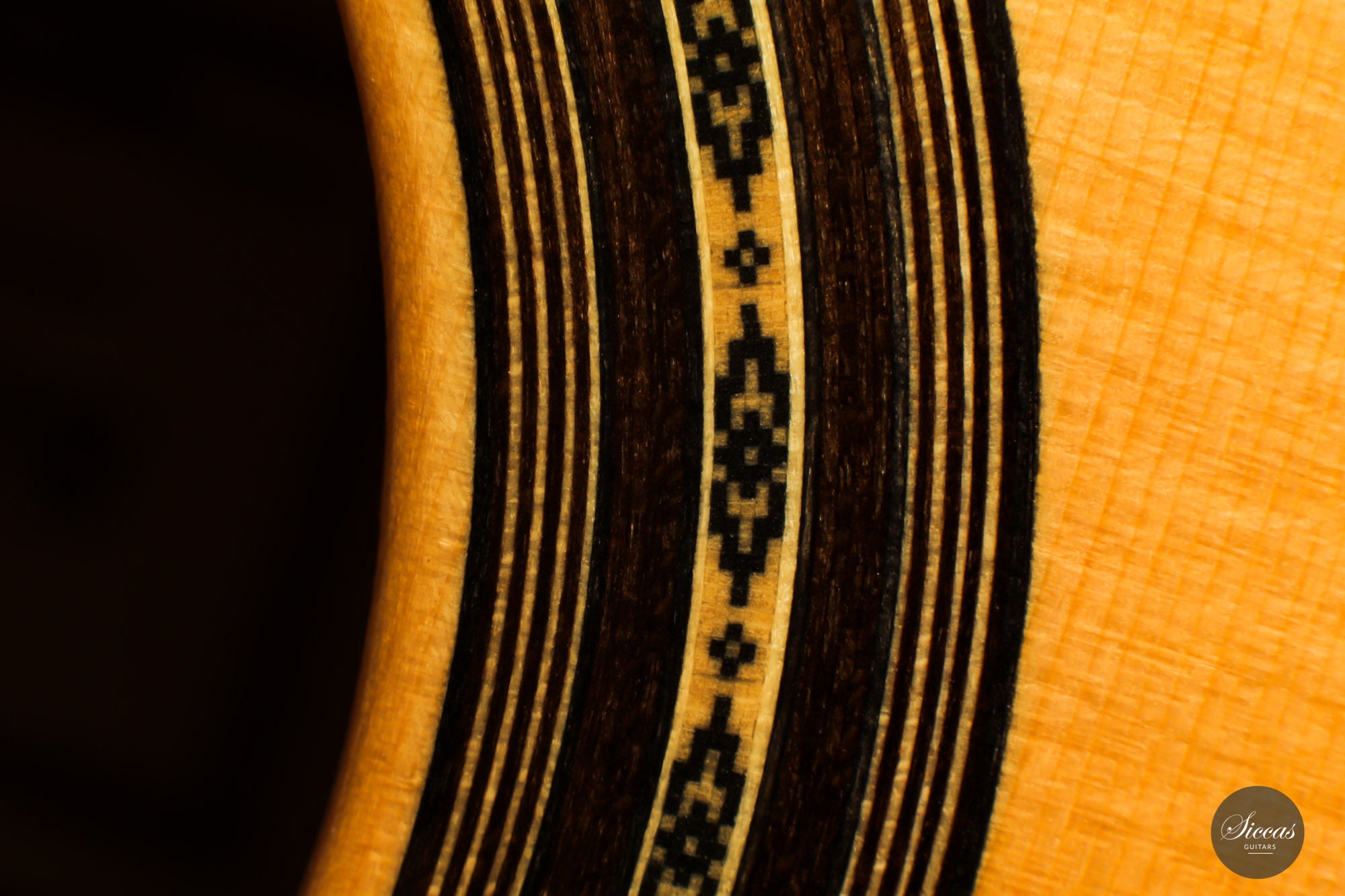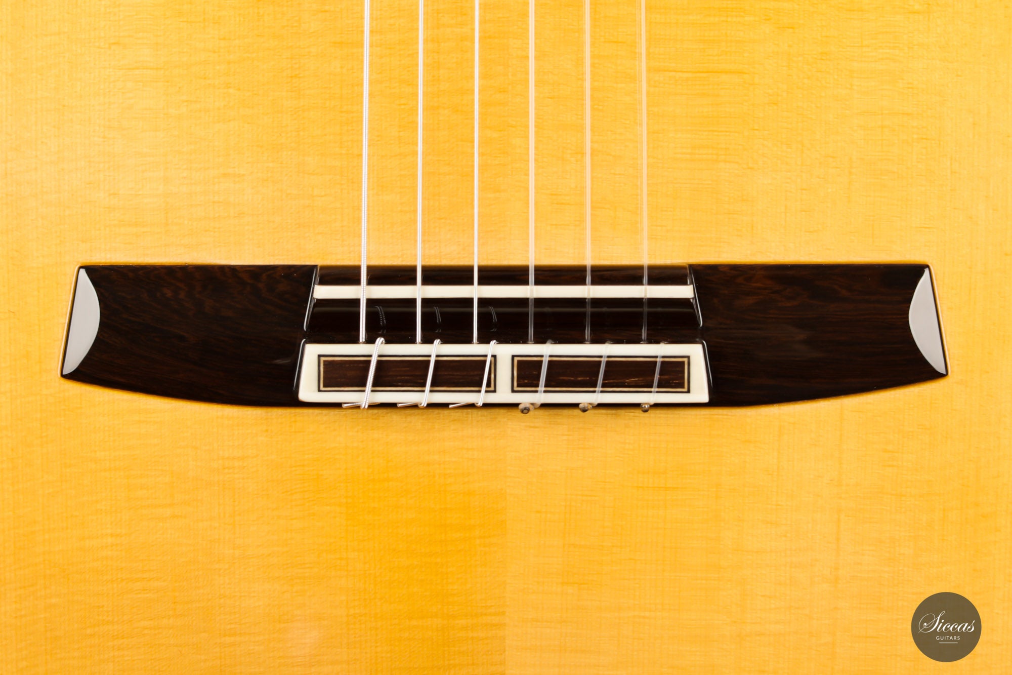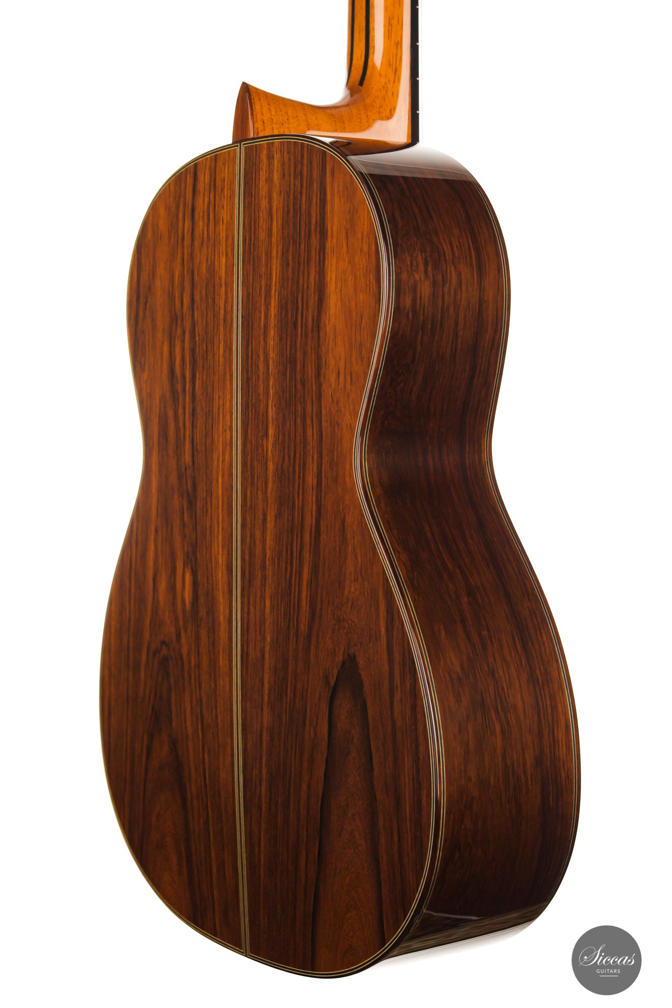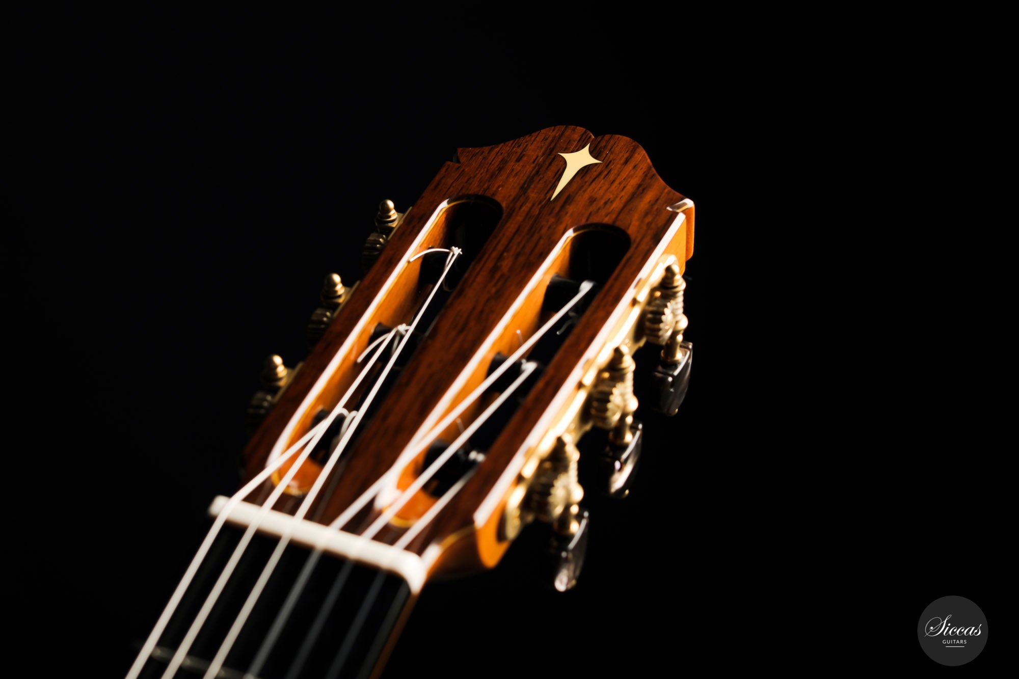 The "Maestro RF" is the most advanced model made by Masaki Sakurai. It is a very beautiful guitar crafted from the oldest and most precious tone woods from the Kohno stock. This model can be recognized by the head decorated with fine marquetry and by the significantly raised fingerboard. This exceptional guitar is new, straight from the famous Japanese workshop. It is built with the seven fan bars and extremely asymmetrical bracing typical of Masaki Sakurai, combined with three very thin crossbars.