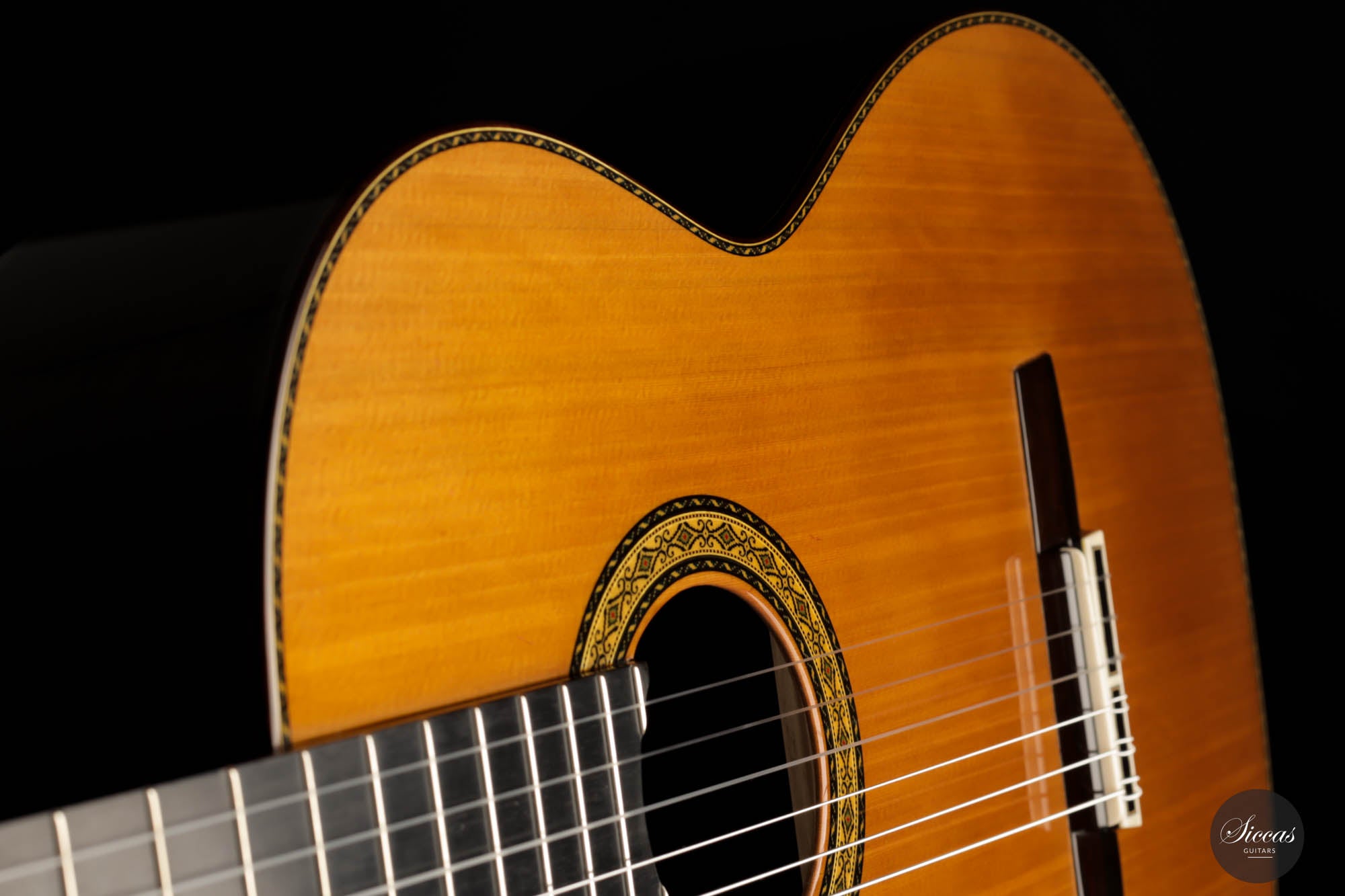 This brand-new cedar top instrument is characterized by its round and lyrical trebles. Furthermore, the warm basses and velvety middle voices enrich the entire sound palette. Due to its openness, this instrument is very satisfying to play and responds well to the attack of the right hand. Furthermore, the comfortable playability due to its pleasantly shaped neck and huge volume make this guitar an excellent concert instrument for any playing situation.