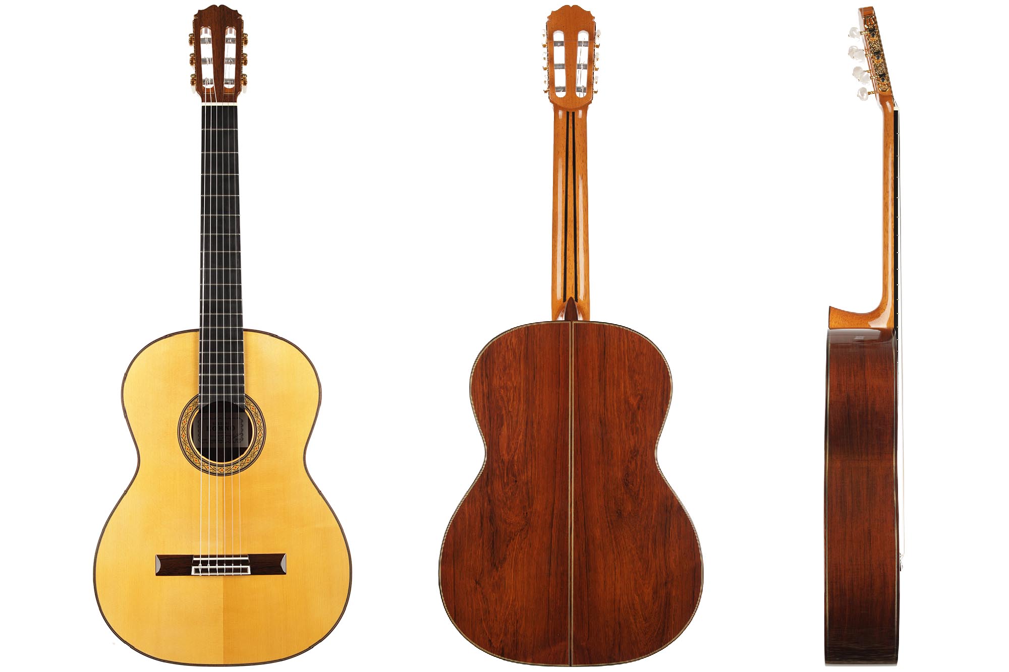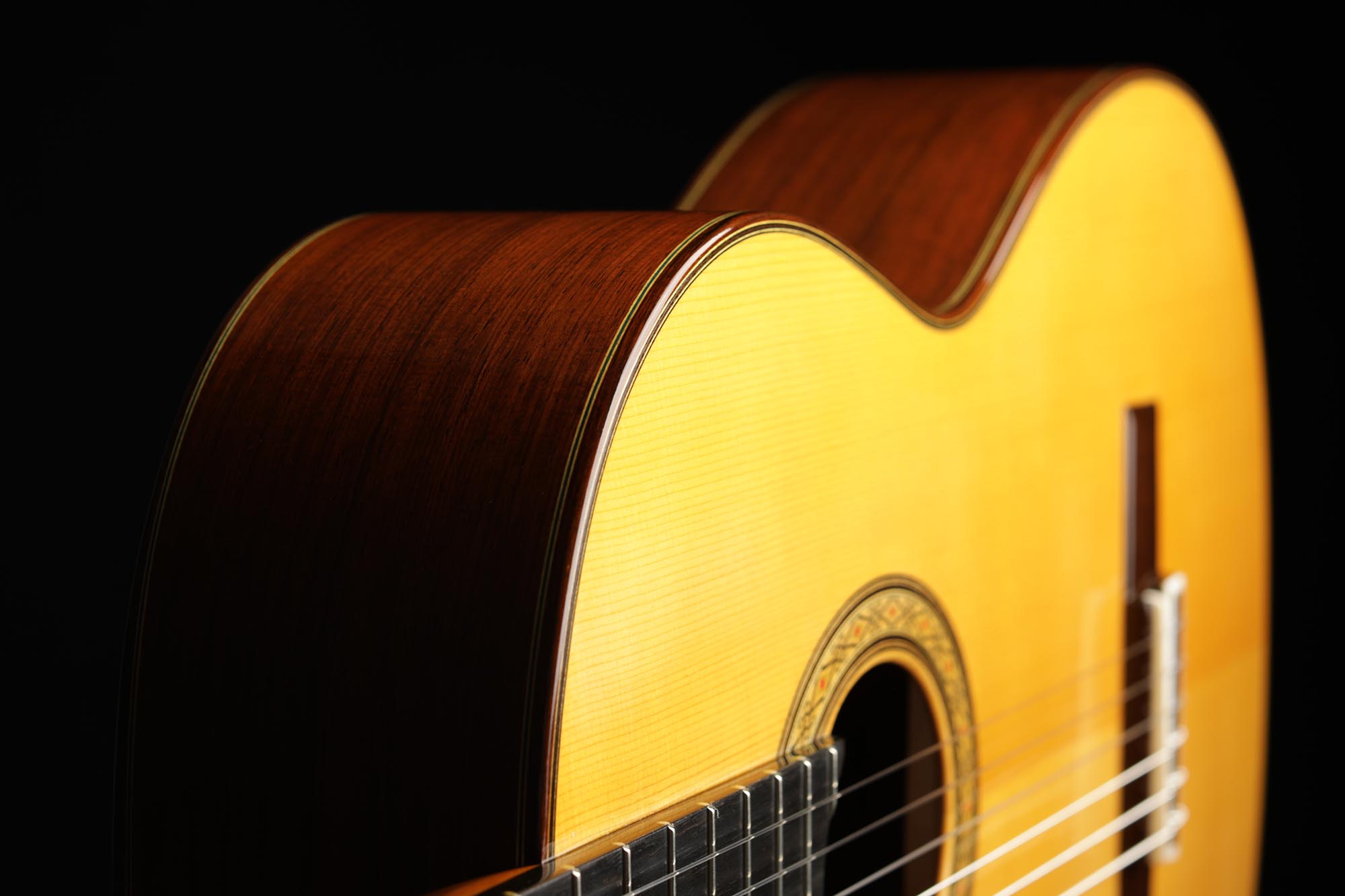 The model “Professional J” is a beautiful instrument, which is easily recognizable by its symmetrical bridge, as it is the only model of the Sakurai-Kohno line that has this feature, as well as by its beautiful back and sides made of Madagascar rosewood. Masaki Sakurai builds this guitar in the same tradition and manner as his uncle Masaru Kohno used to, resulting in an instrument very similar to the Model 30 from the early 1970s. However, unlike the earlier 664 mm scale models, this instrument has a more comfortable 650 mm scale, which makes it much more accessible for most guitarists.