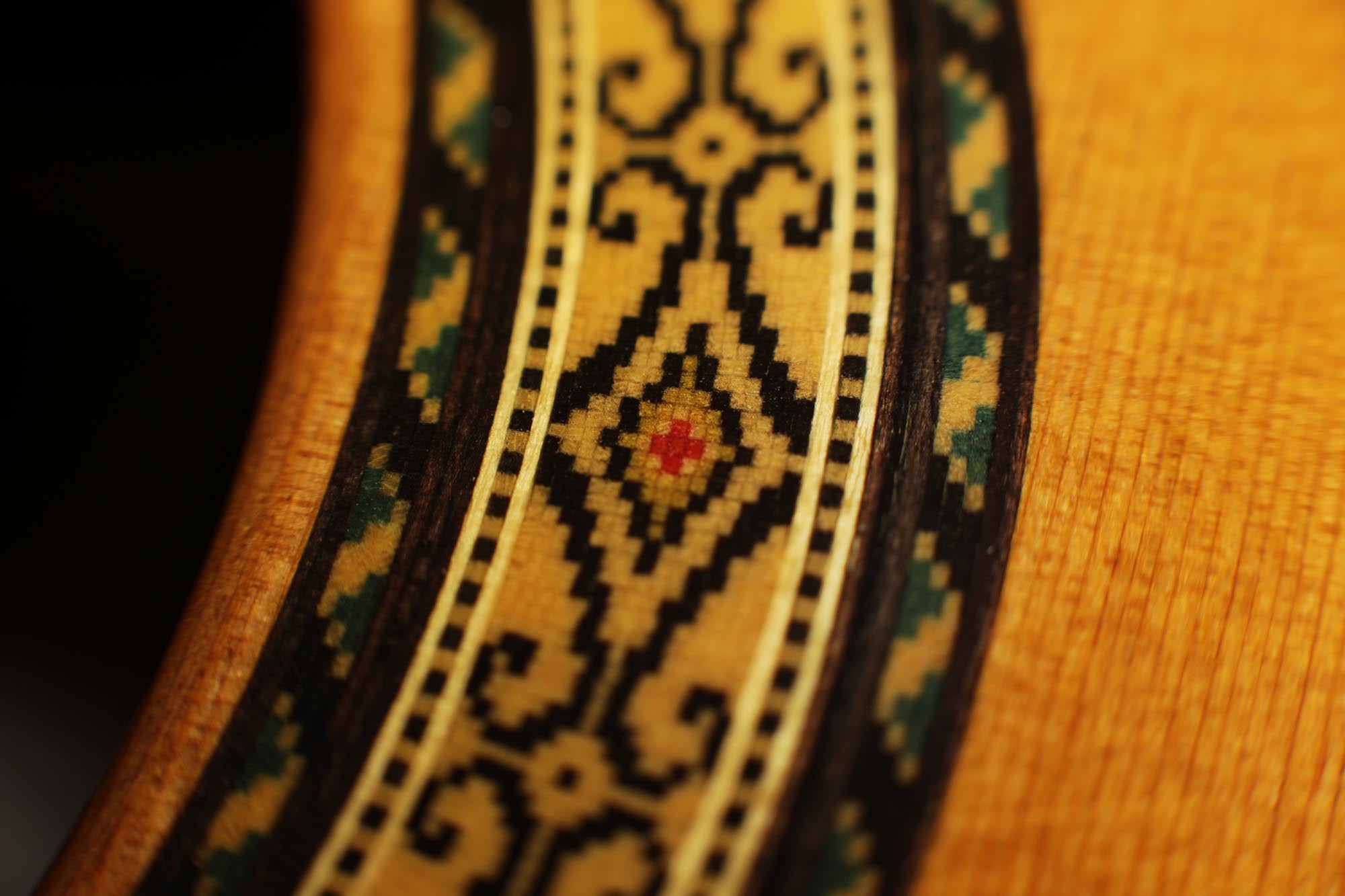 This lovely Sakurai Kohno Special model has a very fine cedar soundboard, contrasting nicely with the tasteful marquetry of the instrument. The well-selected cedar has an impressive, very close grain and a very homogeneous color. Homogeneous is also an adjective that perfectly describes the pure and very balanced sound of this guitar. The harmony of timbres across all strings and positions on the fingerboard is remarkable. In addition, it has a very pure clarity in the chords, which together with the smooth and warm sound of the cedar creates a rich, powerful, and truly versatile guitar.