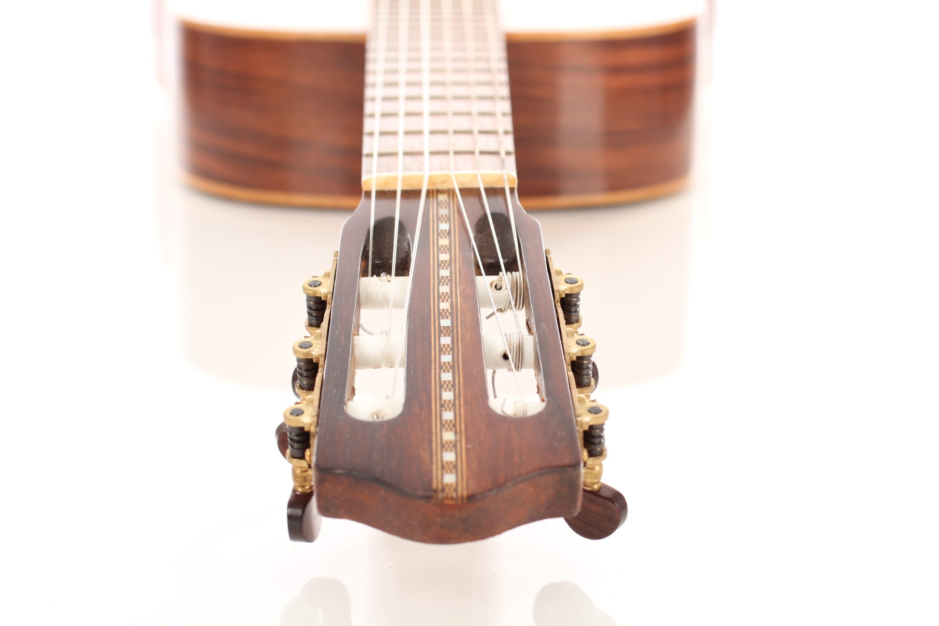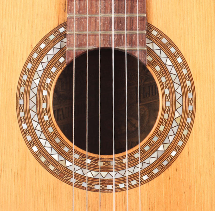 Salvador Ibáñez (* 1854 in Valencia; † 1920) began his apprenticeship as a luthier in Valencia. In 1870 he founded his own workshop where he built guitars, ukuleles and mandolins. In 1897 he built one of the first double-neck guitars. After his death in 1920 his two sons took over the workshop. This guitar was built around 1900. There are five well repaired cracks on the spruce top. Back and sides are made of rosewood. The rosette and also at the center of the head stock are decorated with mother of pearl inlays. The original tuners have been replaced. The guitar is in incredible condition for its age.