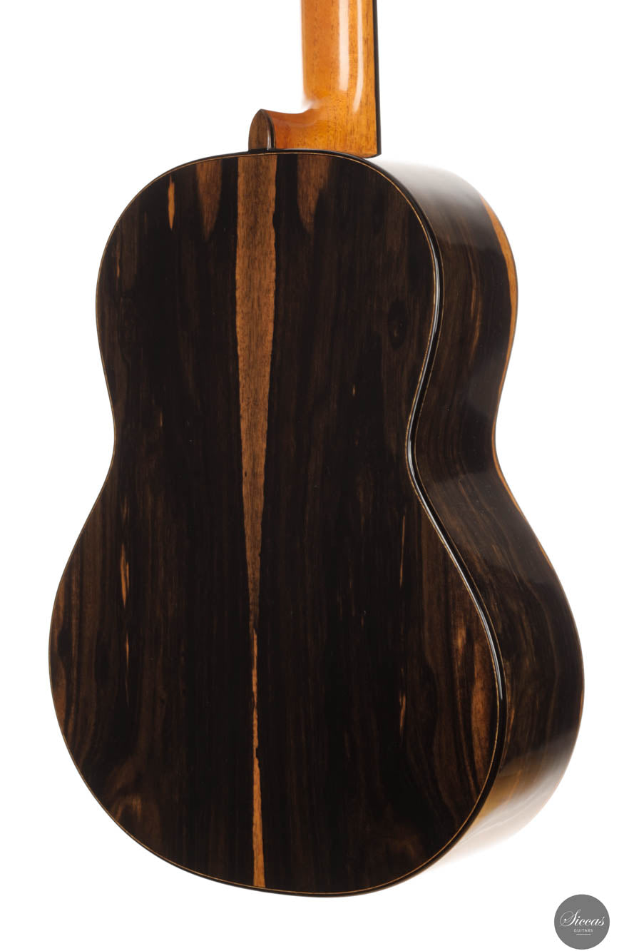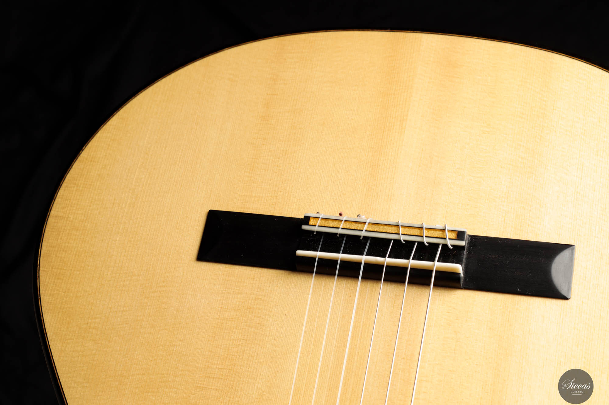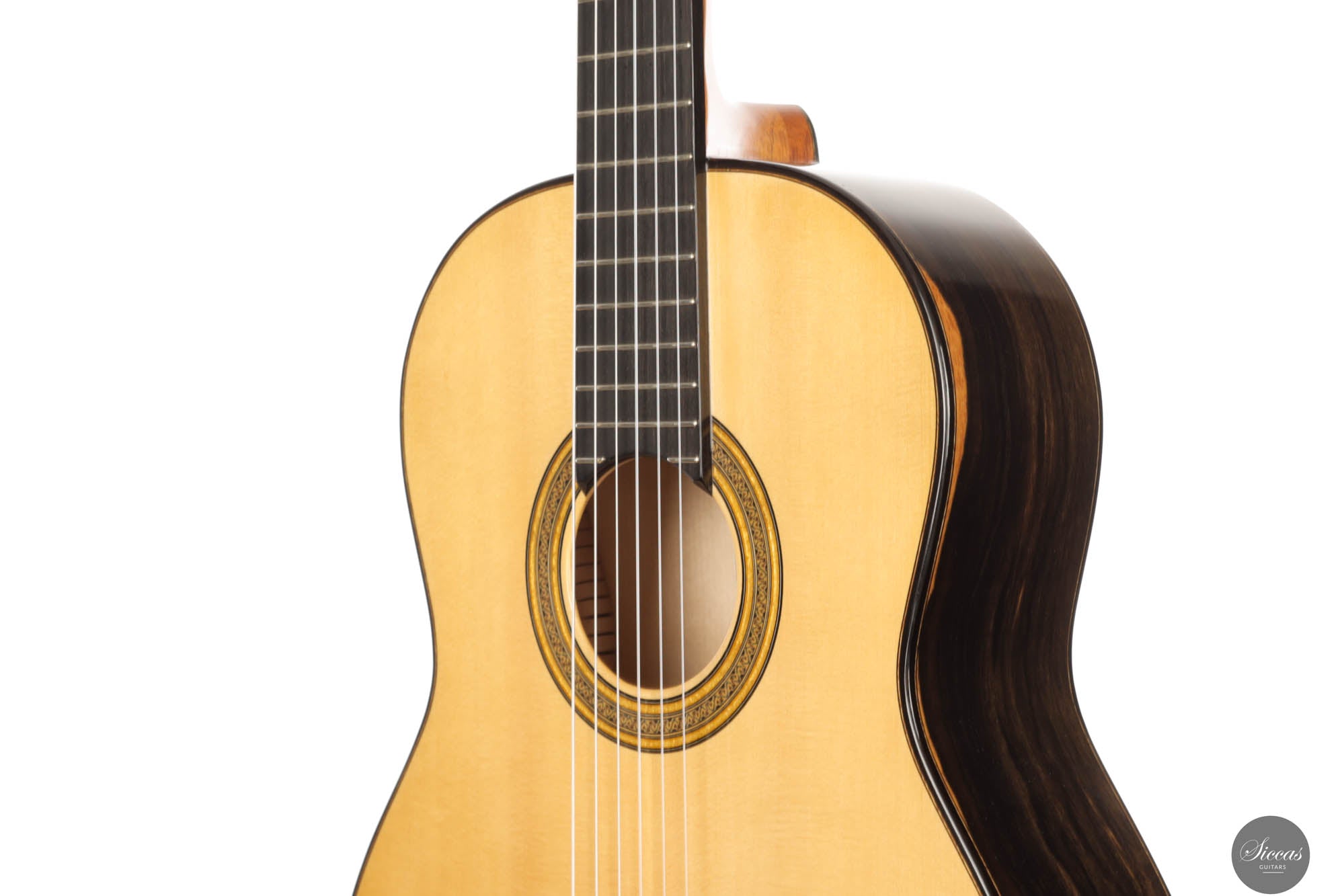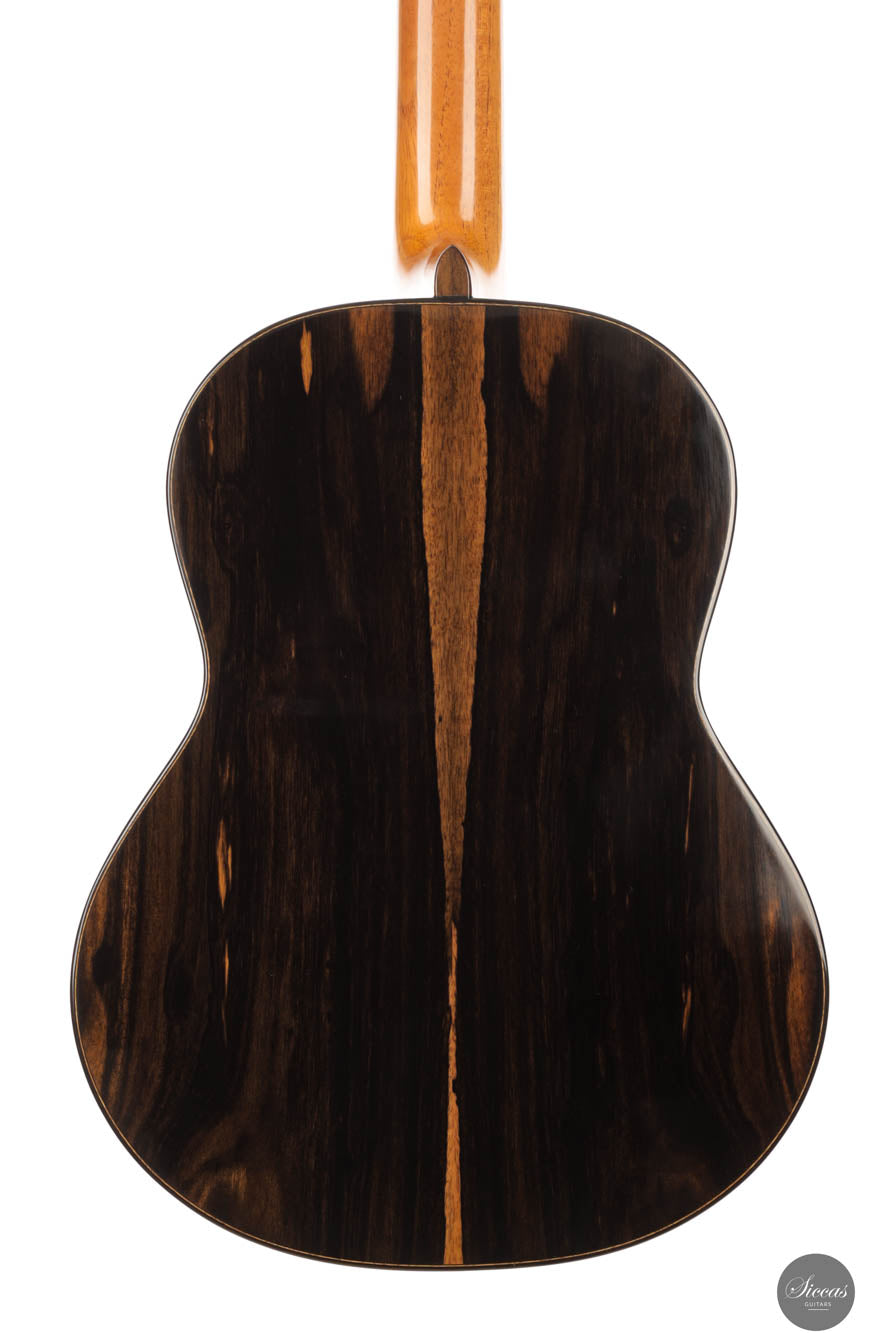 This 2024 guitar, numbered 75, is the culmination of a decade of development. It features a spruce top and ebony back and sides, with its elegant design accentuated by a striking 24-karat gold rosette, complemented by satinwood purfling. The back and sides are doubled with maple on the inside and ebony on the outside. These double sides enhance the depth of the bass tones, improve the projection, and allow the spruce top to vibrate more freely. A traditional 7-fan bracing system is enhanced with two additional struts between the bridge and soundhole, to allow the thin top to resonate as intended. The guitar offers excellent playability, thanks to its slightly smaller body and a very comfortable neck with a distinct D profile. Tonally, the instrument delivers a wide palette of colors with a sweet, rounded tone, featuring deep, rich basses and clear trebles.