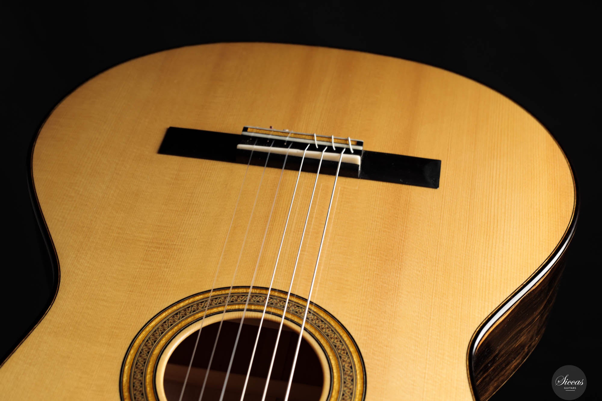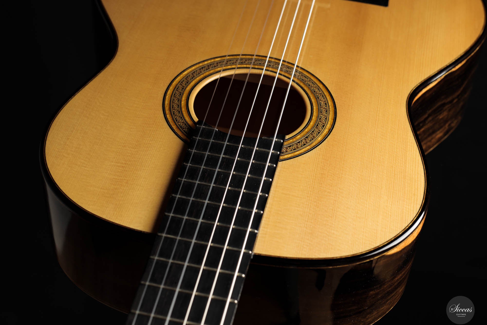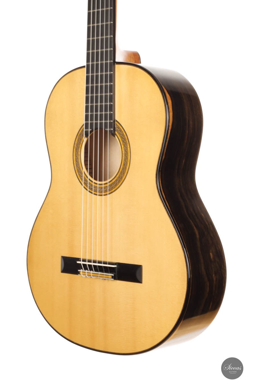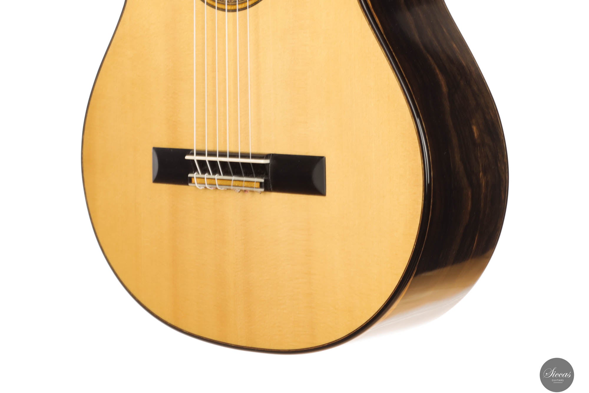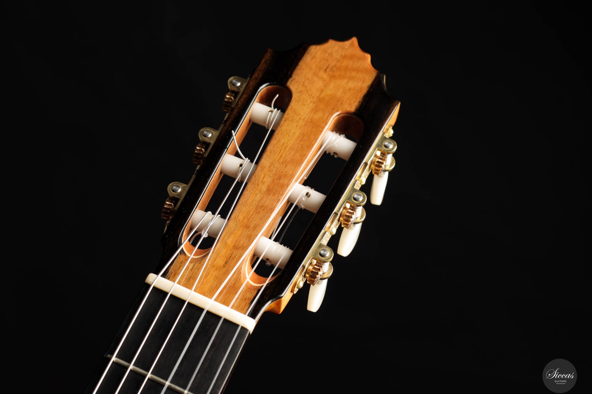 This 2024 guitar, numbered 75, is the culmination of a decade of development. It features a spruce top and ebony back and sides, with its elegant design accentuated by a striking 24-karat gold rosette, complemented by satinwood purfling. The back and sides are doubled with maple on the inside and ebony on the outside. These double sides enhance the depth of the bass tones, improve the projection, and allow the spruce top to vibrate more freely. A traditional 7-fan bracing system is enhanced with two additional struts between the bridge and soundhole, to allow the thin top to resonate as intended. The guitar offers excellent playability, thanks to its slightly smaller body and a very comfortable neck with a distinct D profile. Tonally, the instrument delivers a wide palette of colors with a sweet, rounded tone, featuring deep, rich basses and clear trebles.