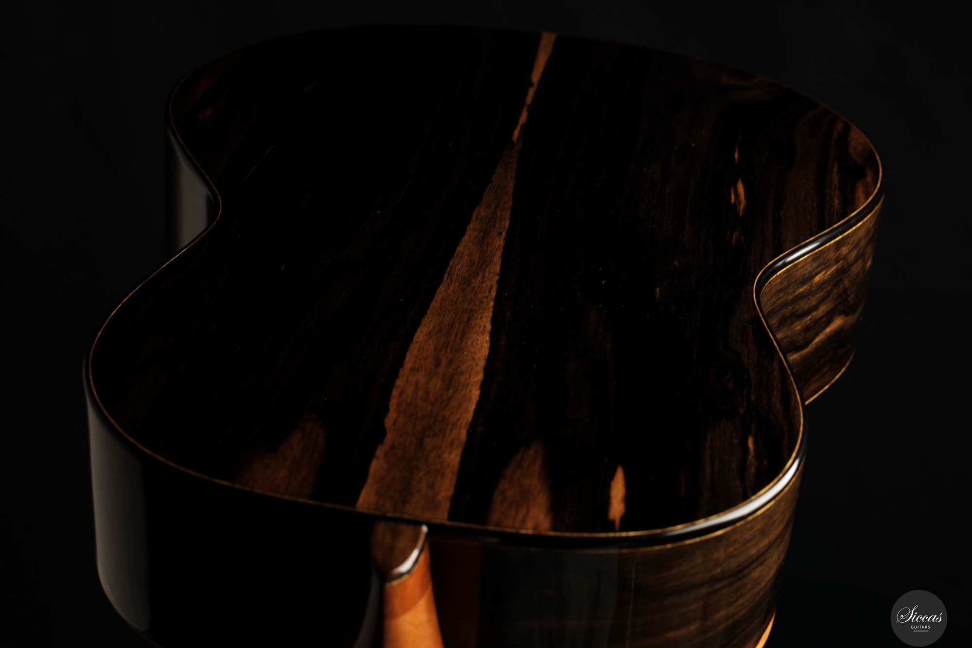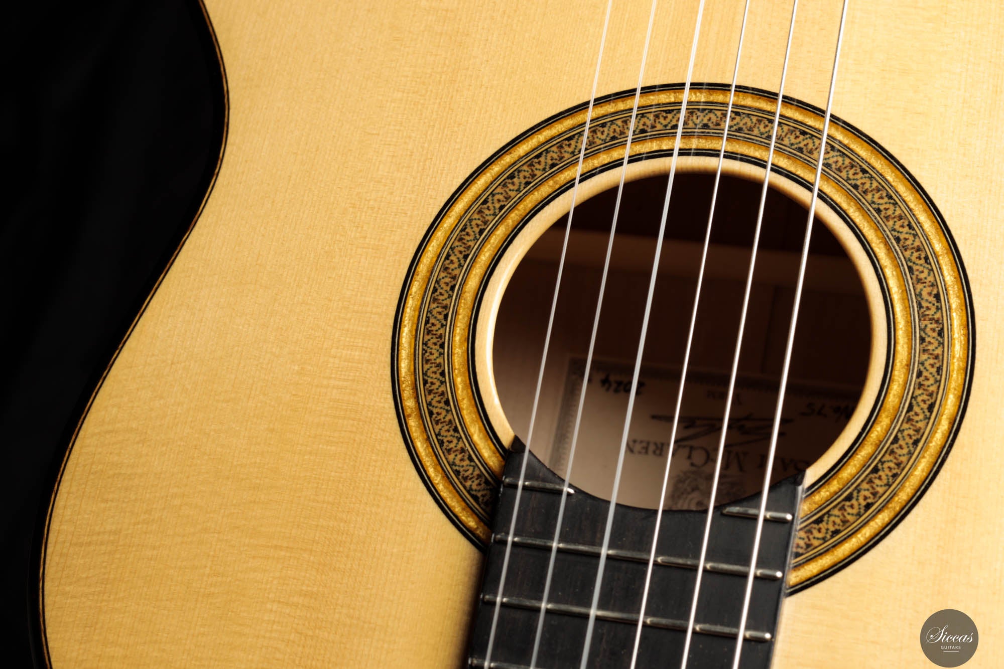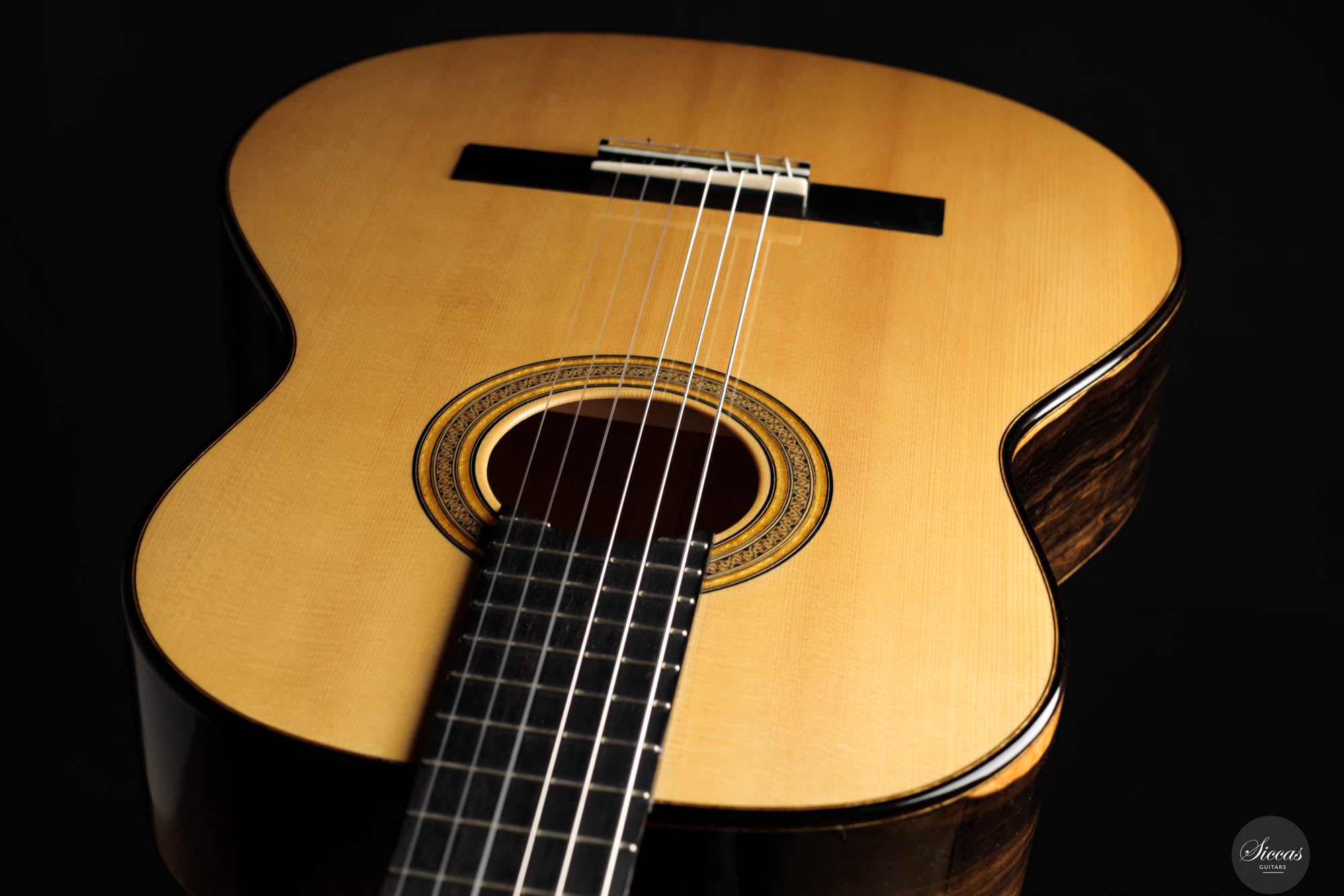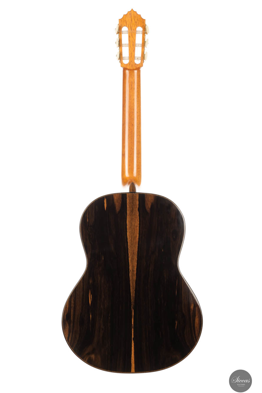 This 2024 guitar, numbered 75, is the culmination of a decade of development. It features a spruce top and ebony back and sides, with its elegant design accentuated by a striking 24-karat gold rosette, complemented by satinwood purfling. The back and sides are doubled with maple on the inside and ebony on the outside. These double sides enhance the depth of the bass tones, improve the projection, and allow the spruce top to vibrate more freely. A traditional 7-fan bracing system is enhanced with two additional struts between the bridge and soundhole, to allow the thin top to resonate as intended. The guitar offers excellent playability, thanks to its slightly smaller body and a very comfortable neck with a distinct D profile. Tonally, the instrument delivers a wide palette of colors with a sweet, rounded tone, featuring deep, rich basses and clear trebles.