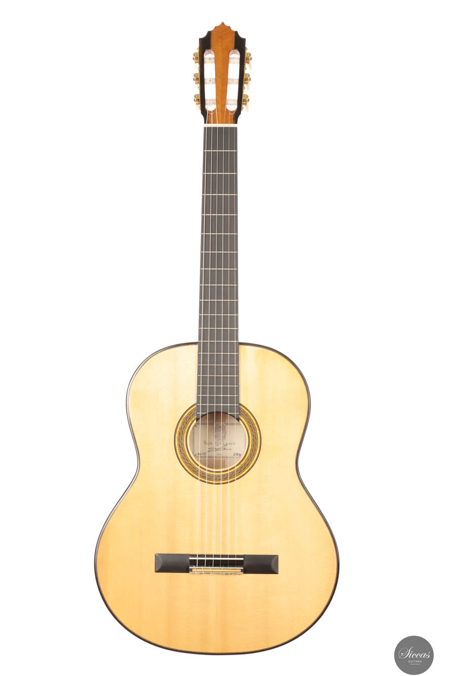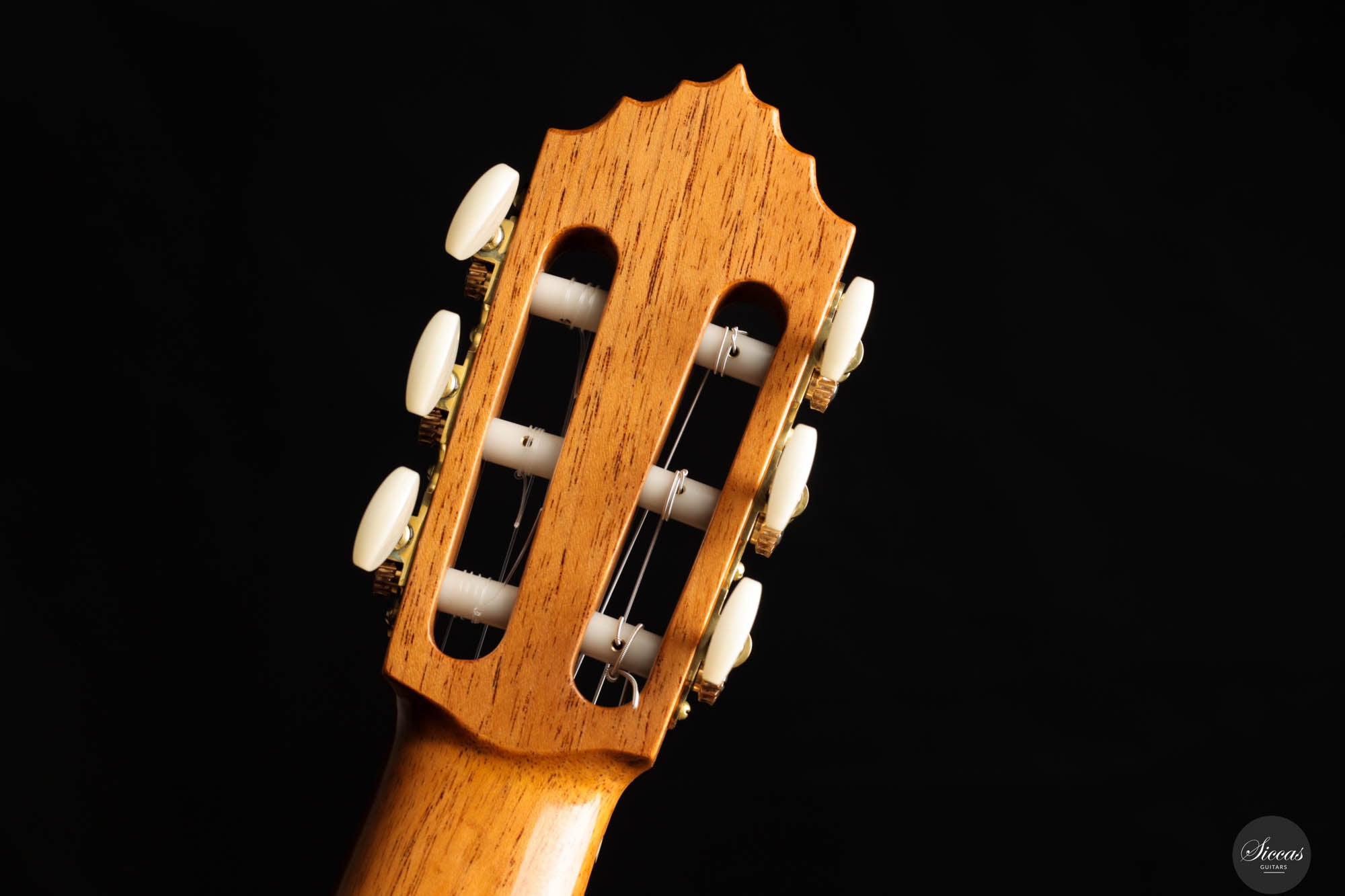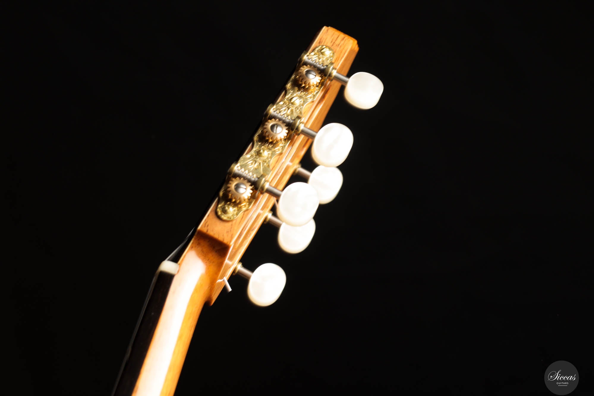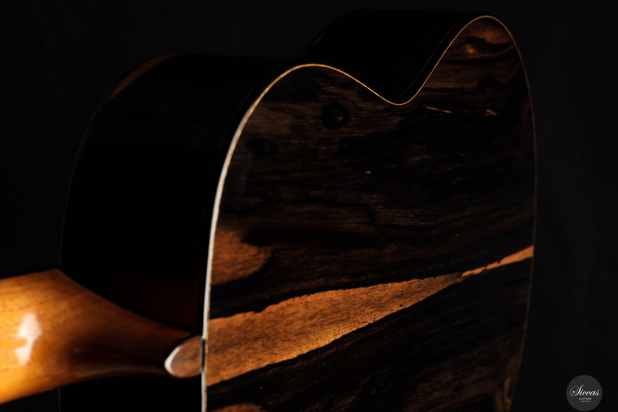This 2024 guitar, numbered 75, is the culmination of a decade of development. It features a spruce top and ebony back and sides, with its elegant design accentuated by a striking 24-karat gold rosette, complemented by satinwood purfling. The back and sides are doubled with maple on the inside and ebony on the outside. These double sides enhance the depth of the bass tones, improve the projection, and allow the spruce top to vibrate more freely. A traditional 7-fan bracing system is enhanced with two additional struts between the bridge and soundhole, to allow the thin top to resonate as intended. The guitar offers excellent playability, thanks to its slightly smaller body and a very comfortable neck with a distinct D profile. Tonally, the instrument delivers a wide palette of colors with a sweet, rounded tone, featuring deep, rich basses and clear trebles.