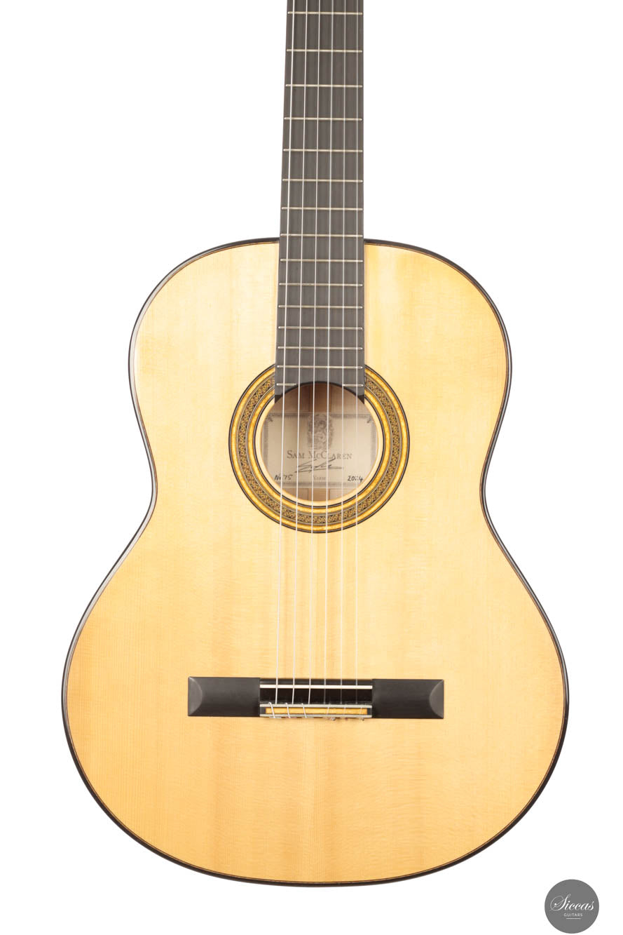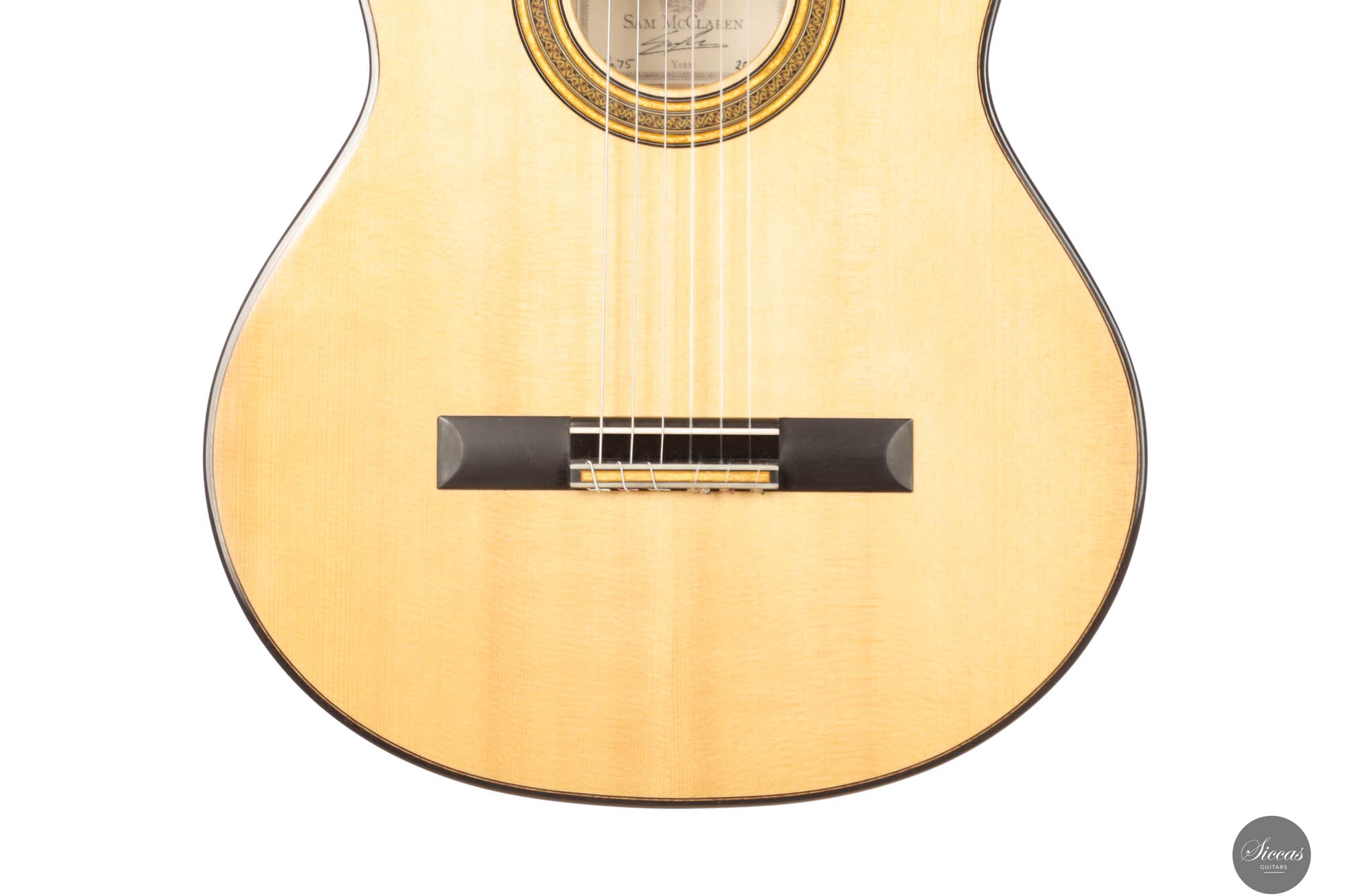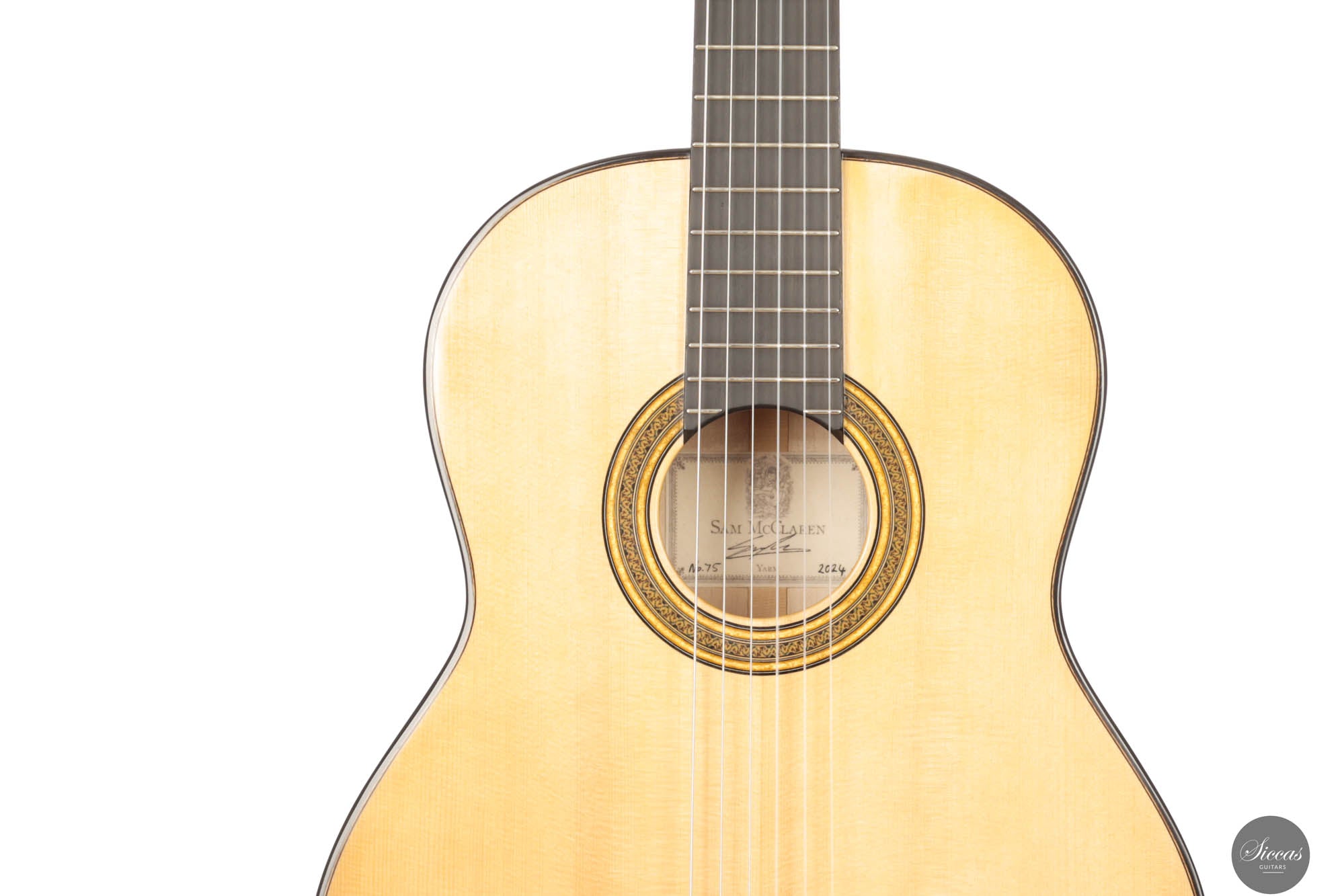 Sam McClaren is a young luthier based in the small village of Aislaby, in the North East of England. He began his guitar-making career at a young age, and after finishing college, he attended the Totnes School of Guitar Making, where he completed his first guitar in 2011. He further honed his skills at Newark, then worked alongside esteemed guitar makers like Peter Barton and Christopher Dean, which greatly enriched his knowledge and experience as he refined his own designs. Striving to create a guitar tailored to his preferences, Sam's goal was to achieve a big, resonant sound from a slightly smaller body, which he found more comfortable to play.