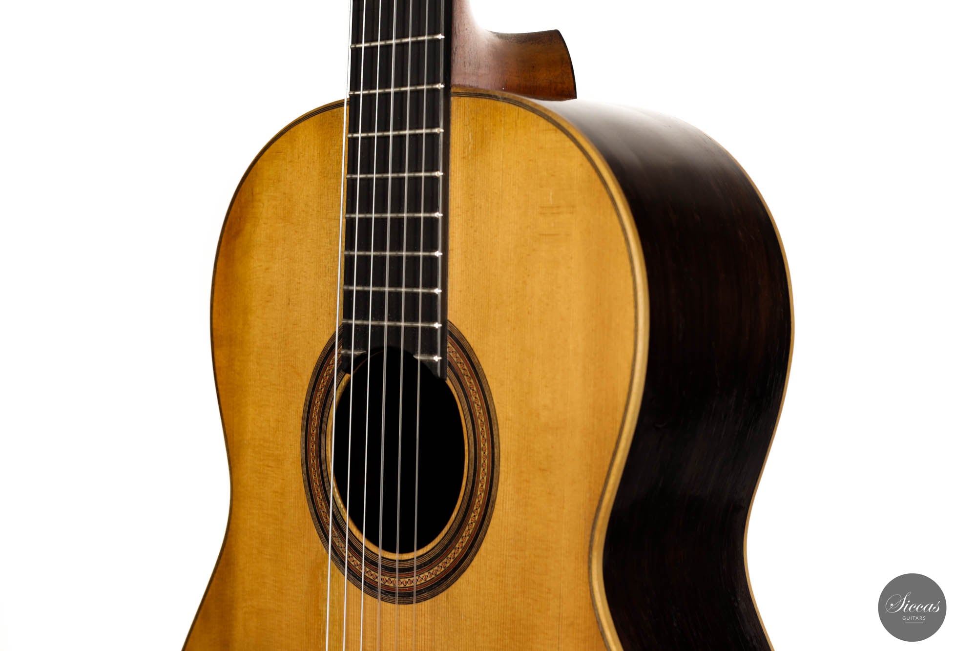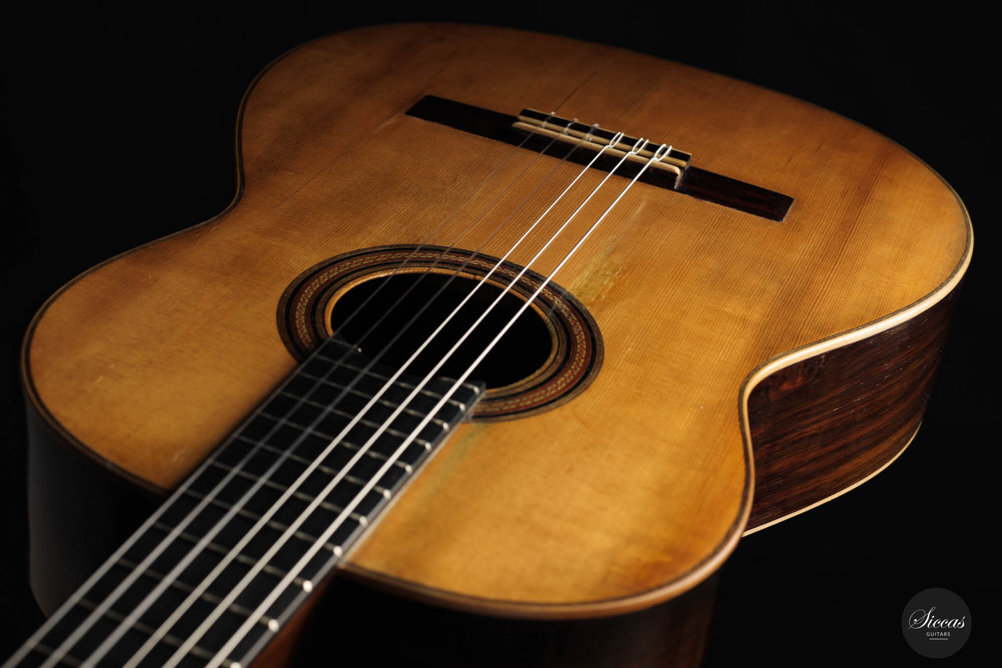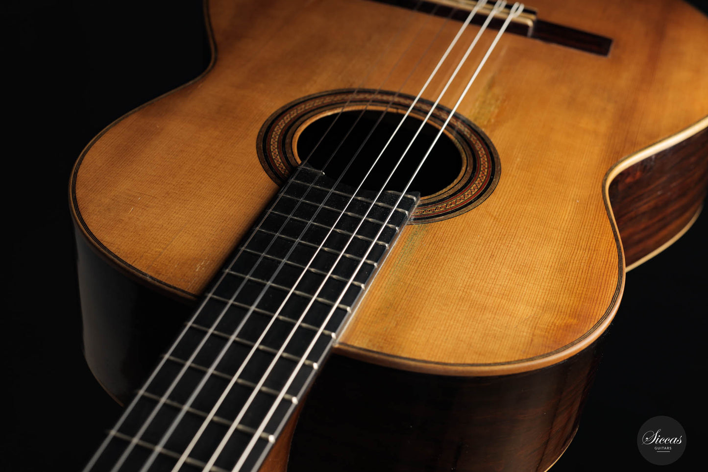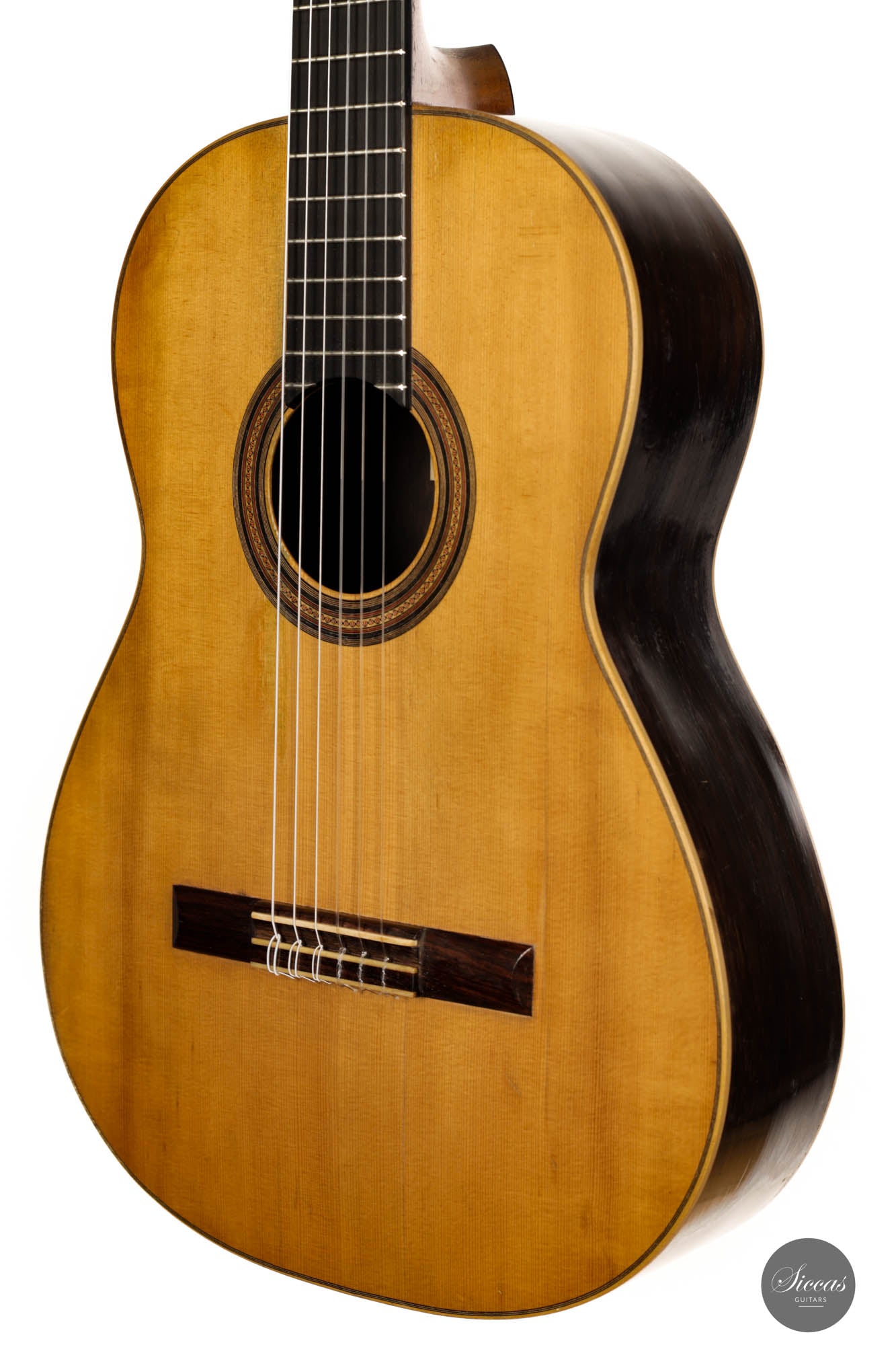 At initial observation, the 1918 Santos Hernandez guitar remarkably mirrors the style and craftsmanship of his mentor, Manuel Ramirez, manifest in the shape of the head, rosette, and heel. Constructed during the same year that Santos opened his personal atelier, speculation suggests that the material resources for this particular guitar were possibly procured from the widow of Manuel Ramirez. During this period, Santos still completed instruments under the "Viuda de Manuel Ramirez" labels for his former master's workshop. Intriguingly, the label on this guitar demonstrates one of the earliest instances of Santos Hernandez's "Greek style" label, accompanied by the Calle Aduana 27 address. A near-identical guitar, sharing the same label and dated to 1918, has been documented in "La Chitarra de Liuteria" ("Masterpieces of Guitar Making") by Stefano Grondona and Luca Waldner, 2001, on pages 117-118. The composition of the guitar entails the use of rich, dark pre-CITES Brazilian rosewood for the back and sides, while the top is adorned with European spruce. The French polish, though original, exhibits a venerable patina, a testament to years of usage. Remarkably, aside from the re-fretting, the guitar retains an authentic, unmodified condition, never having been opened or modified. A handful of minor cracks have been meticulously repaired using a conservative method — the top is reinforced with seven small cleats internally, while the back has been repaired using adhesive, devoid of any cleats. The tonal character of this guitar is a harmonious blend of warmth and clarity, balanced with a focused resonance and a profound, antiquated sound. It possesses sufficient volume and power to appease contemporary guitarists. One remarkable feature is its extraordinary sensitivity to tonal modulation with the slightest right-hand movement. In our estimation, this instrument embodies the epitome of what a guitar should represent, embodying all the traits that render the Spanish guitar distinct and inimitable among the array of concert stage instruments. This guitar, held in high regard by players over the past century, is a beautiful manifestation of the introverted, enchanting tonal quality intrinsic to early Santos Hernandez creations at his apex of craftsmanship.
