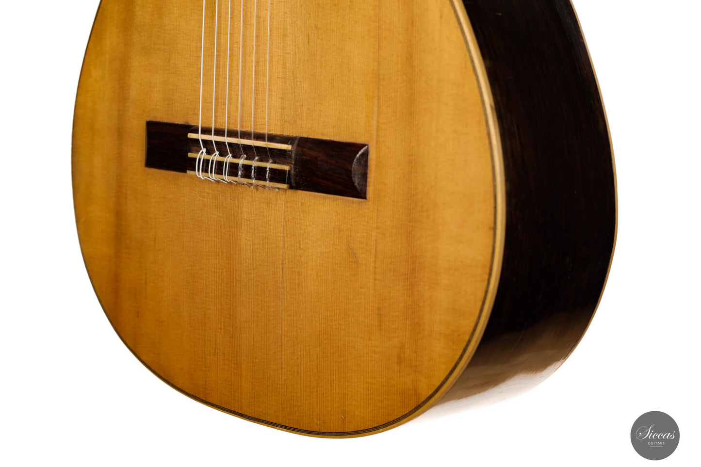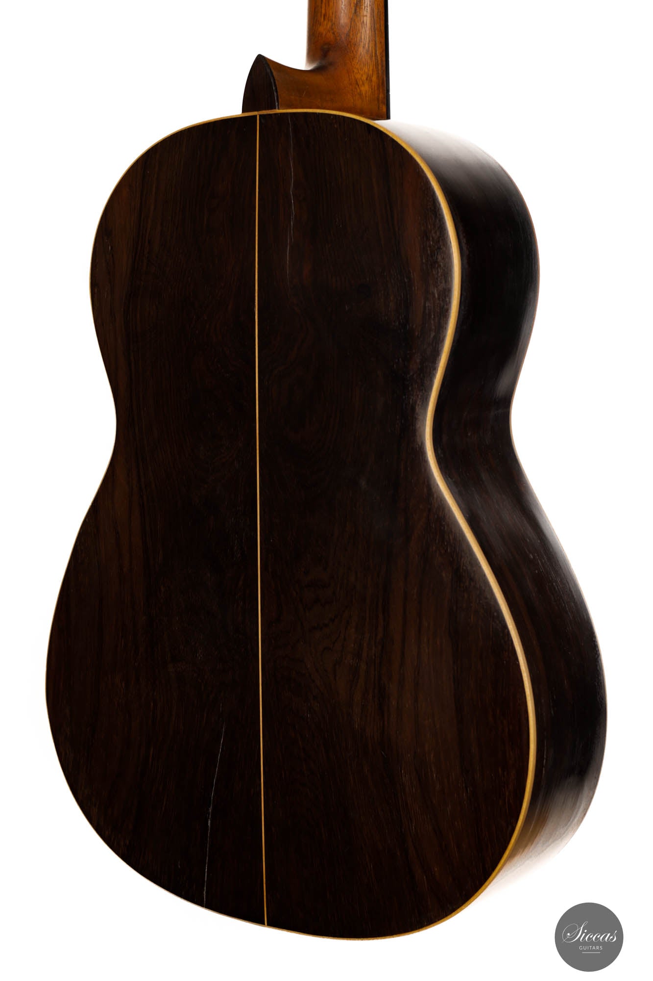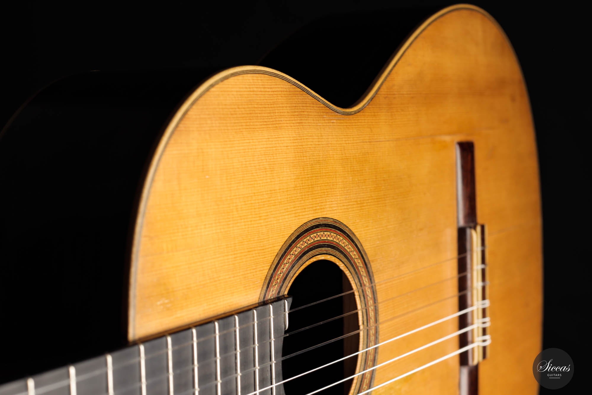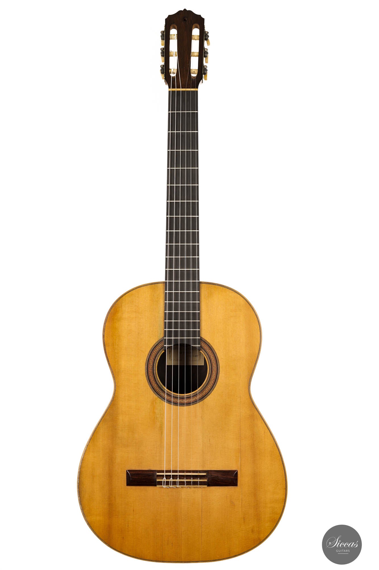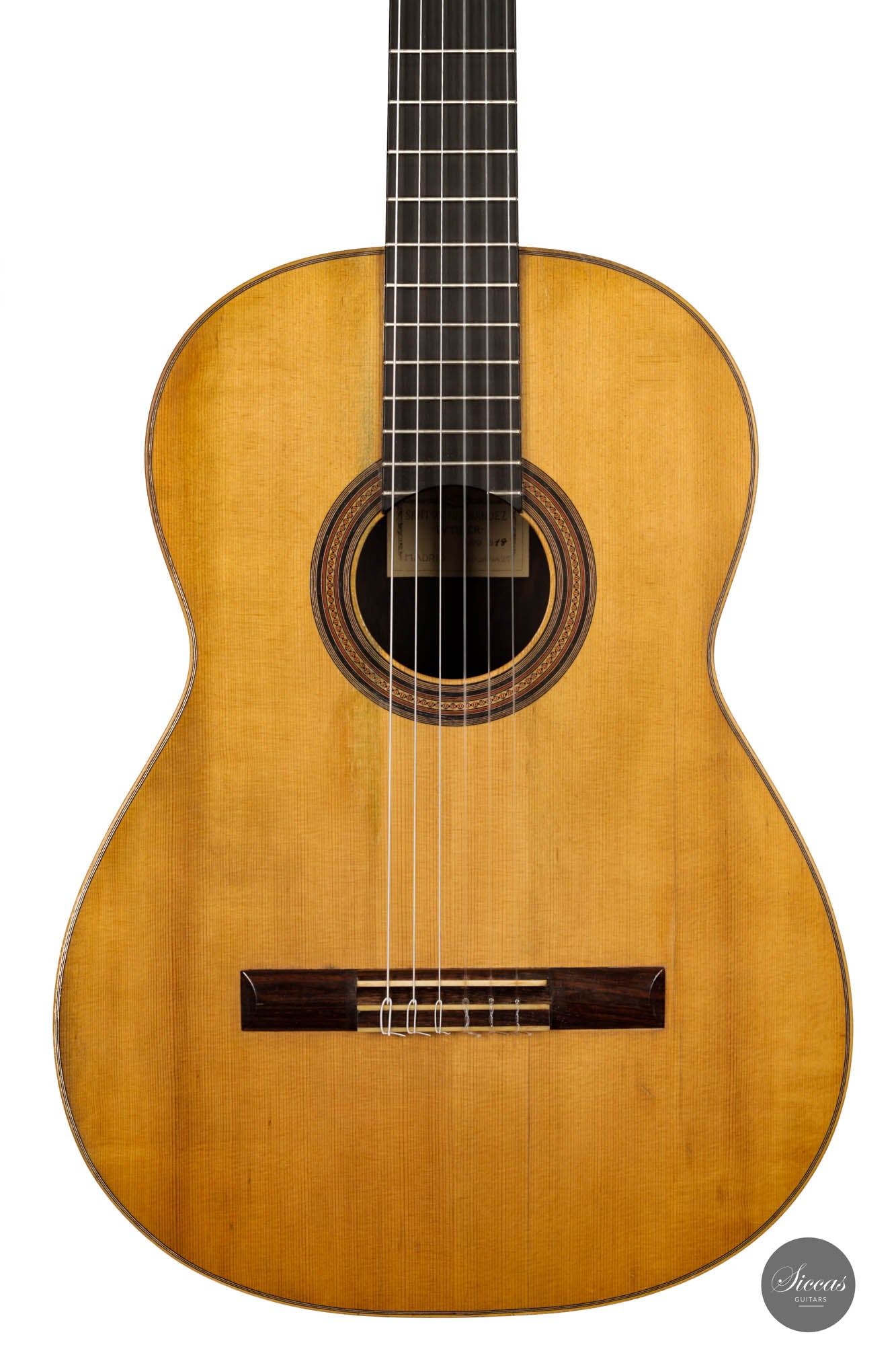 At initial observation, the 1918 Santos Hernandez guitar remarkably mirrors the style and craftsmanship of his mentor, Manuel Ramirez, manifest in the shape of the head, rosette, and heel. Constructed during the same year that Santos opened his personal atelier, speculation suggests that the material resources for this particular guitar were possibly procured from the widow of Manuel Ramirez. During this period, Santos still completed instruments under the "Viuda de Manuel Ramirez" labels for his former master's workshop. Intriguingly, the label on this guitar demonstrates one of the earliest instances of Santos Hernandez's "Greek style" label, accompanied by the Calle Aduana 27 address. A near-identical guitar, sharing the same label and dated to 1918, has been documented in "La Chitarra de Liuteria" ("Masterpieces of Guitar Making") by Stefano Grondona and Luca Waldner, 2001, on pages 117-118. The composition of the guitar entails the use of rich, dark pre-CITES Brazilian rosewood for the back and sides, while the top is adorned with European spruce. The French polish, though original, exhibits a venerable patina, a testament to years of usage. Remarkably, aside from the re-fretting, the guitar retains an authentic, unmodified condition, never having been opened or modified. A handful of minor cracks have been meticulously repaired using a conservative method — the top is reinforced with seven small cleats internally, while the back has been repaired using adhesive, devoid of any cleats. The tonal character of this guitar is a harmonious blend of warmth and clarity, balanced with a focused resonance and a profound, antiquated sound. It possesses sufficient volume and power to appease contemporary guitarists. One remarkable feature is its extraordinary sensitivity to tonal modulation with the slightest right-hand movement. In our estimation, this instrument embodies the epitome of what a guitar should represent, embodying all the traits that render the Spanish guitar distinct and inimitable among the array of concert stage instruments. This guitar, held in high regard by players over the past century, is a beautiful manifestation of the introverted, enchanting tonal quality intrinsic to early Santos Hernandez creations at his apex of craftsmanship.