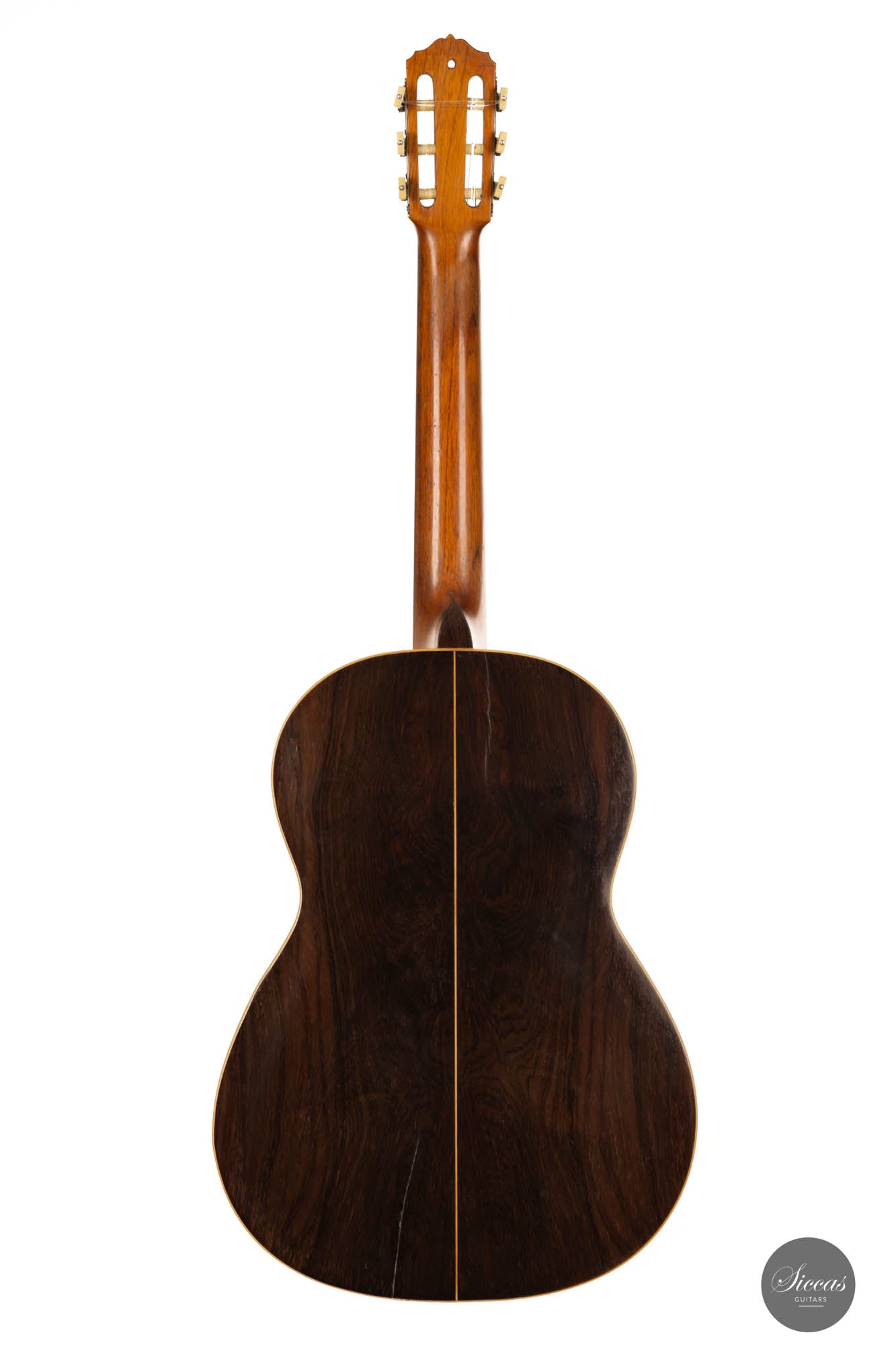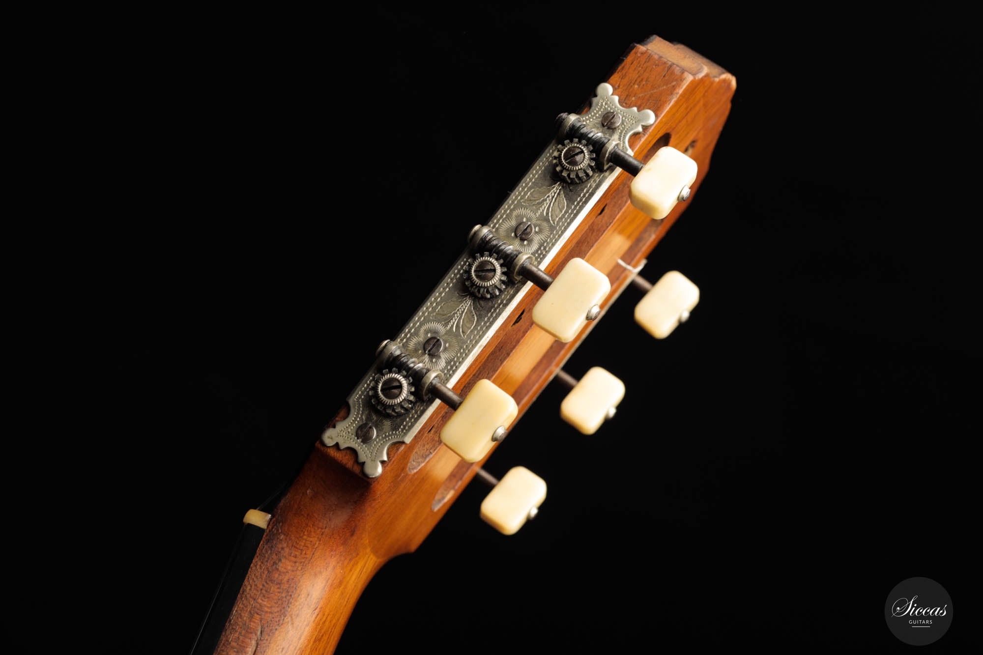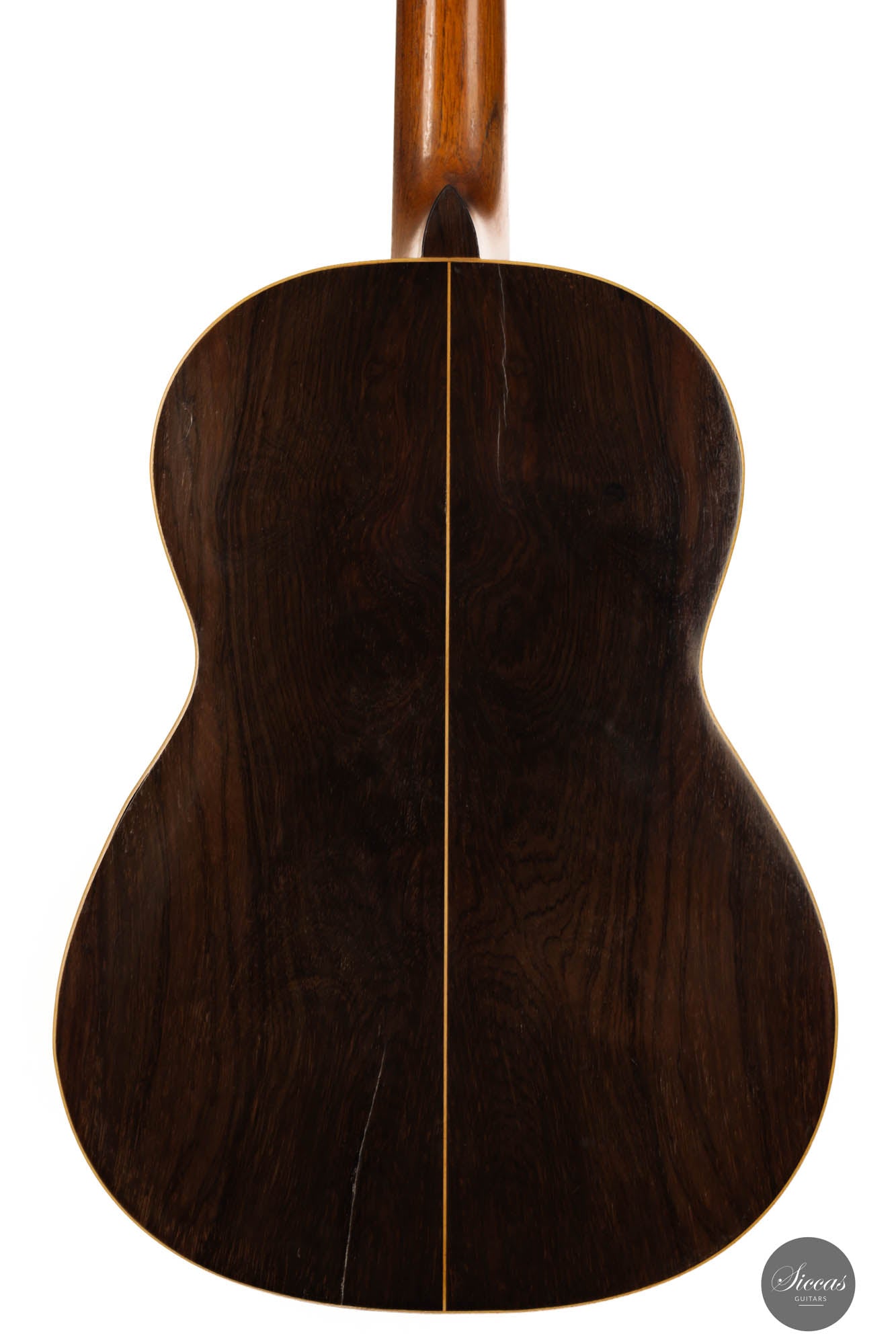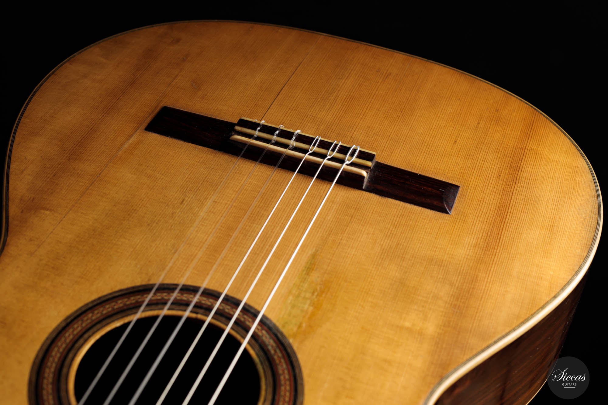 At initial observation, the 1918 Santos Hernandez guitar remarkably mirrors the style and craftsmanship of his mentor, Manuel Ramirez, manifest in the shape of the head, rosette, and heel. Constructed during the same year that Santos opened his personal atelier, speculation suggests that the material resources for this particular guitar were possibly procured from the widow of Manuel Ramirez. During this period, Santos still completed instruments under the "Viuda de Manuel Ramirez" labels for his former master's workshop. Intriguingly, the label on this guitar demonstrates one of the earliest instances of Santos Hernandez's "Greek style" label, accompanied by the Calle Aduana 27 address. A near-identical guitar, sharing the same label and dated to 1918, has been documented in "La Chitarra de Liuteria" ("Masterpieces of Guitar Making") by Stefano Grondona and Luca Waldner, 2001, on pages 117-118. The composition of the guitar entails the use of rich, dark pre-CITES Brazilian rosewood for the back and sides, while the top is adorned with European spruce. The French polish, though original, exhibits a venerable patina, a testament to years of usage. Remarkably, aside from the re-fretting, the guitar retains an authentic, unmodified condition, never having been opened or modified. A handful of minor cracks have been meticulously repaired using a conservative method — the top is reinforced with seven small cleats internally, while the back has been repaired using adhesive, devoid of any cleats. The tonal character of this guitar is a harmonious blend of warmth and clarity, balanced with a focused resonance and a profound, antiquated sound. It possesses sufficient volume and power to appease contemporary guitarists. One remarkable feature is its extraordinary sensitivity to tonal modulation with the slightest right-hand movement. In our estimation, this instrument embodies the epitome of what a guitar should represent, embodying all the traits that render the Spanish guitar distinct and inimitable among the array of concert stage instruments. This guitar, held in high regard by players over the past century, is a beautiful manifestation of the introverted, enchanting tonal quality intrinsic to early Santos Hernandez creations at his apex of craftsmanship.