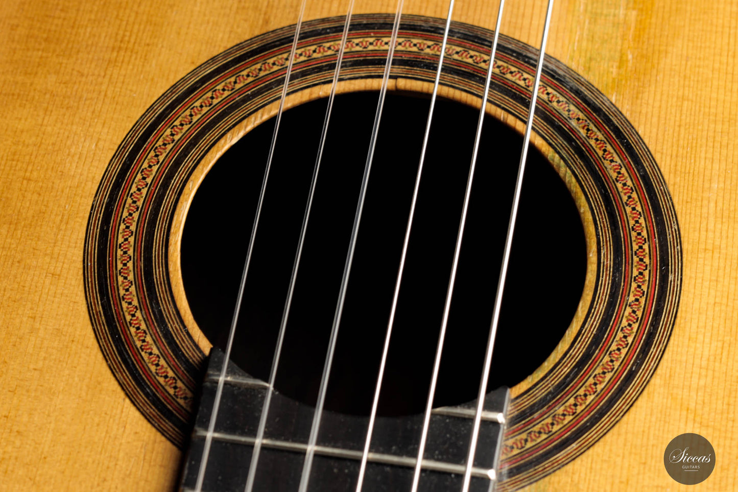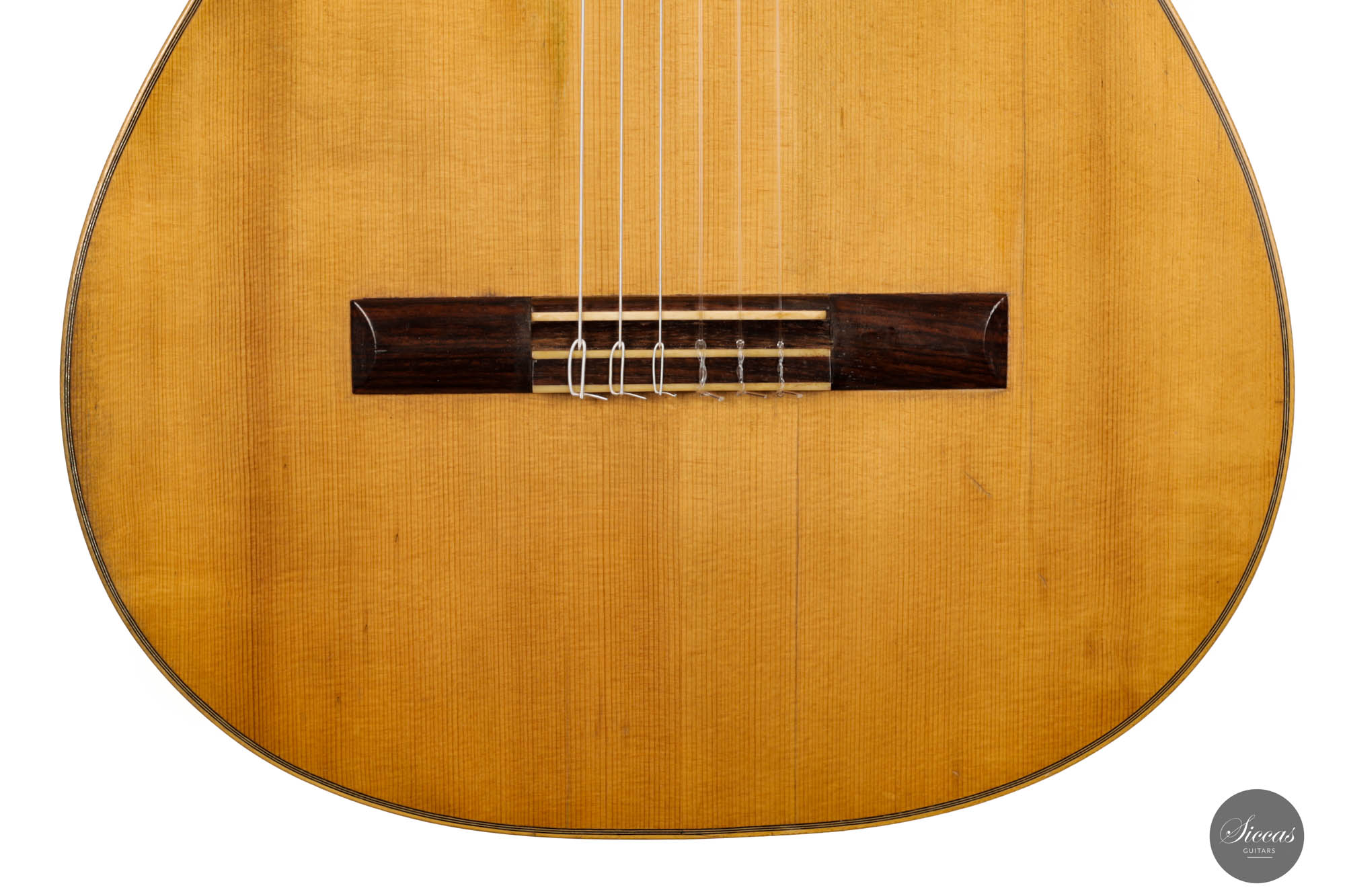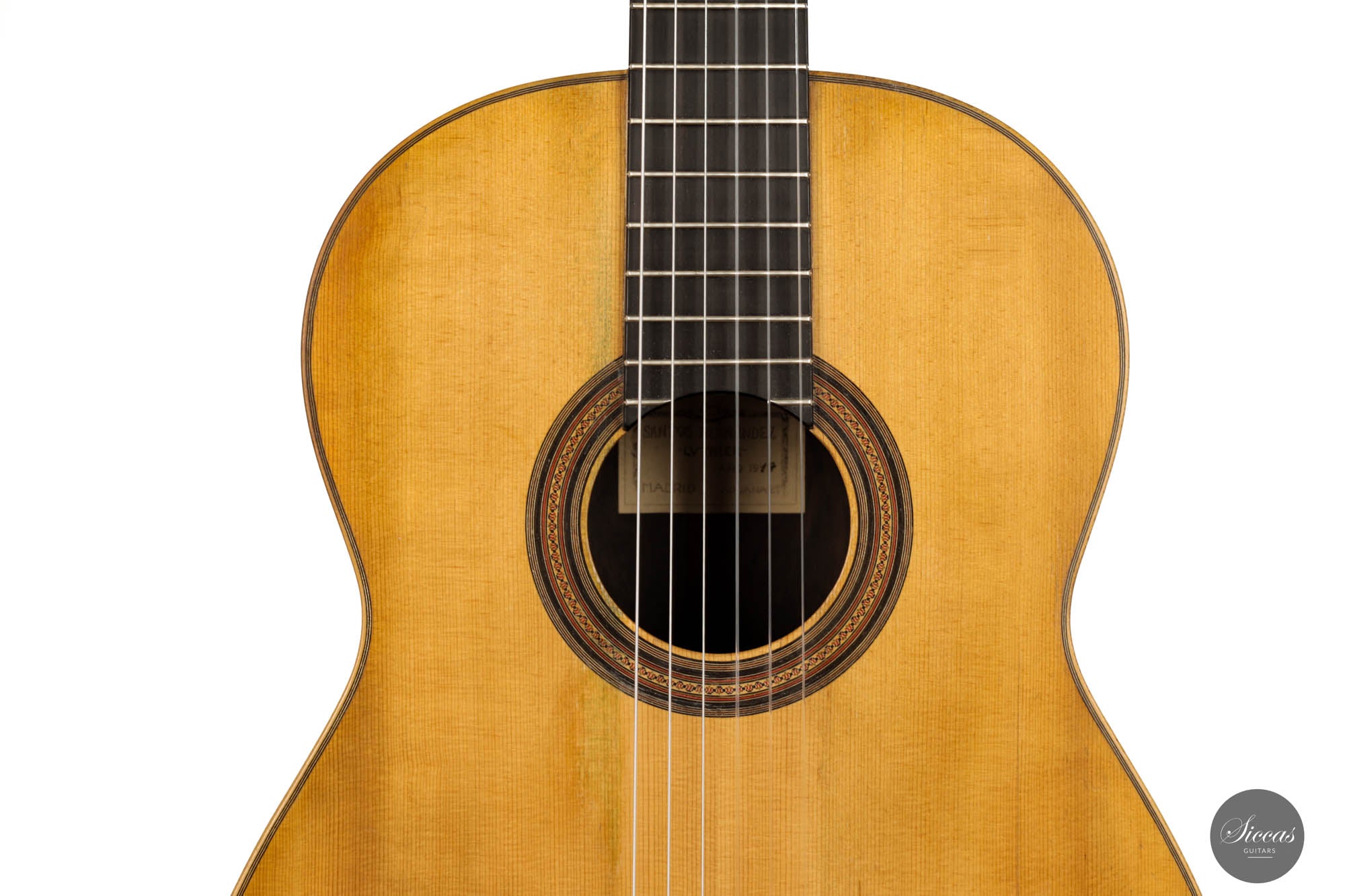 Santos Hernandez (Madrid, 1873-1943) started an apprenticeship very early in Valentin Viudes’s workshop and then moved to José Ortega’s Granadinian workshop. After moving to a few other workshops and serving as a soldier for Spain, he eventually took over Enrique Garcia’s position in Manuel Ramirez’s workshop in 1905. His involvement in building Andrés Segovia’s famous 1912 Manuel Ramirez sealed his reputation as an extraordinary luthier. He opened his first workshop in 1921 after working for Manuel Ramirez’s widow along with Domingo Esteso.