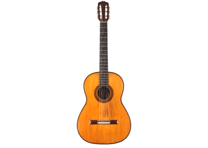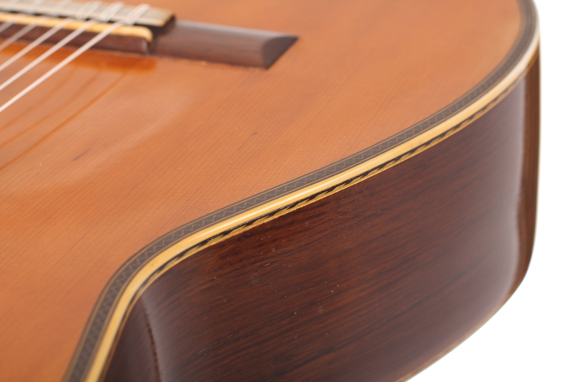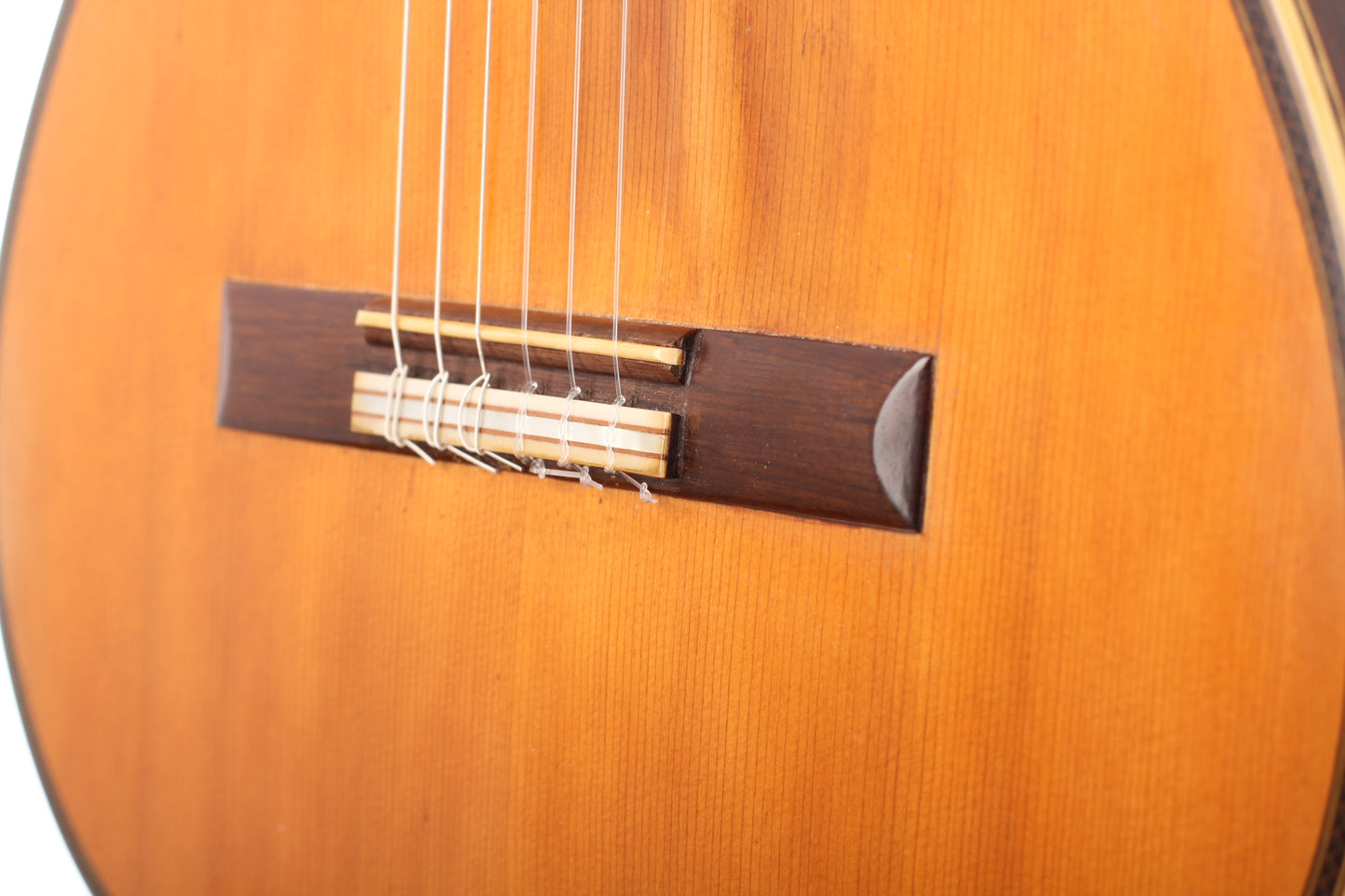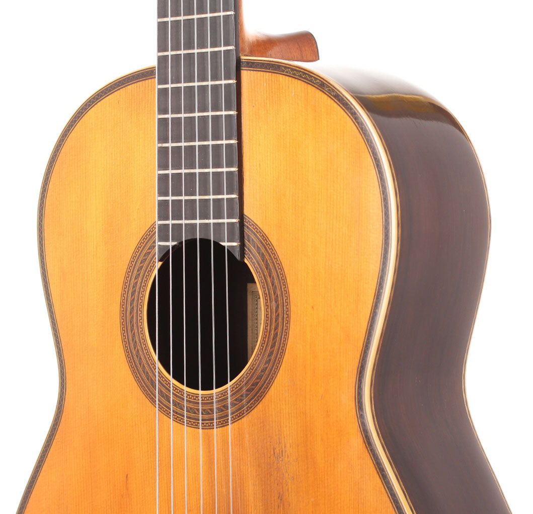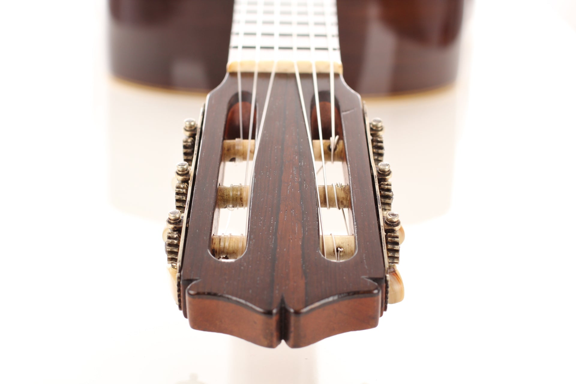 The spruce top is in good condition and basically free of cracks. Just beside the fingerboard there are two little stabalized cracks not affecting the sound nor the stability of the soundboard. Back and sides are made of rosewood. On the back you can find two well repaired cracks. The tuning-machines are old but probably not original. This guitar is a gem! The sound is very clear and brilliant and the basses are not too dominant. A great guitar from one of the most important luthiers ever lived.