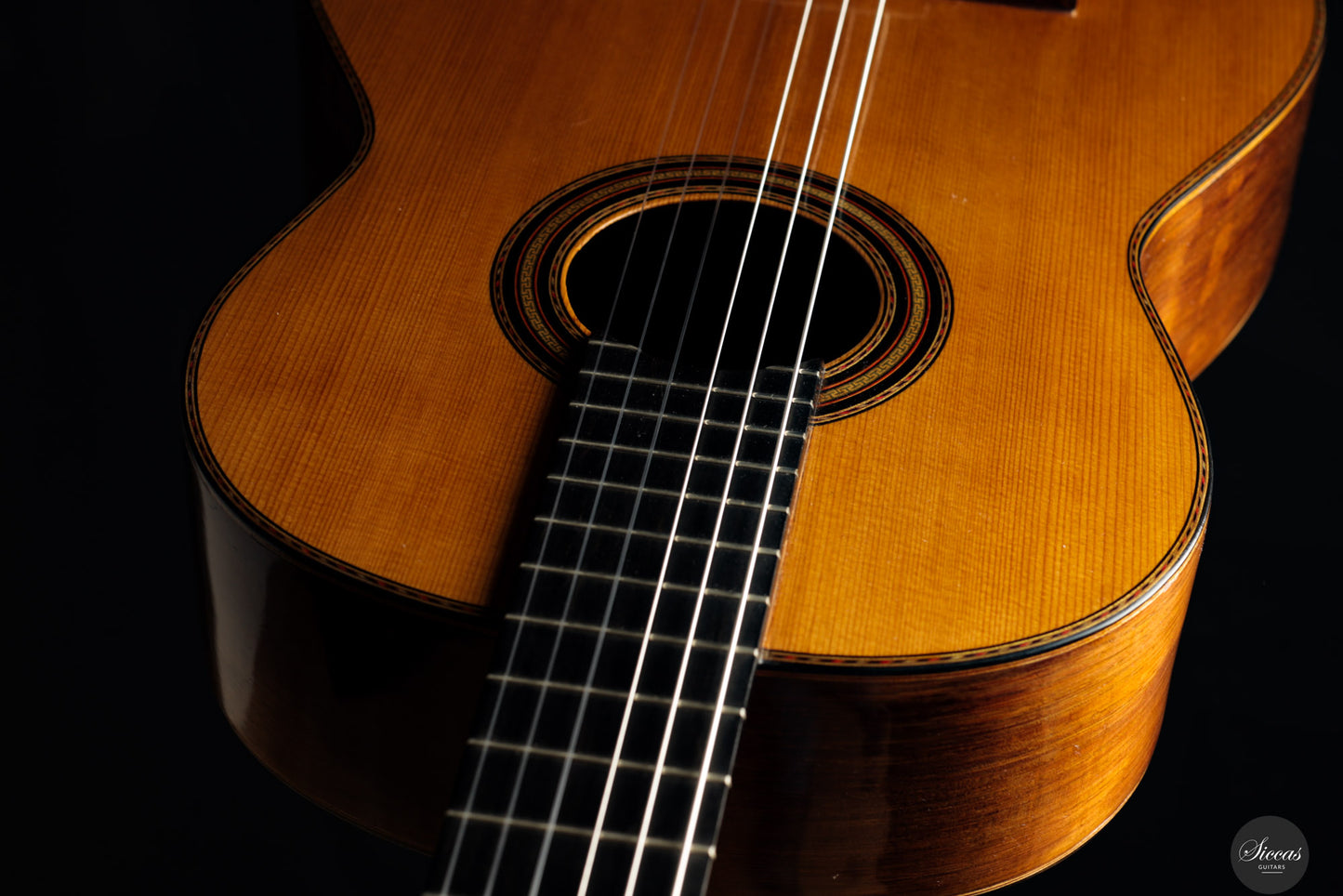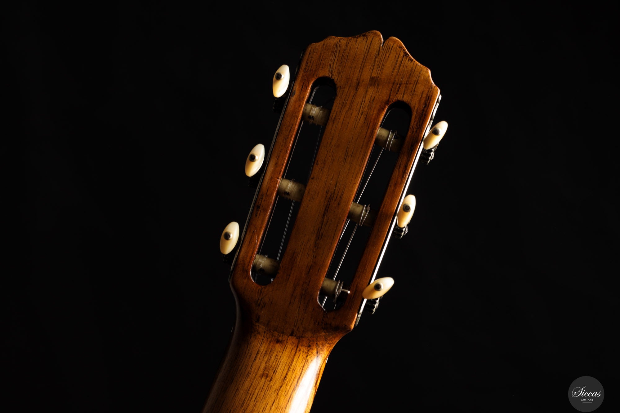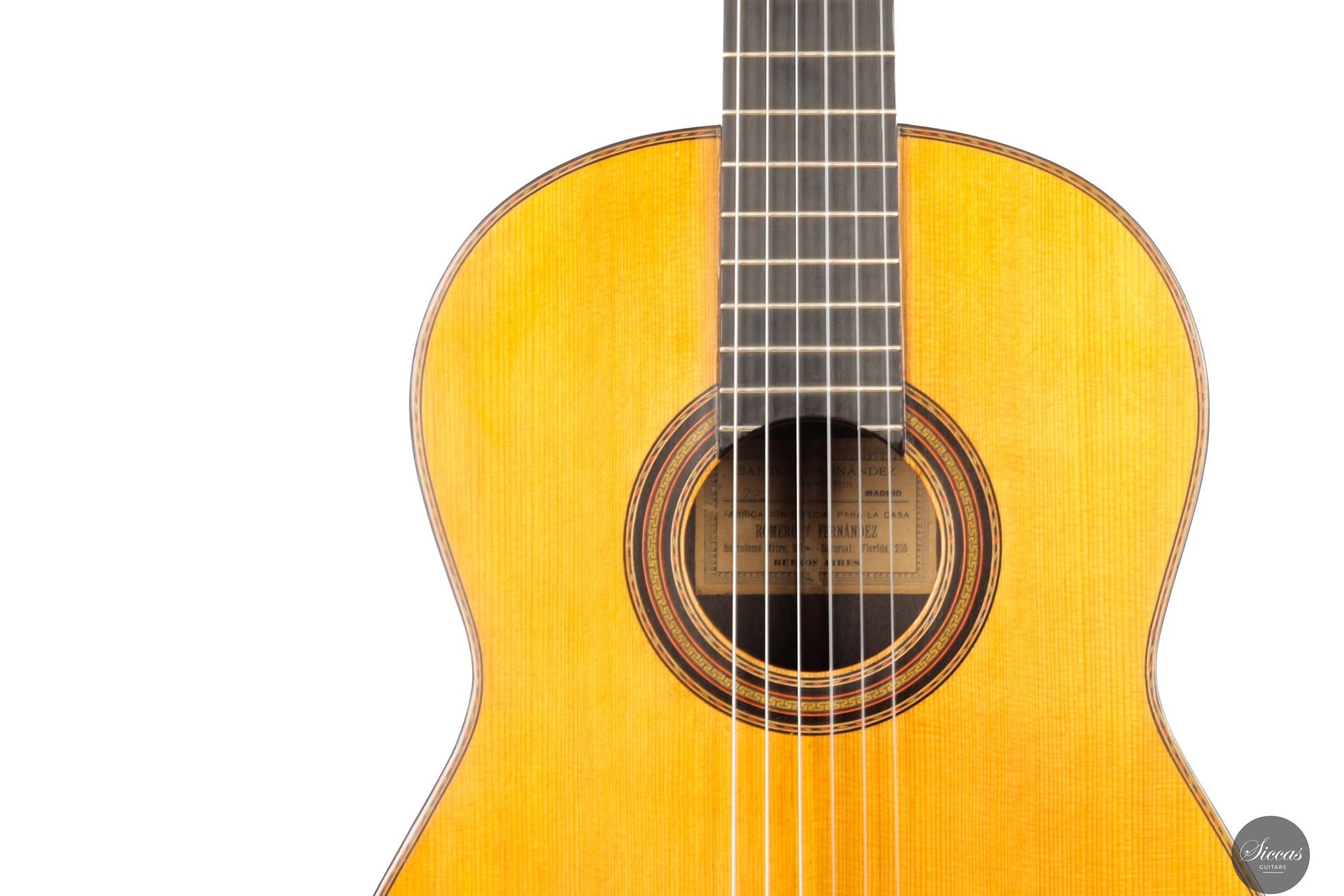 Santos Hernandez (Madrid, 1873-1943) started an apprenticeship very early in Valentin Viudes’s workshop and then moved to José Ortega’s Granadinian workshop. After moving to a few other workshops and serving as a soldier for Spain, he eventually took over Enrique Garcia’s position in Manuel Ramirez’s workshop in 1905. His involvement in the building of Andrés Segovia’s famous 1912 Manuel Ramirez sealed his reputation as an extraordinary luthier. He opened his first own workshop in 1921 after having worked for Manuel Ramirez’s widow along with Domingo Esteso.About the guitar