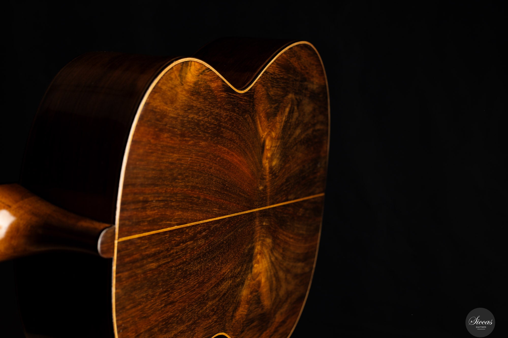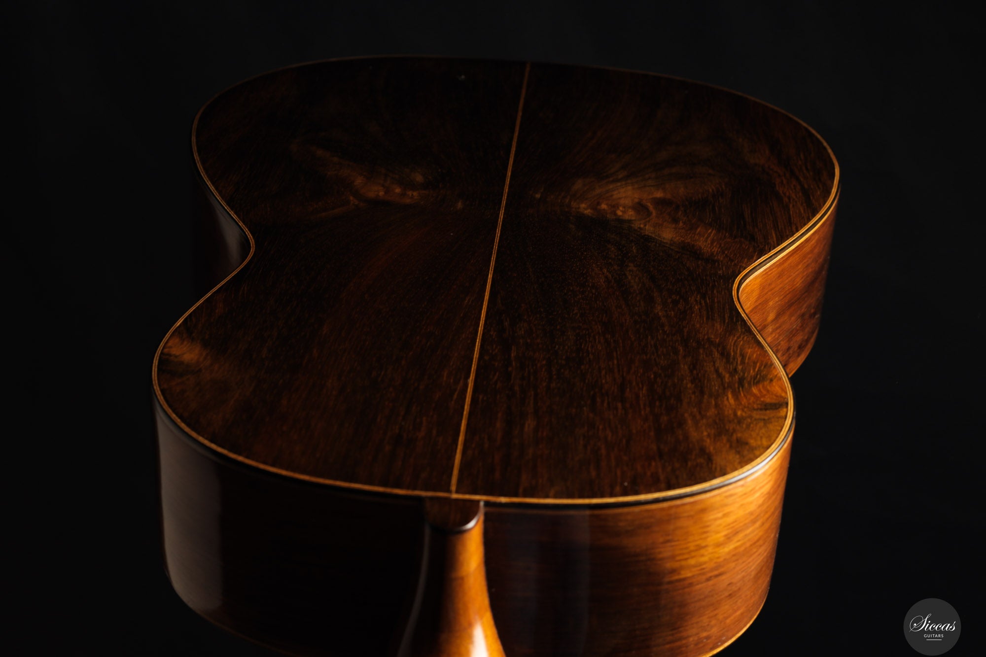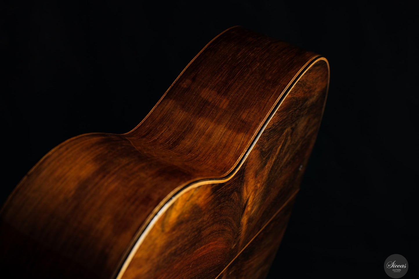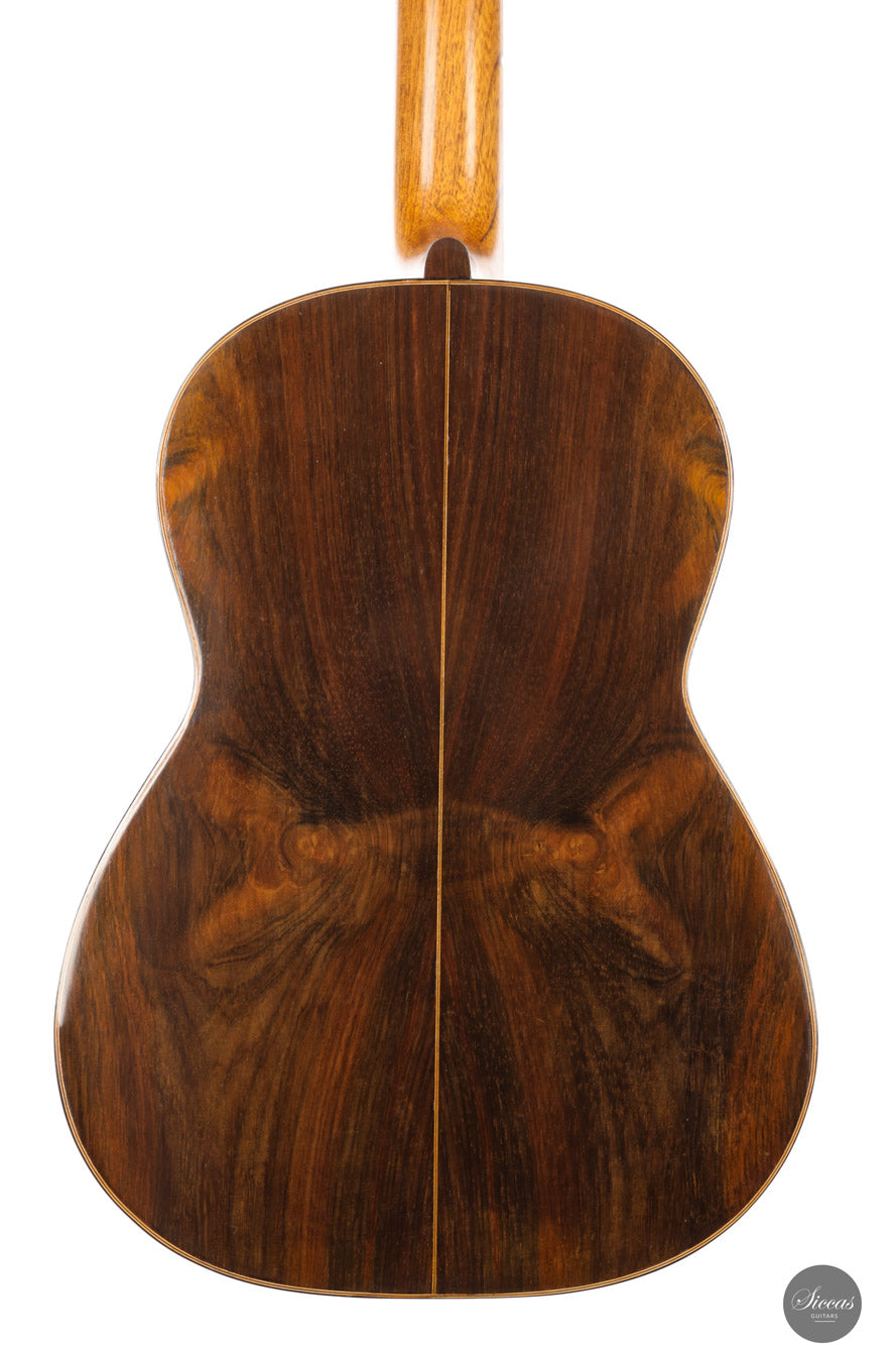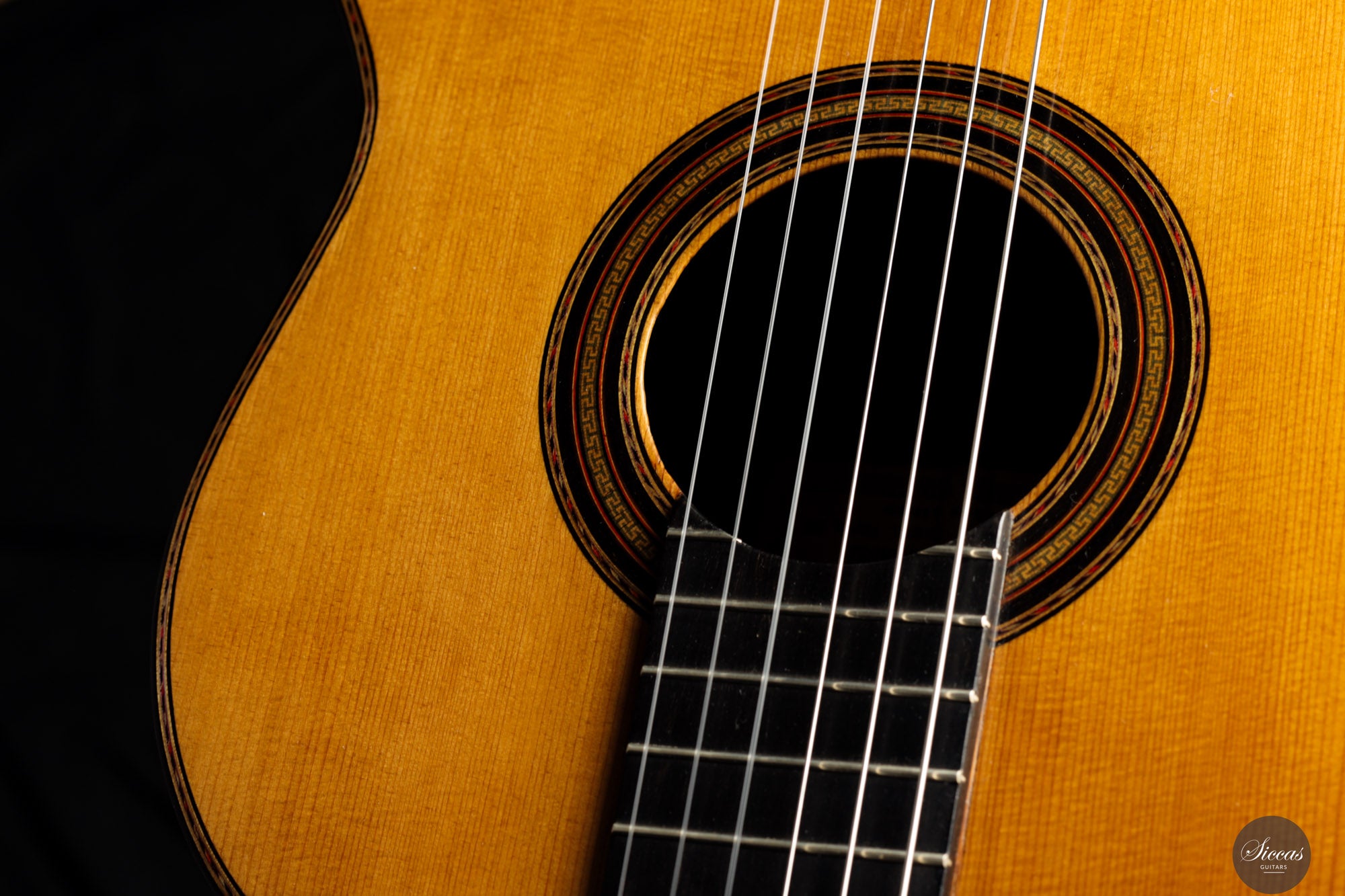 This exceptional guitar is considered one of the luxury models made by Santos Hernández, clearly distinguished by its elaborate decorative elements. Although dated 1932 on its label, clearly reflects the design and craftsmanship typical of Santos Hernández’s work from the 1920s. The materials used—particularly the Brazilian rosewood for the back and sides—are consistent with the wood Santos had access to during his tenure at Viuda de Manuel Ramírez. The rosette features a central motif reminiscent of ancient Greek design, a distinctive detail also commonly seen in his earlier works under Viuda de Manuel Ramírez.Historical Significance & Attribution