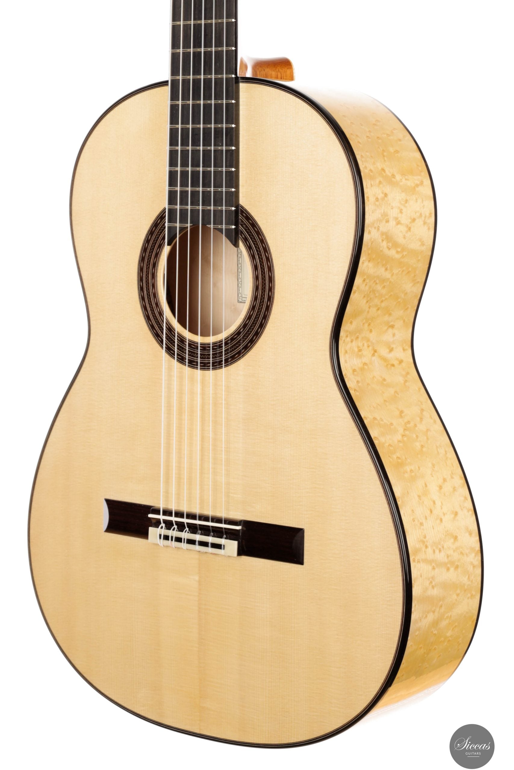 This 2025 Arenaria model was conceived, in the words of the luthier, as “an uncompromised tool made for serving music”—a lightweight, expressive instrument built to realize the true purpose of the musical craft. The spruce top is Italian alpine spruce from Val di Fiemme, a region famed for its resonance wood. It is supported by a 7-strut bracing system inspired by Torres but personalized through Fracasso’s own experience, adjustments, and tonal goals. The back and sides are made from Bosnian birdseye maple, a choice that contributes to the guitar’s light weight and distinctive clarity.