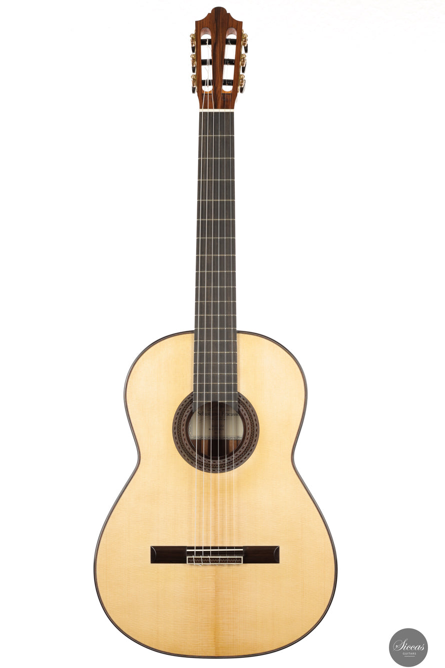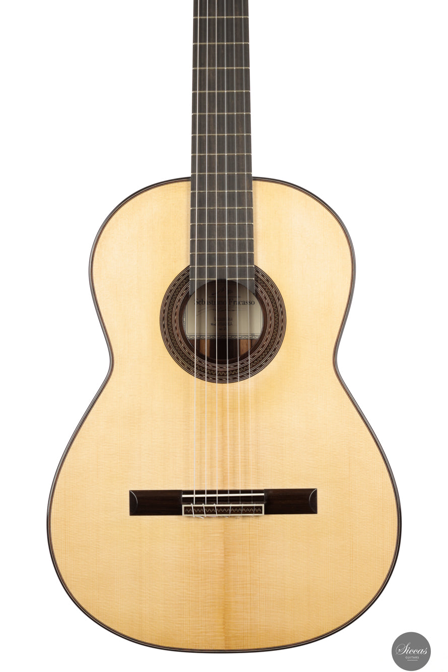 Sebastiano Fracasso’s 2025 "Arenaria" is a lyrical, full-voiced concert guitar crafted with aged European spruce and Pau Ferro. Its Torres-inspired bracing and refined structure yield a mellow, creamy tone with fast response and exceptional balance. Conceptually rich and meticulously built, it embodies both artistic vision and traditional resonance.