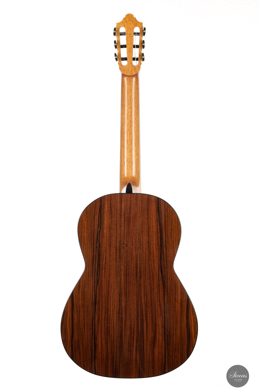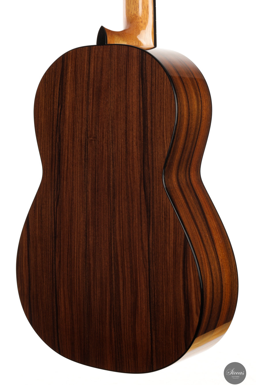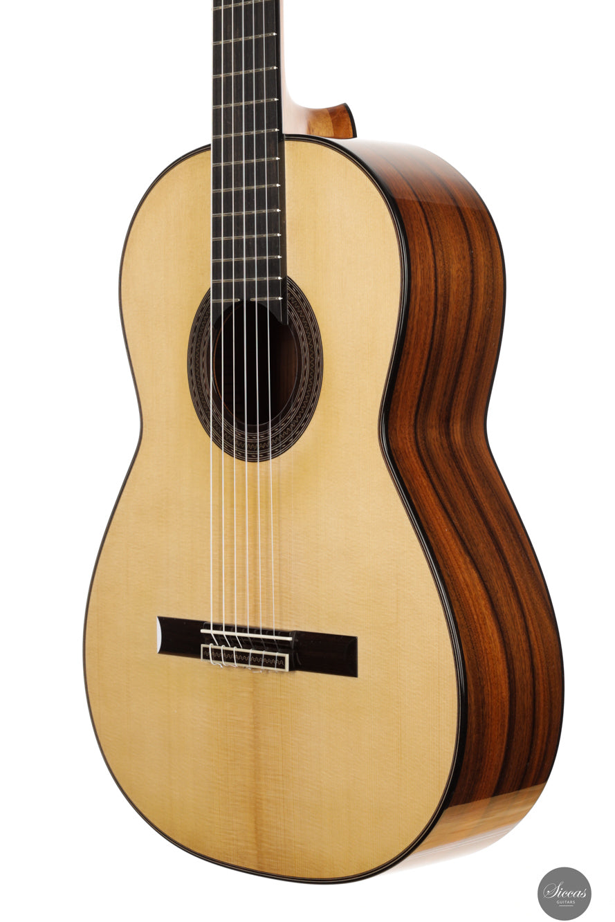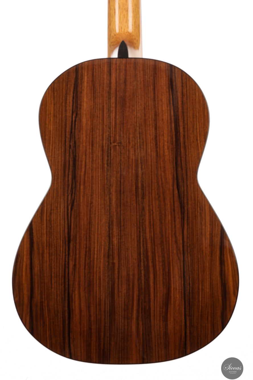 The 2025 "Arenaria" is a thoughtfully executed concert guitar, built with a top of 30-year-old naturally seasoned European spruce and South American Pau Ferro back and sides. This wood pairing, chosen for its lightness and tonal depth, results in an instrument with a notably low body resonance and a strong voice full of character. Its seven-fan bracing, inspired by Torres but reinterpreted through Fracasso’s own design experience, supports a vibrant response across the dynamic spectrum.