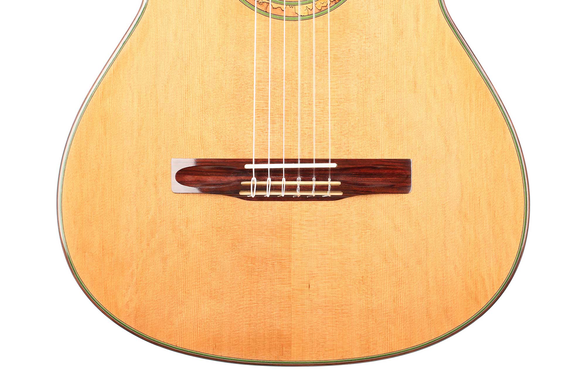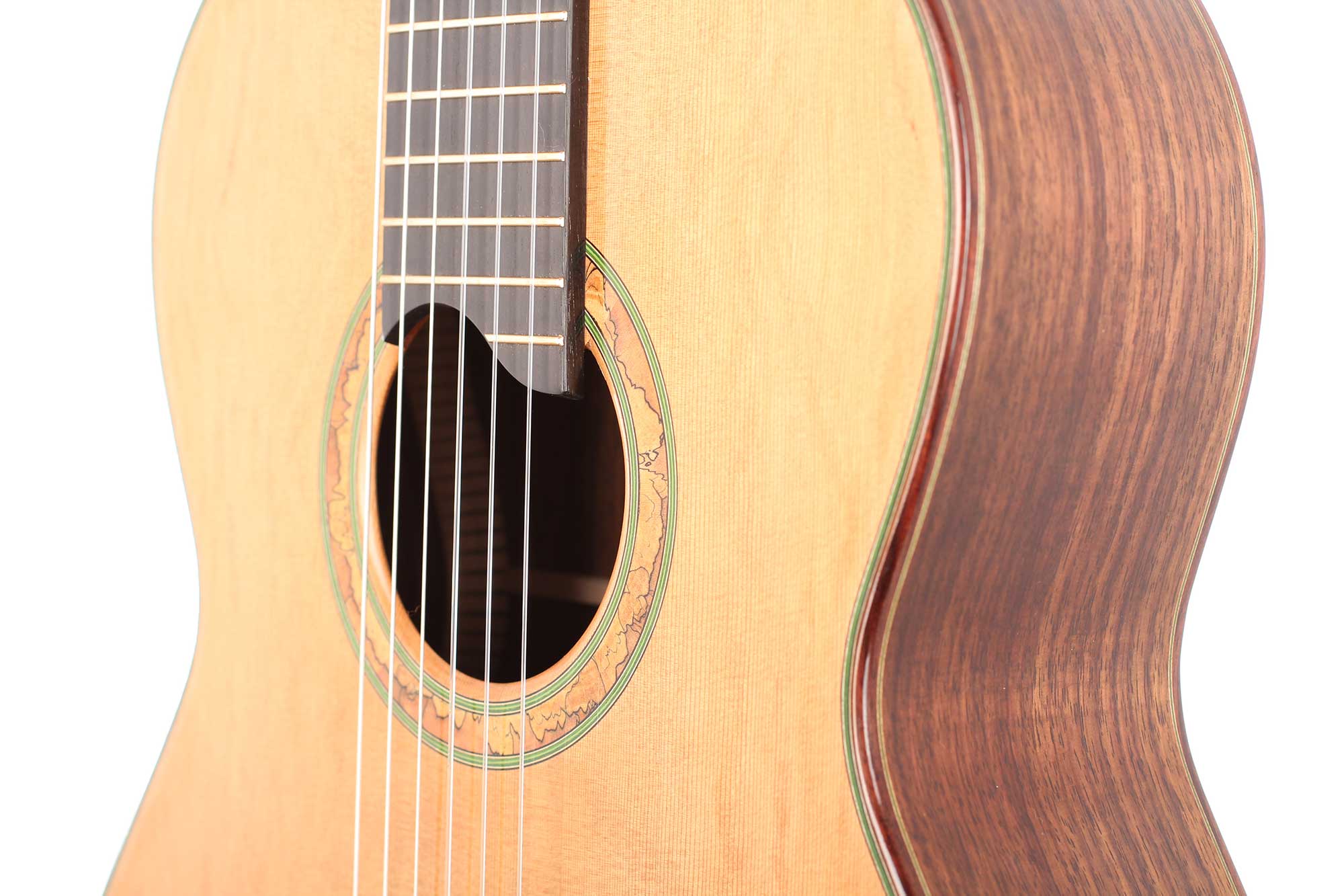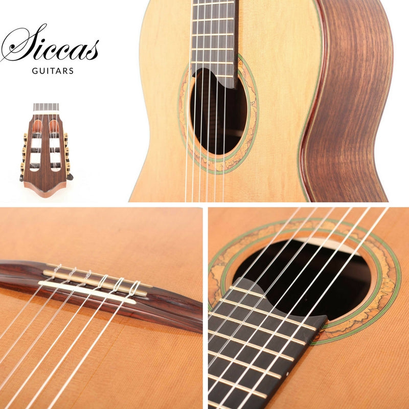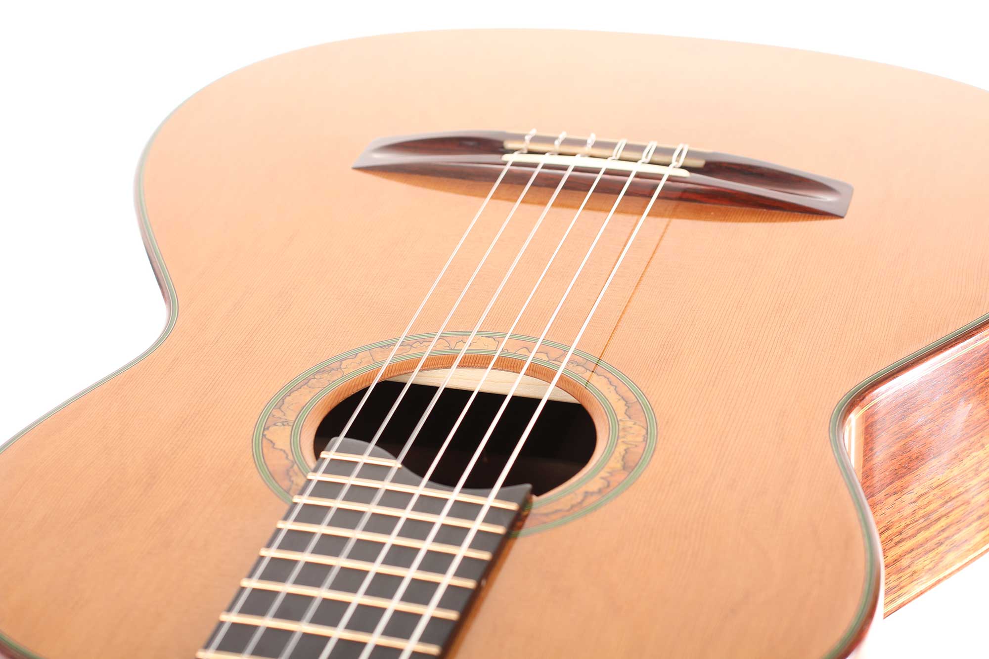 This instrument’s top is made of fine cedar, its sides are made of Indian Rosewood. The strong sound of this guitar is impressive, it has a good balance and riveting depth of bass, focused mids and singing trebles. Altogether a remarkable instrument with impressive balance, sustain and refinement. All shellac French-polished to very high standard. The tuners are made by Rubner. A Hiscox Pro II case is included.