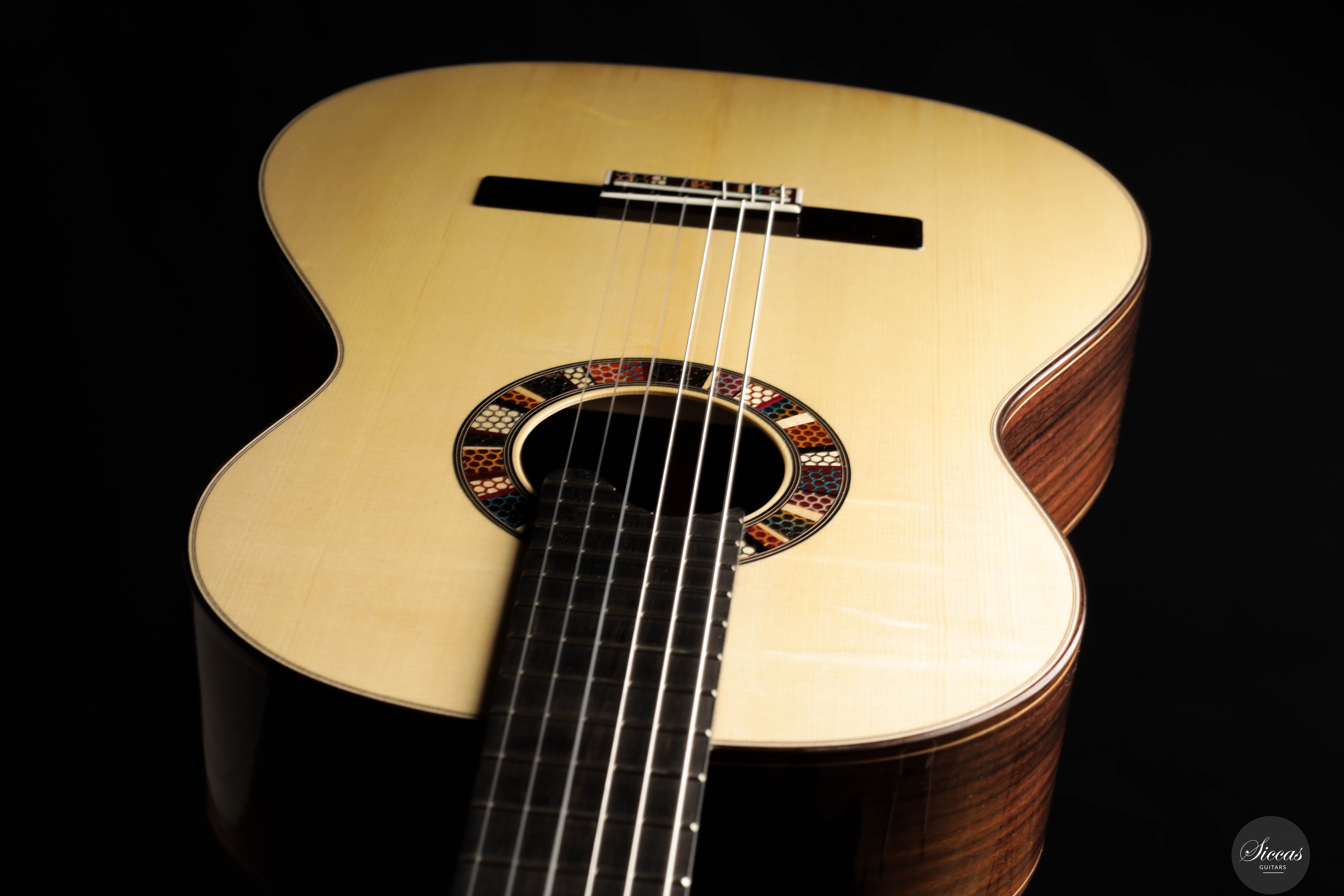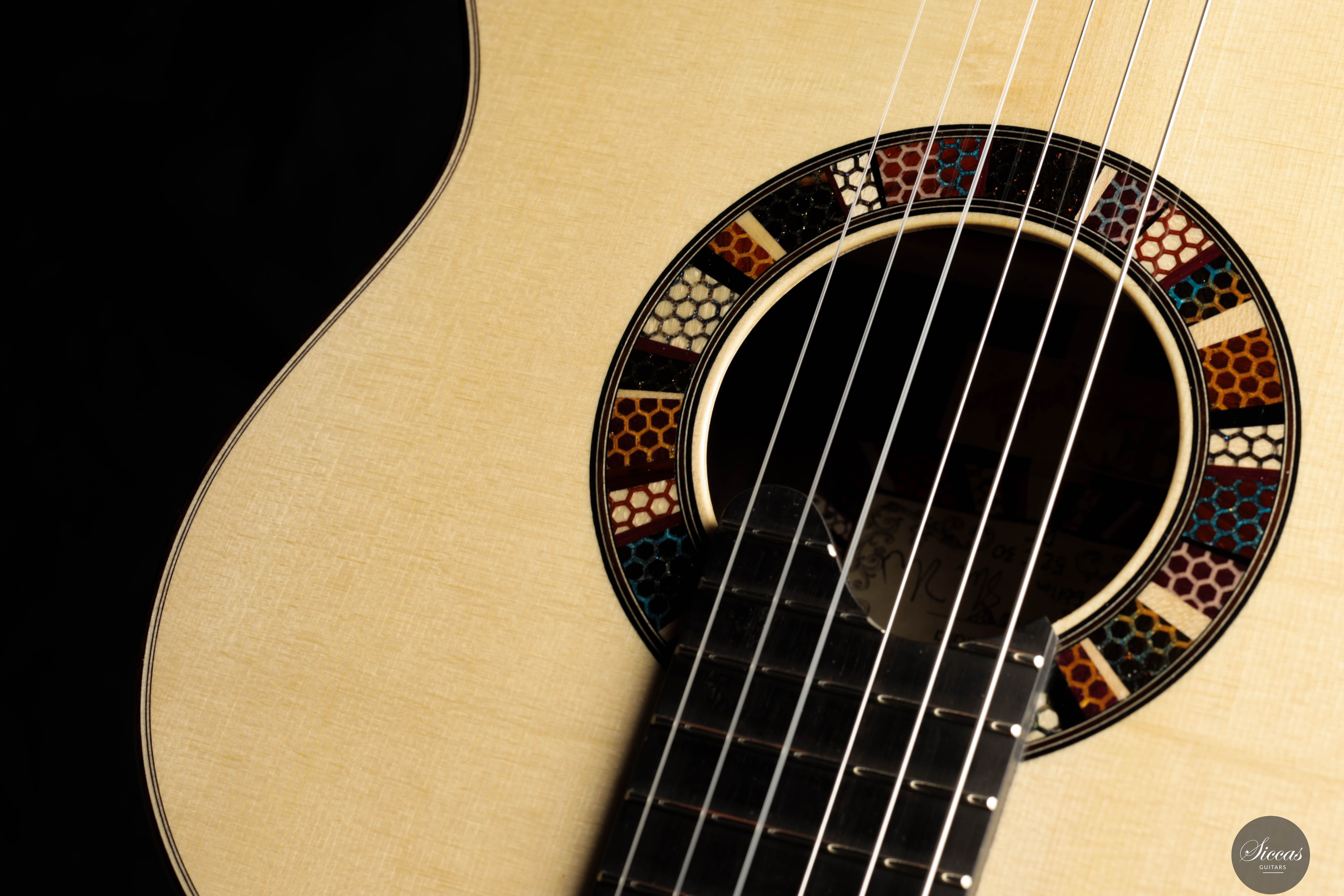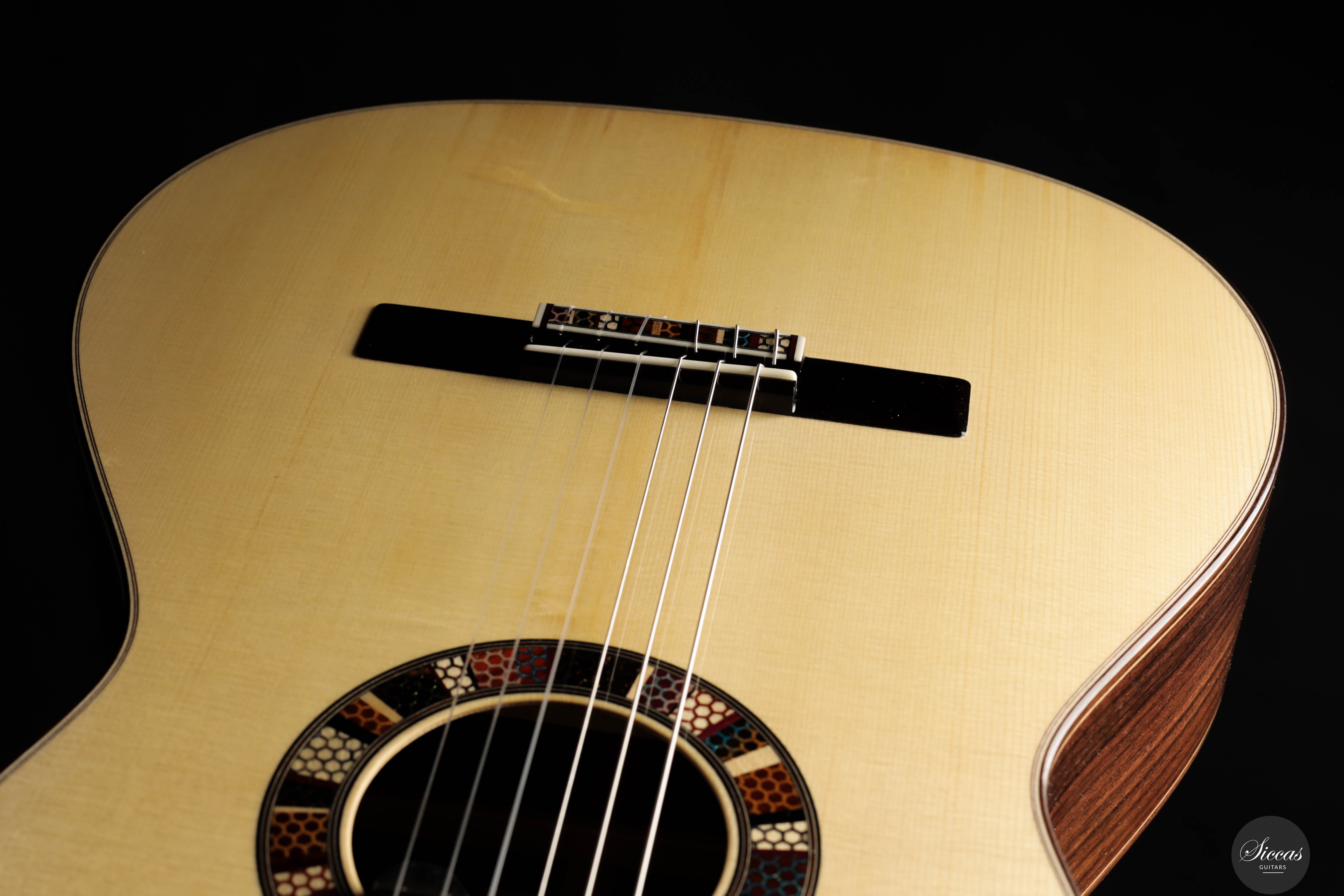 The two REG Limited Edition 2025 guitars are the result of numerous experiments aimed at developing a new guitar model within my production, designed to meet the needs of musicians who seek an instrument with greater power and projection than a traditional guitar can typically offer. This particular model is the Double-Top version, conceived as the sister guitar of the Lattice model, which is also available. For the Double-Top, the soundboard was constructed using Nomex, a lightweight material inserted between two thin wooden layers, combined with a traditional bracing pattern. The goal for both models was not simply to create an instrument with a loud or extreme sound, but rather to achieve increased power and projection, while preserving the tonal richness and subtle nuances that define the sound of traditionally built guitars. One of the distinctive visual features of this Double-Top model is the rosette motif, which symbolically represents the structure of the Nomex material. This detail serves as an aesthetic signature, distinguishing it from its sister, the Lattice model, at first glance.Regular care extends the life of the instrument