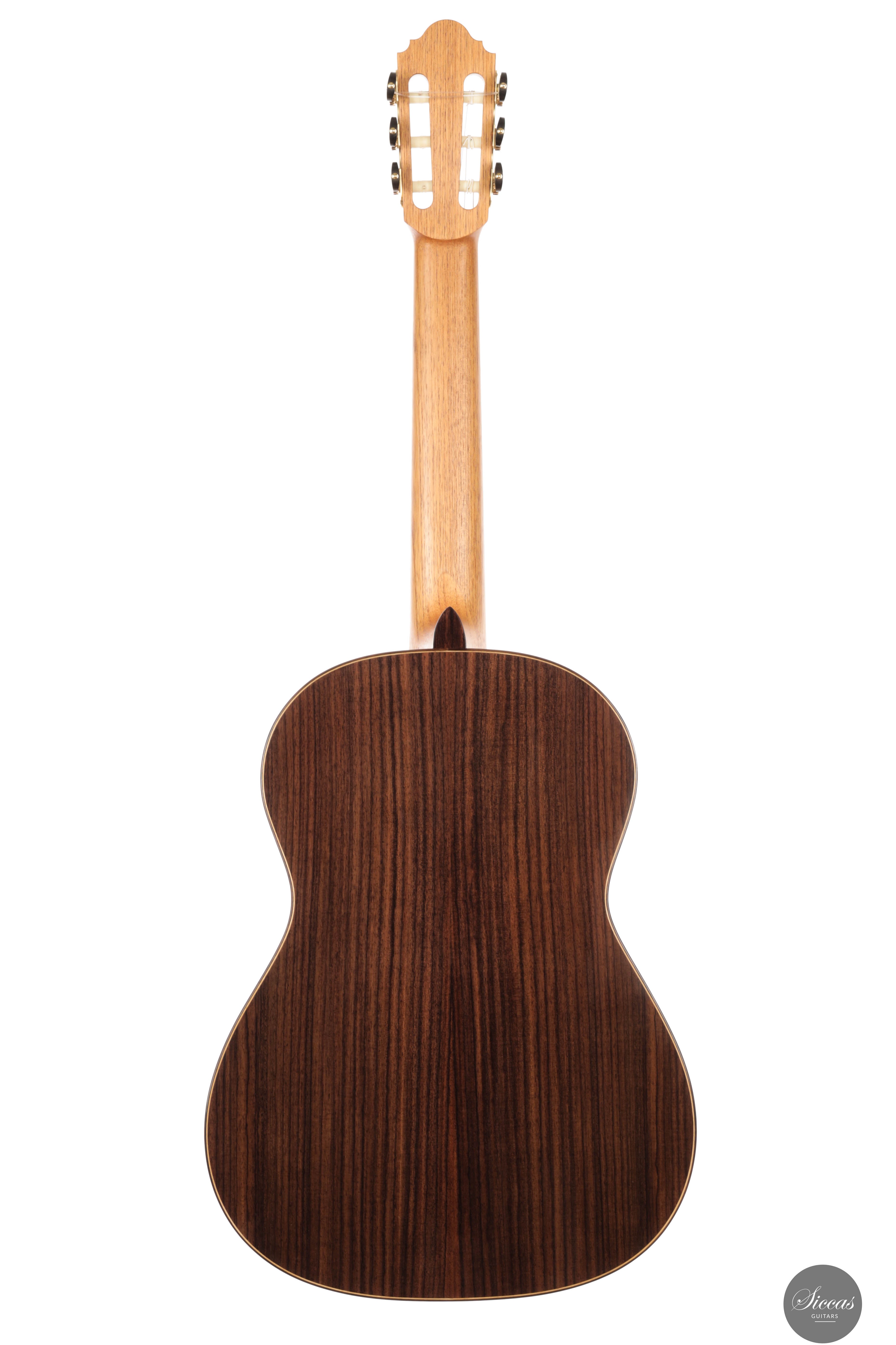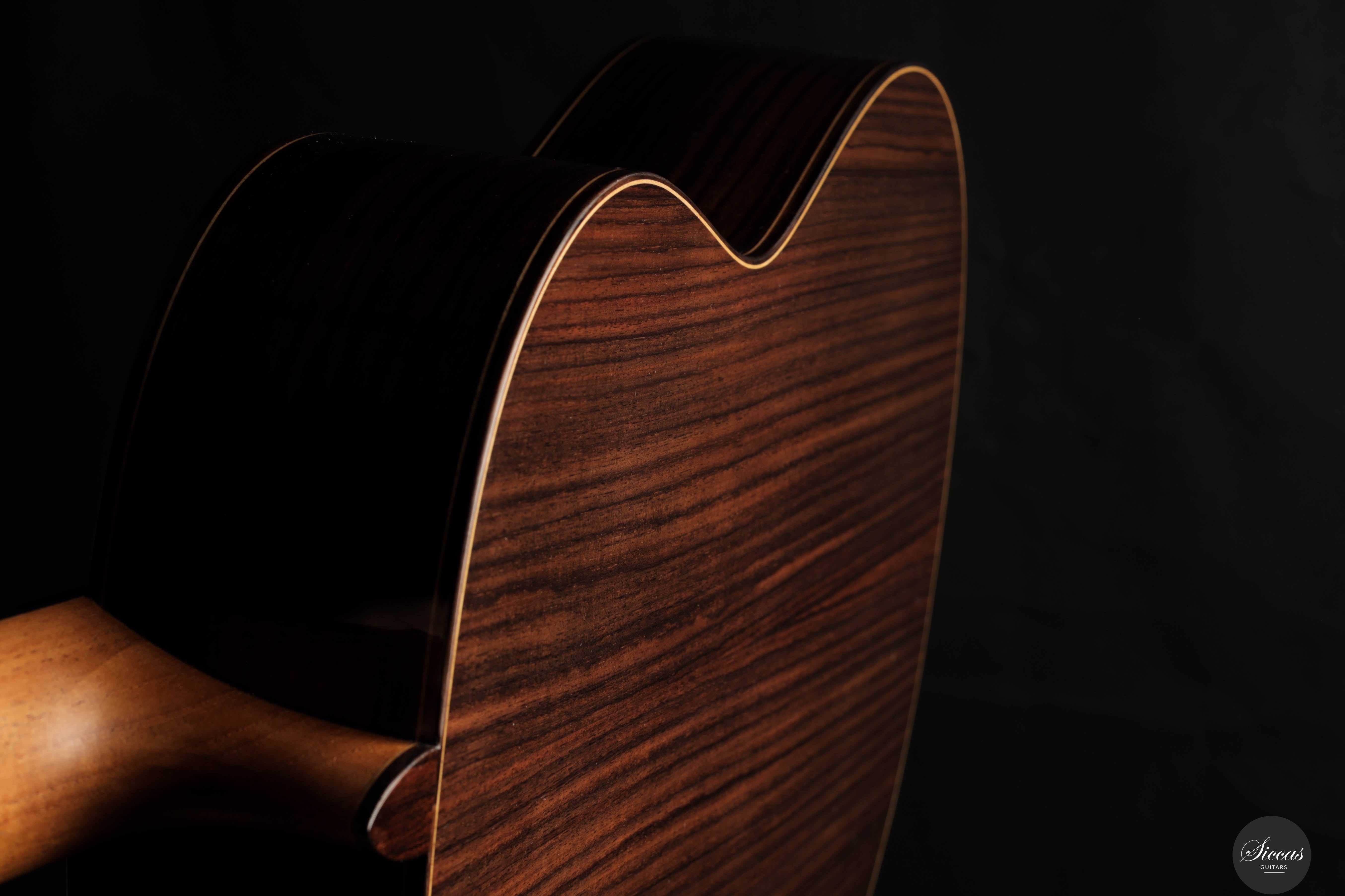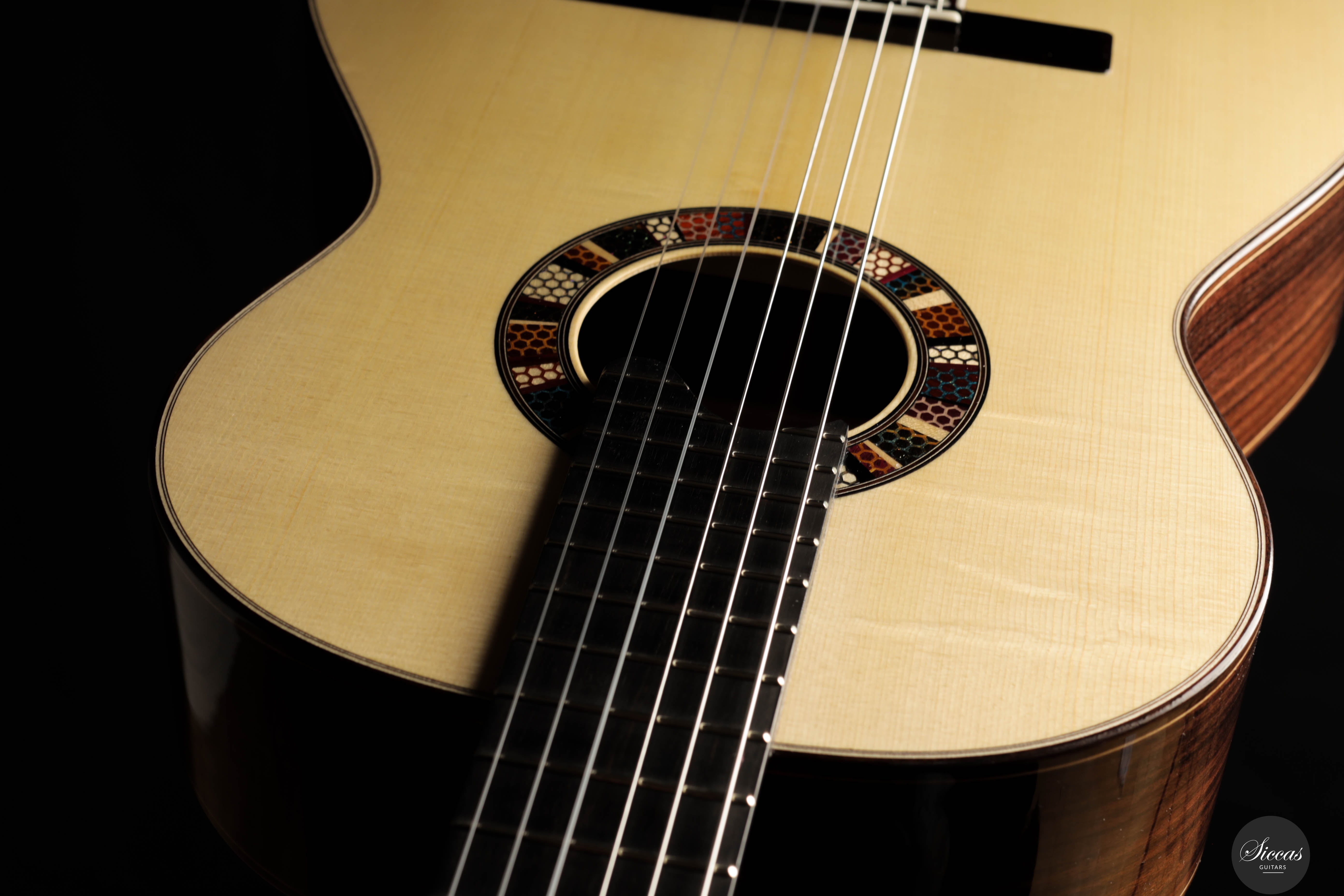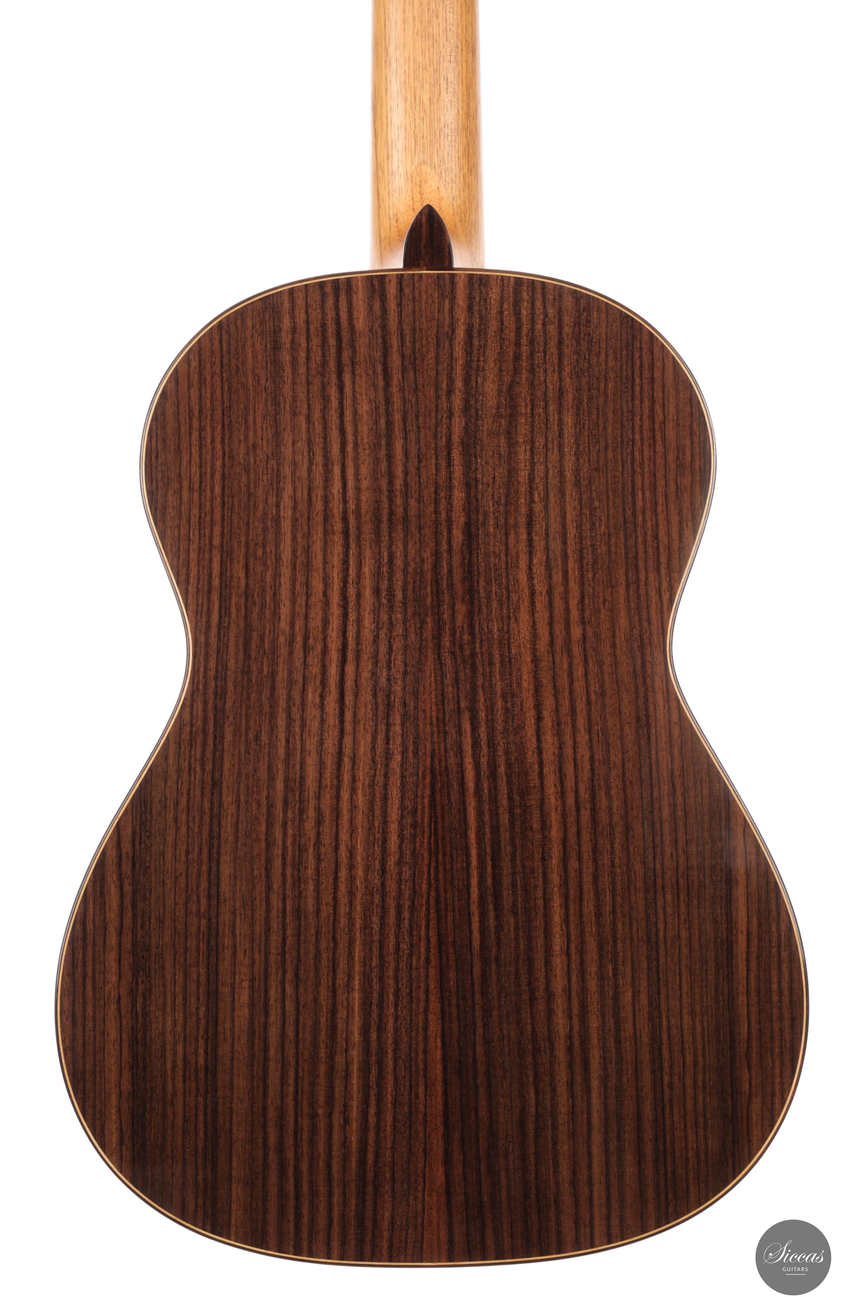 The two REG Limited Edition 2025 guitars are the result of numerous experiments aimed at developing a new guitar model within my production, designed to meet the needs of musicians who seek an instrument with greater power and projection than a traditional guitar can typically offer. This particular model is the Double-Top version, conceived as the sister guitar of the Lattice model, which is also available. For the Double-Top, the soundboard was constructed using Nomex, a lightweight material inserted between two thin wooden layers, combined with a traditional bracing pattern. The goal for both models was not simply to create an instrument with a loud or extreme sound, but rather to achieve increased power and projection, while preserving the tonal richness and subtle nuances that define the sound of traditionally built guitars. One of the distinctive visual features of this Double-Top model is the rosette motif, which symbolically represents the structure of the Nomex material. This detail serves as an aesthetic signature, distinguishing it from its sister, the Lattice model, at first glance.Regular care extends the life of the instrument