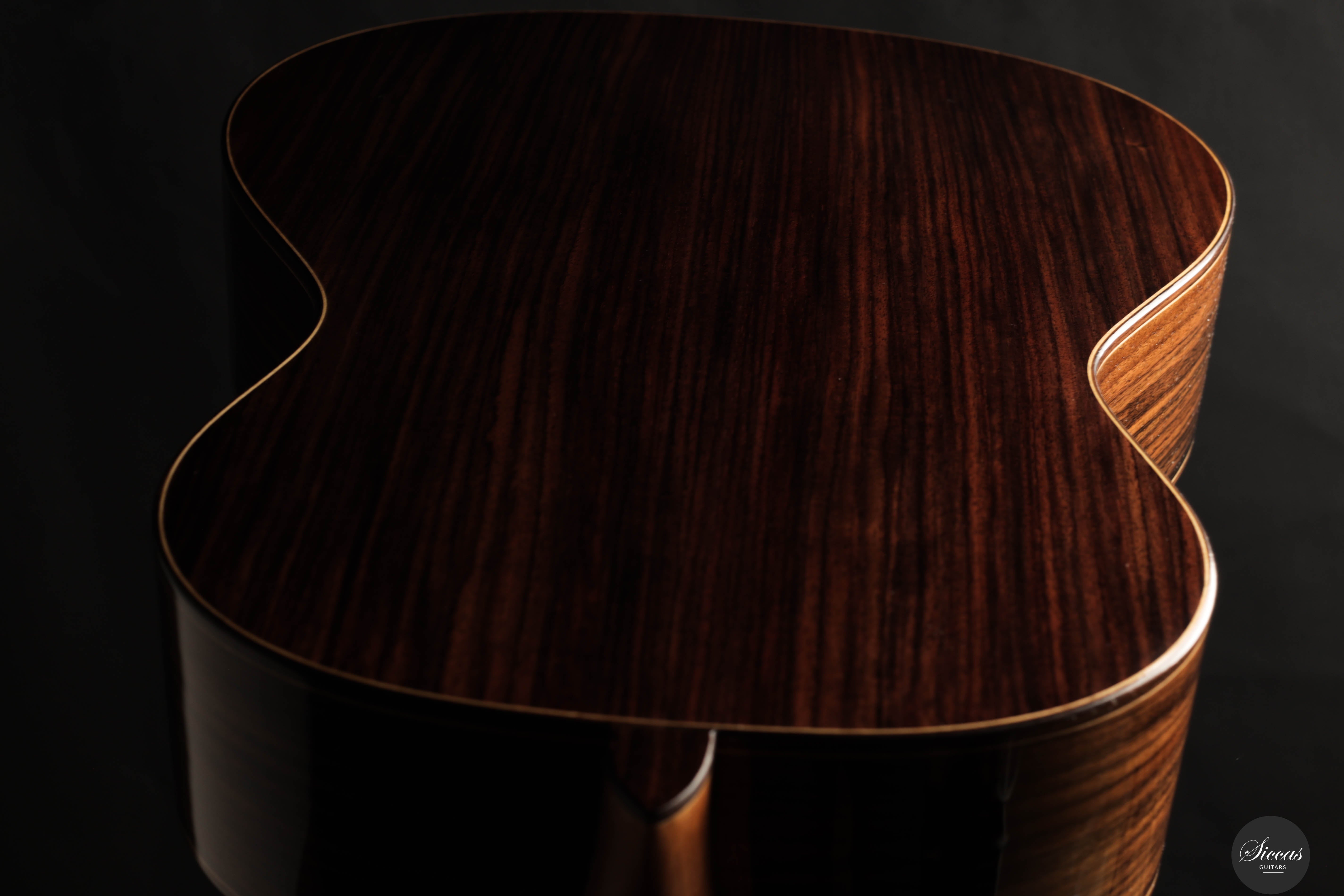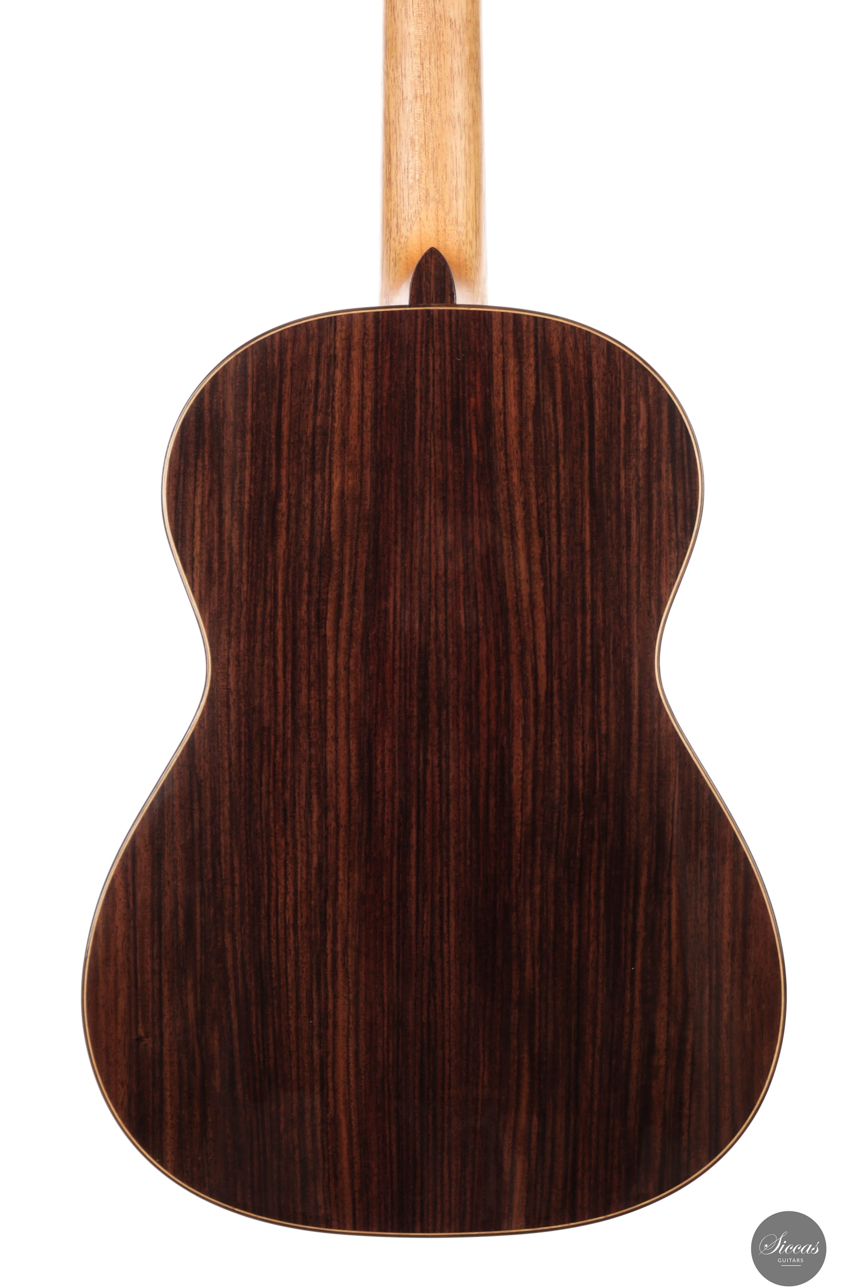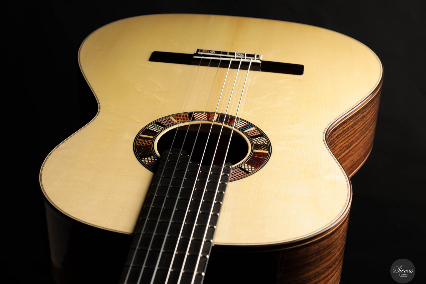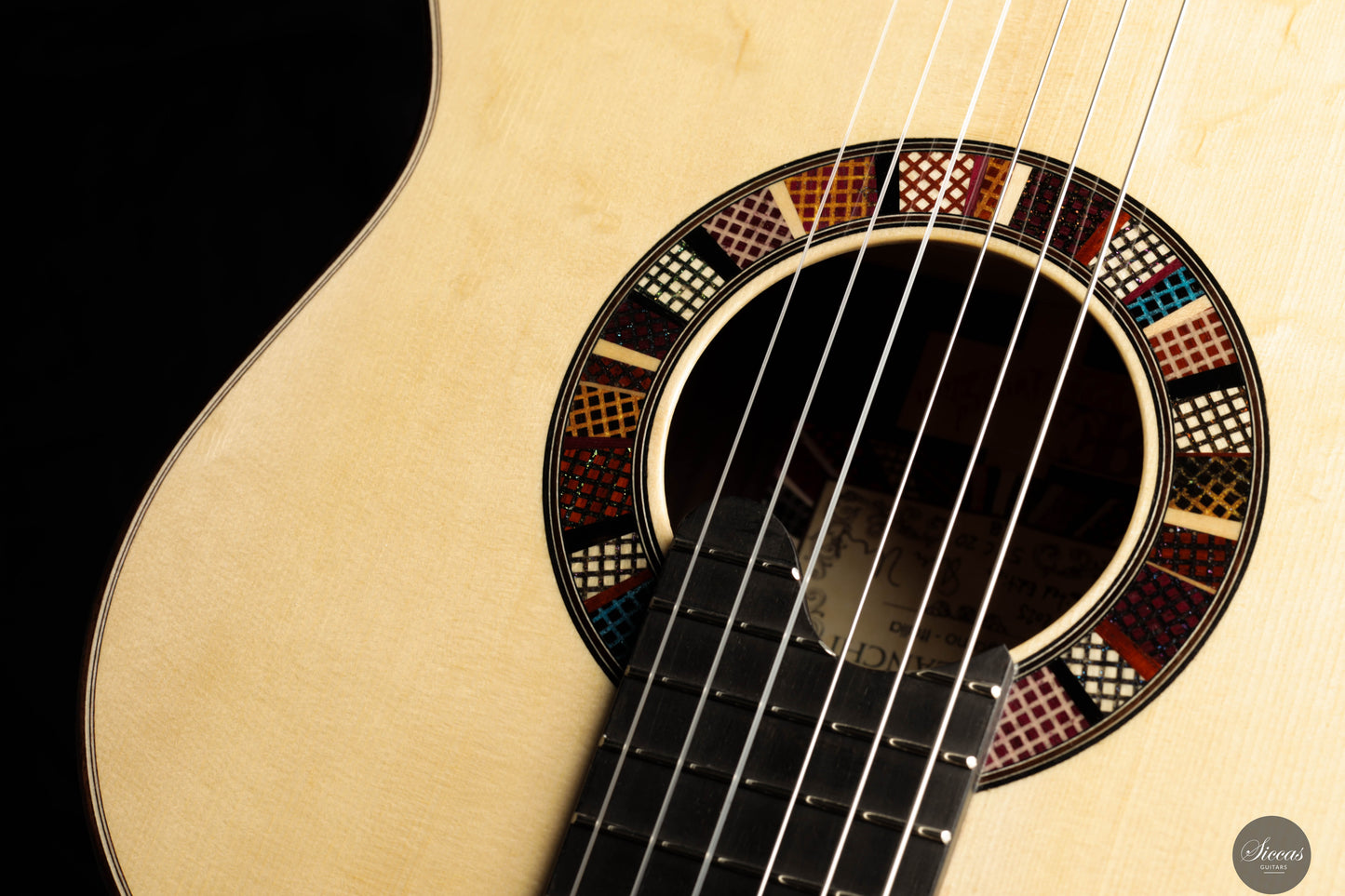 The two REG Limited Edition 2025 guitars are the result of numerous experiments that led to the creation of a new model in Silvia Zanchi’s production. This model is designed for musicians who seek a more powerful sound and greater projection than a traditional guitar offers. This particular instrument is the Lattice Bracing model, conceived as the sister guitar to the Doubletop model, which is also available at Siccas Guitars. For this guitar, traditional materials were deliberately selected, aiming to achieve a very light soundboard, supported by a spruce lattice bracing system. This construction helps to counterbalance string tension, while allowing the soundboard to vibrate freely like a drum skin, resulting in outstanding projection and responsiveness. A distinctive aesthetic feature is the rosette, inspired by the geometric pattern of the lattice bracing. This design is echoed in the bridge platelet decoration and in the label frame, which is hand-painted with great precision.Regular care extends the life of the instrument