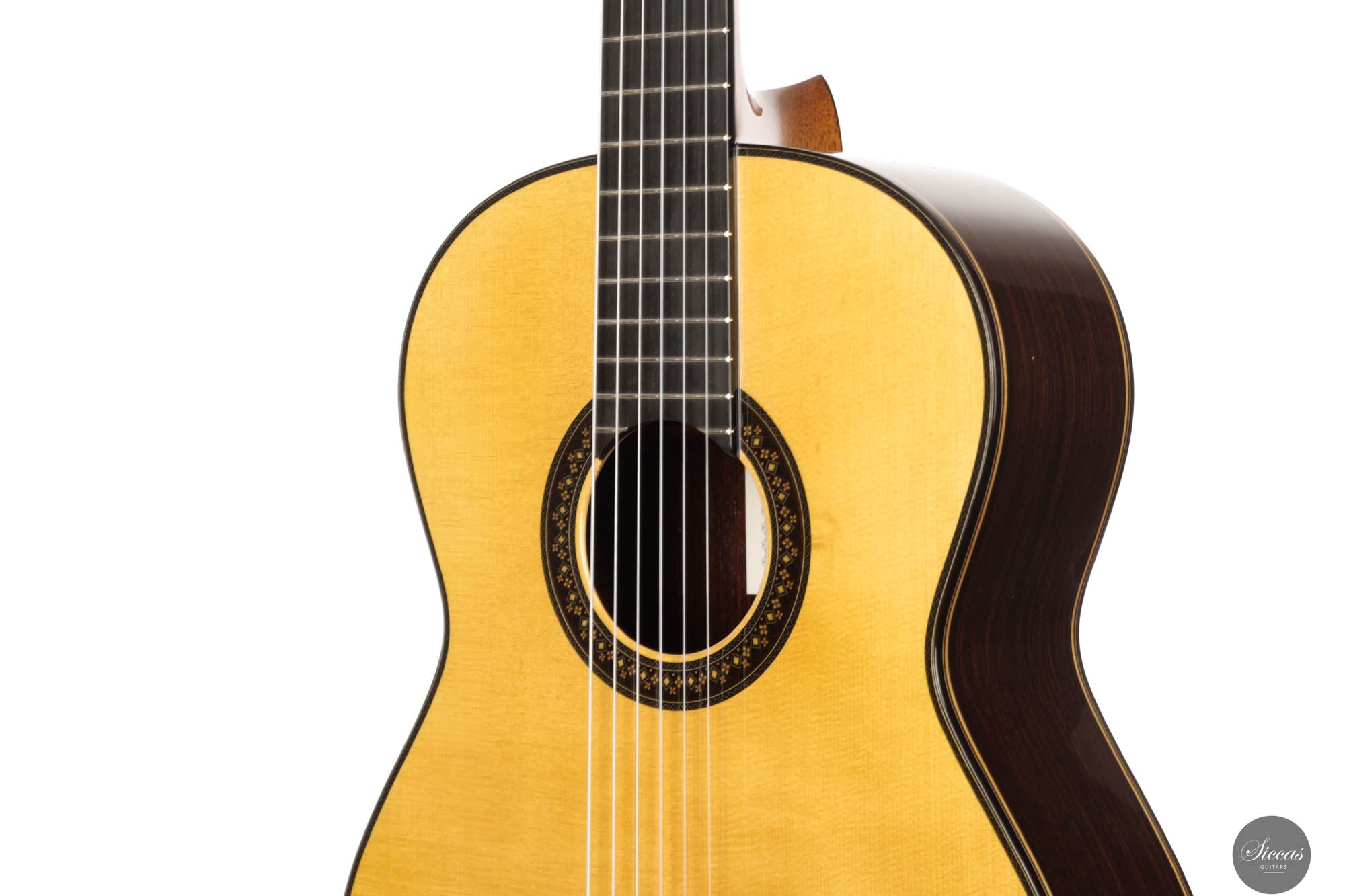The So Kimishima “Stella” is a concert guitar inspired by the legendary Masaru Kohno instruments of the 1950s and 60s, carrying forward their elegance and tonal depth. With a spruce soundboard reinforced by six fan braces and Indian rosewood back and sides, it produces a warm, resonant voice with clarity and balance across all registers. Kimishima’s signature rosette highlights the refined craftsmanship and attention to detail that define his work. Comfortable to play and tonally versatile, the Stella offers both richness and precision, making it a compelling instrument for practice, performance, and artistic expression.