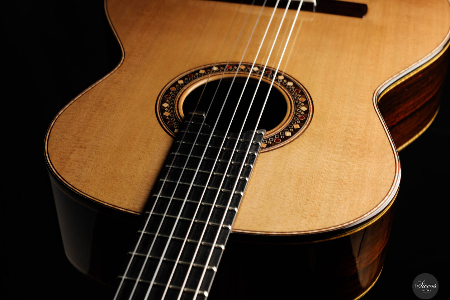 Kimishima's meticulous selection of materials and his dedication to blending traditional techniques with personal innovation are evident in the quality of sound this guitar produces. The cedar soundboard is known for its ability to mature beautifully over time, offering a sound that becomes richer and more resonant, while the Madagascar rosewood contributes to the depth and complexity of the instrument's tonal palette. Together, they create a sound that is both warm and clear, with trebles that sing and basses that provide a grounded, robust foundation. This guitar stands as a shining example of how modern luthiers can honor the legacy of their predecessors while also forging their own path, offering musicians a unique instrument that reflects both the history and future of guitar craftsmanship.