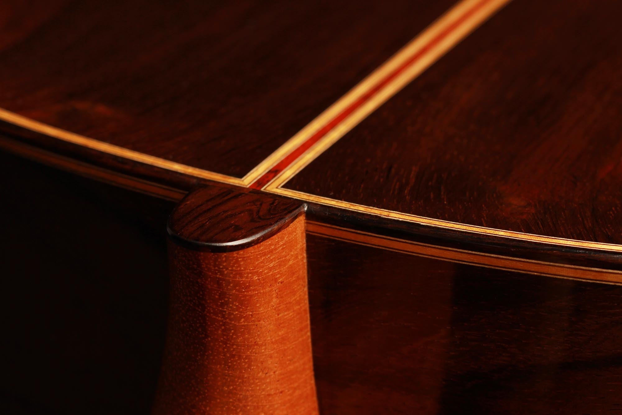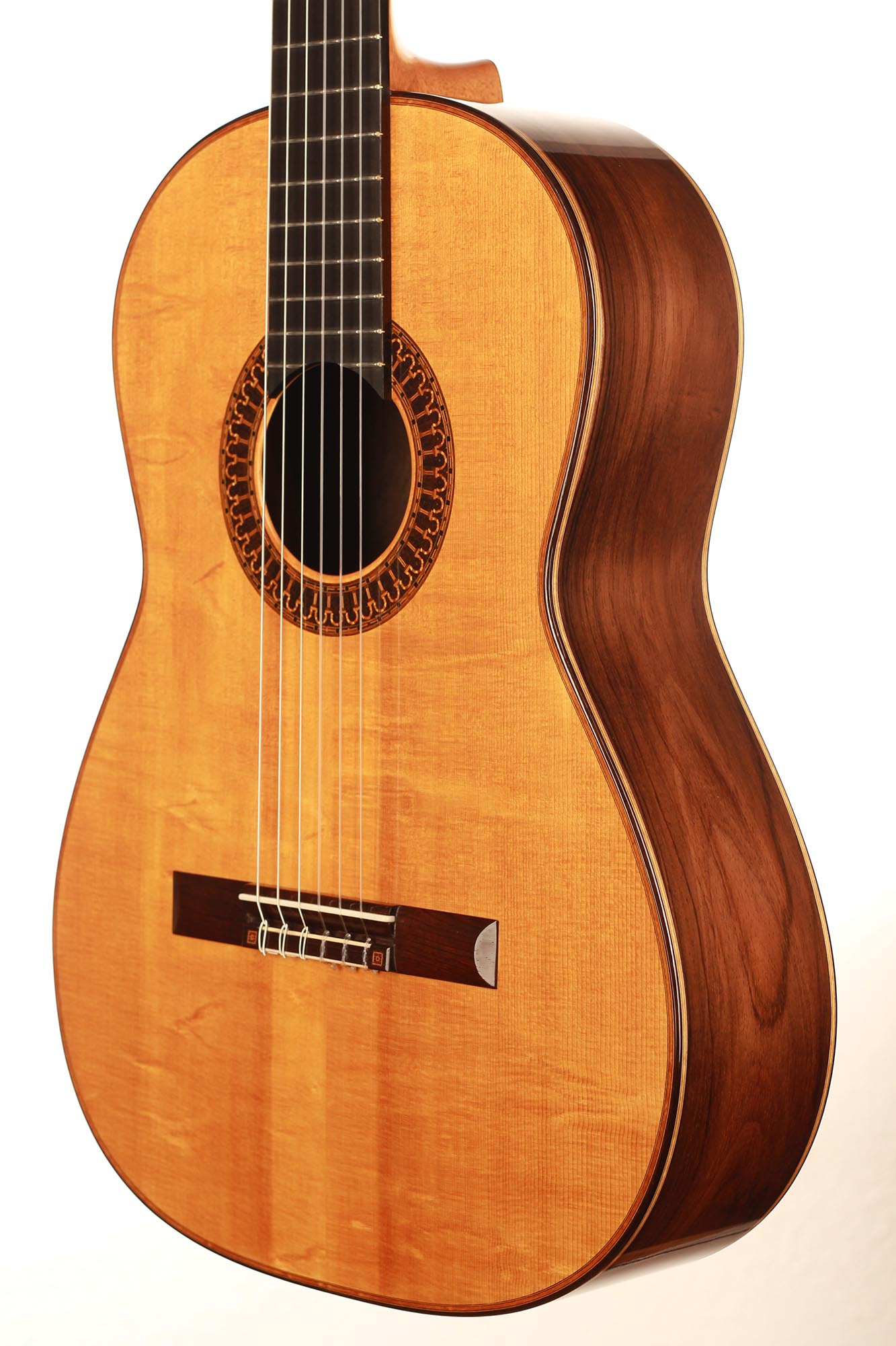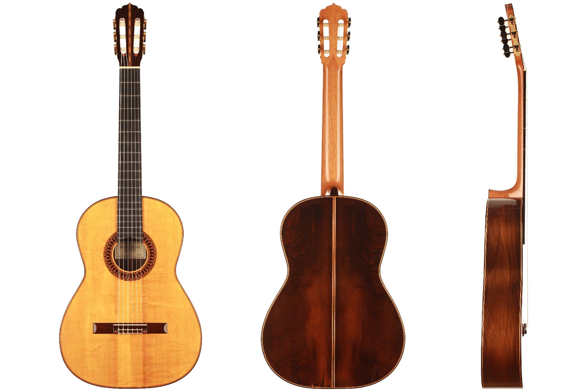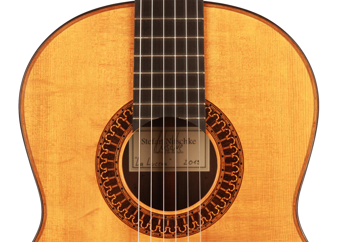 This beautiful instrument named “La Lucena” is one of Stefan Nitschke’s true masterpieces, reaching the highest standards. With its bear-claw vintage-colored spruce top and first-grade Brazilian rosewood (Cites certified), the appearance of this guitar is absolutely striking. Stefan paid great attention to the marquetry details of this José Luis Romanillos model, reproduced the legendary rosette true to the original and used the legendary bridge inlays.