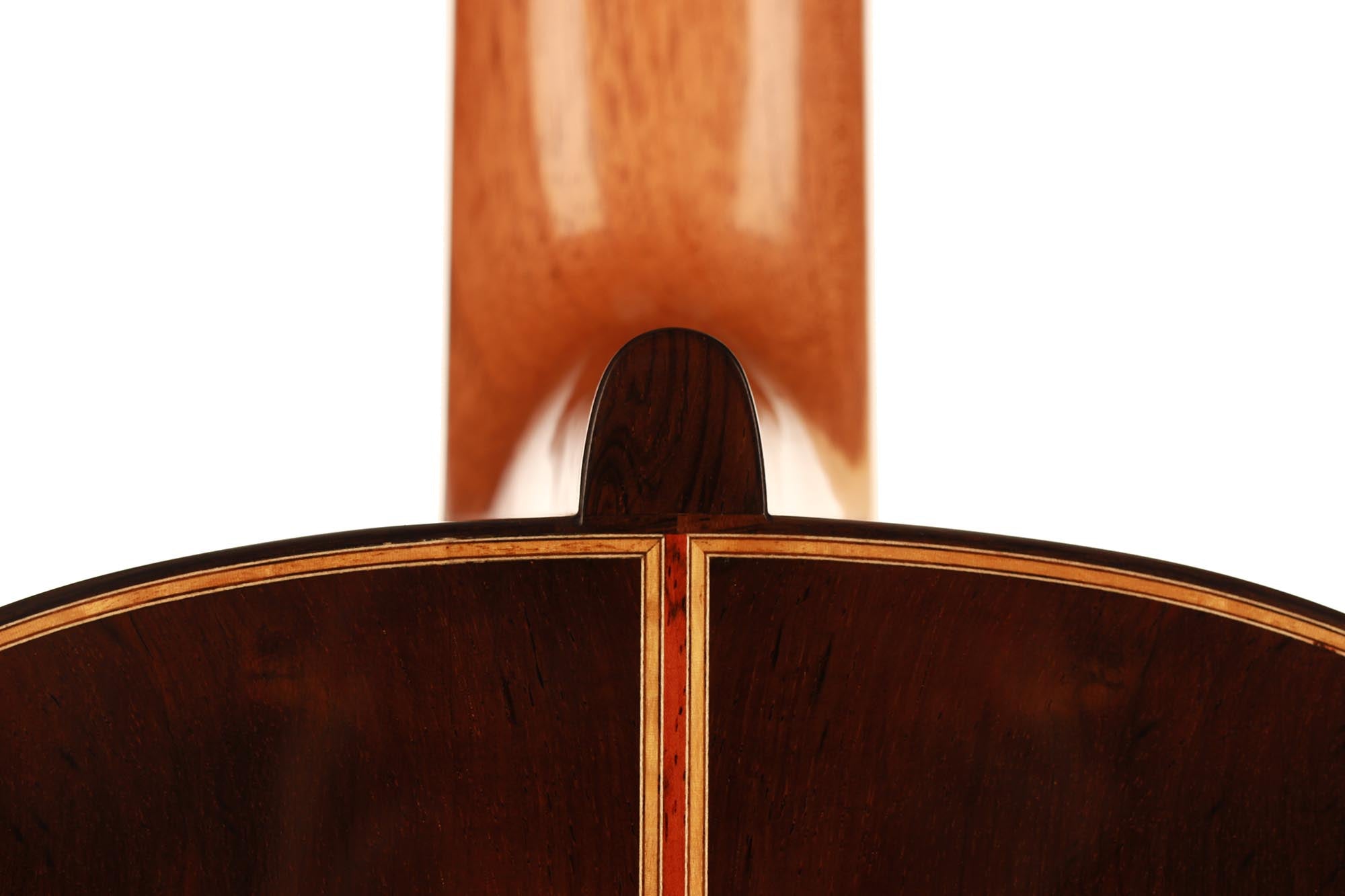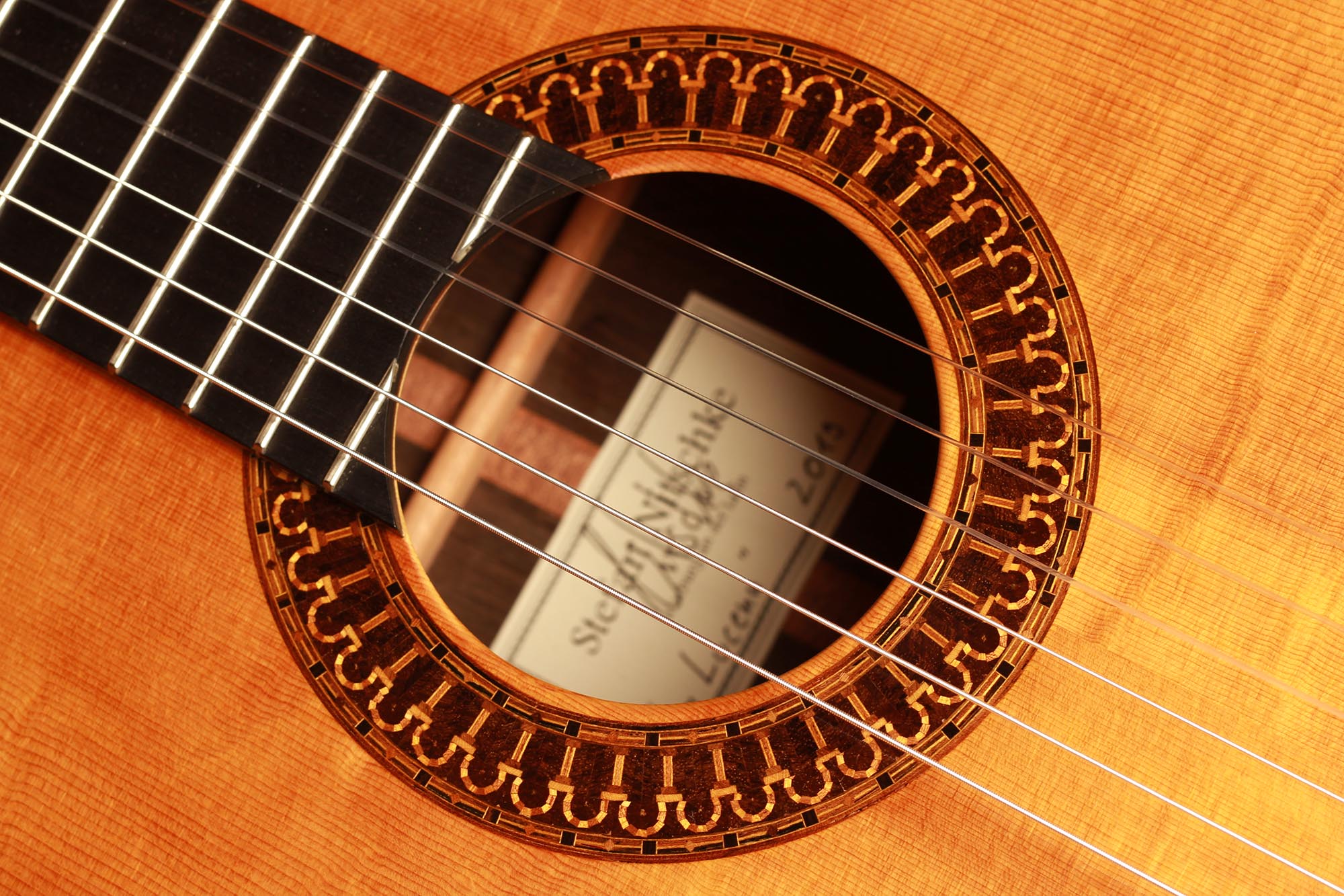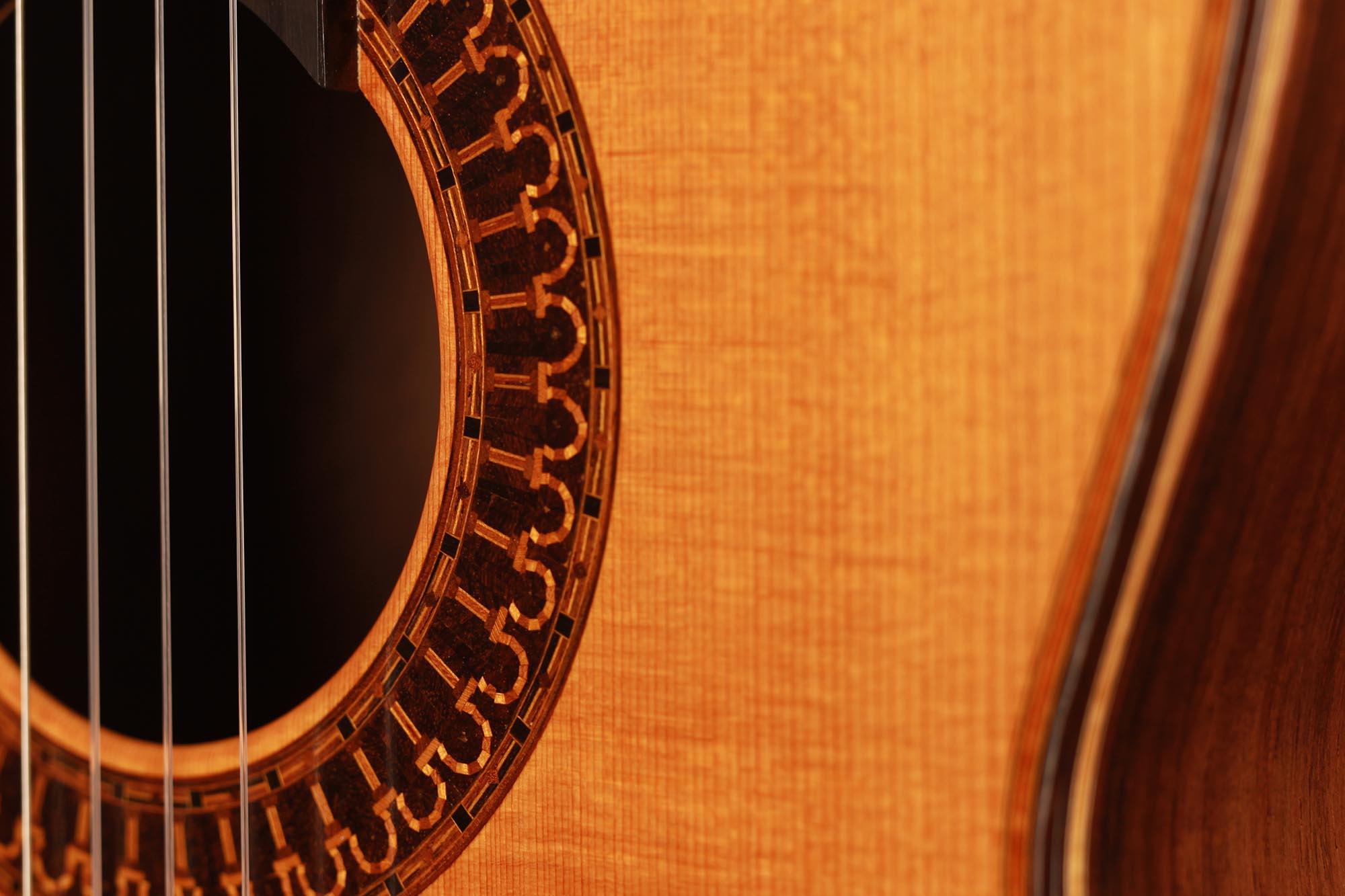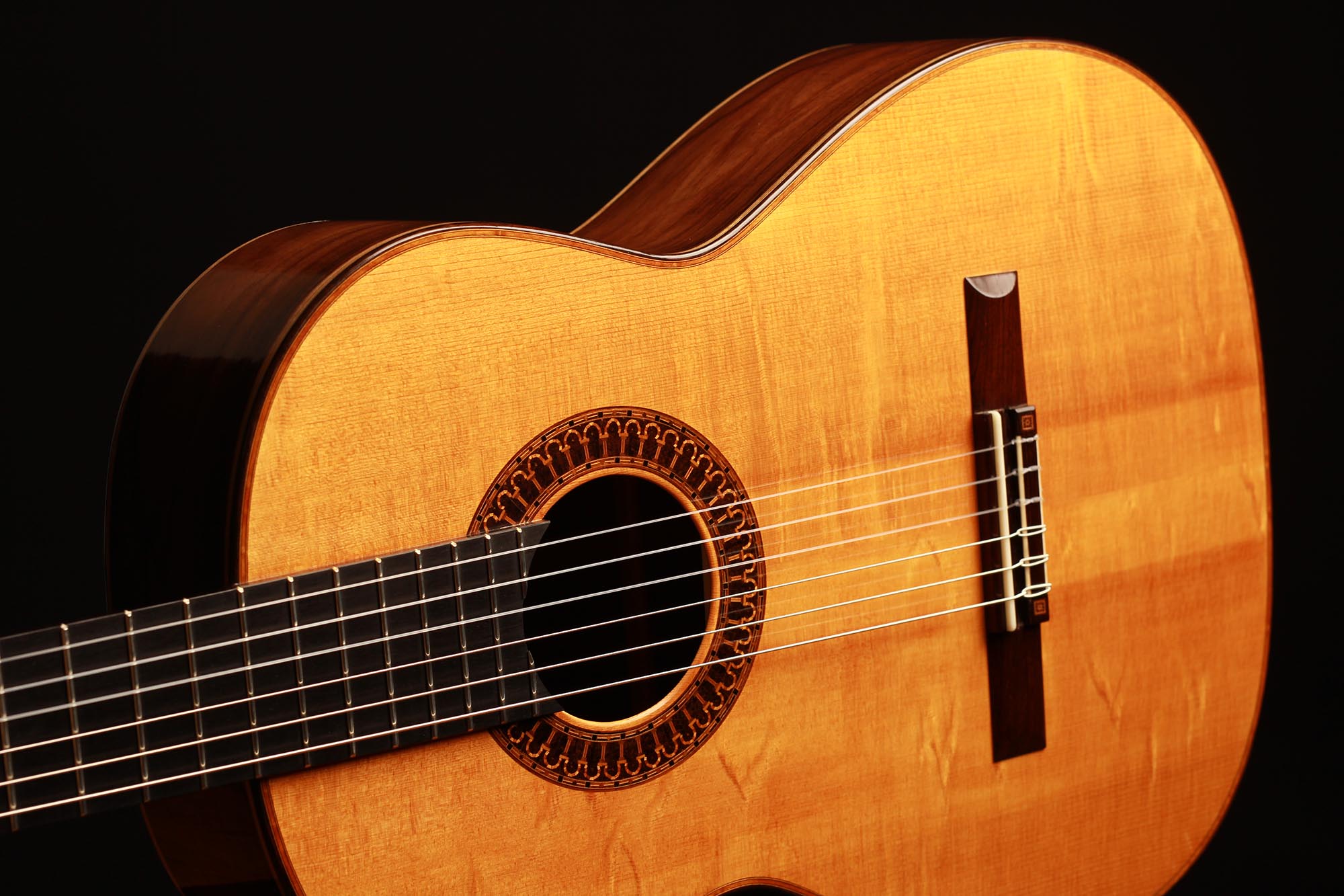 This beautiful instrument named “La Lucena” is one of Stefan Nitschke’s true masterpieces, reaching the highest standards. With its bear-claw vintage-colored spruce top and first-grade Brazilian rosewood (Cites certified), the appearance of this guitar is absolutely striking. Stefan paid great attention to the marquetry details of this José Luis Romanillos model, reproduced the legendary rosette true to the original and used the legendary bridge inlays.