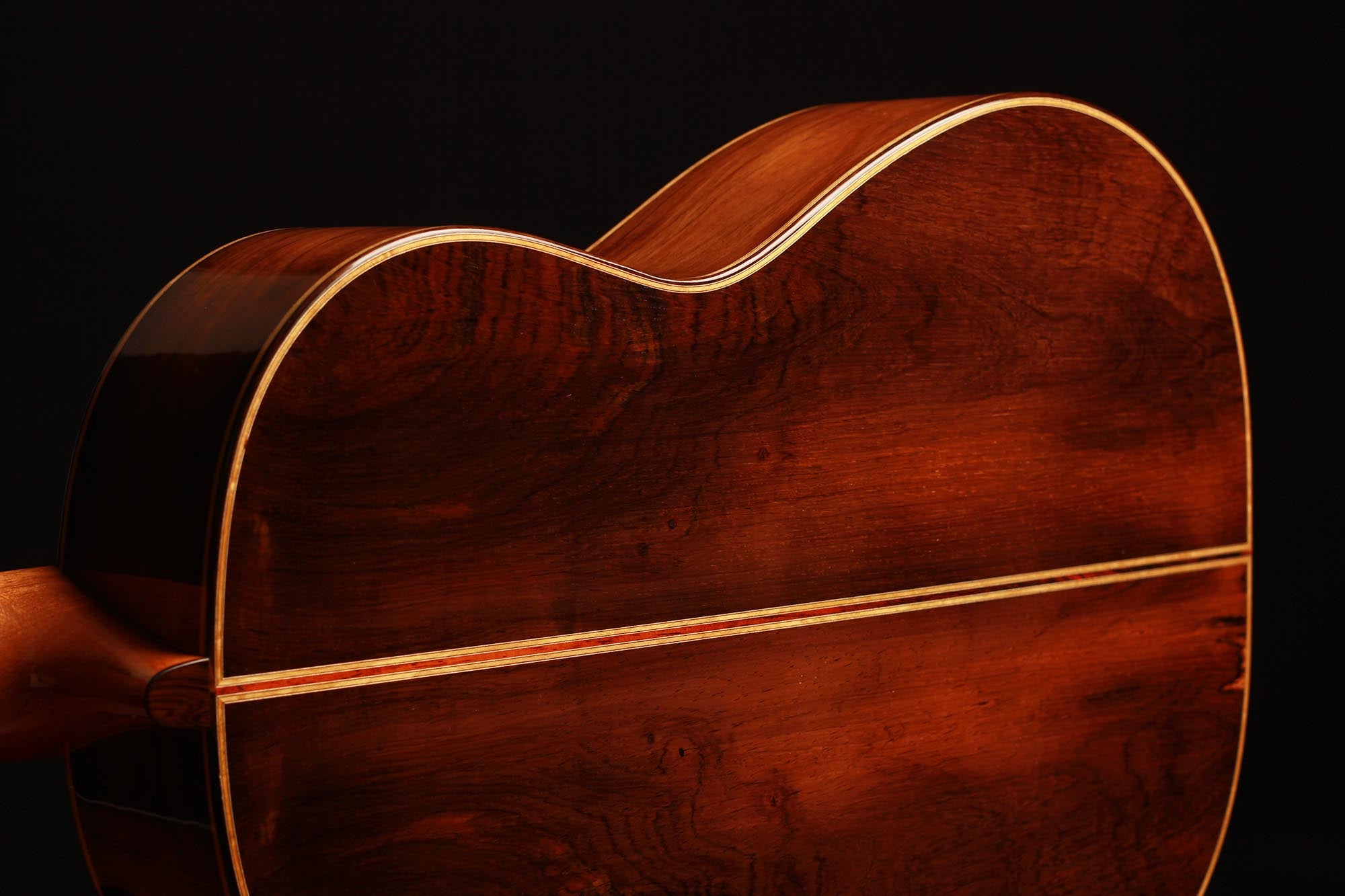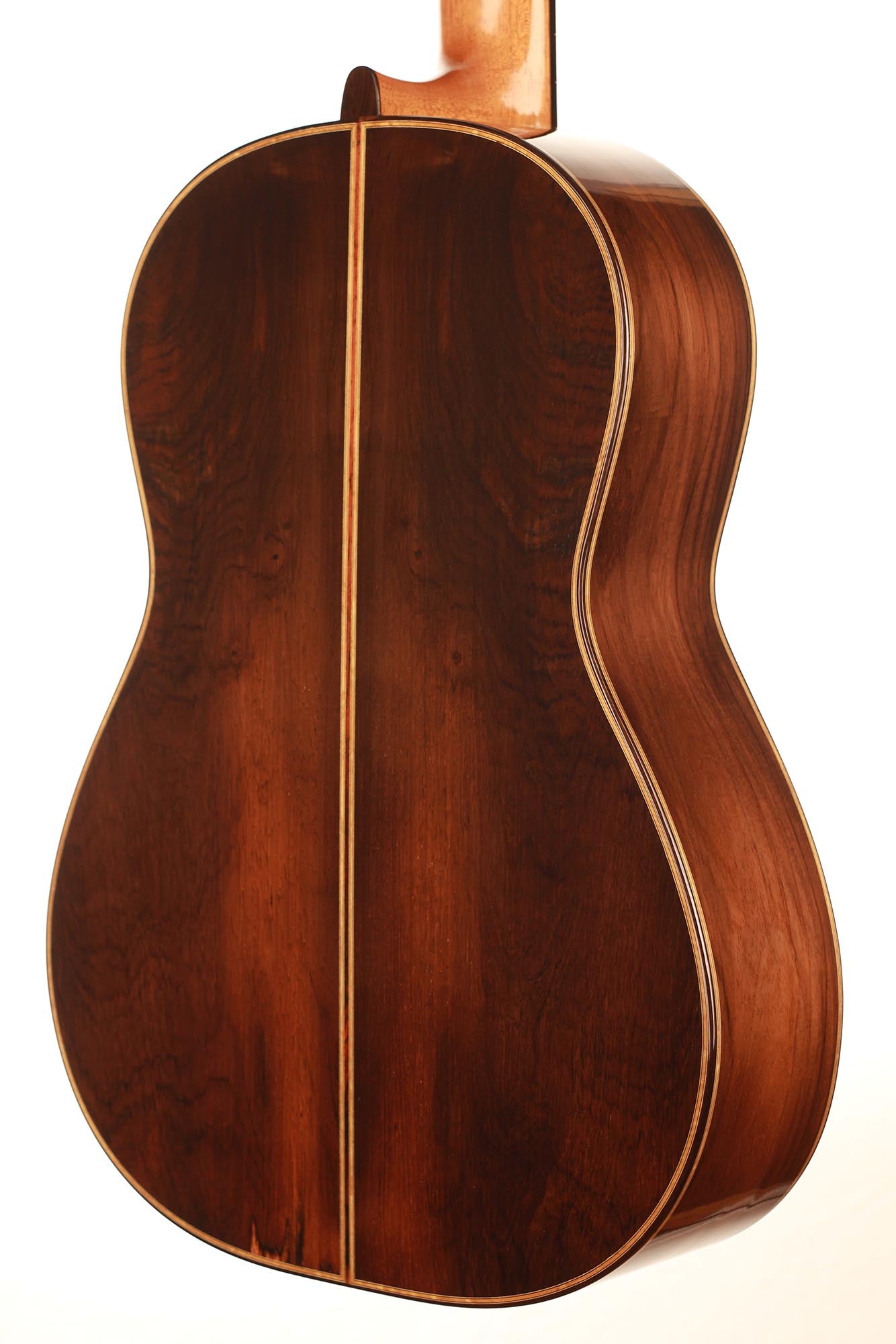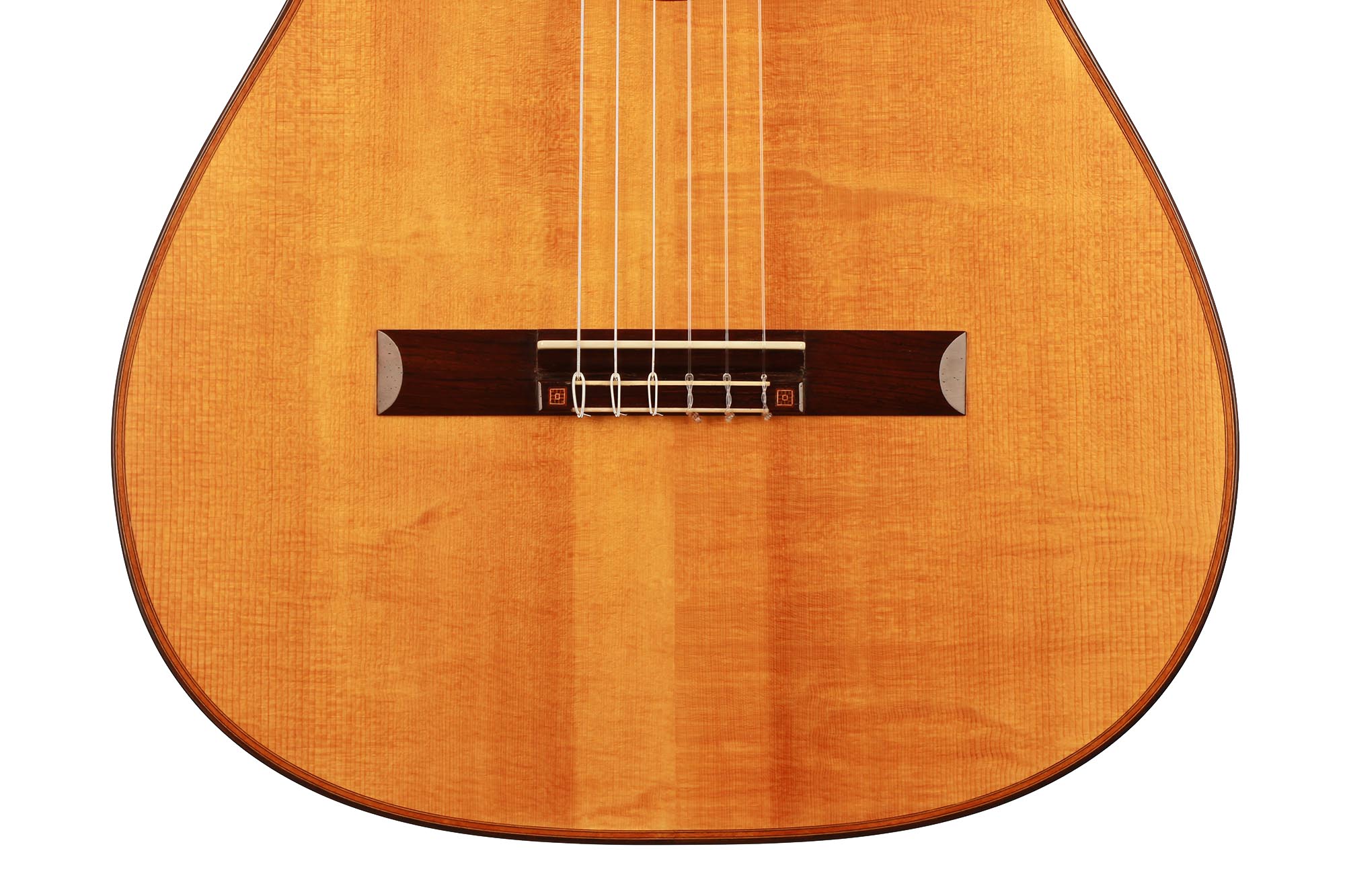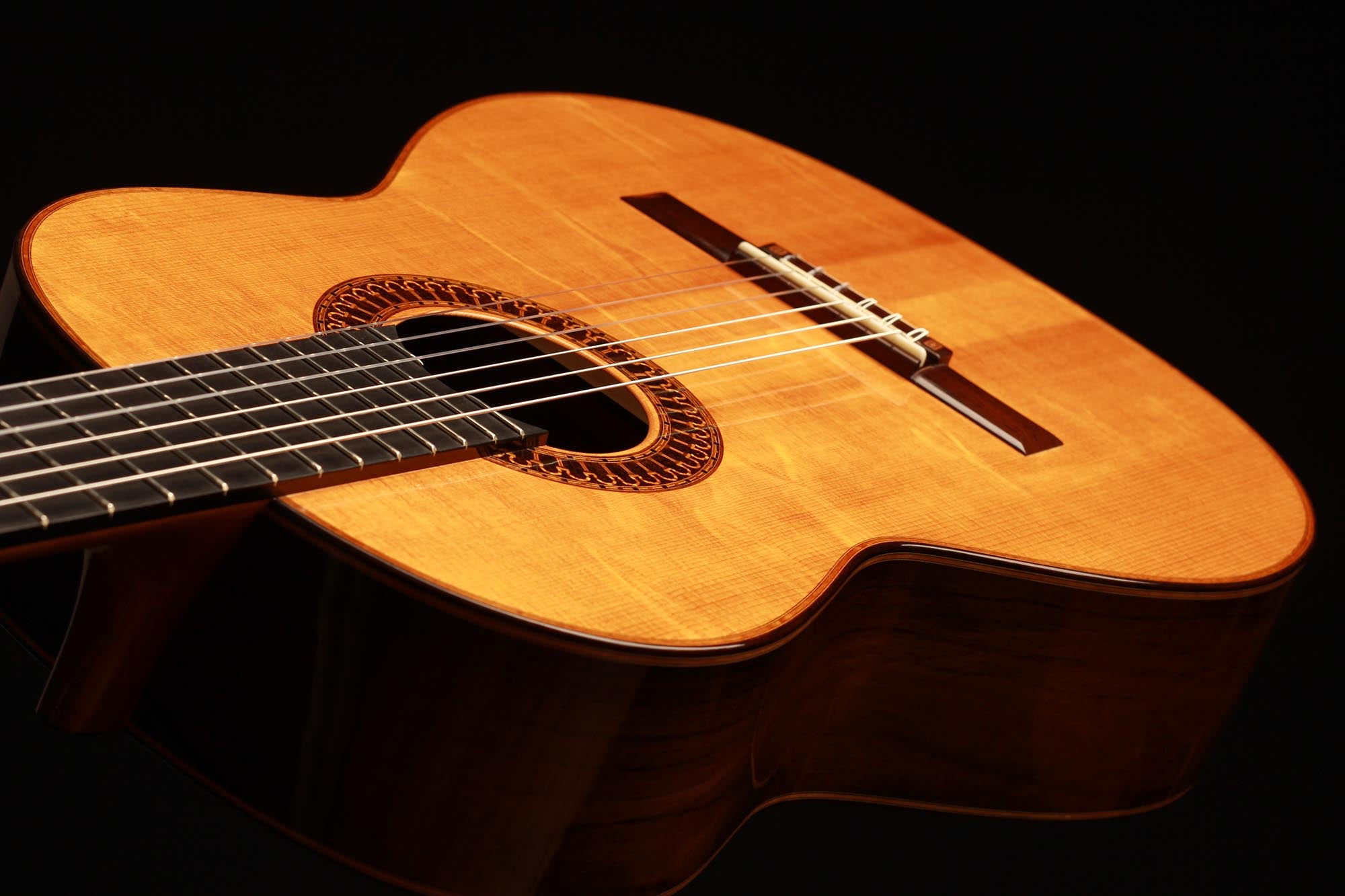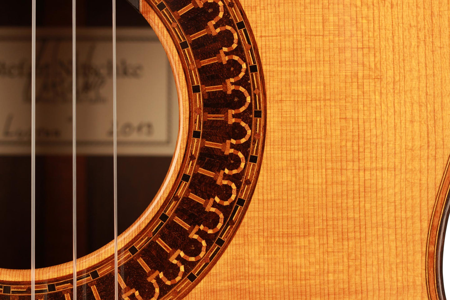 This beautiful instrument named “La Lucena” is one of Stefan Nitschke’s true masterpieces, reaching the highest standards. With its bear-claw vintage-colored spruce top and first-grade Brazilian rosewood (Cites certified), the appearance of this guitar is absolutely striking. Stefan paid great attention to the marquetry details of this José Luis Romanillos model, reproduced the legendary rosette true to the original and used the legendary bridge inlays.