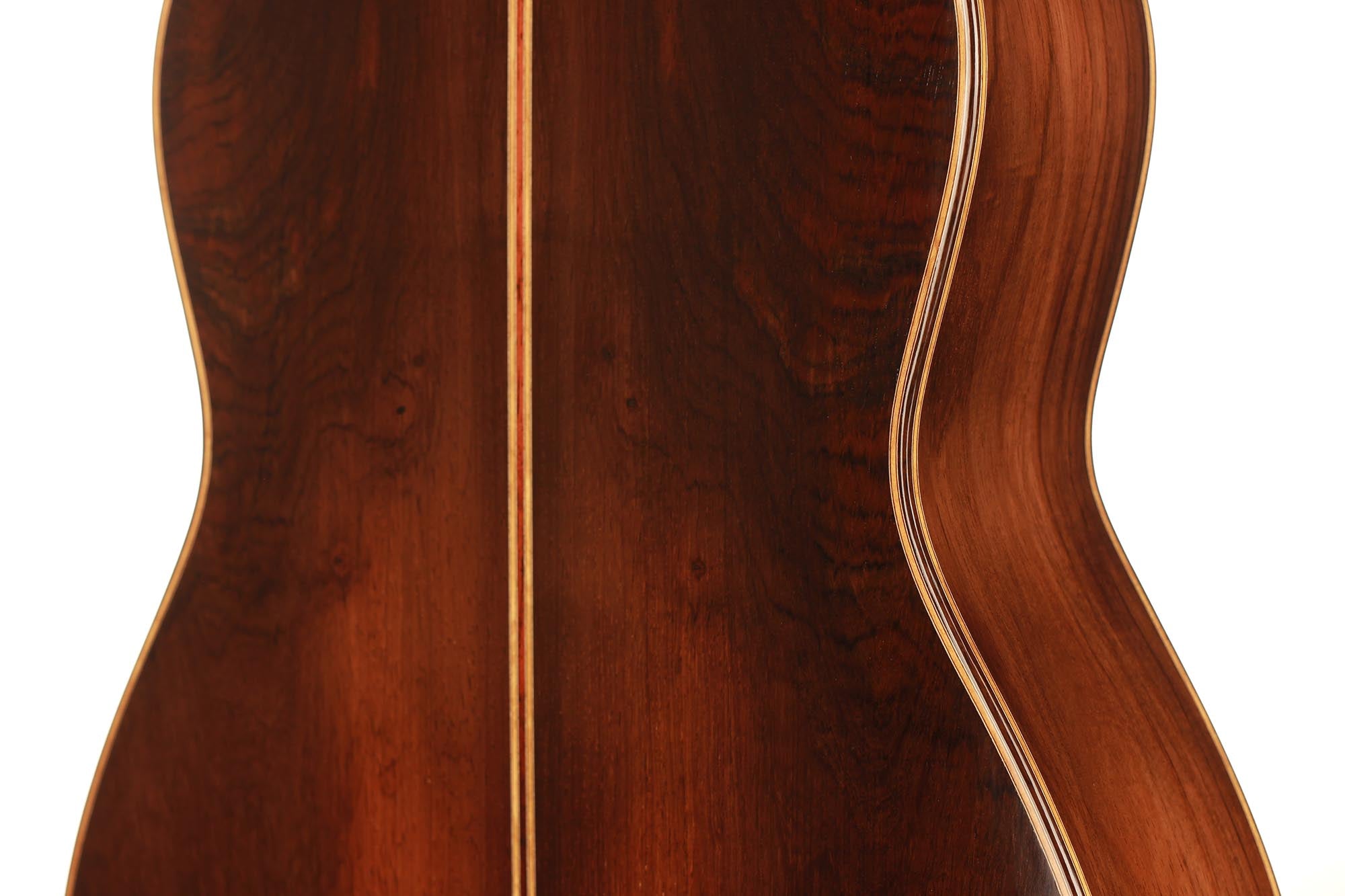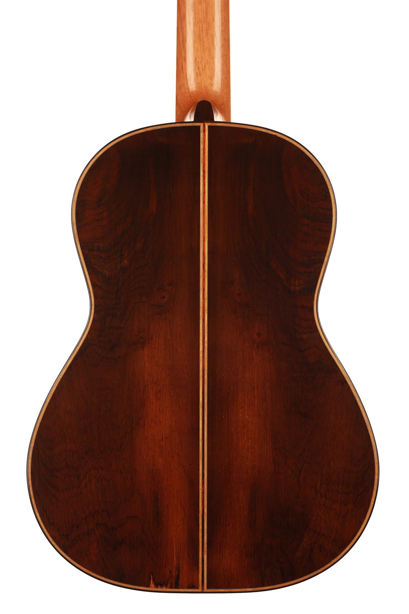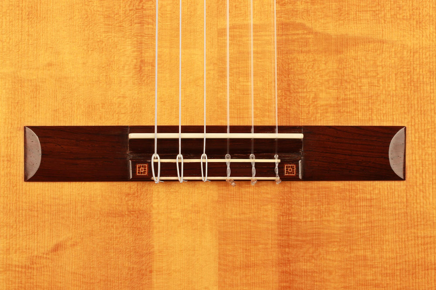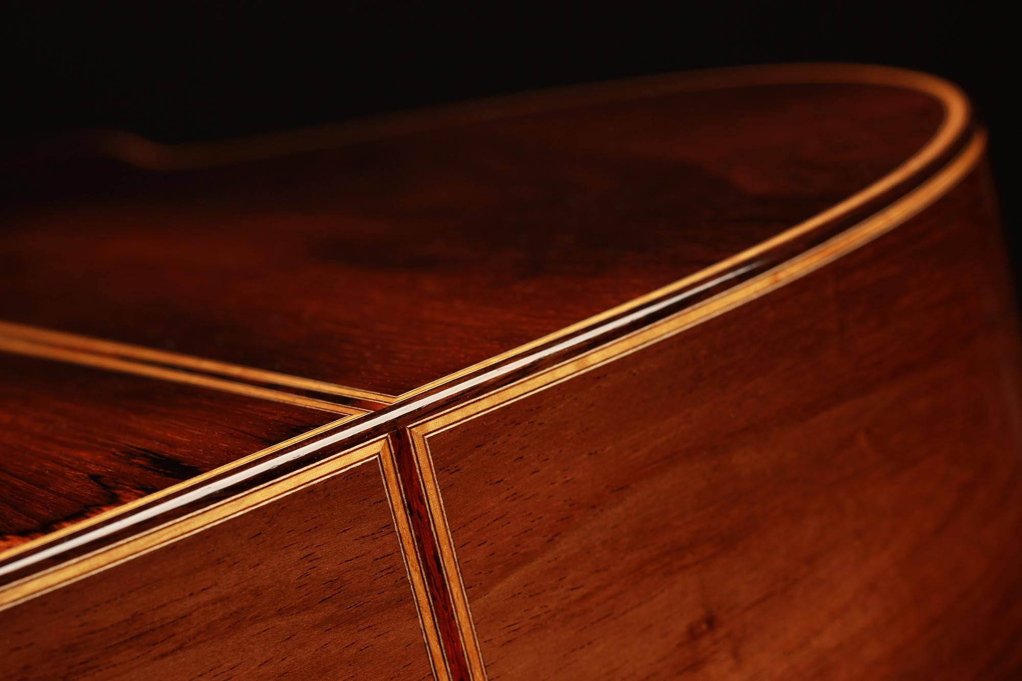 This beautiful instrument named “La Lucena” is one of Stefan Nitschke’s true masterpieces, reaching the highest standards. With its bear-claw vintage-colored spruce top and first-grade Brazilian rosewood (Cites certified), the appearance of this guitar is absolutely striking. Stefan paid great attention to the marquetry details of this José Luis Romanillos model, reproduced the legendary rosette true to the original and used the legendary bridge inlays.