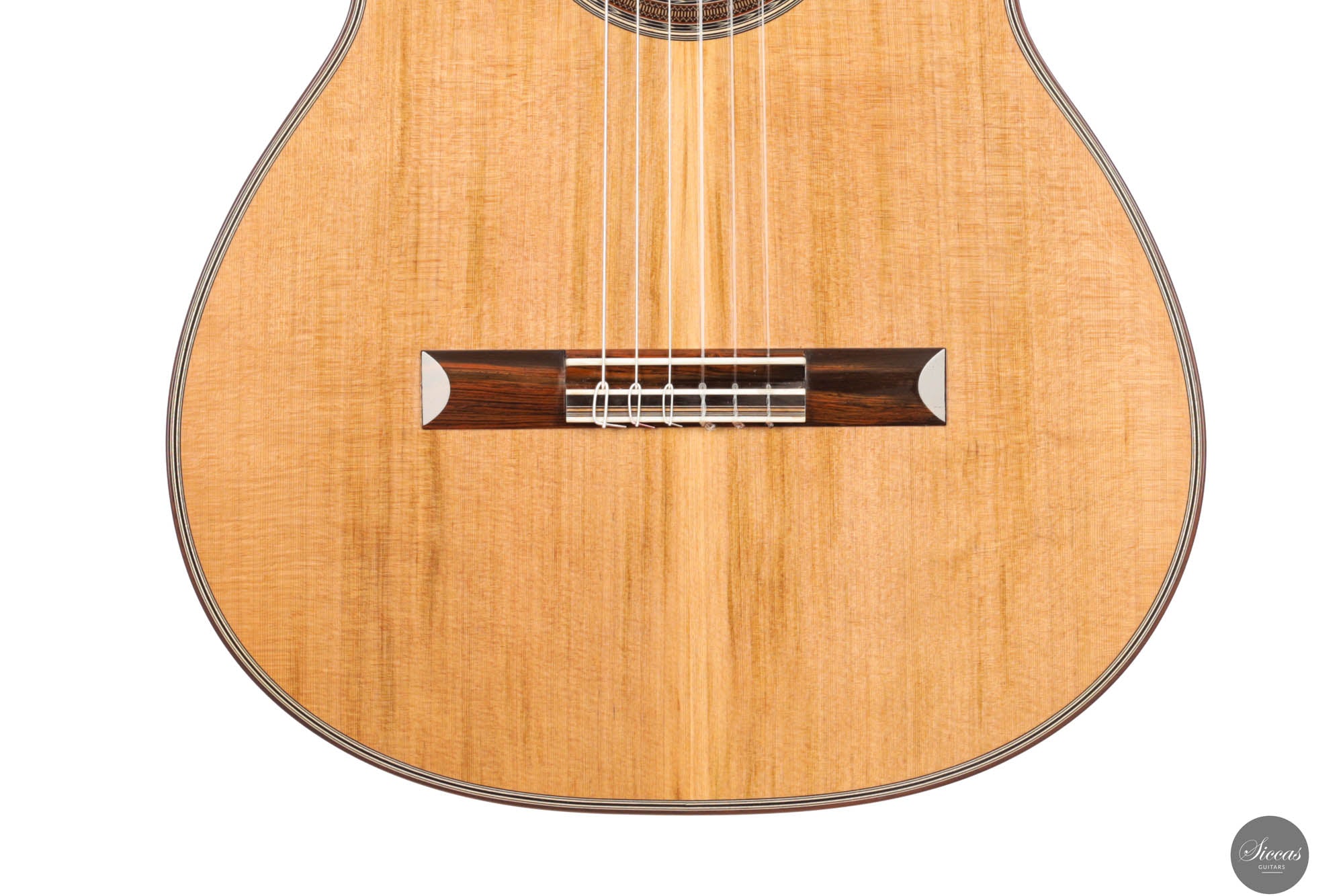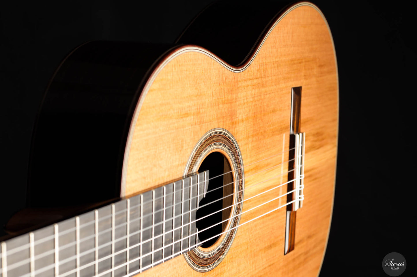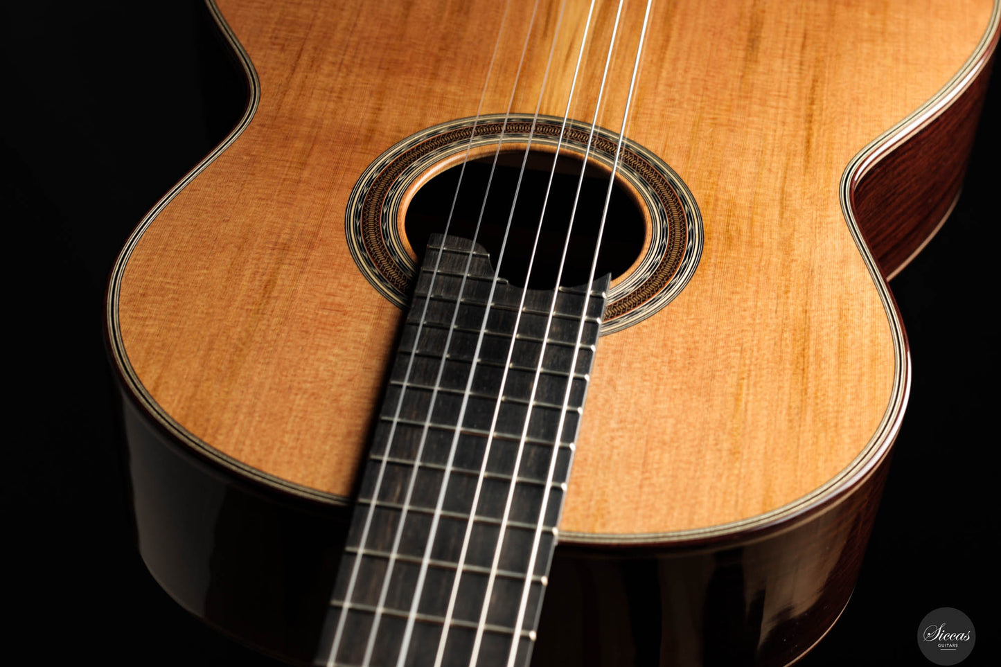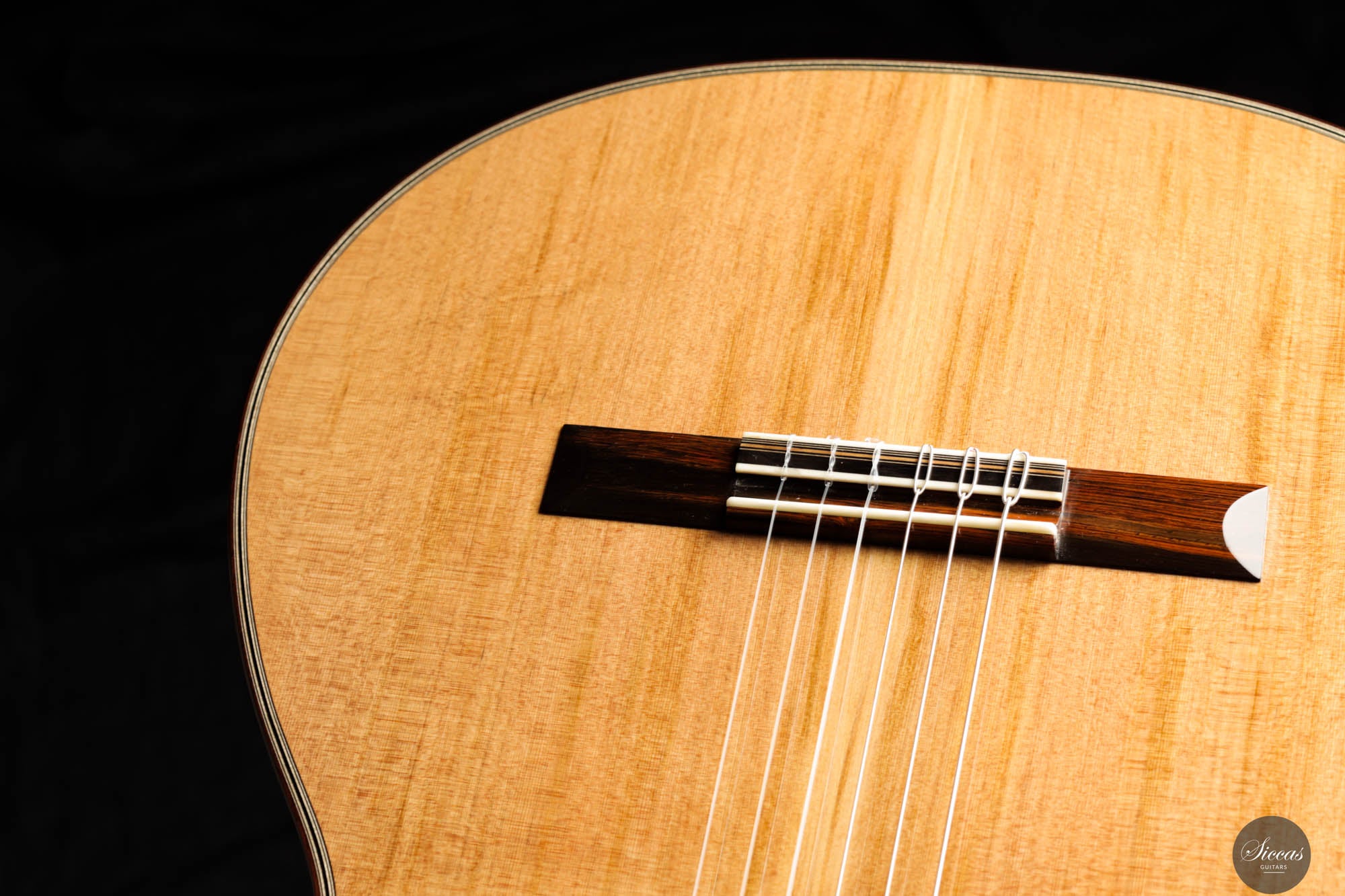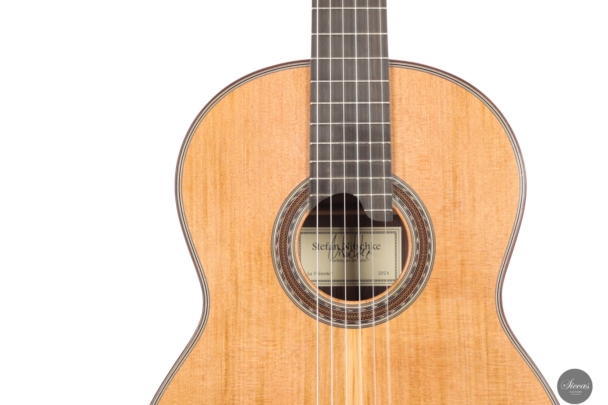 The 2024 Stefan Nitschke “La Valiente” guitar is a masterful celebration of over two decades of lutherie, designed to offer a rich palette of frequencies and exceptional tonal versatility. Its cedar top, crafted from a unique Canadian log recovered in the 1980s, carries a unique history that mirrors its tonal depth. The guitar delivers deep, resonant basses, a hallmark of Nitschke’s instruments, paired with singing, round trebles that evoke Segovia’s vision of the guitar as a “little orchestra.” This model was crafted to offer excellent polyphonic clarity and enhanced projection, allowing players a broad spectrum of expressive. Its refined rosette strikes the perfect balance between sophistication and subtlety, complementing its minimalist aesthetic. With its seamless blend of tradition, innovation, and the story behind its materials, “La Valiente” is a testament to artistry, tonal brilliance, and the dedication of a master craftsman celebrating his 22nd year.