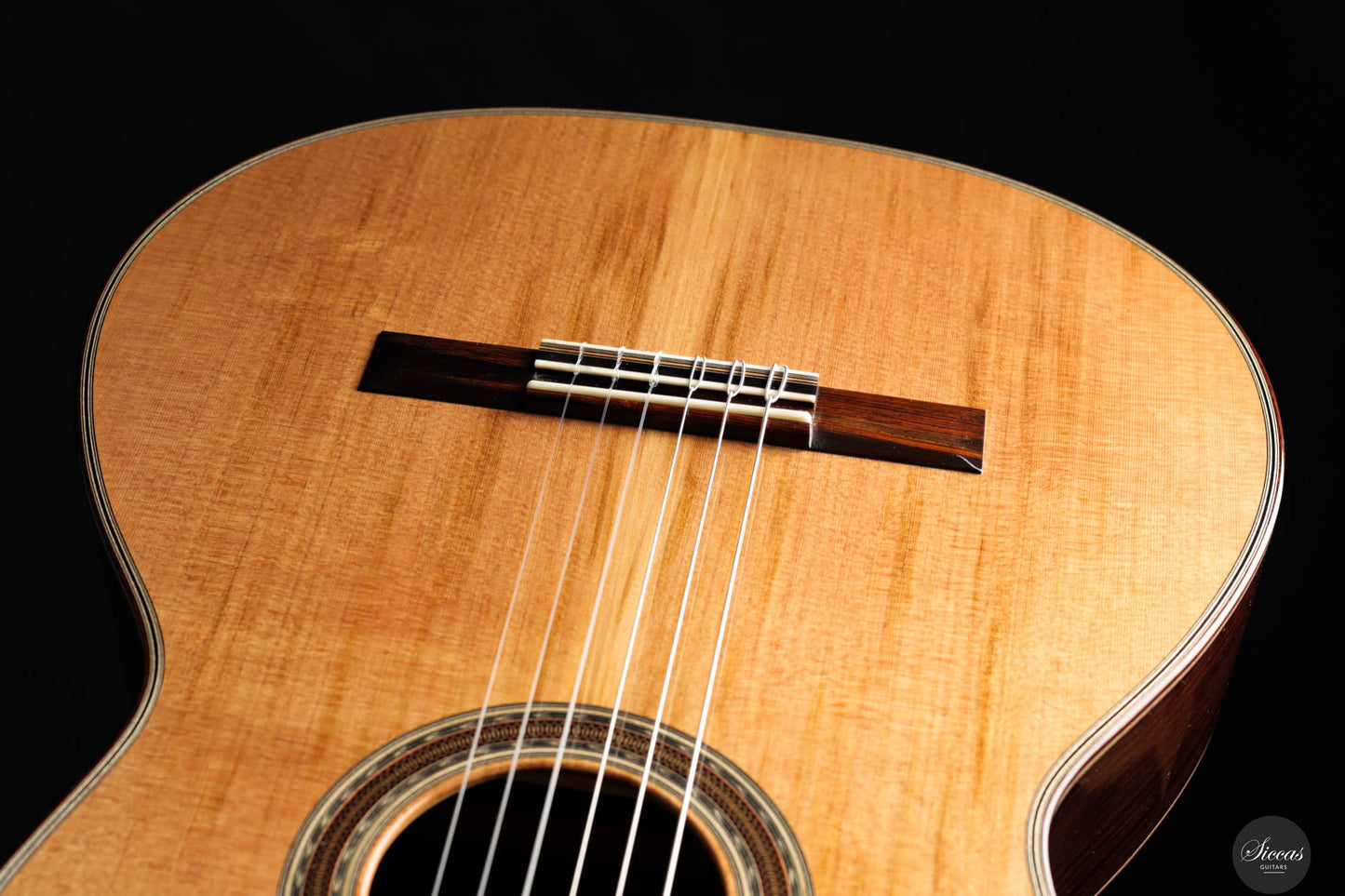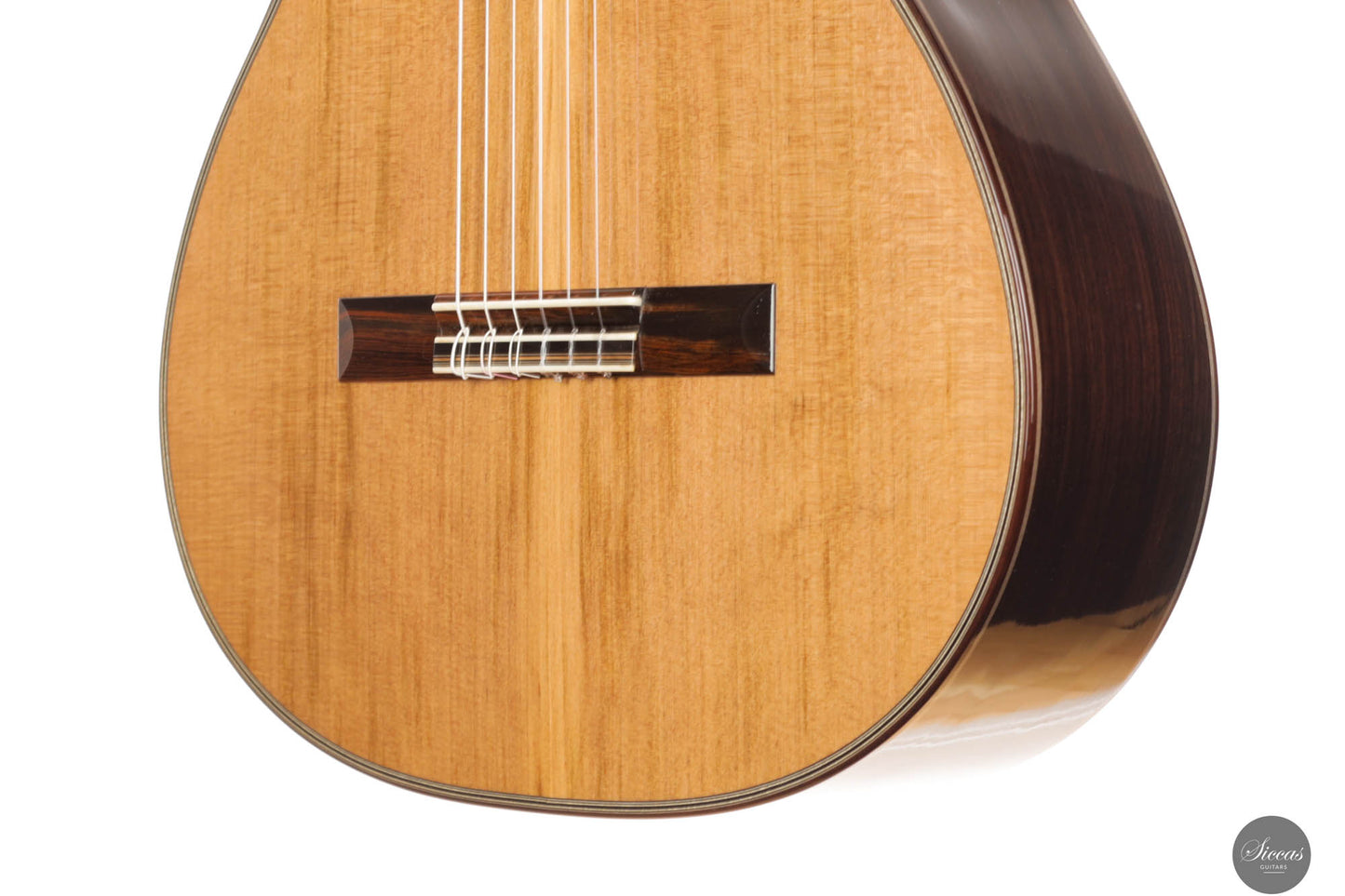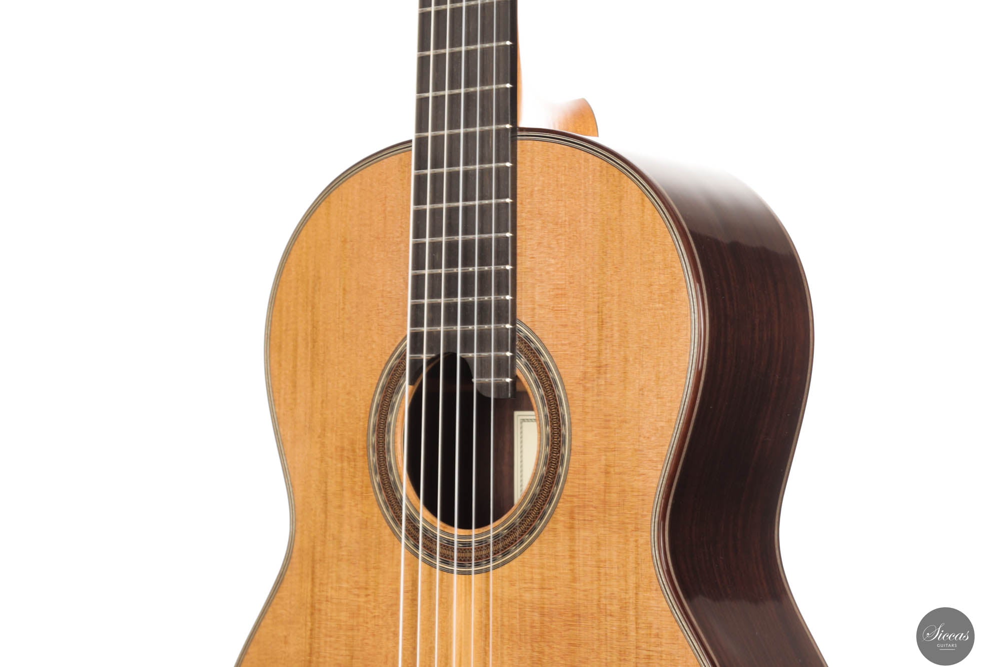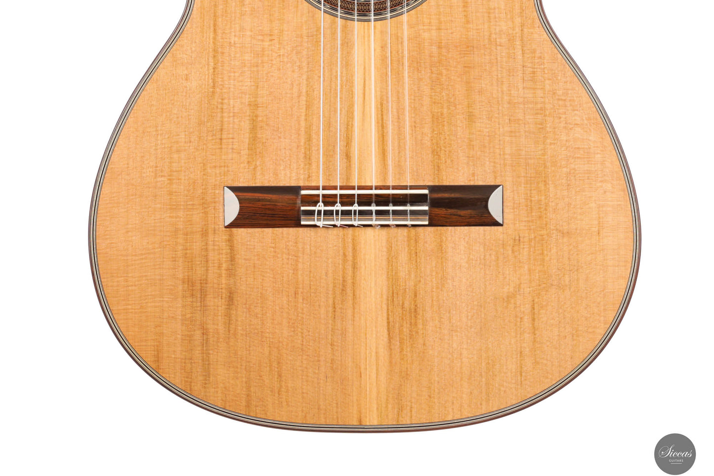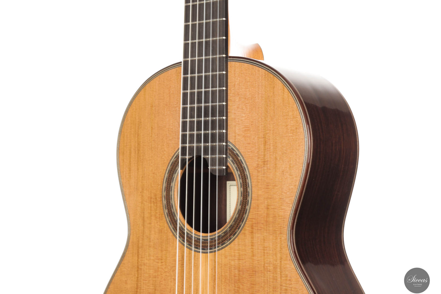 The 2024 Stefan Nitschke “La Valiente” guitar is a masterful celebration of over two decades of lutherie, designed to offer a rich palette of frequencies and exceptional tonal versatility. Its cedar top, crafted from a unique Canadian log recovered in the 1980s, carries a unique history that mirrors its tonal depth. The guitar delivers deep, resonant basses, a hallmark of Nitschke’s instruments, paired with singing, round trebles that evoke Segovia’s vision of the guitar as a “little orchestra.” This model was crafted to offer excellent polyphonic clarity and enhanced projection, allowing players a broad spectrum of expressive. Its refined rosette strikes the perfect balance between sophistication and subtlety, complementing its minimalist aesthetic. With its seamless blend of tradition, innovation, and the story behind its materials, “La Valiente” is a testament to artistry, tonal brilliance, and the dedication of a master craftsman celebrating his 22nd year.