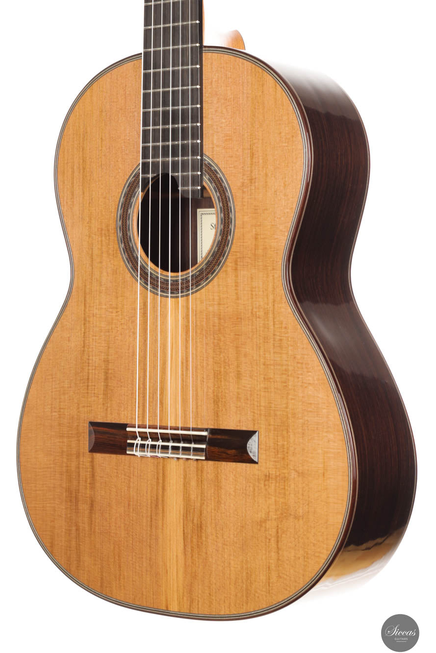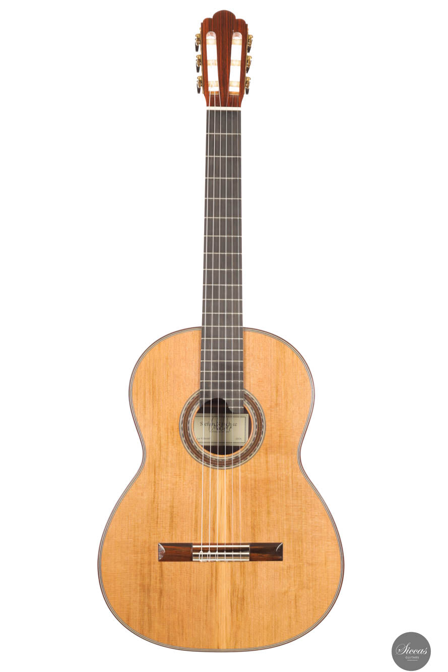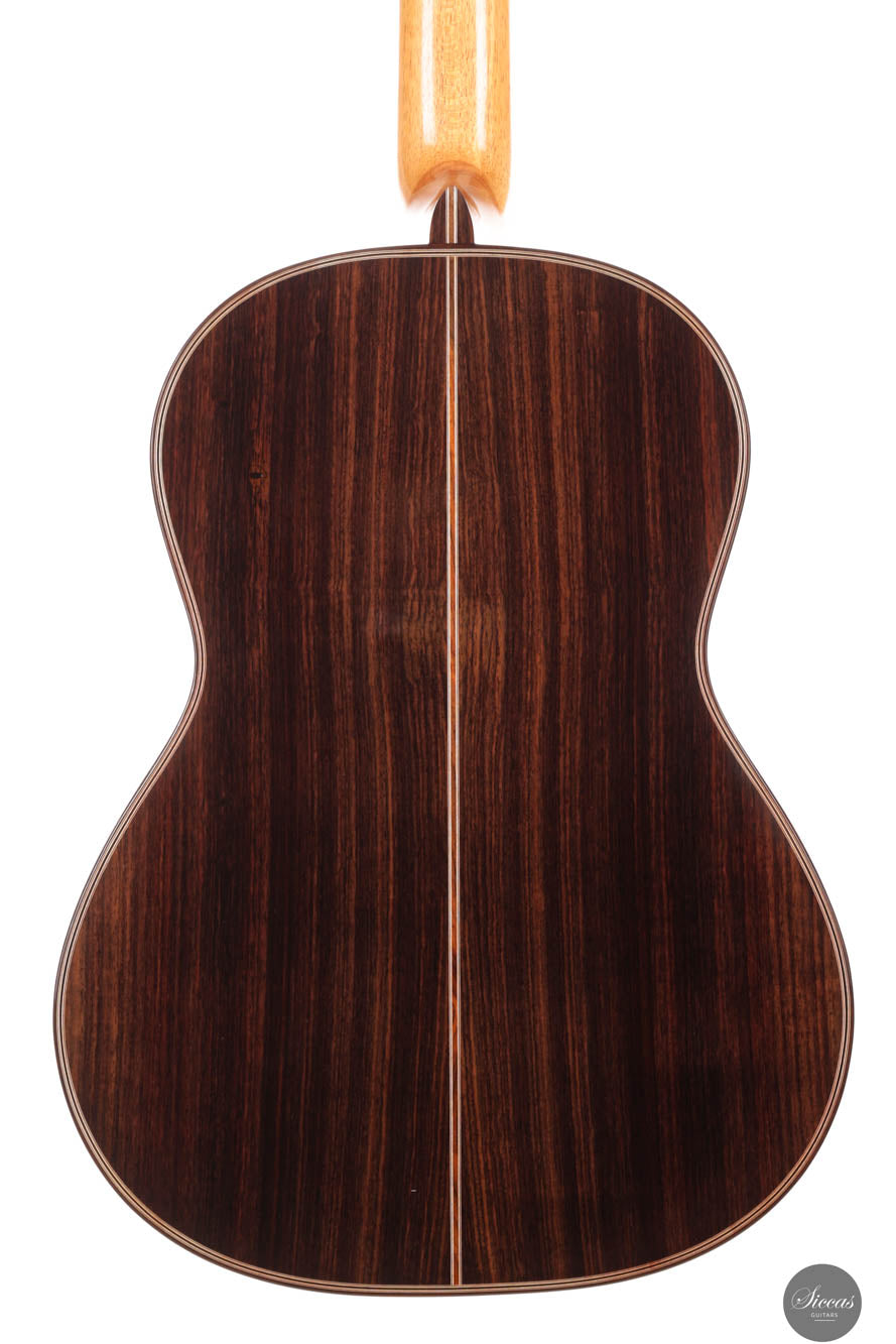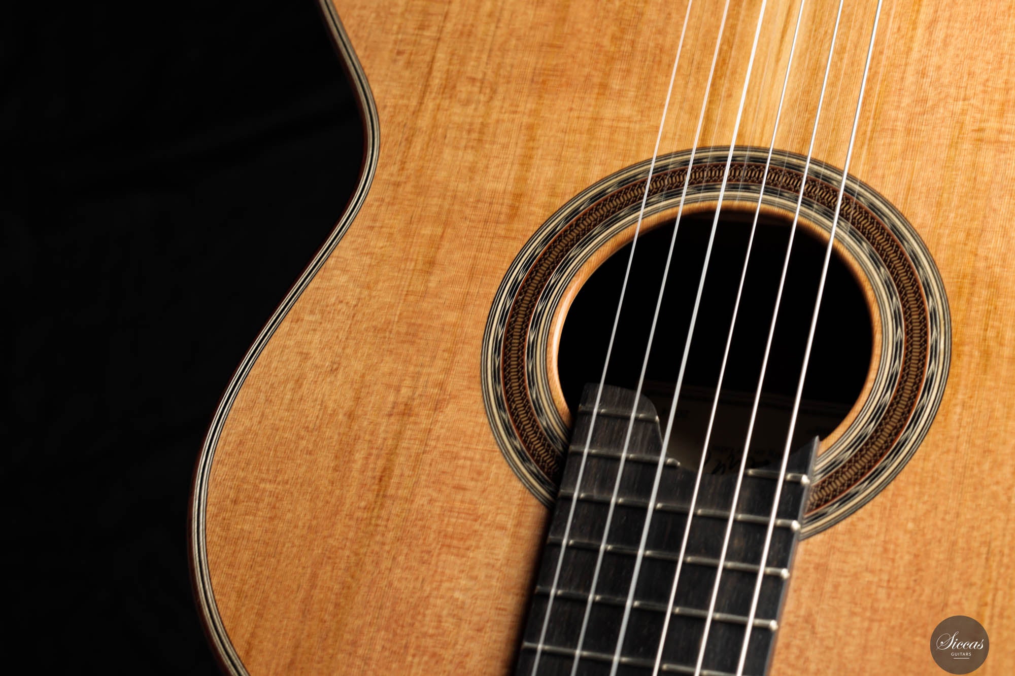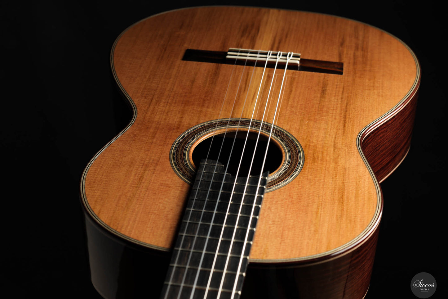 The 2024 Stefan Nitschke “La Valiente” guitar is a masterful celebration of over two decades of lutherie, designed to offer a rich palette of frequencies and exceptional tonal versatility. Its cedar top, crafted from a unique Canadian log recovered in the 1980s, carries a unique history that mirrors its tonal depth. The guitar delivers deep, resonant basses, a hallmark of Nitschke’s instruments, paired with singing, round trebles that evoke Segovia’s vision of the guitar as a “little orchestra.” This model was crafted to offer excellent polyphonic clarity and enhanced projection, allowing players a broad spectrum of expressive. Its refined rosette strikes the perfect balance between sophistication and subtlety, complementing its minimalist aesthetic. With its seamless blend of tradition, innovation, and the story behind its materials, “La Valiente” is a testament to artistry, tonal brilliance, and the dedication of a master craftsman celebrating his 22nd year.