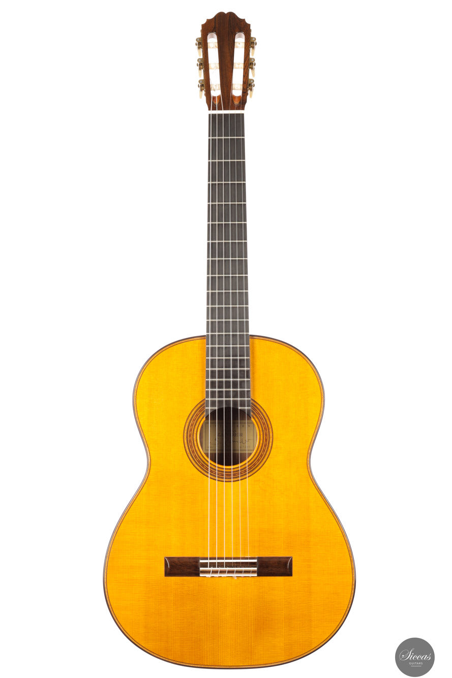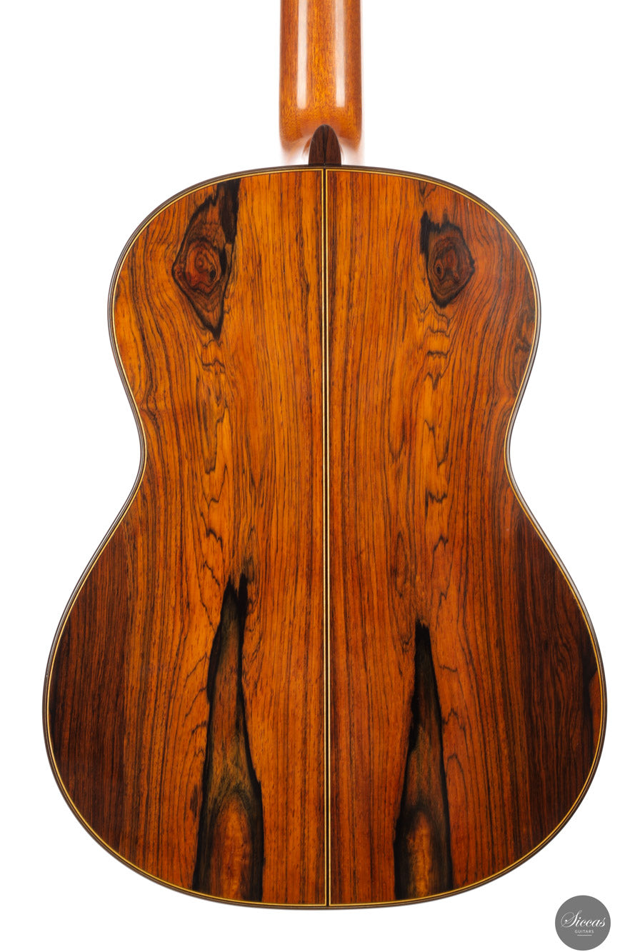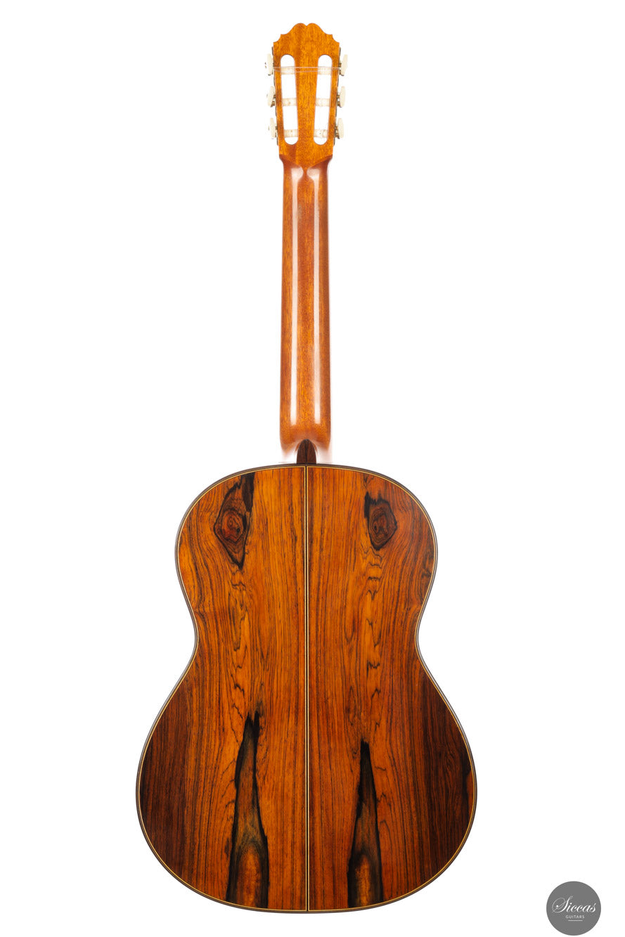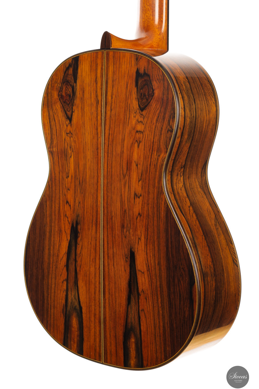 This guitar, built in 2006, features a spruce top and Brazilian rosewood back and sides (CITES certified). The construction follows a traditional concept, but its bracing is particularly interesting: five almost parallel braces combined with a split transversal bar. This internal structure contributes to its solid and responsive voice, ensuring both projection and balance. At 1495 grams, it is moderately lightweight and easy to handle. The tonal response of this instrument is direct and intuitive, offering an effortless connection between the player and the sound. The guitar produces a full and clear voice with excellent separation, natural sustain, and refined dynamic control. Its Brazilian rosewood body enhances tonal richness and depth, while the spruce soundboard provides clarity and definition. The result is an instrument that feels secure and reliable under the hands while offering expressive versatility across the repertoire.Condition