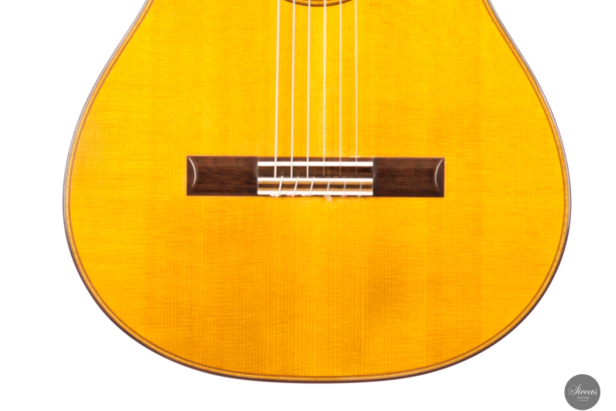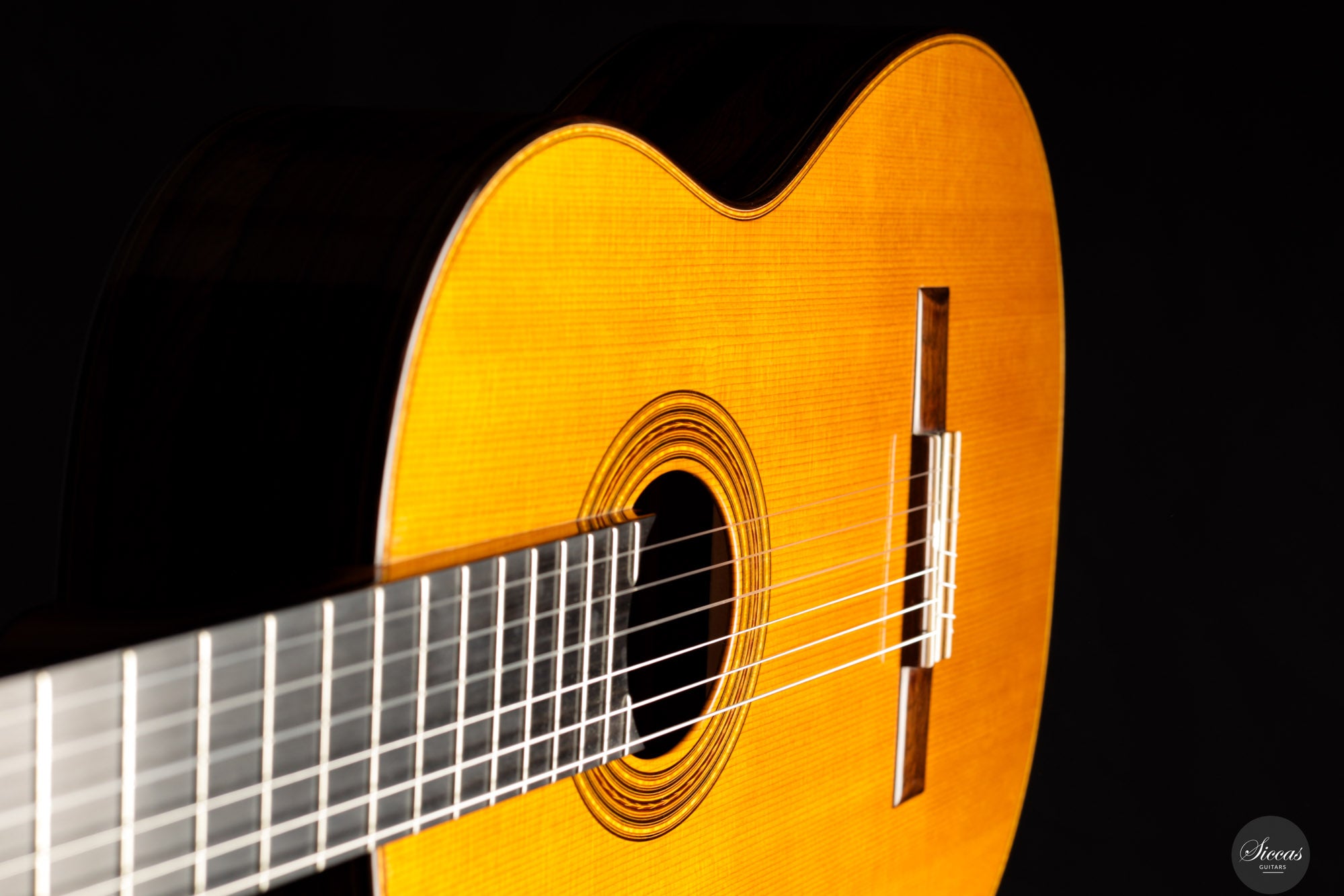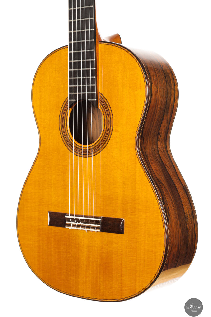 This guitar, built in 2006, features a spruce top and Brazilian rosewood back and sides (CITES certified). The construction follows a traditional concept, but its bracing is particularly interesting: five almost parallel braces combined with a split transversal bar. This internal structure contributes to its solid and responsive voice, ensuring both projection and balance. At 1495 grams, it is moderately lightweight and easy to handle. The tonal response of this instrument is direct and intuitive, offering an effortless connection between the player and the sound. The guitar produces a full and clear voice with excellent separation, natural sustain, and refined dynamic control. Its Brazilian rosewood body enhances tonal richness and depth, while the spruce soundboard provides clarity and definition. The result is an instrument that feels secure and reliable under the hands while offering expressive versatility across the repertoire.Condition