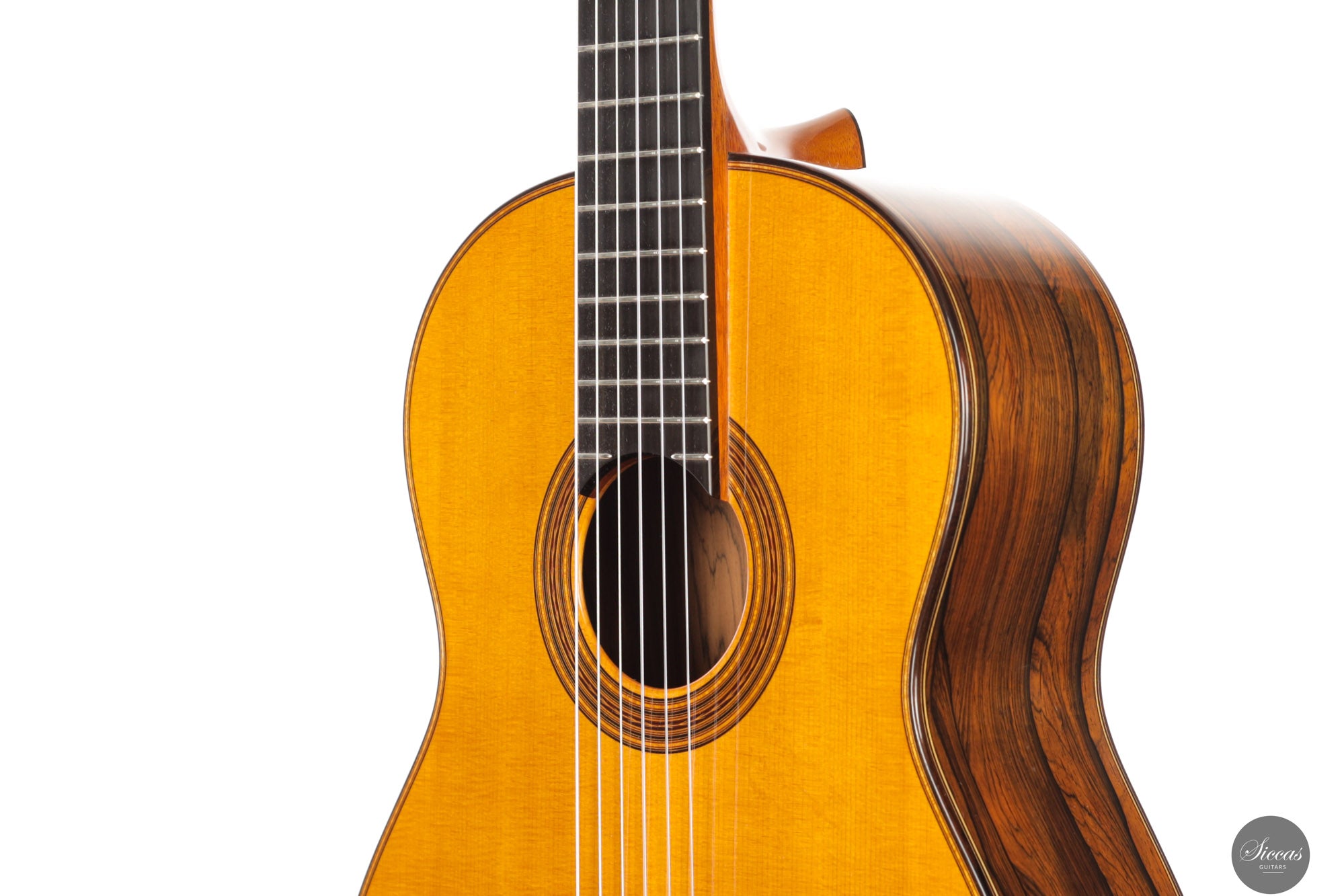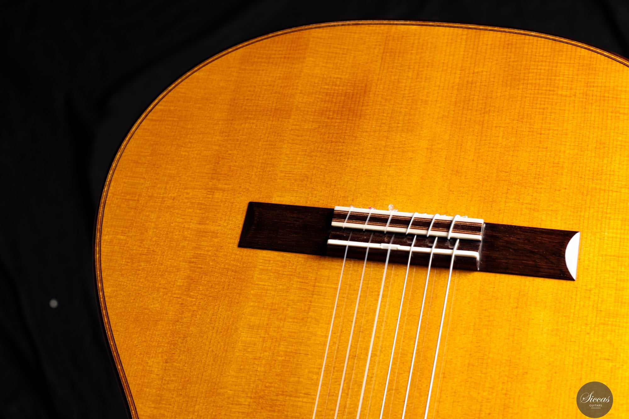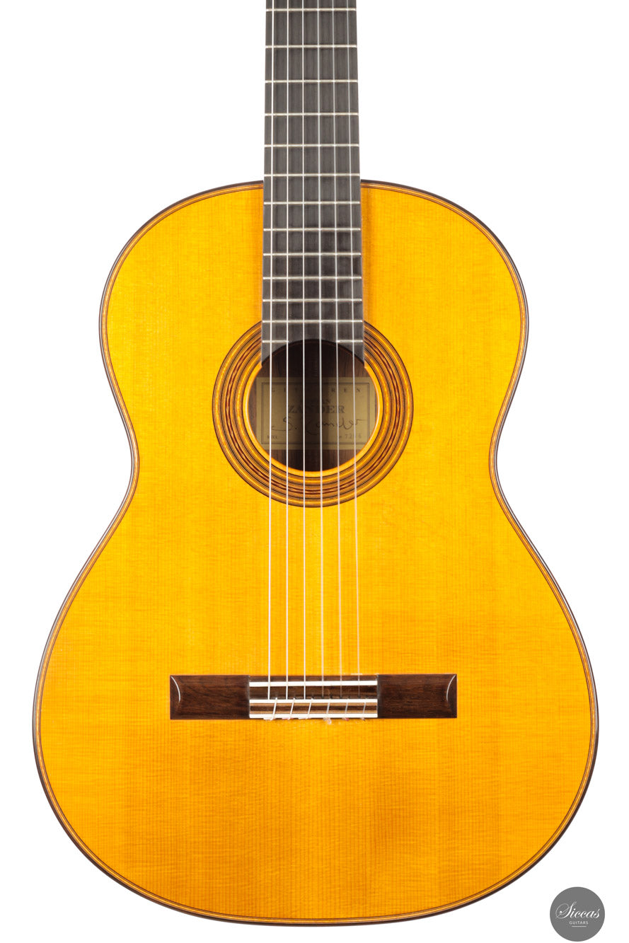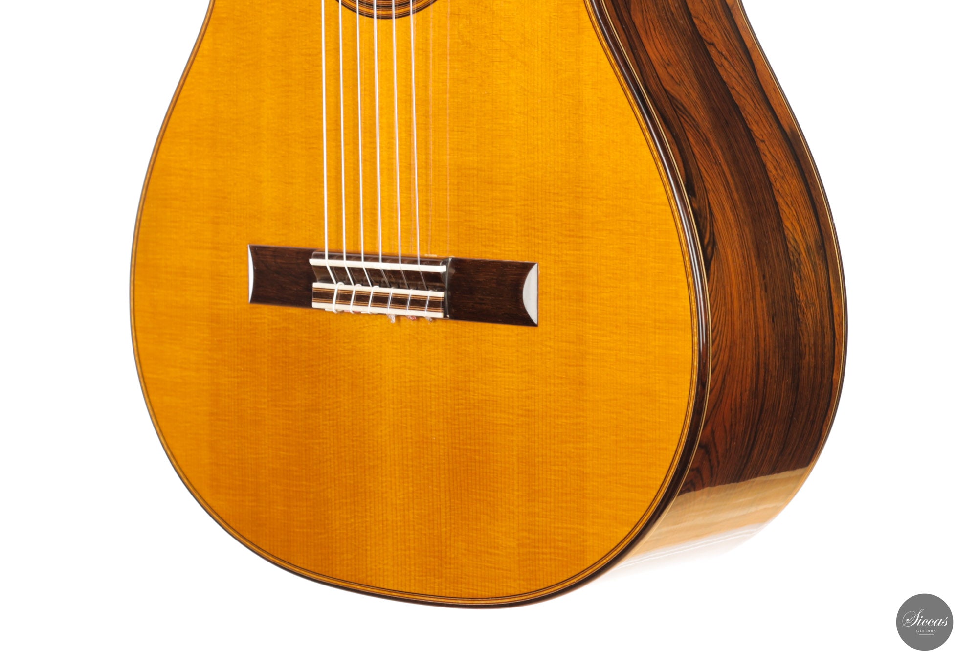 This guitar, built in 2006, features a spruce top and Brazilian rosewood back and sides (CITES certified). The construction follows a traditional concept, but its bracing is particularly interesting: five almost parallel braces combined with a split transversal bar. This internal structure contributes to its solid and responsive voice, ensuring both projection and balance. At 1495 grams, it is moderately lightweight and easy to handle. The tonal response of this instrument is direct and intuitive, offering an effortless connection between the player and the sound. The guitar produces a full and clear voice with excellent separation, natural sustain, and refined dynamic control. Its Brazilian rosewood body enhances tonal richness and depth, while the spruce soundboard provides clarity and definition. The result is an instrument that feels secure and reliable under the hands while offering expressive versatility across the repertoire.Condition