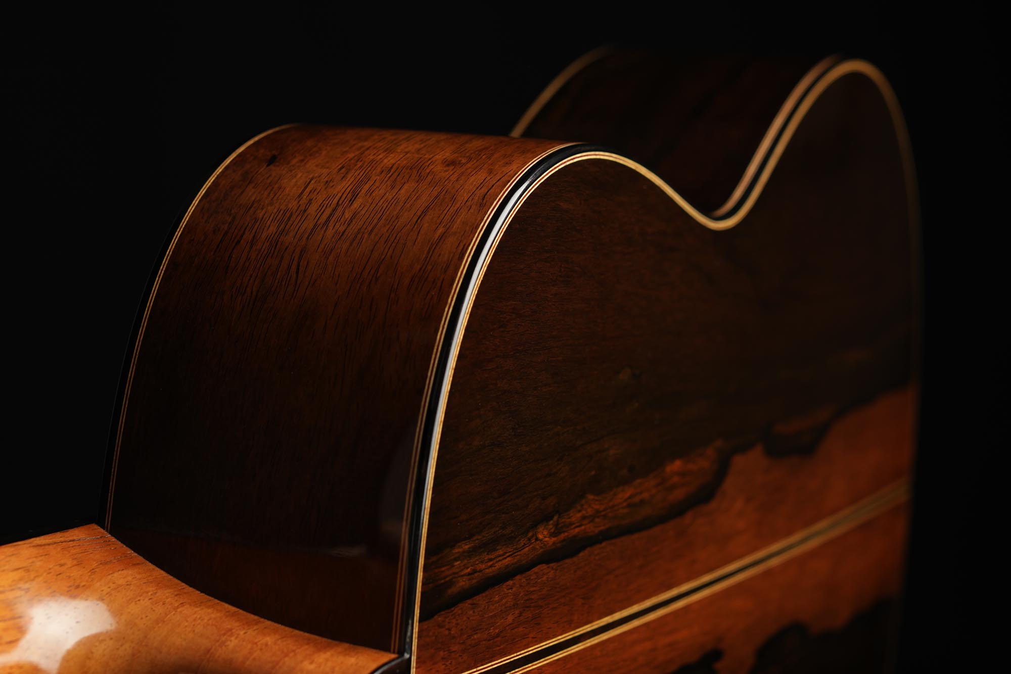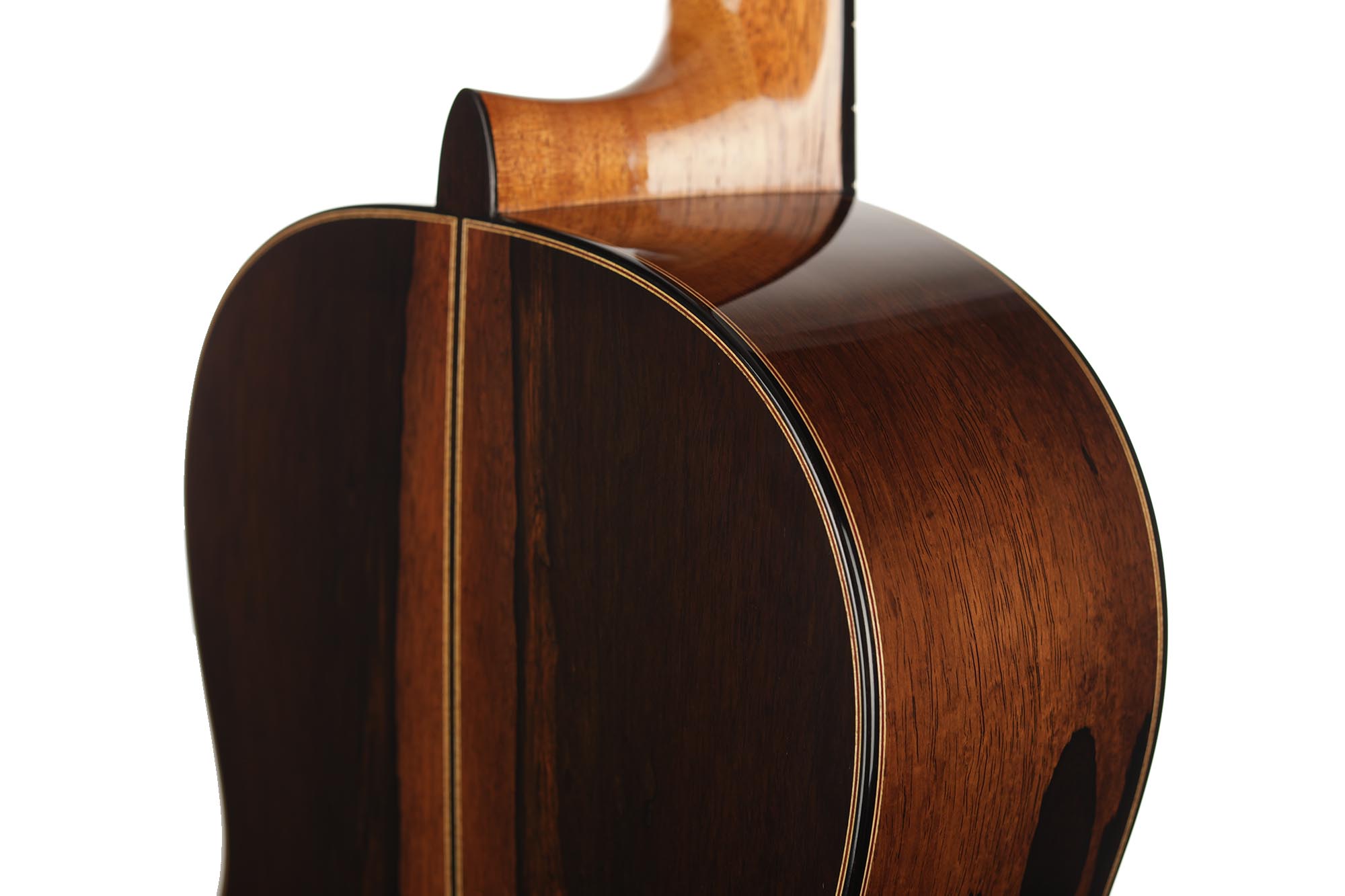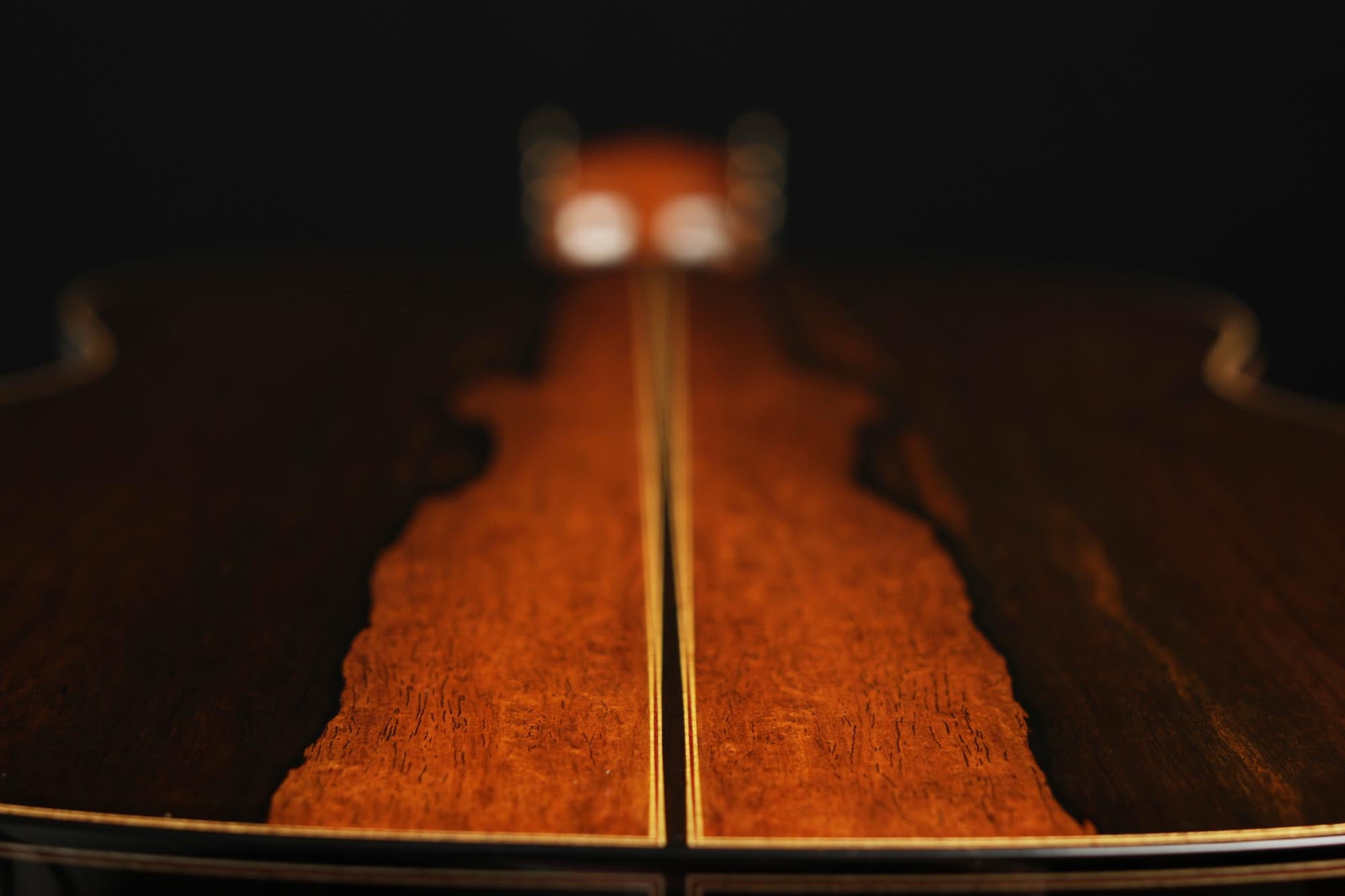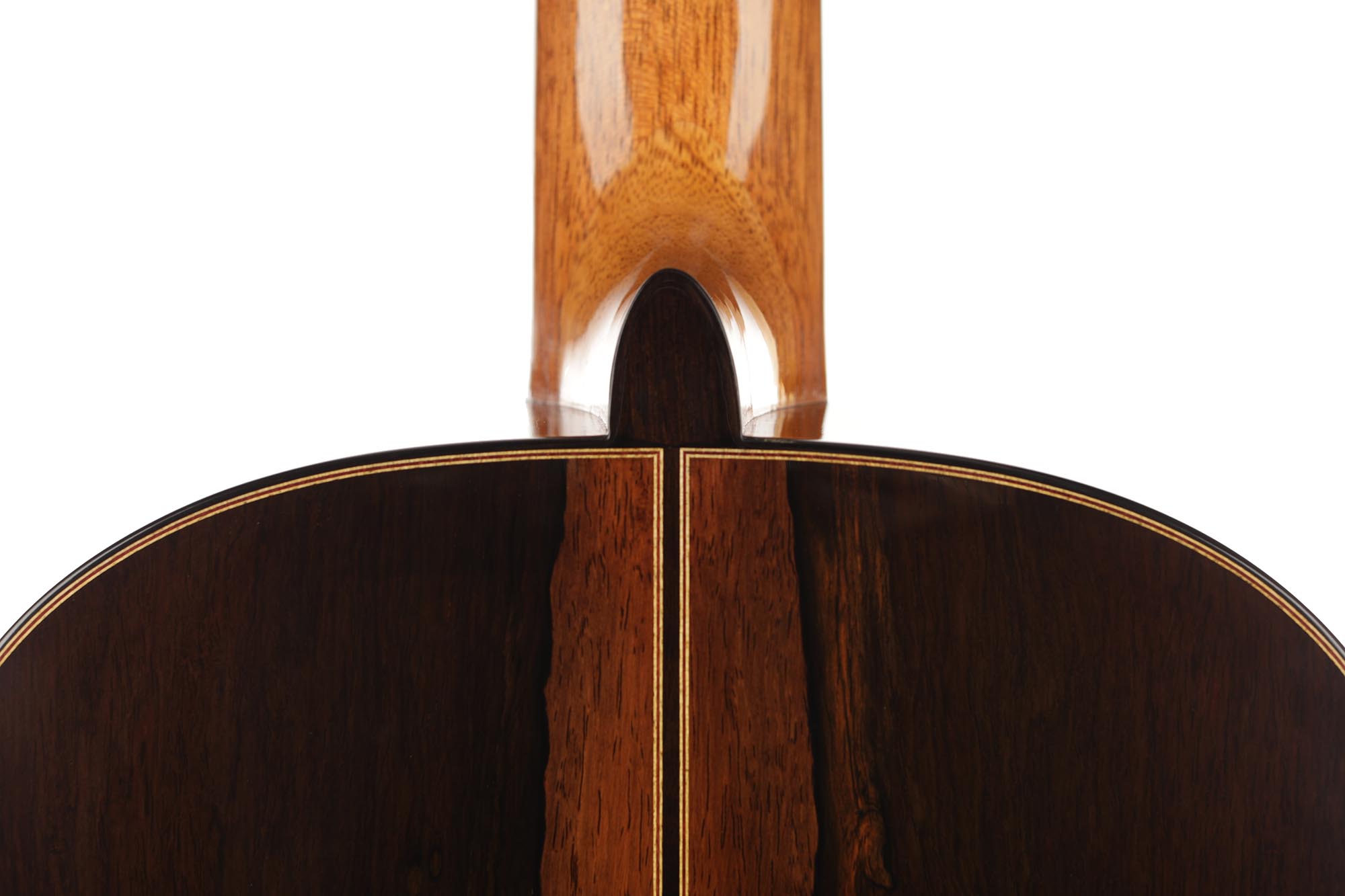 This beautiful instrument numbered 245 is actually our first double top that we receive from Stephen Hill and one can immediately notice the difference to his traditionally built model. This spruce double-top has a distinguished power. There is a lot of reverb and sustain coming from each string, which makes the guitar very inspiring to play on. Back and sides are made of gorgeous CITES certified Brazilian rosewood that one visually drowns in. Due to the big sonorous voice of this instrument, the player can easily change dynamics without making a big effort and this Stephen Hill sounds distinctly open for a new guitar. The neck is perfectly shaped so that the left-hand can move smoothly and relaxed. A Hiscox case is included in the price.